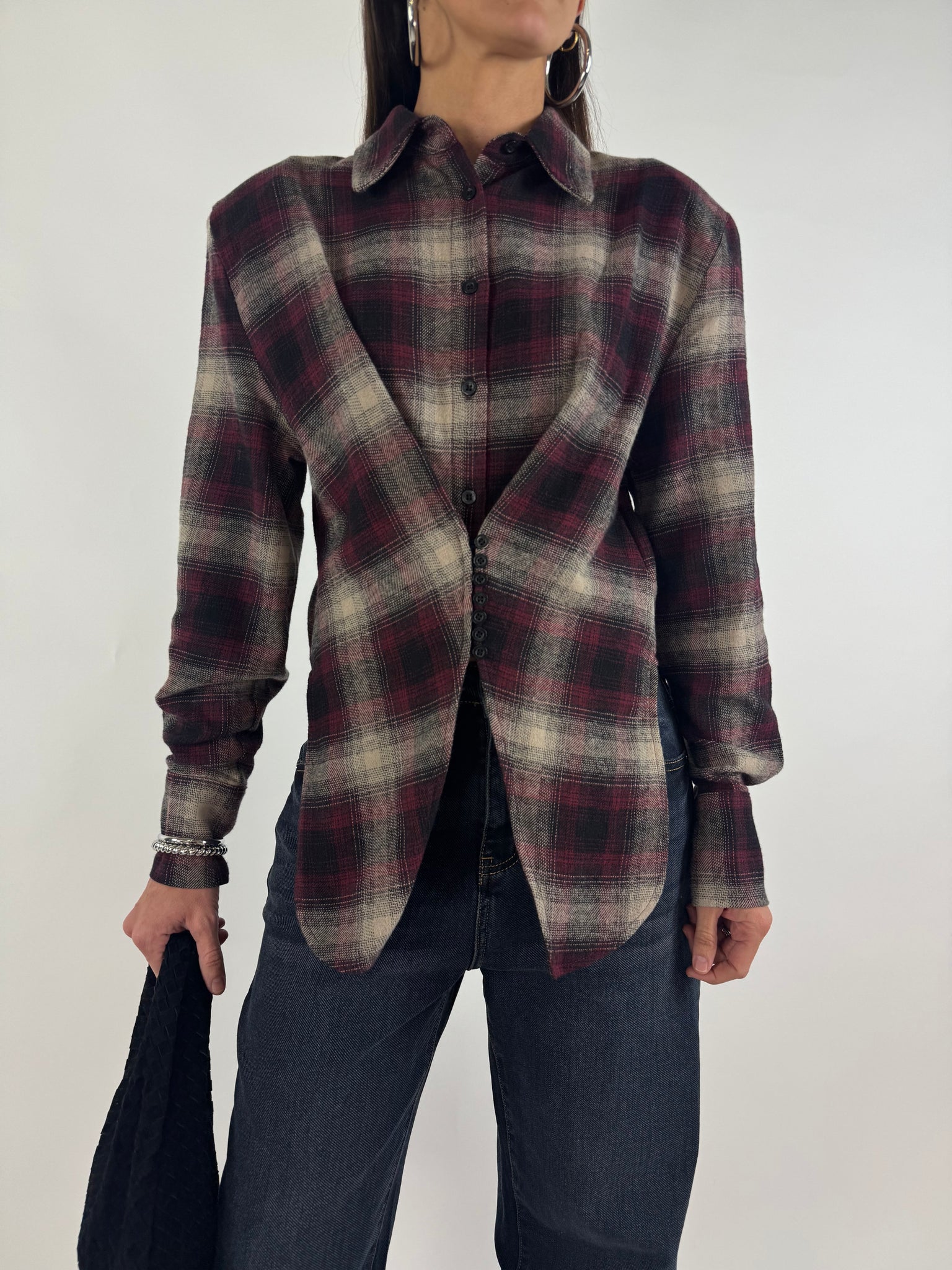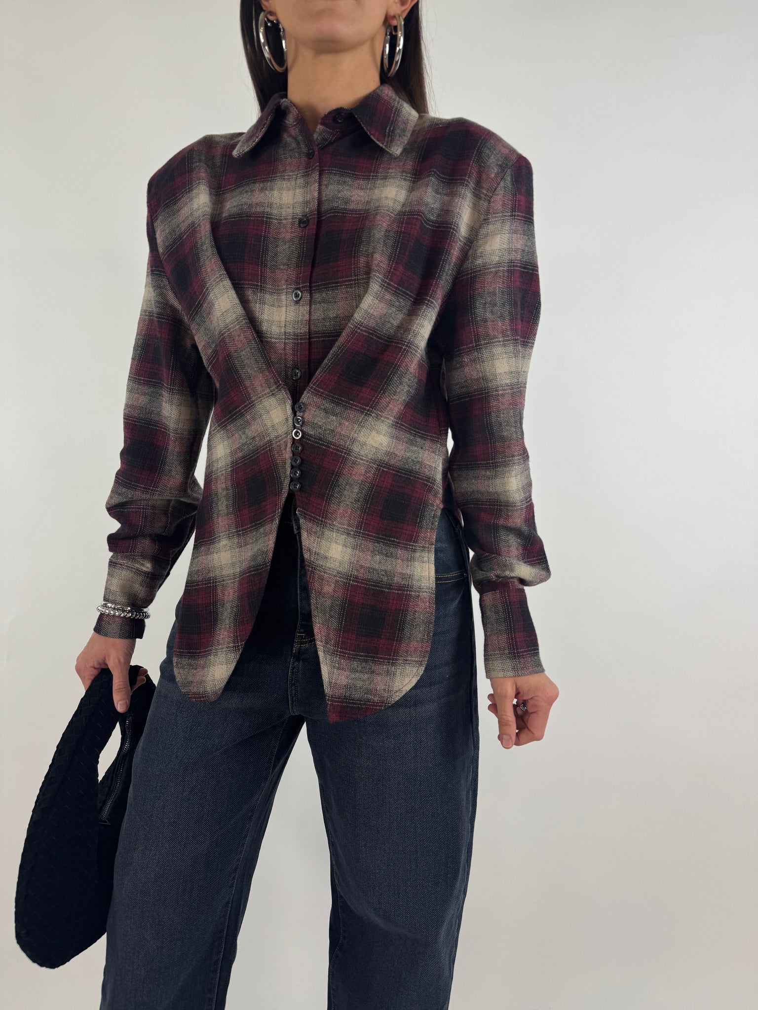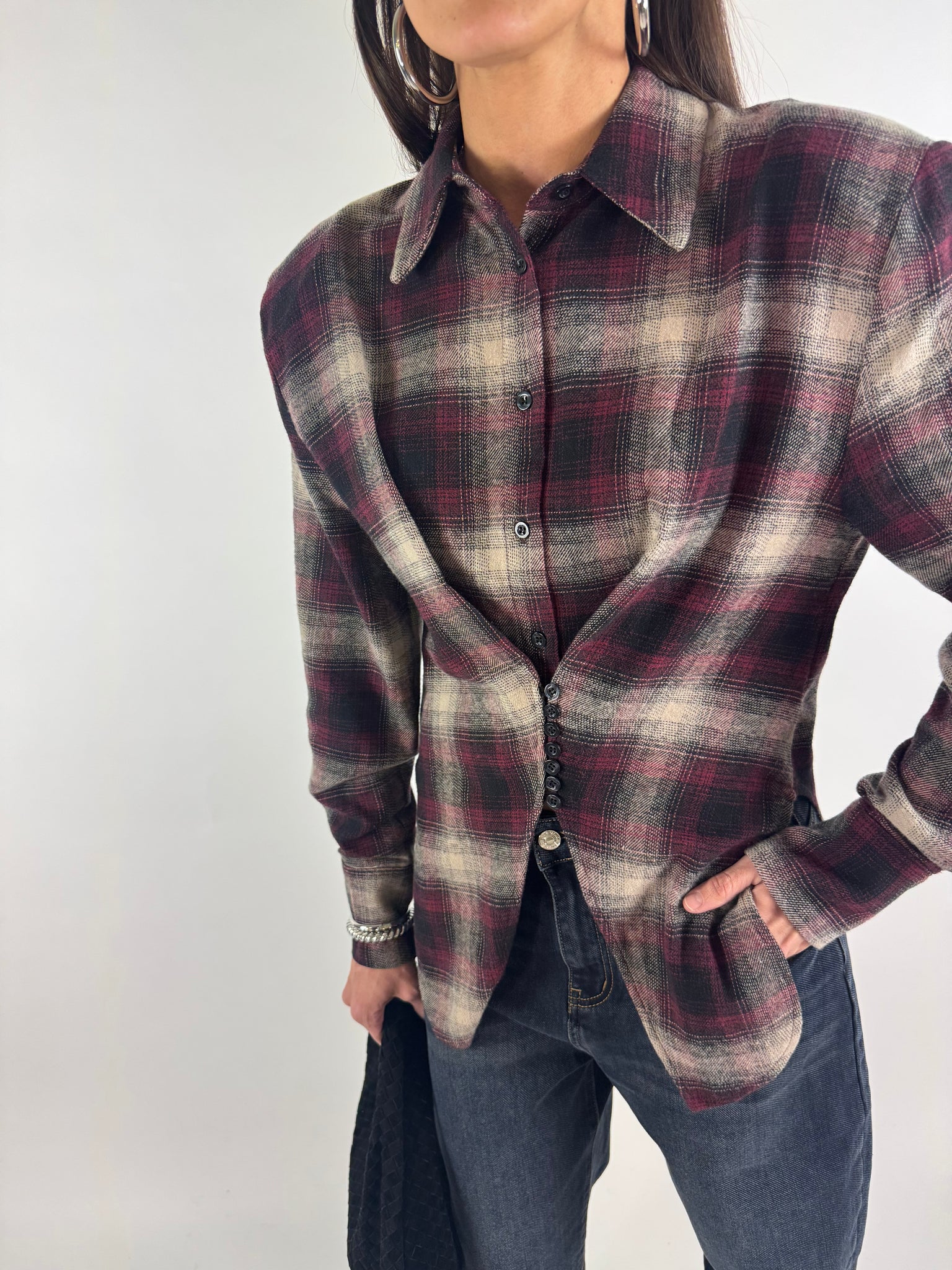 Camicia a quadri in flanella con spalline strutturate, dettaglio tessuto ripreso con bottoncini che crea un effetto sciancrato e punte di tessuto sul davanti. S: 38/42 M : 44/46