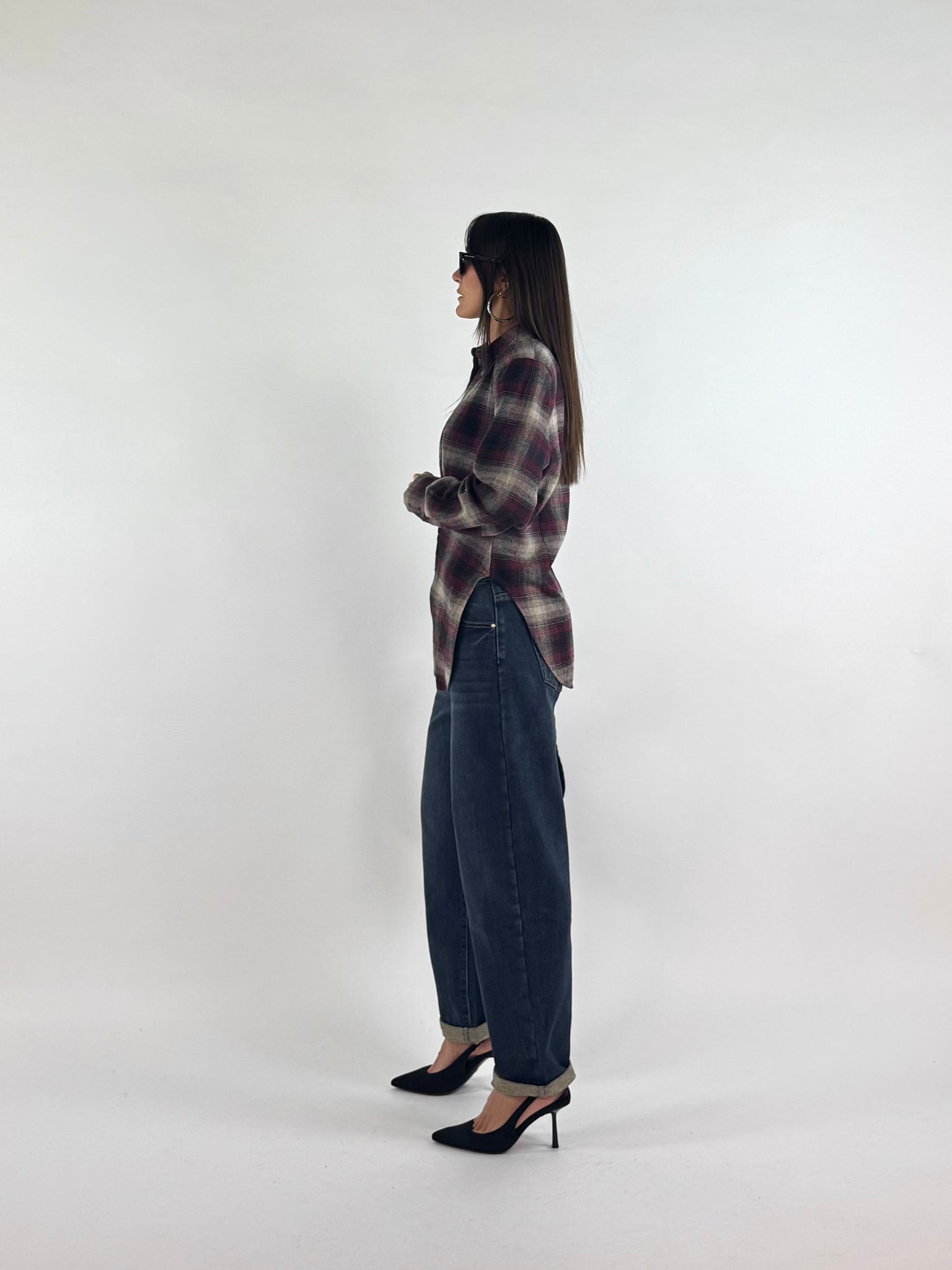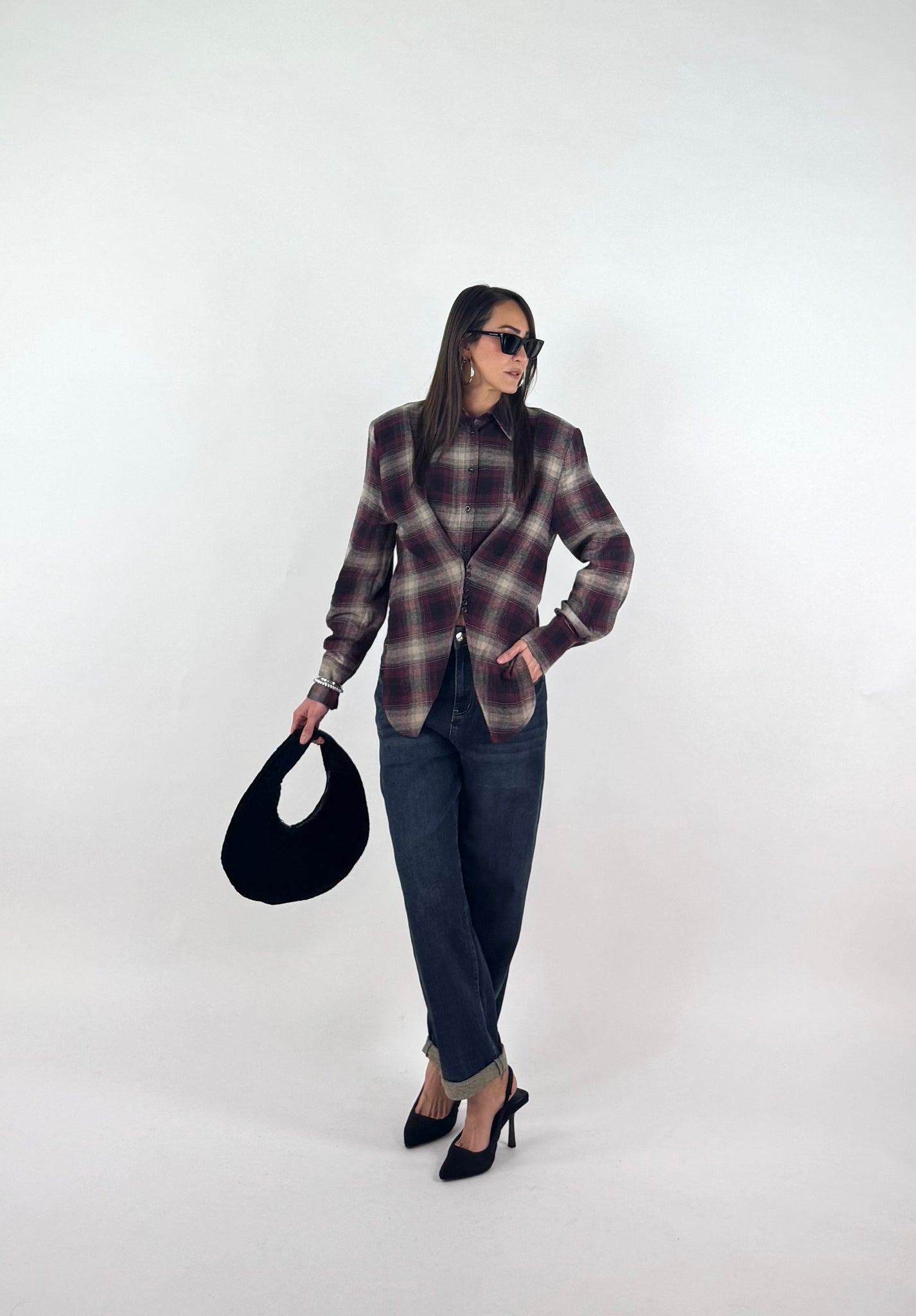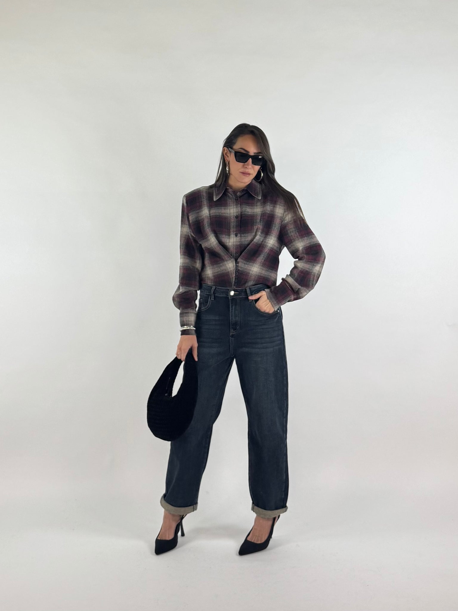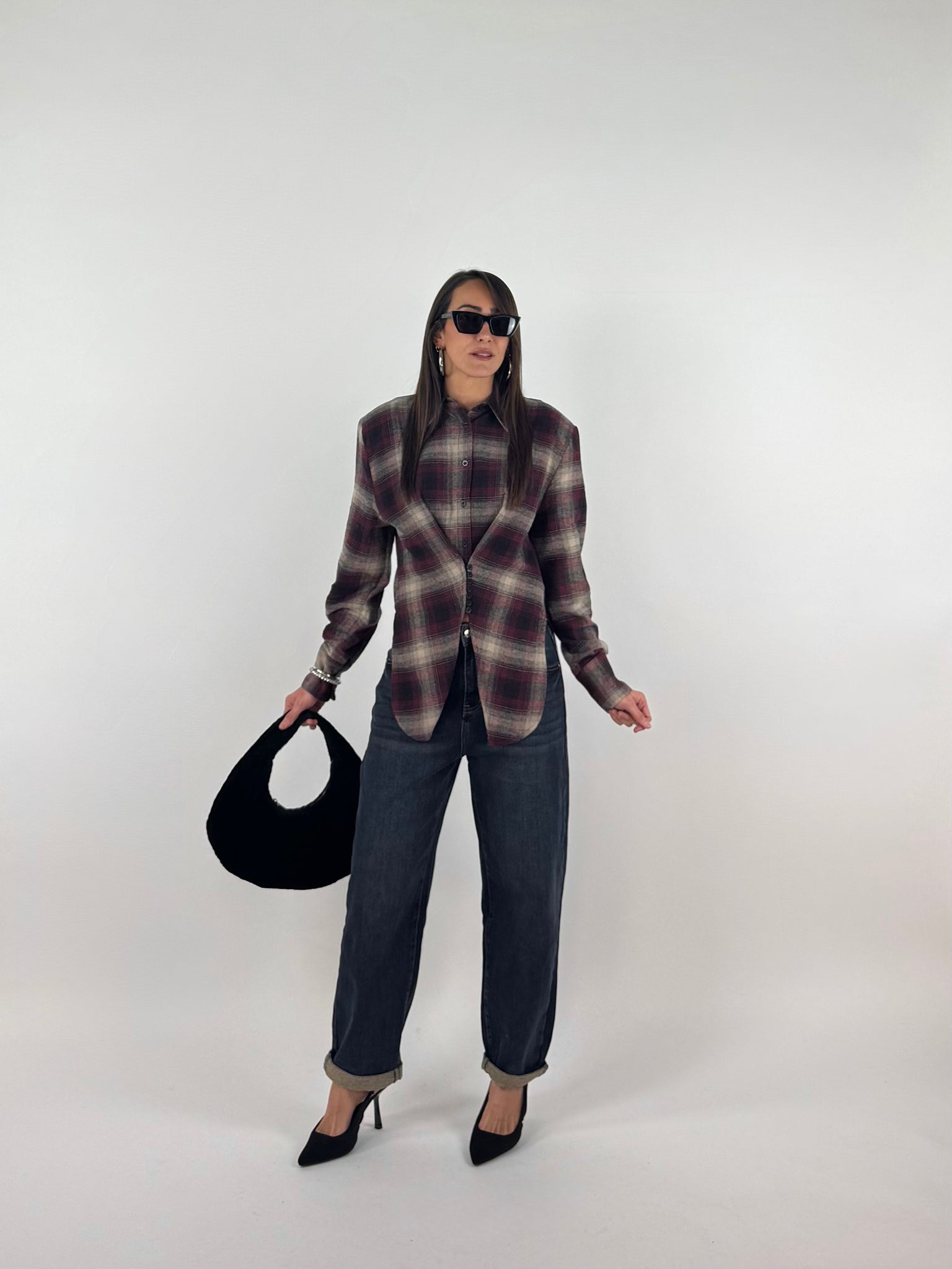 Camicia a quadri in flanella con spalline strutturate, dettaglio tessuto ripreso con bottoncini che crea un effetto sciancrato e punte di tessuto sul davanti. S: 38/42 M : 44/46