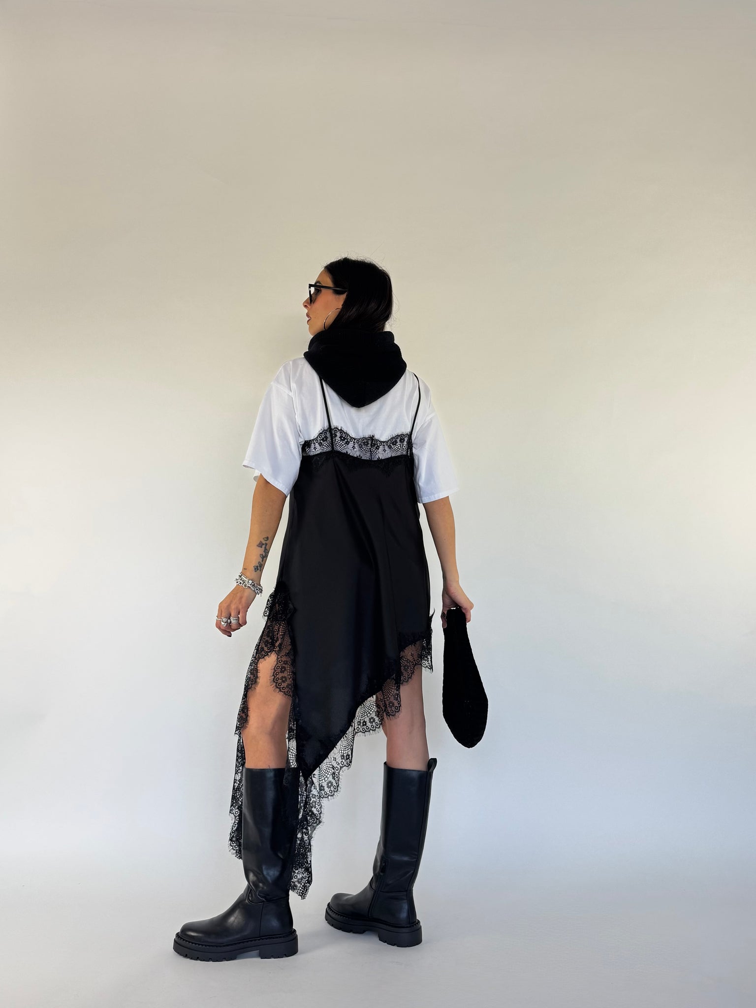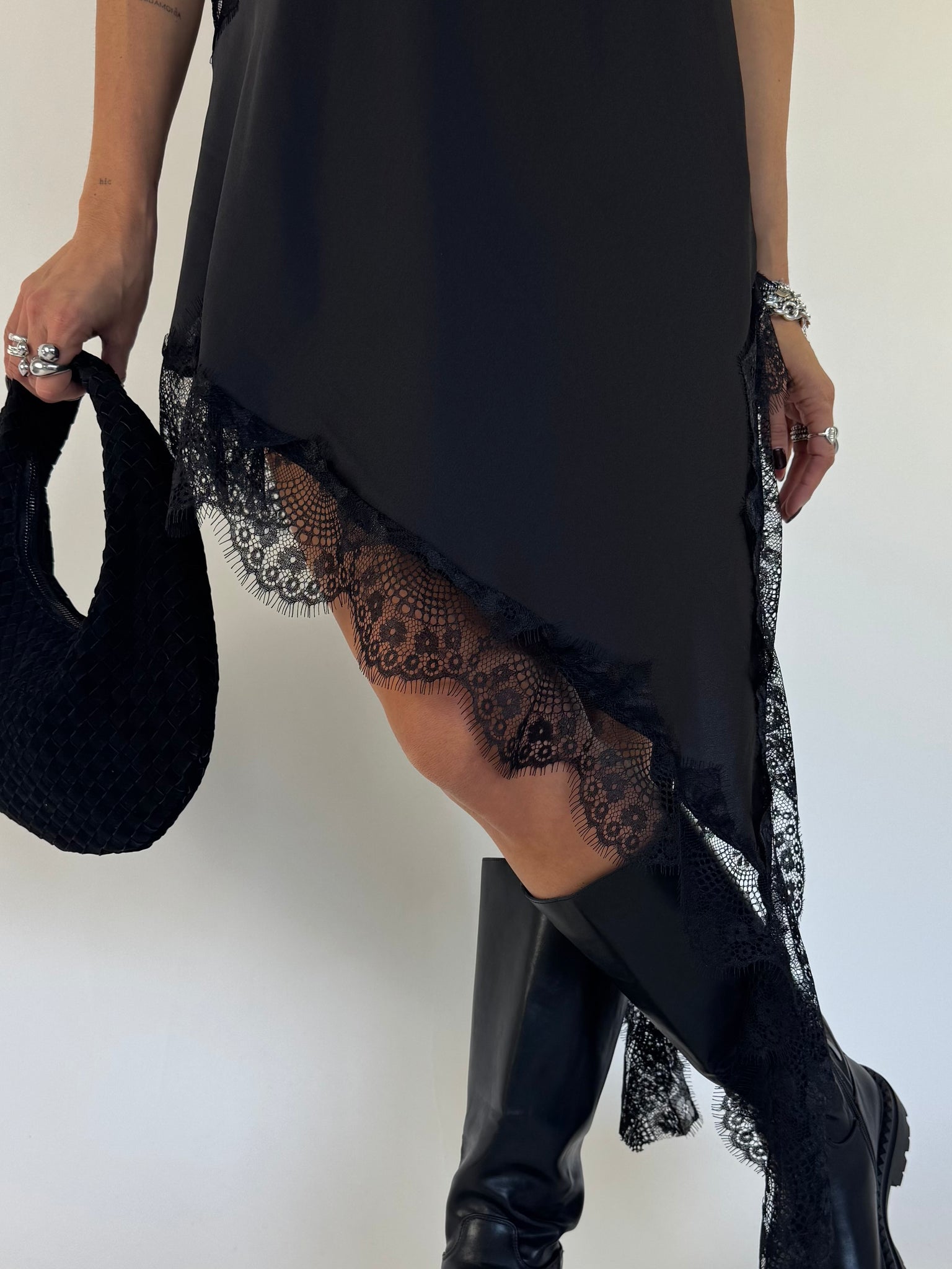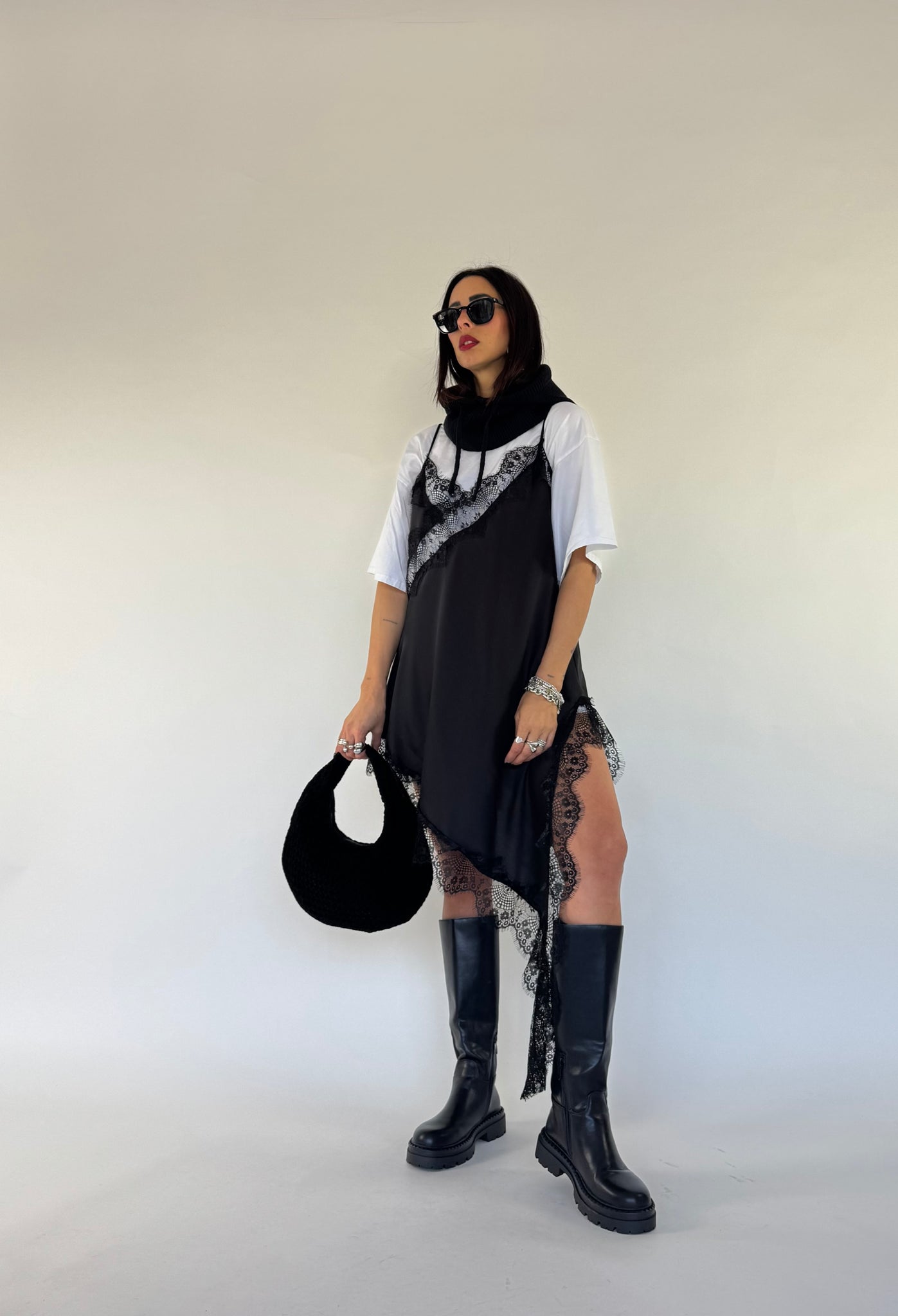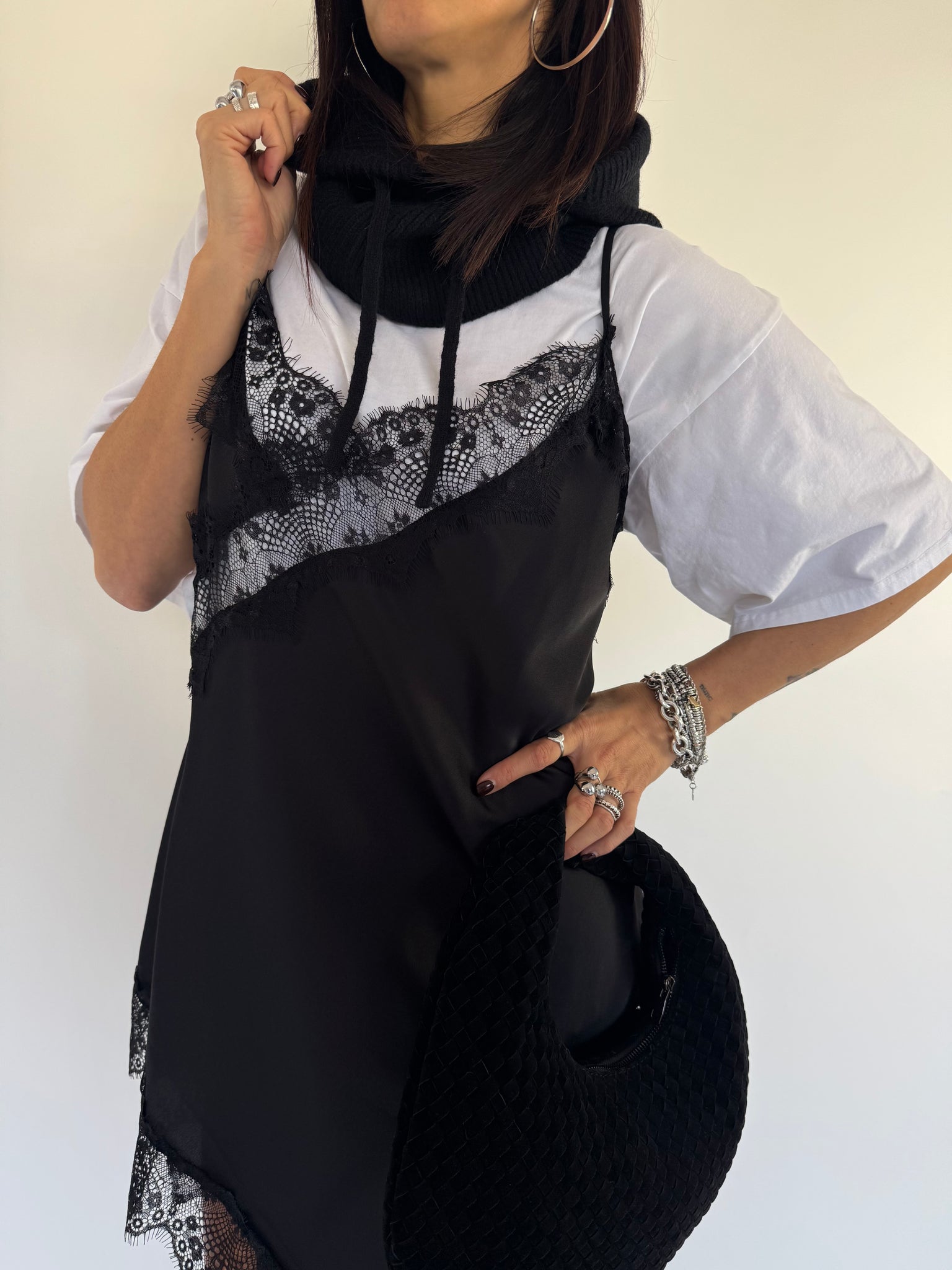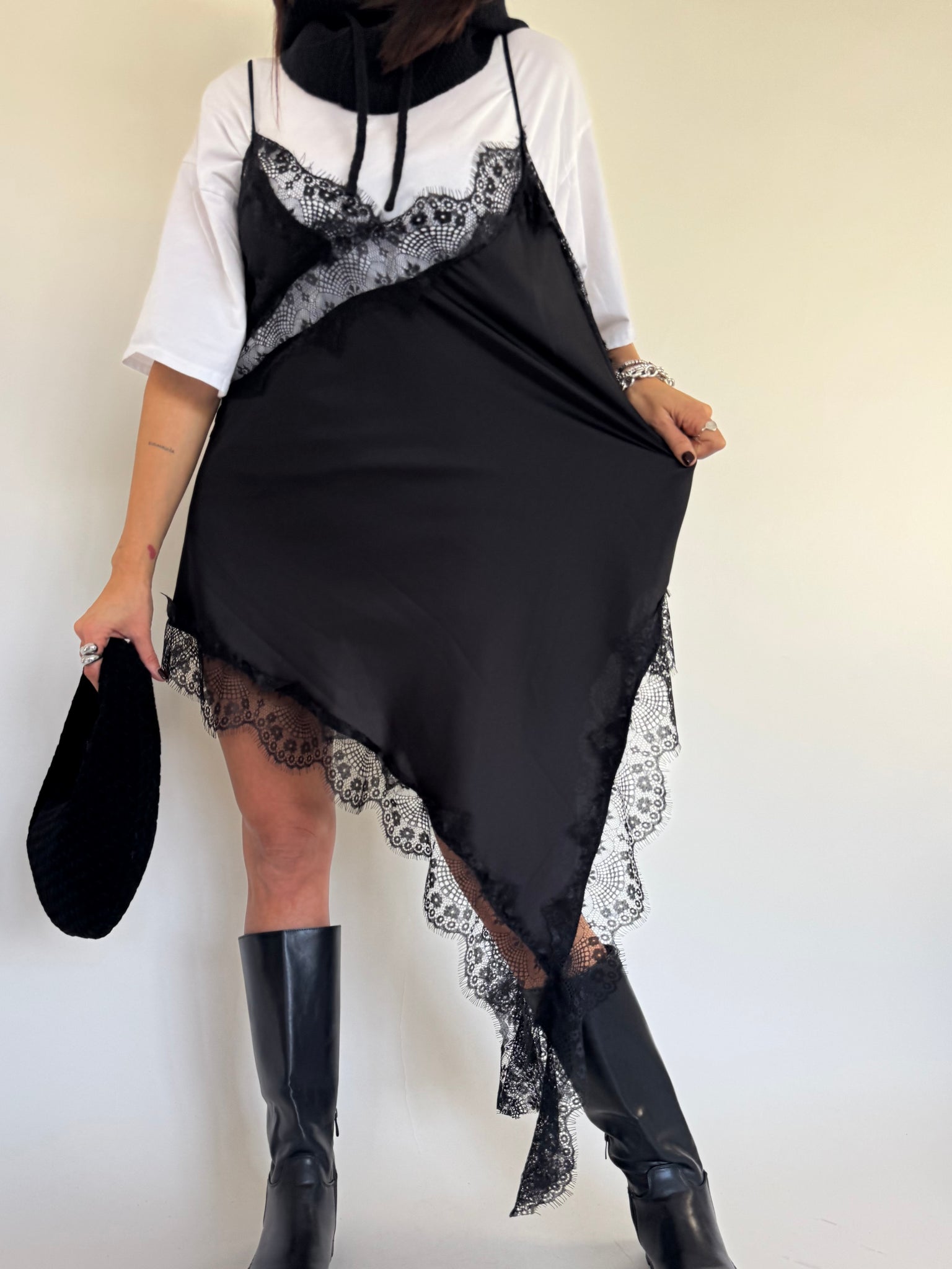 Vestito satinato dal fit morbido con scollo a V e spalline sottili; dettaglio applicazioni in pizzo. Taglia unica veste da 38 a 46