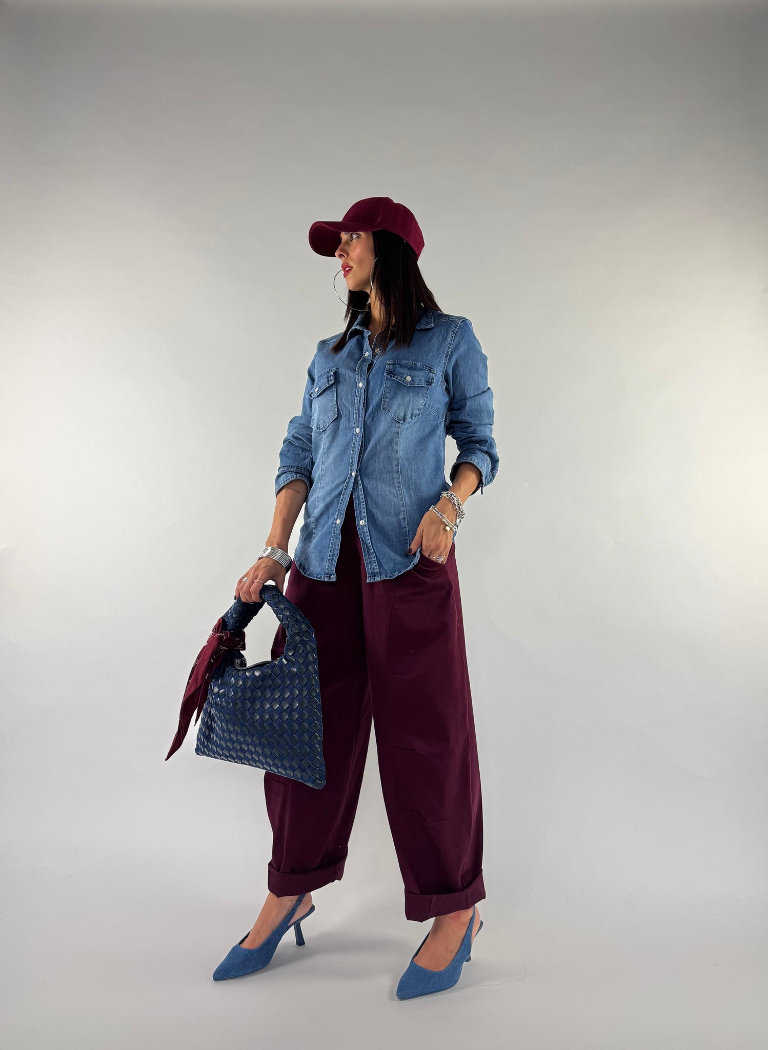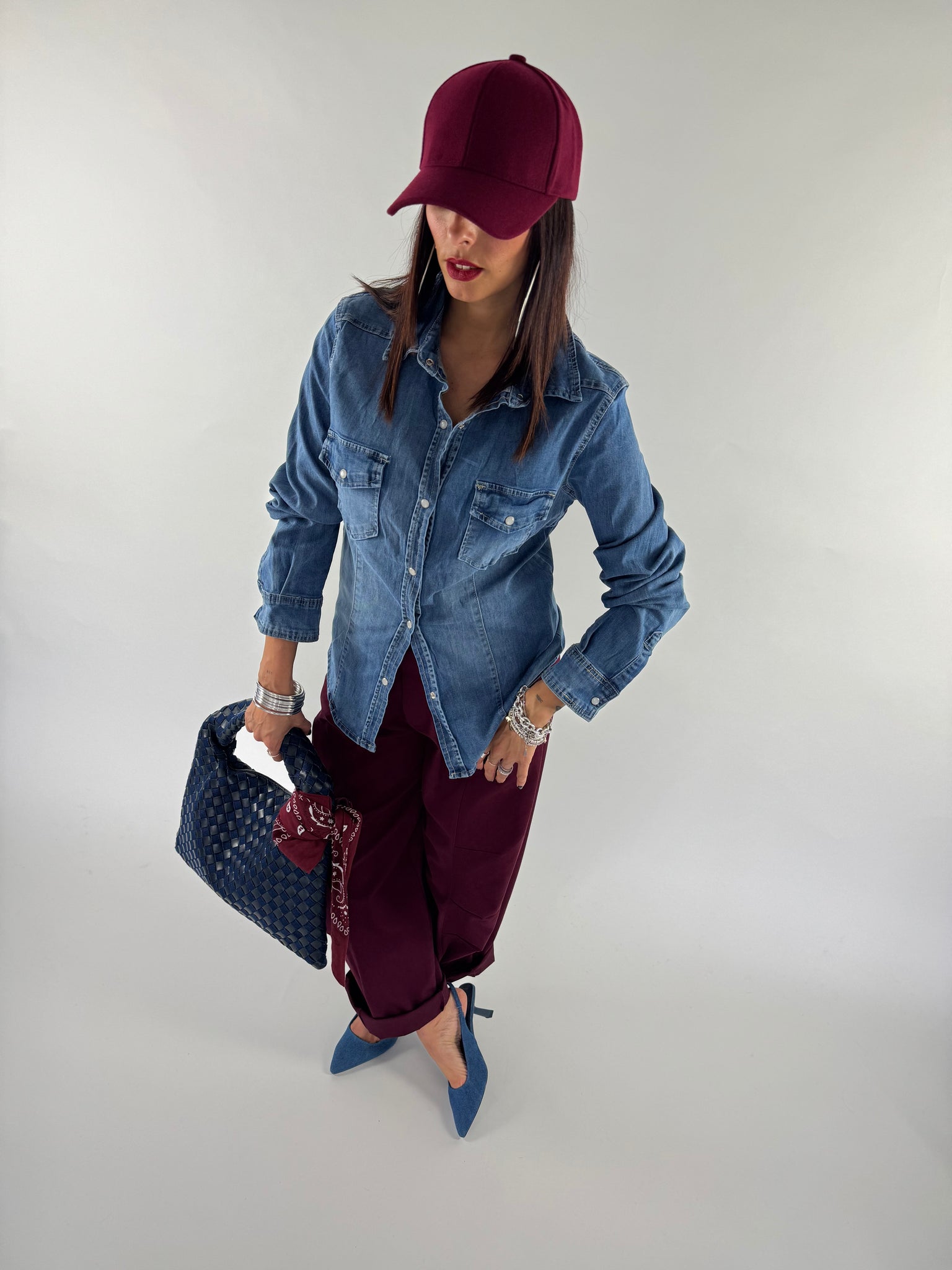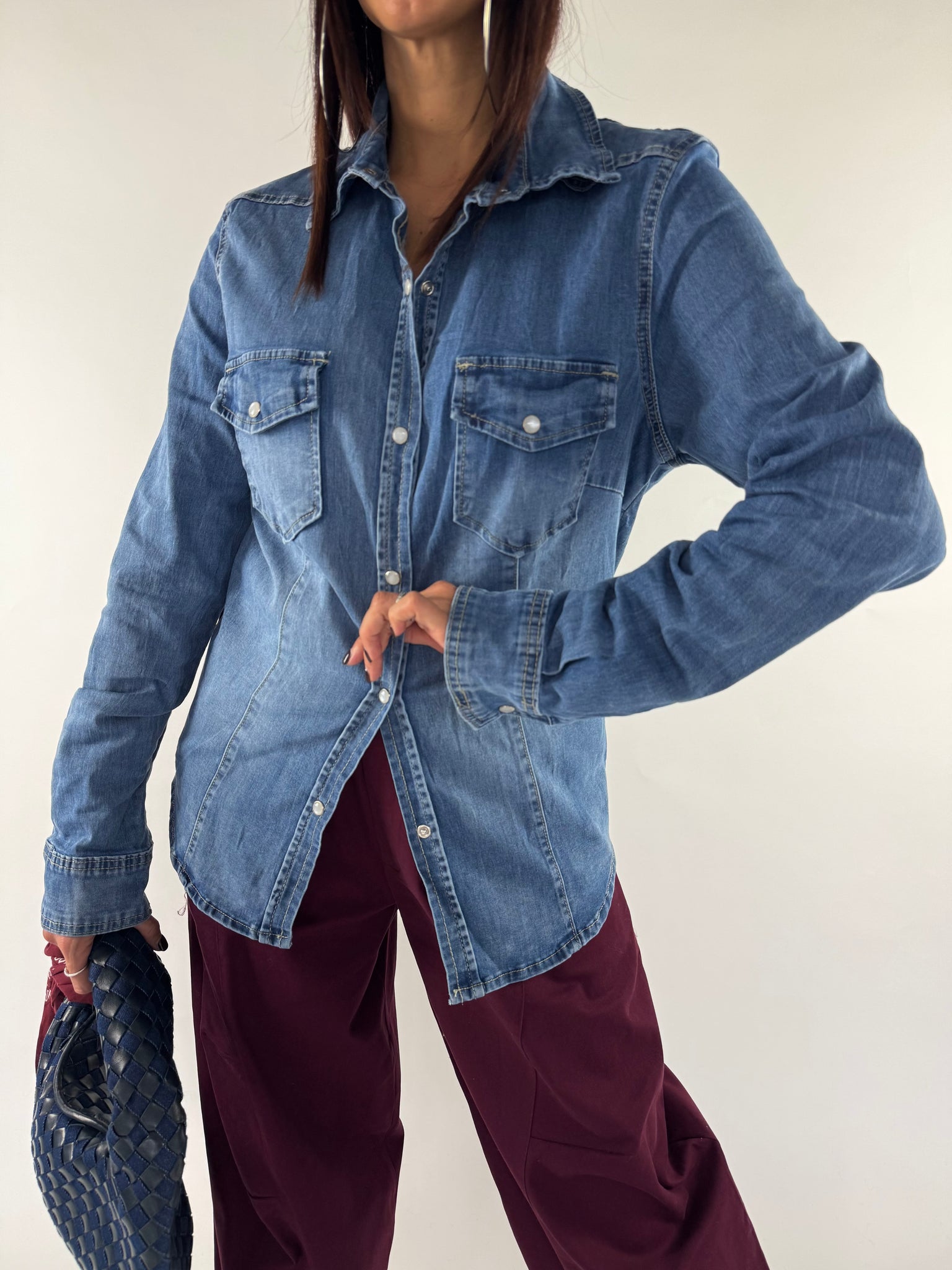 Camicia in denim lavaggio medio, cotone elasticizzato ,taschine frontali con patta, chiusura con bottoni a clip, cuciture speciali per un effetto sciancrato.Vestibilita S-38/40 M-42/44 L-44/46