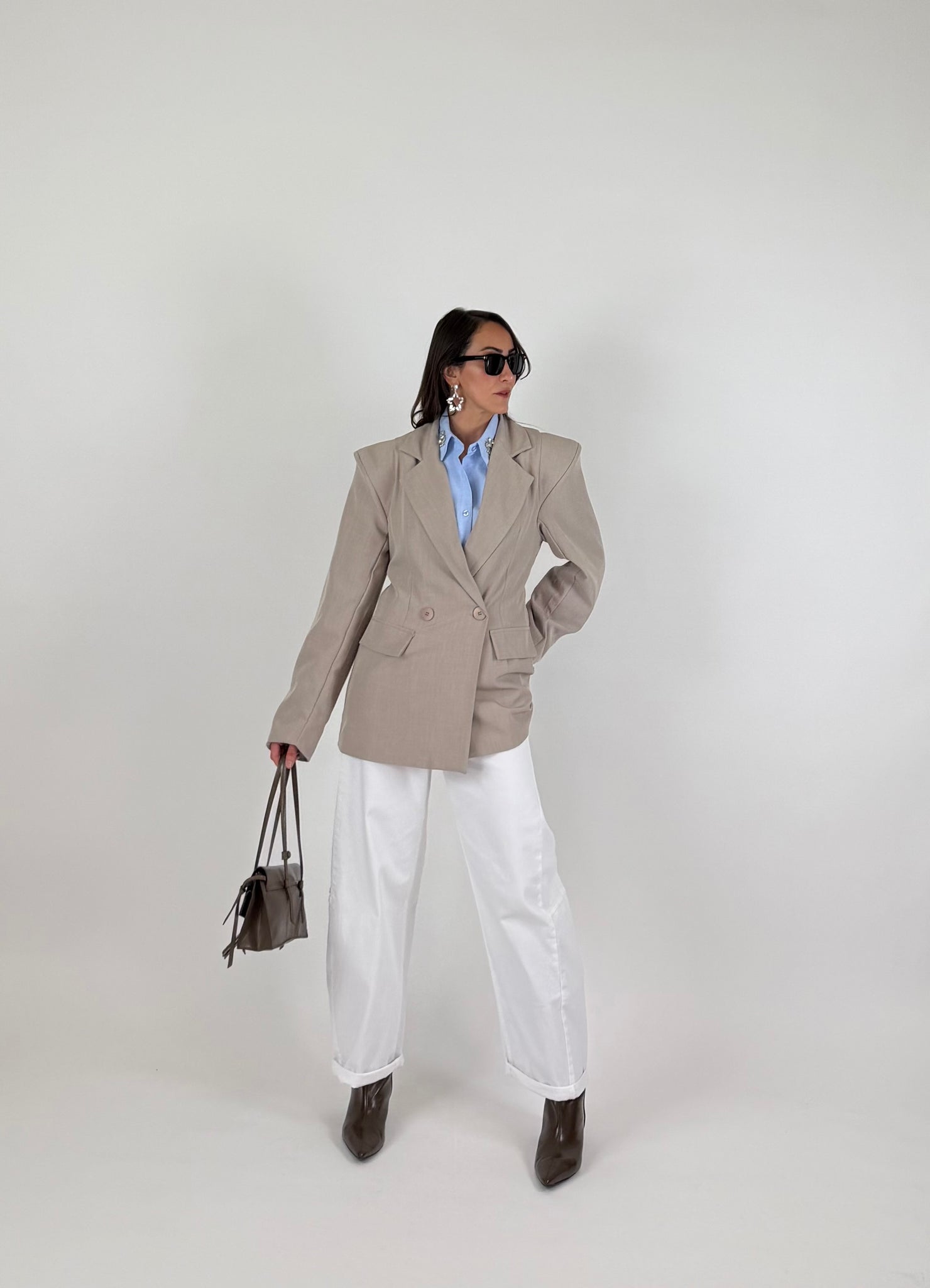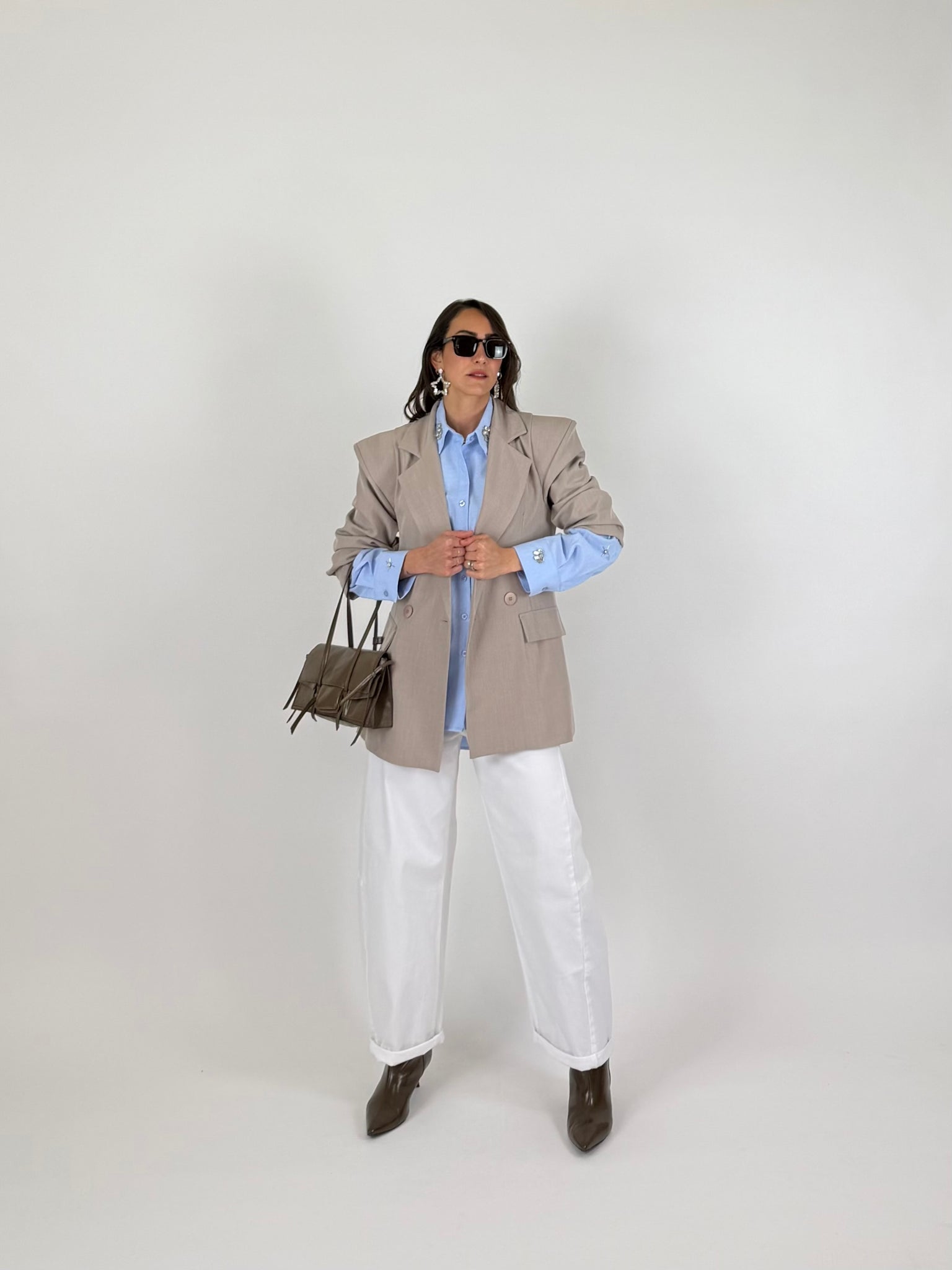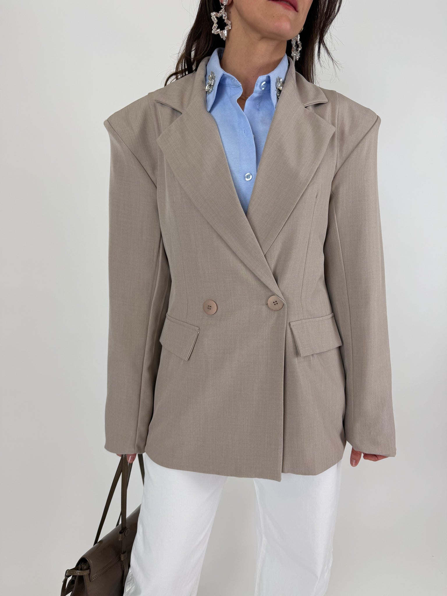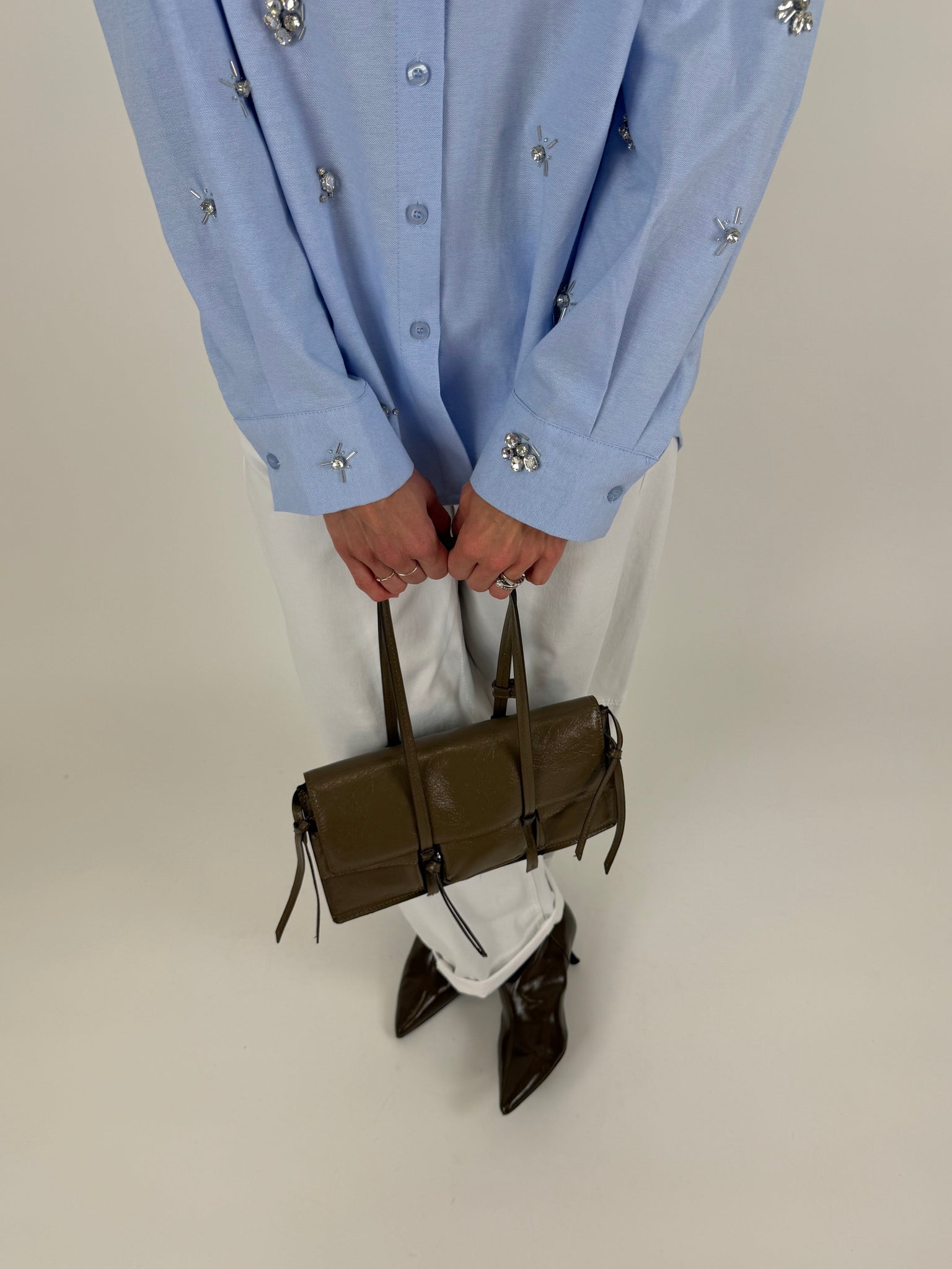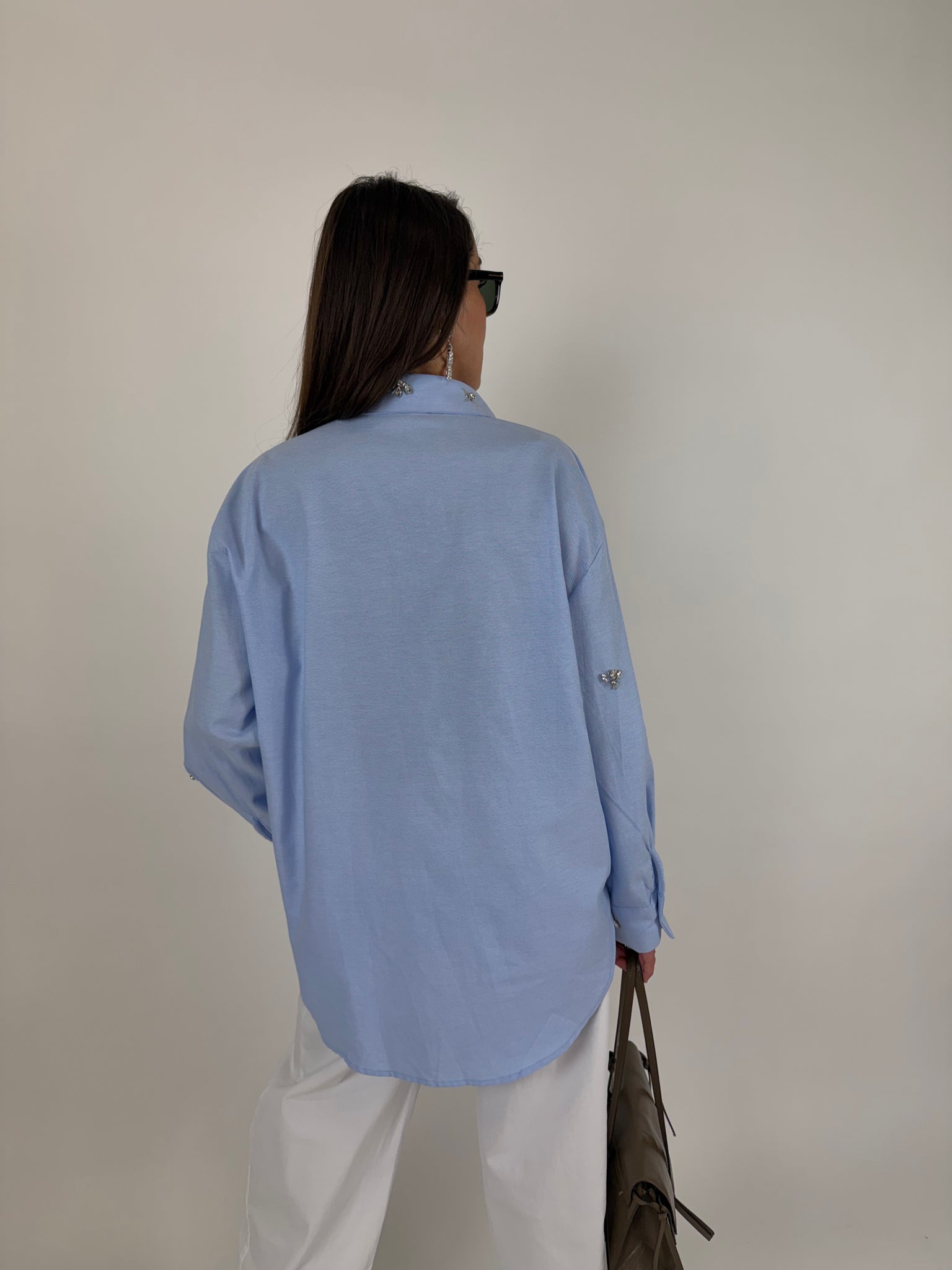 Camicia in cotone base azzurra con dettaglio Swarovski. Fit morbido, orlo stondato. Taglia unica veste da 38 a 46