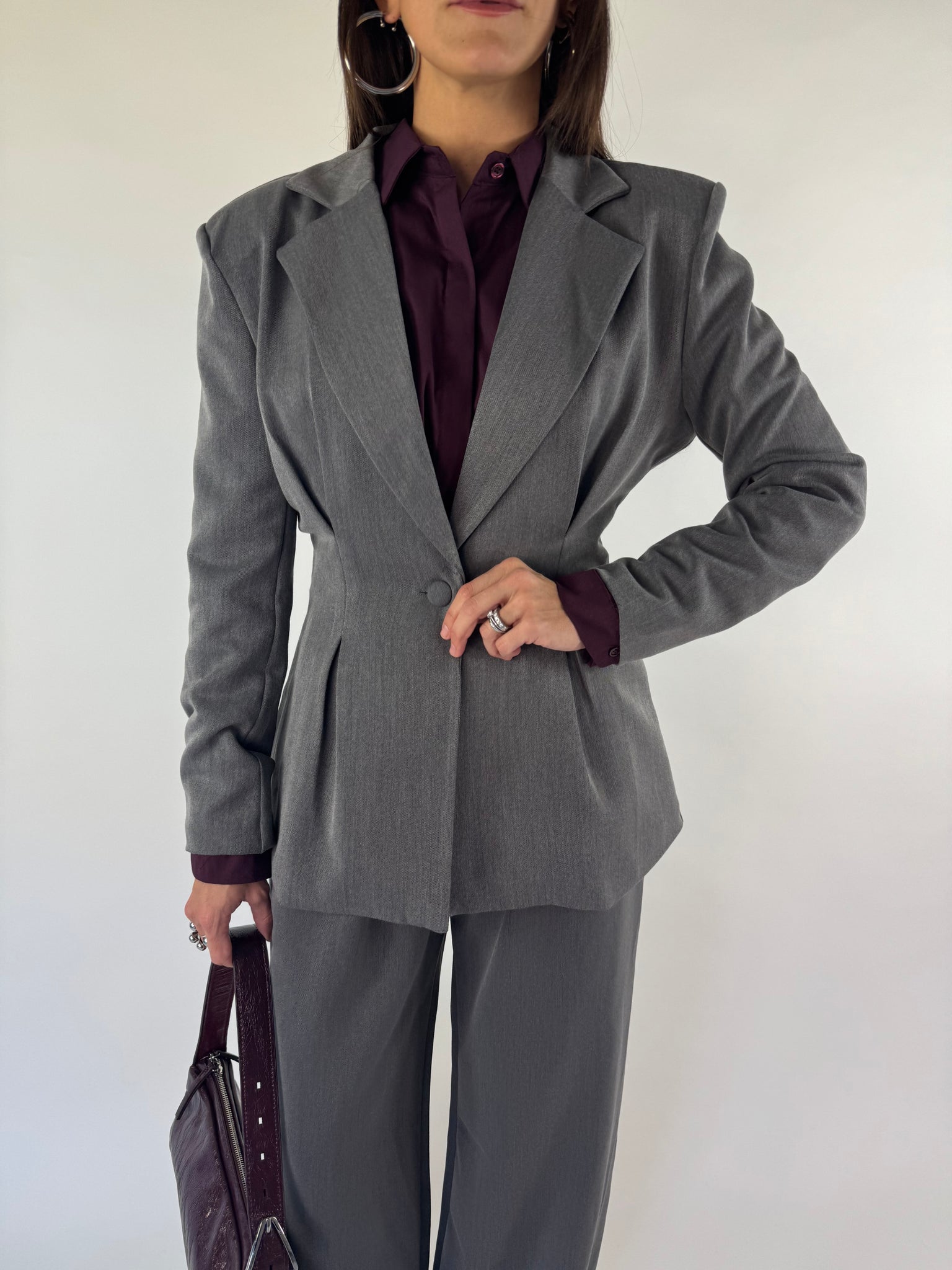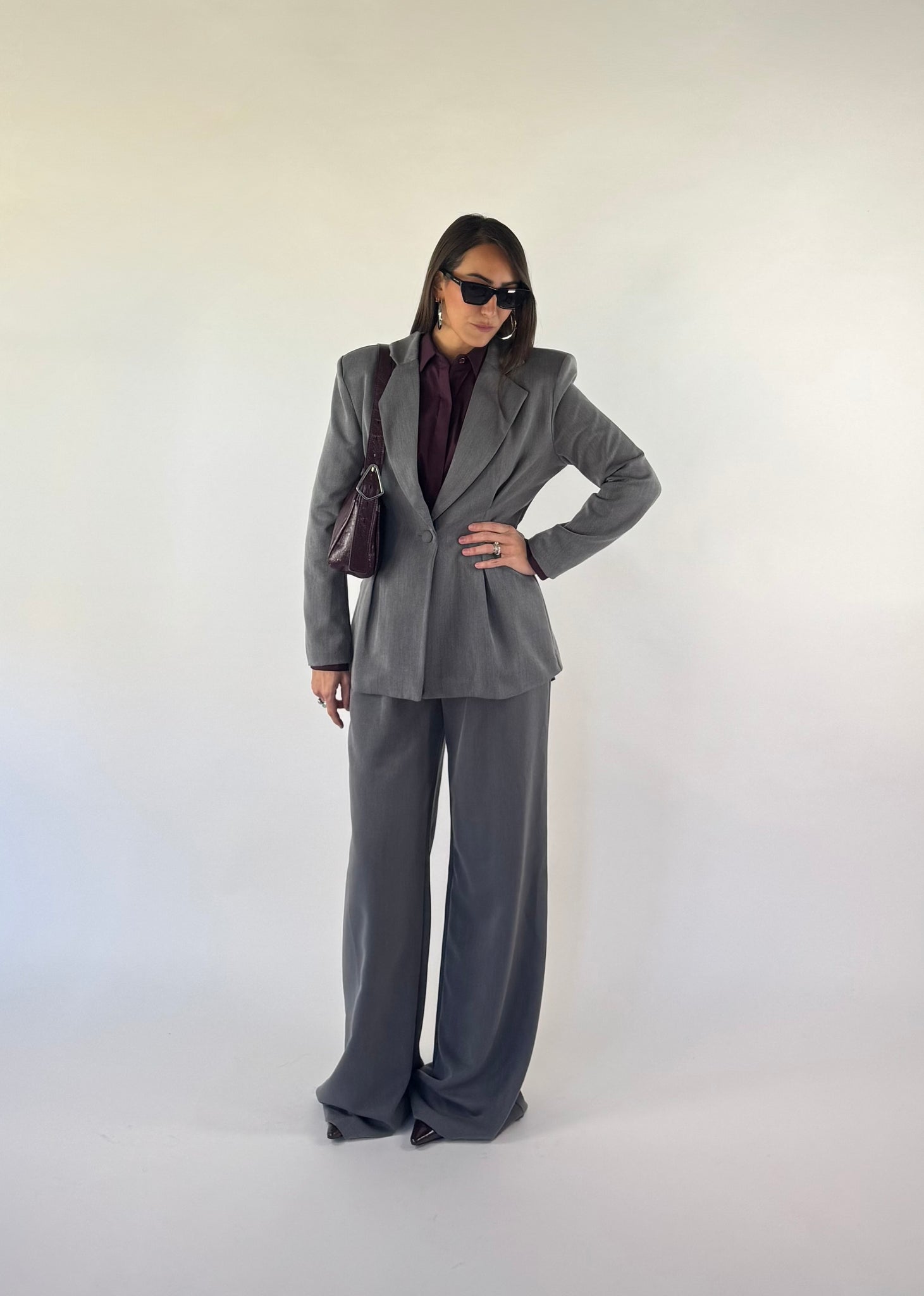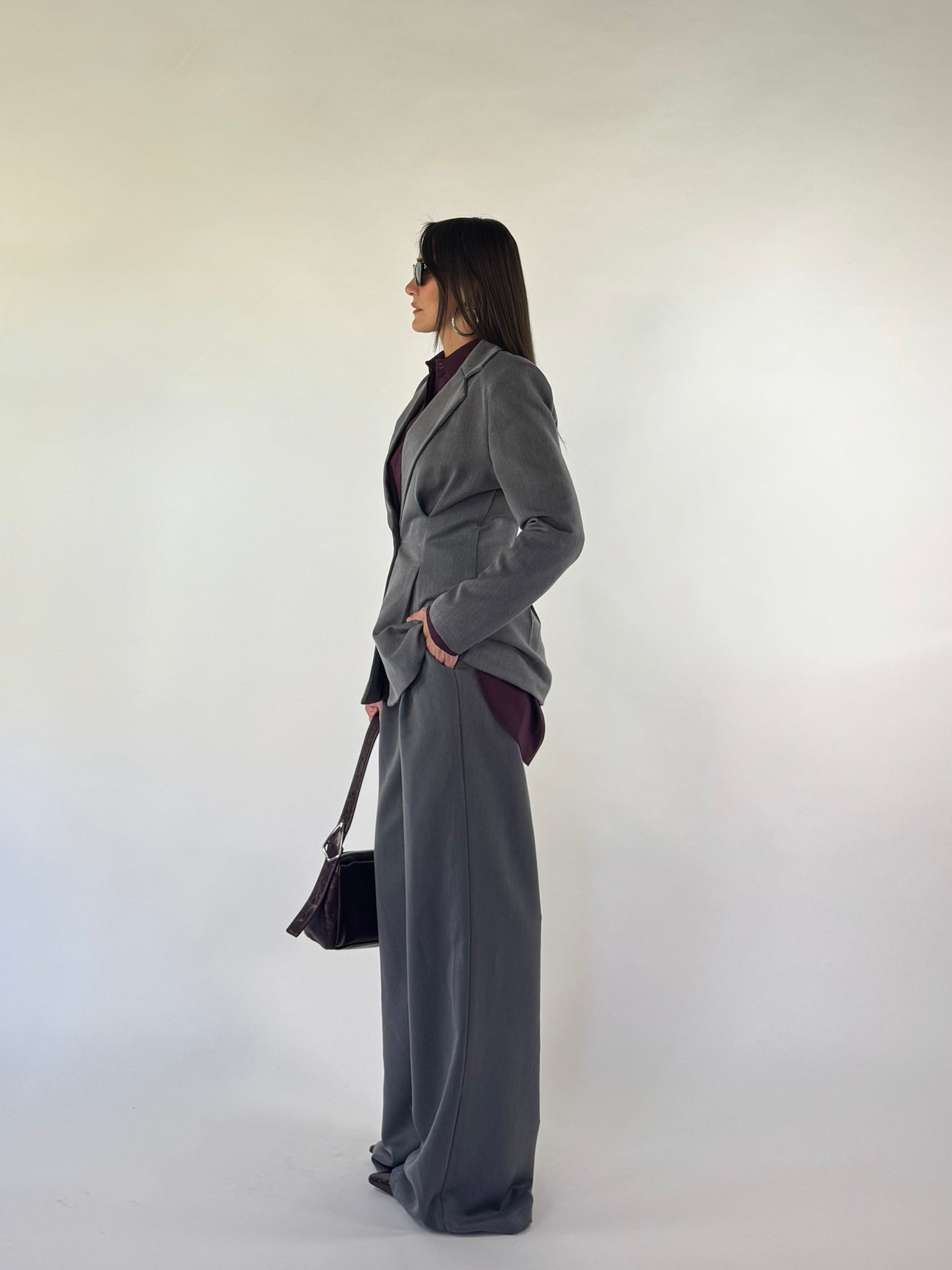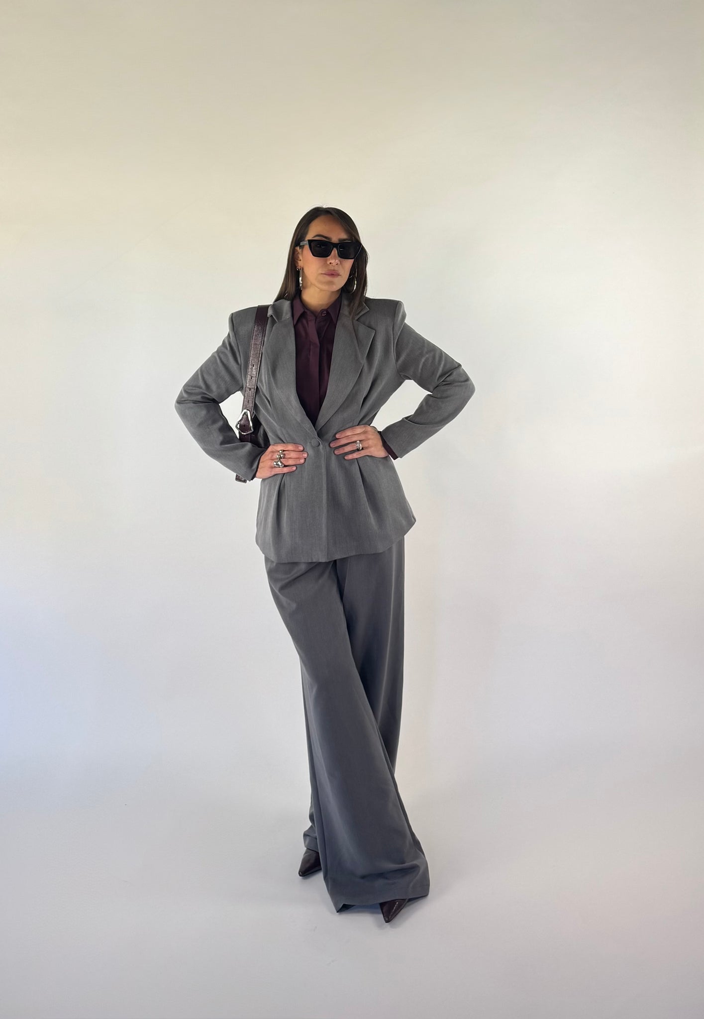 Completo composto da giacca mono bottone sciancrata ai lati, collo reverse ,pantalone a palazzo ampio in gamba con elastico sul retro e tasche laterali, dettaglio maxi passante per cintura. Tagli unica veste da 38 a 44. Estensione massima dell elastico in vita 90 cm di circonferenza, lunghezza 117 cm