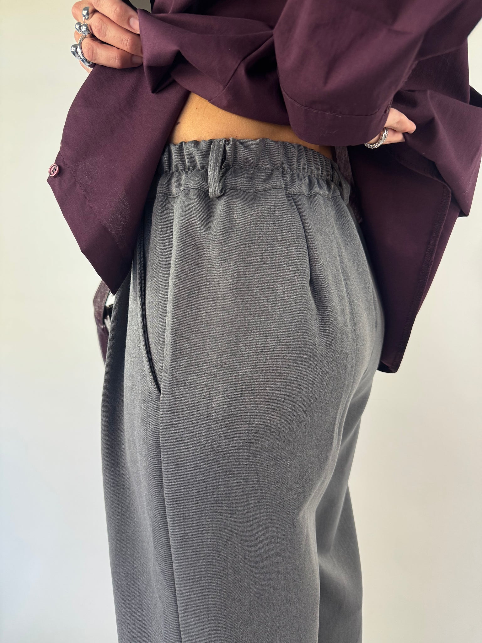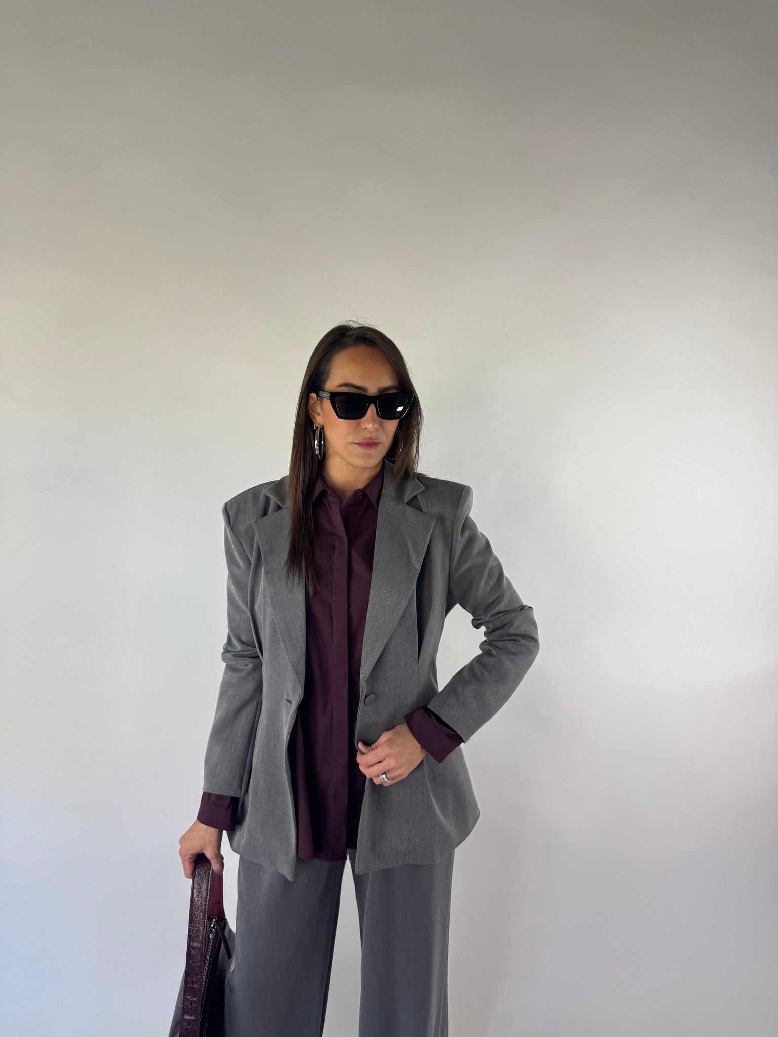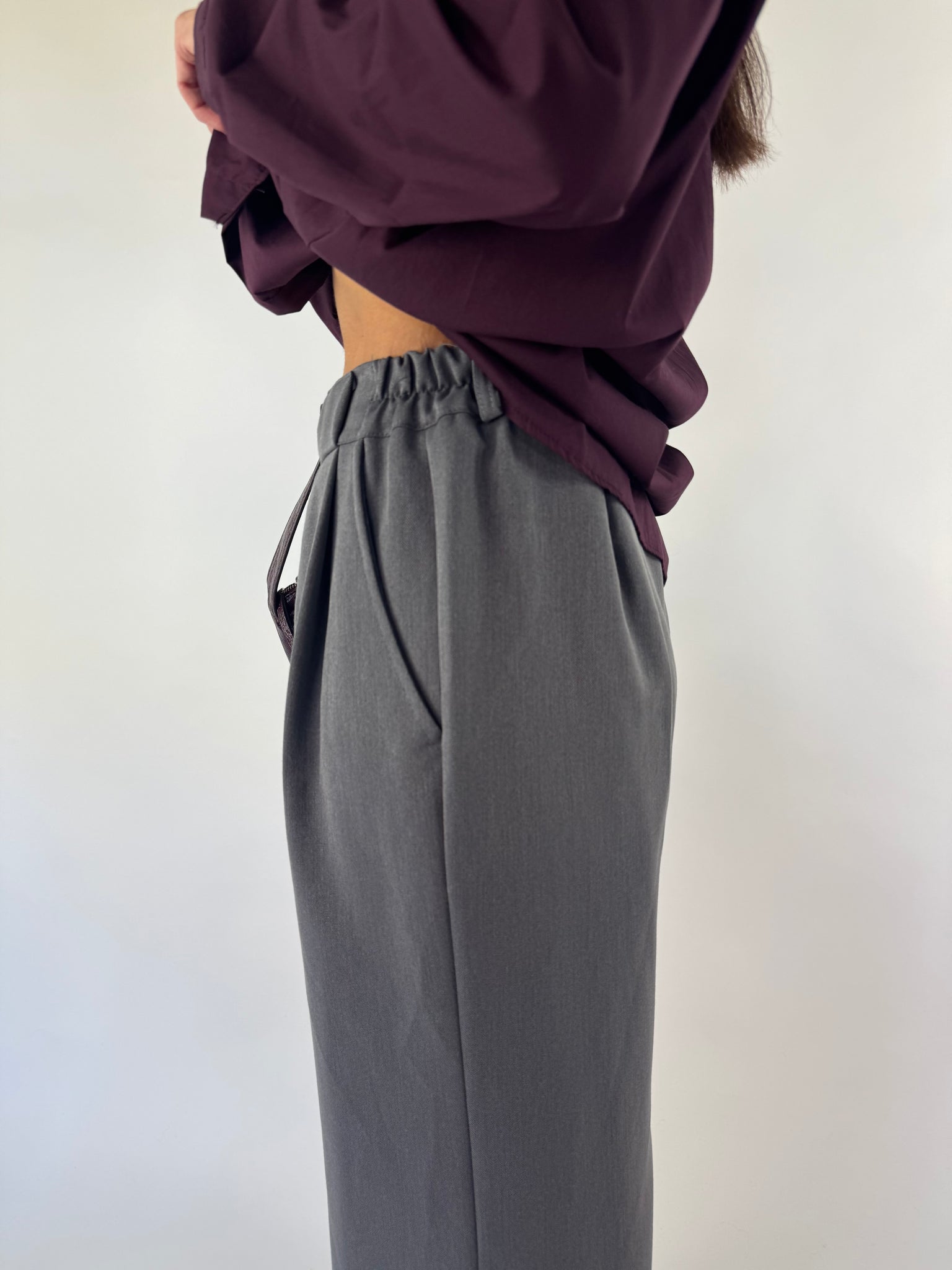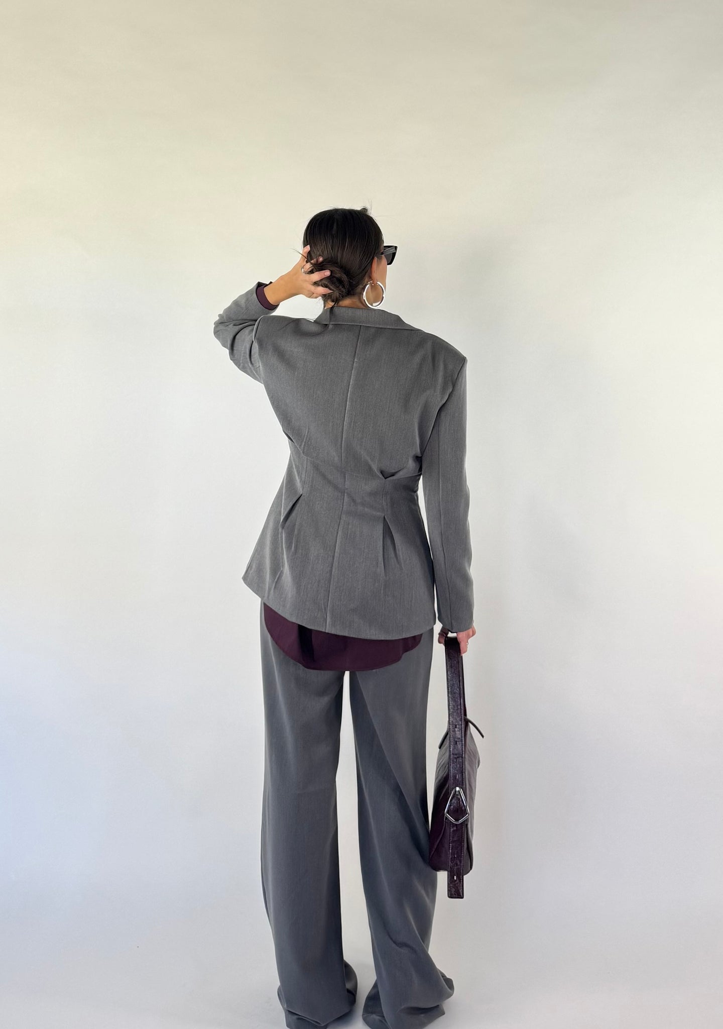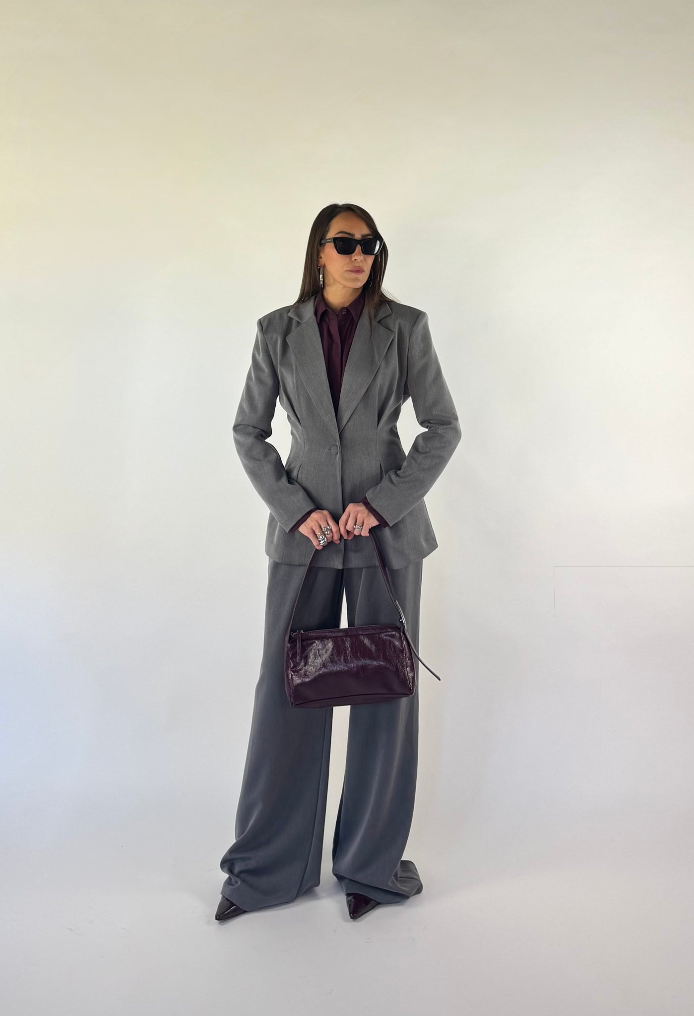 Completo composto da giacca mono bottone sciancrata ai lati, collo reverse ,pantalone a palazzo ampio in gamba con elastico sul retro e tasche laterali, dettaglio maxi passante per cintura. Tagli unica veste da 38 a 44. Estensione massima dell elastico in vita 90 cm di circonferenza, lunghezza 117 cm