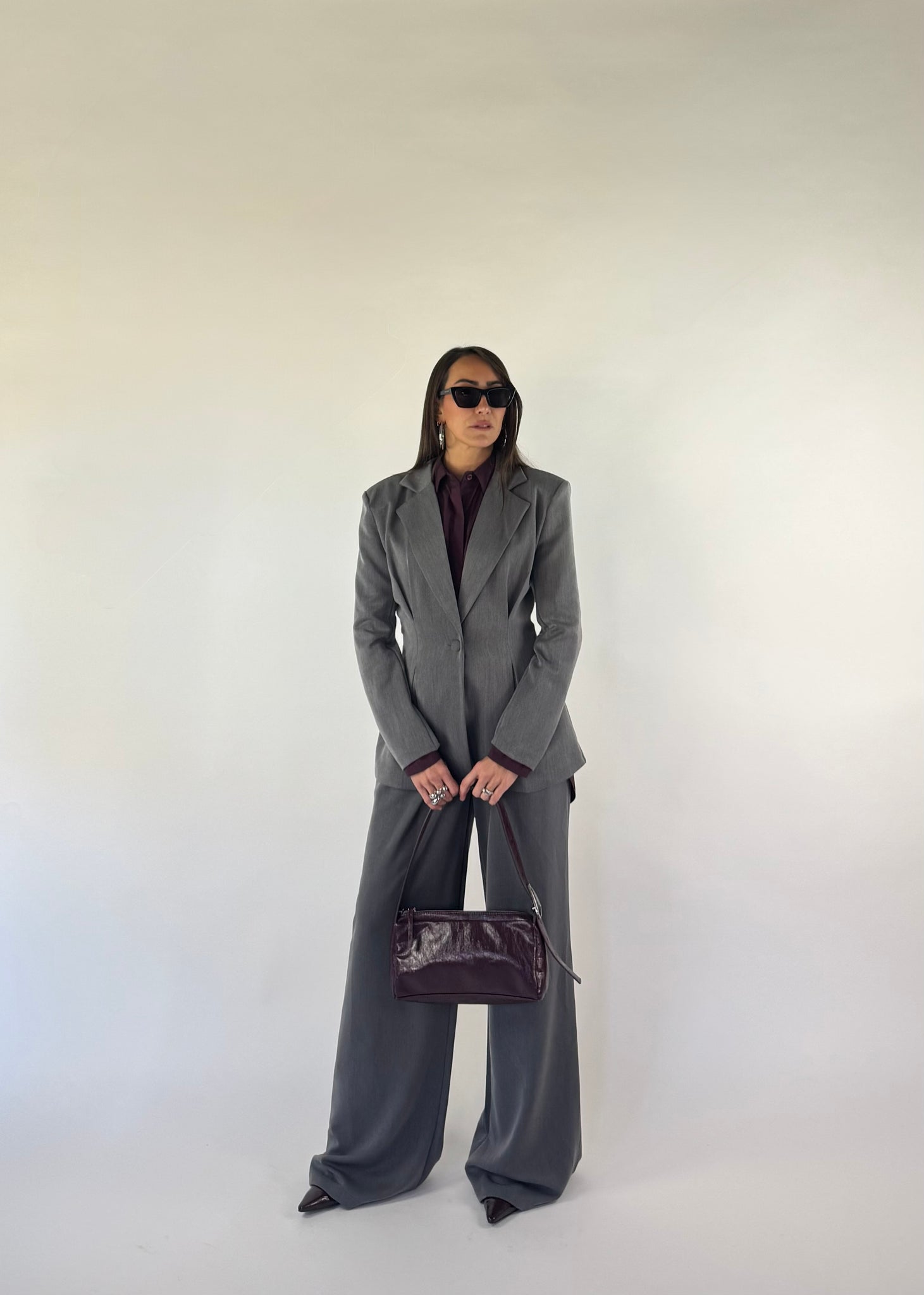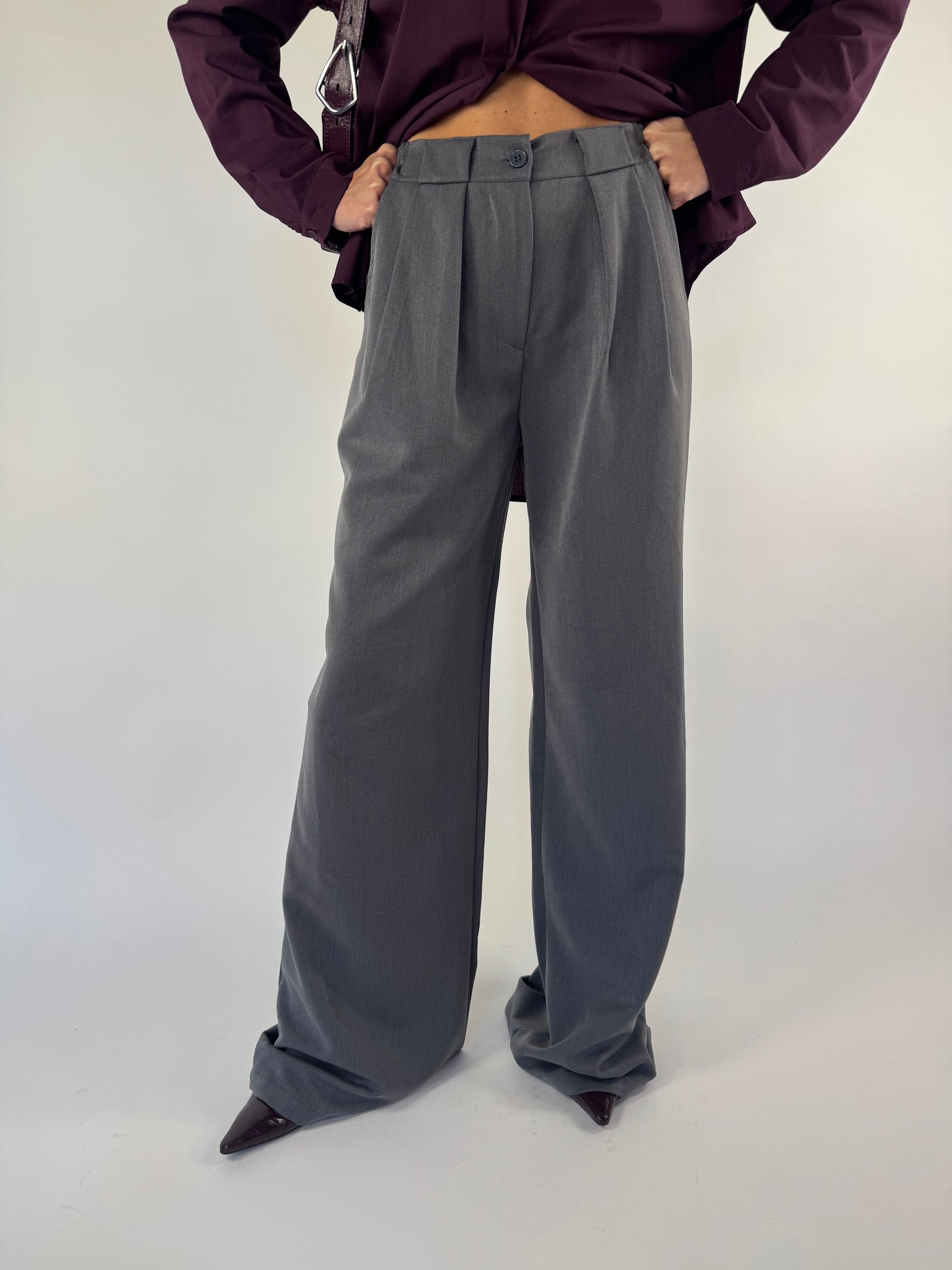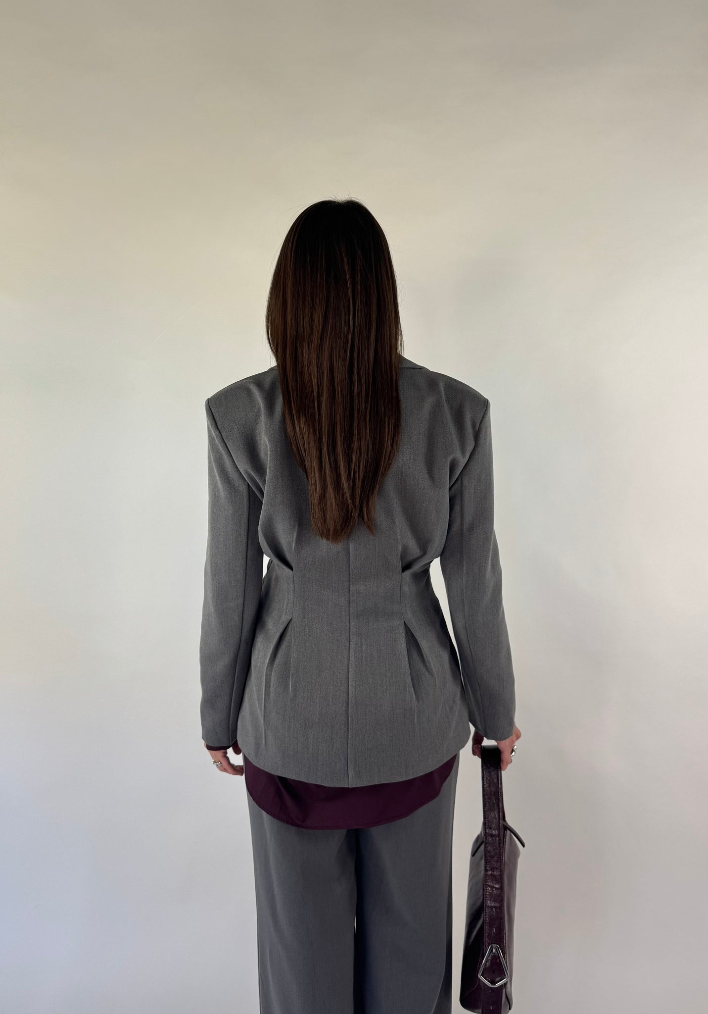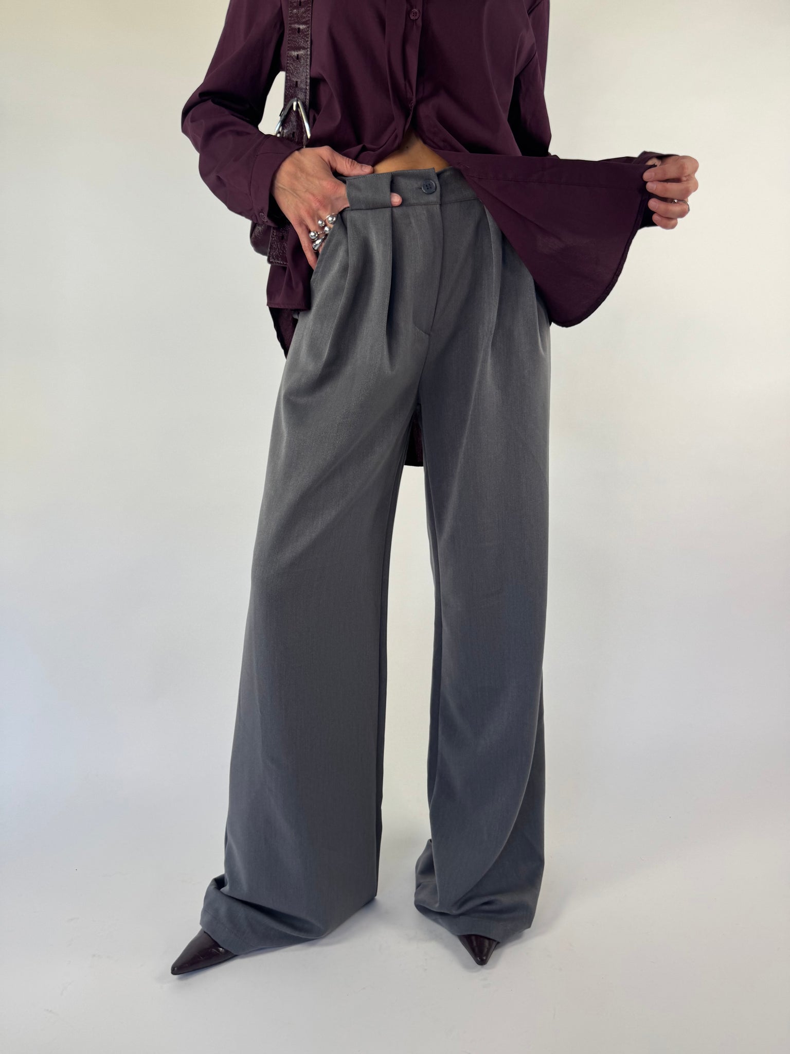 Completo composto da giacca mono bottone sciancrata ai lati, collo reverse ,pantalone a palazzo ampio in gamba con elastico sul retro e tasche laterali, dettaglio maxi passante per cintura. Tagli unica veste da 38 a 44. Estensione massima dell elastico in vita 90 cm di circonferenza, lunghezza 117 cm