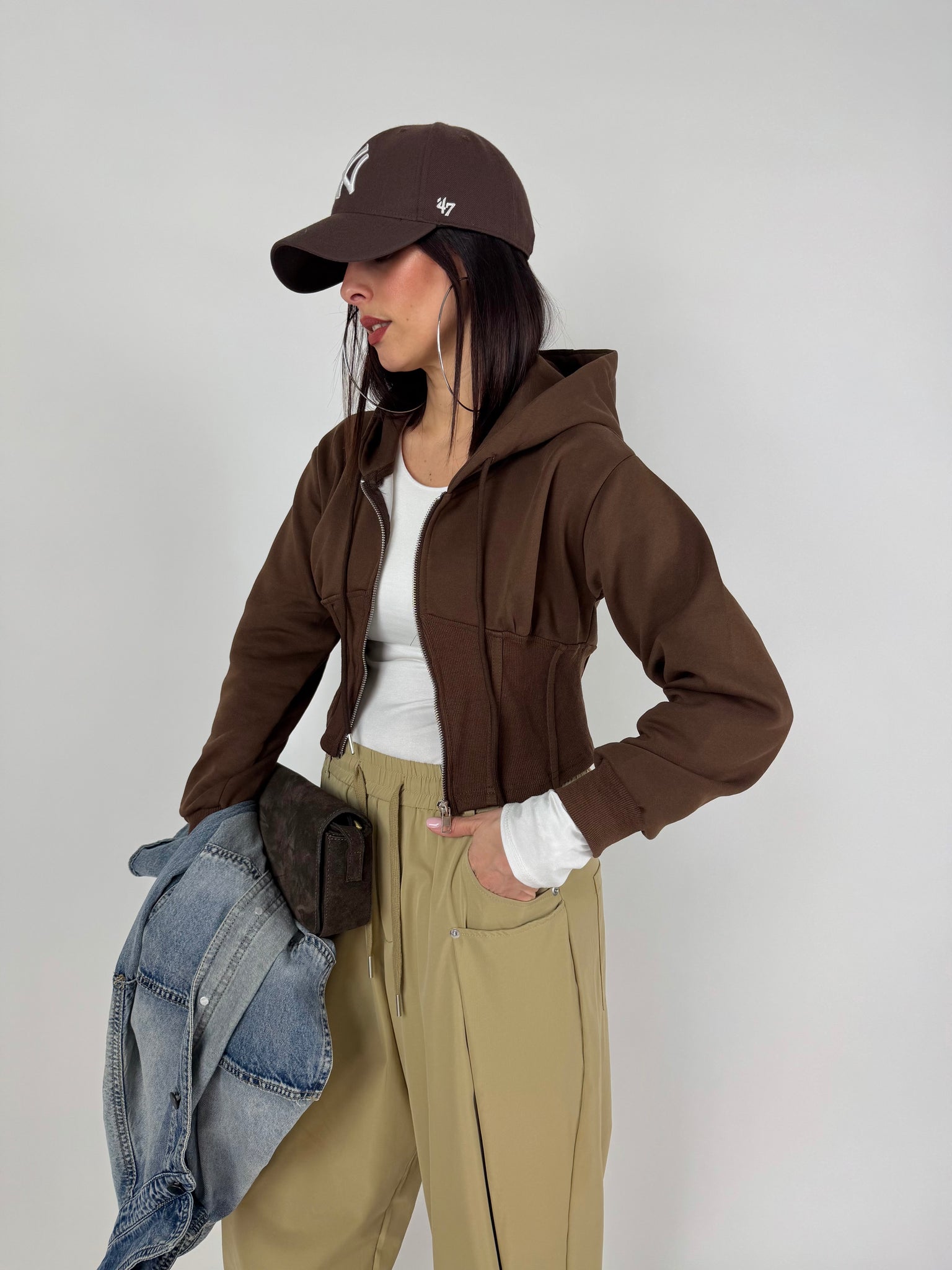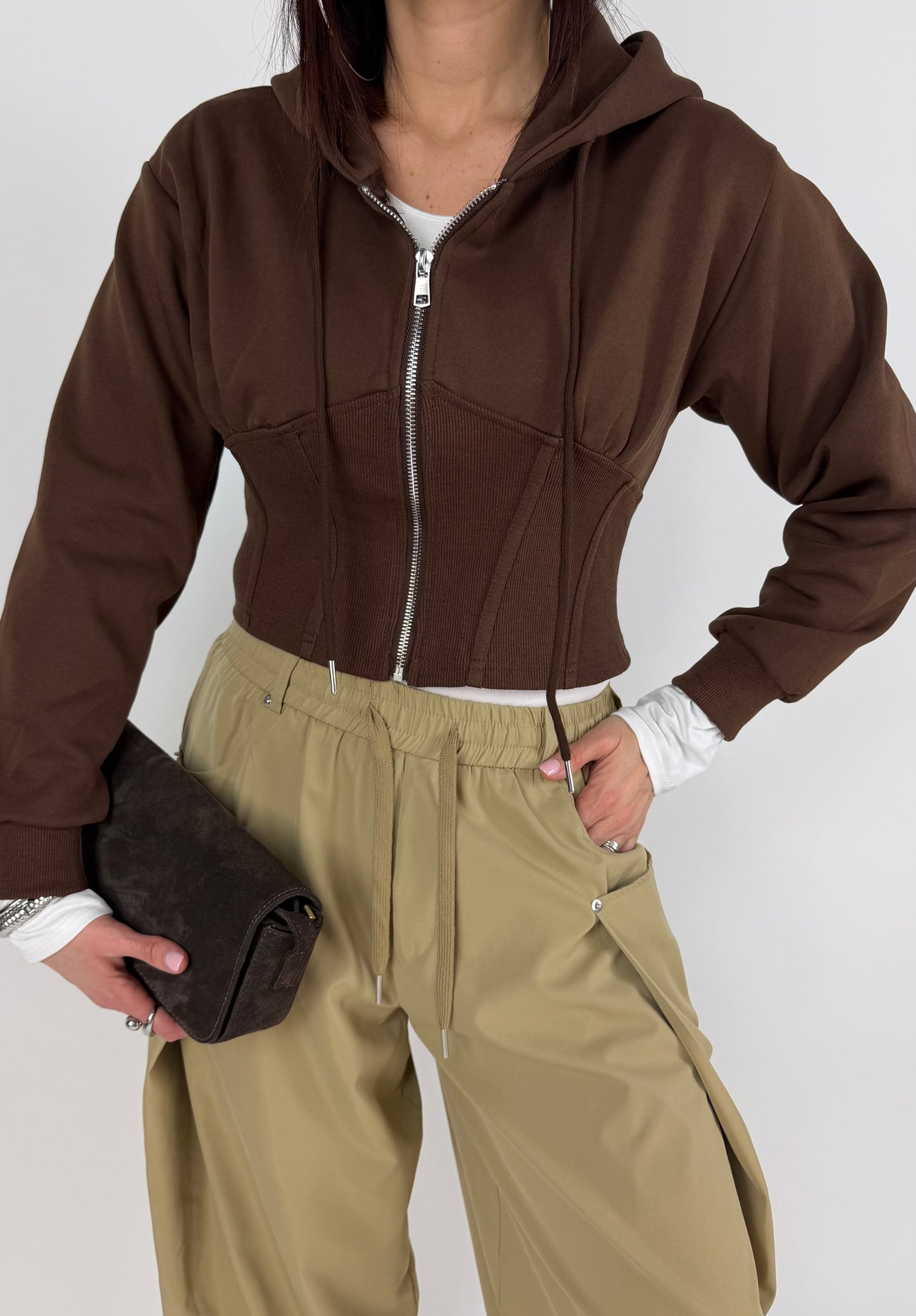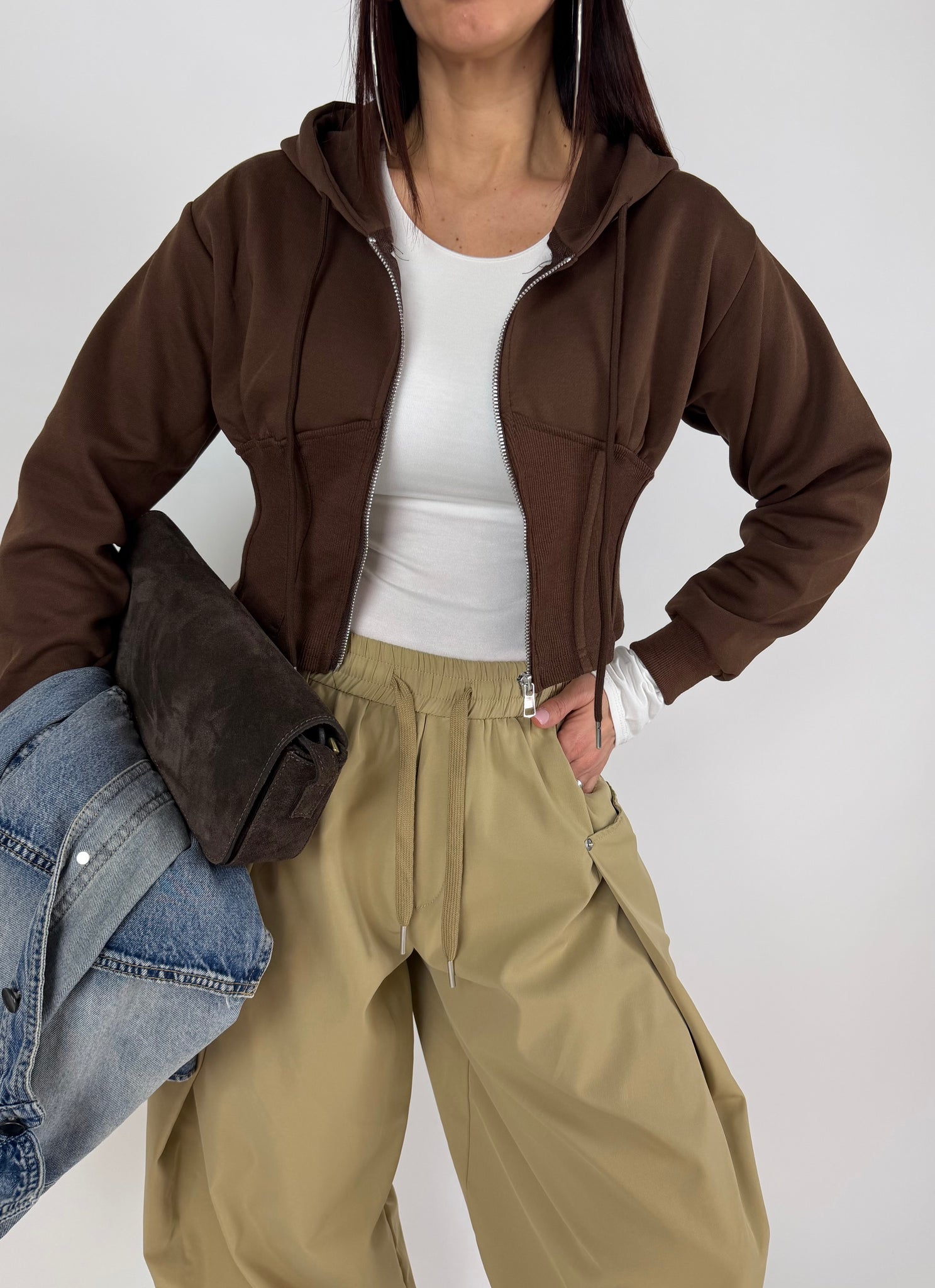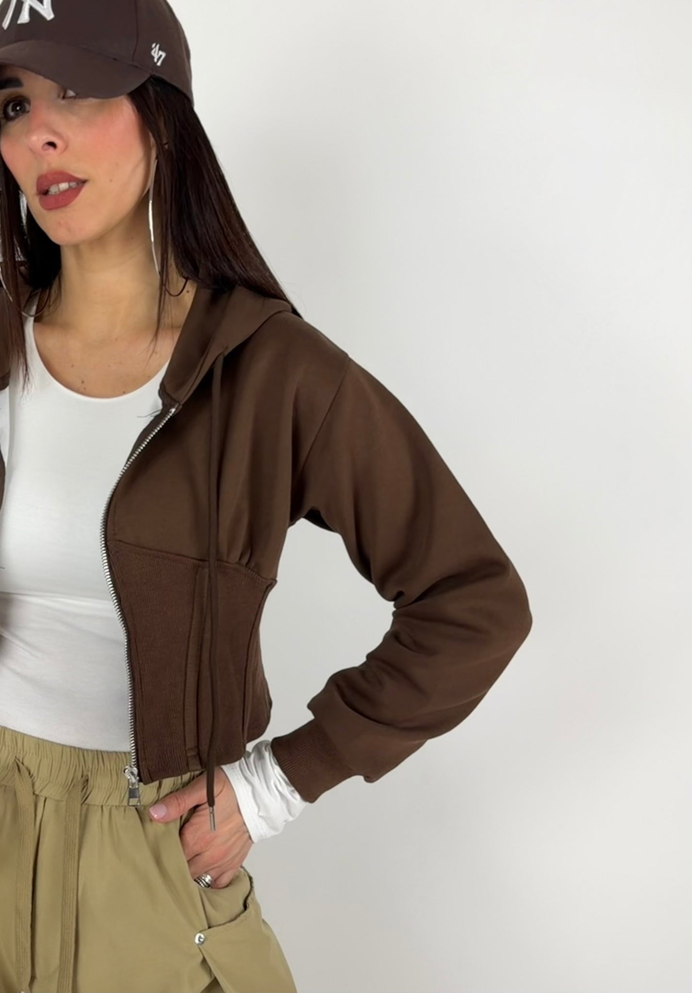 Felpa in cotone garzato a doppia texture: liscia e a coste. Taglio crop con vita sciancrata; chiusura a zip, dettaglio cappuccio con coulisse. Taglia unica veste da 38 a 44