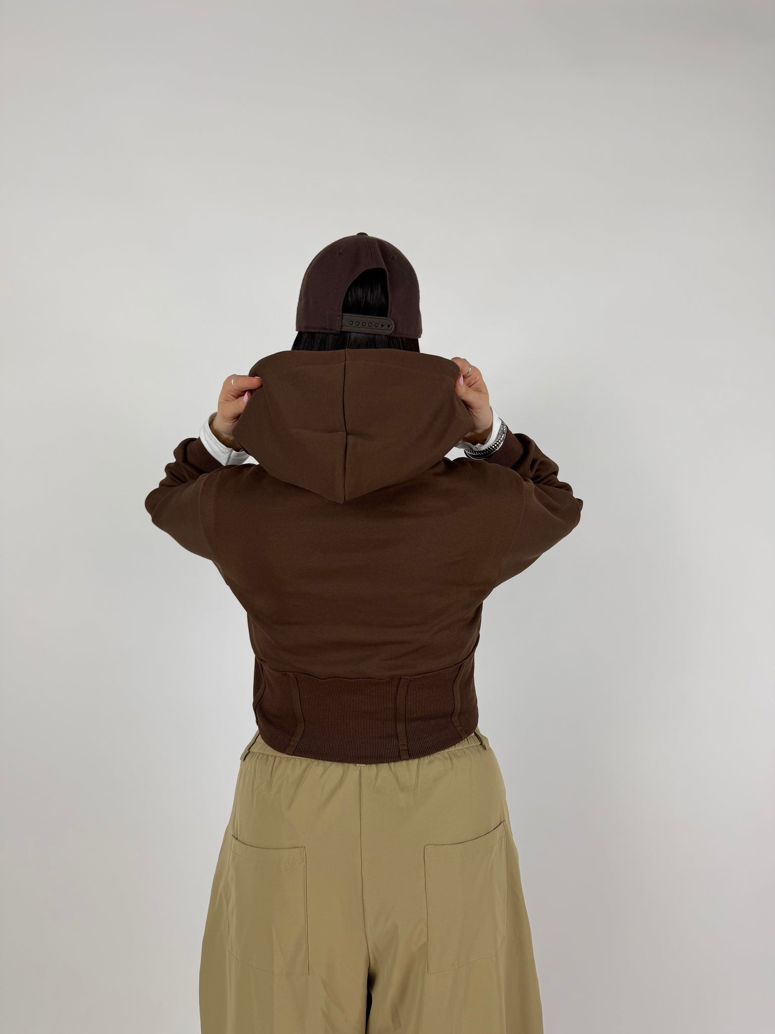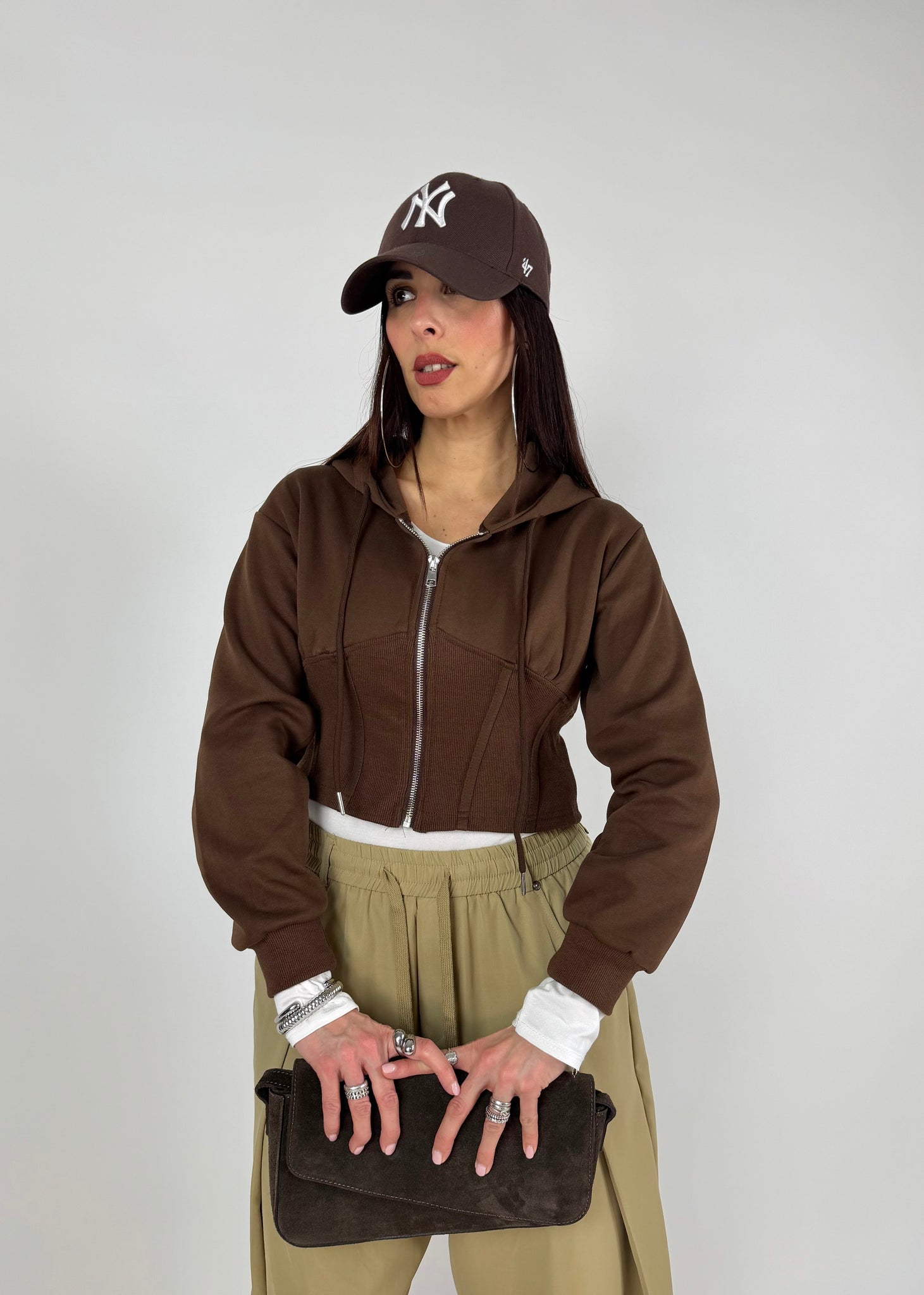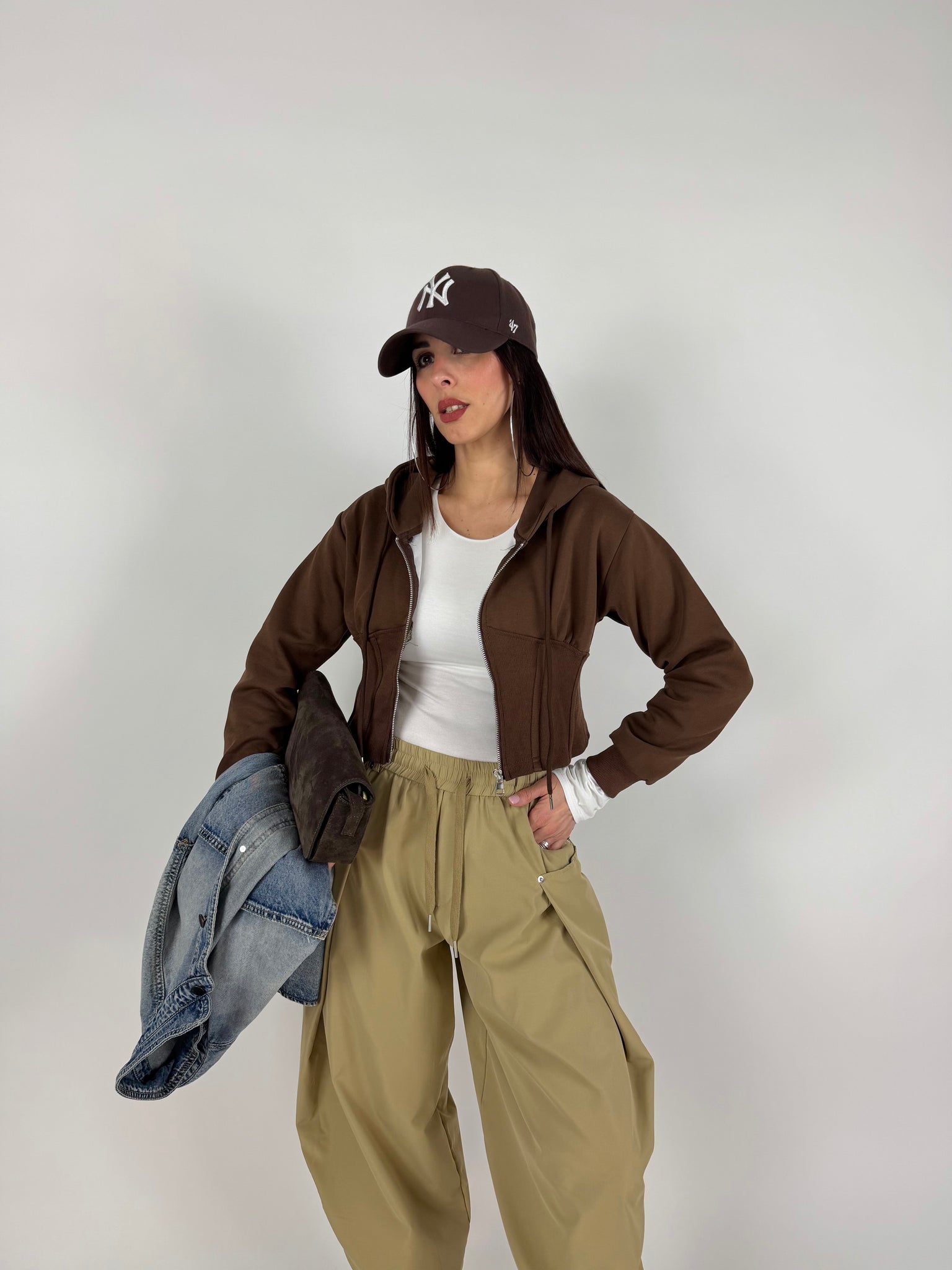 Felpa in cotone garzato a doppia texture: liscia e a coste. Taglio crop con vita sciancrata; chiusura a zip, dettaglio cappuccio con coulisse. Taglia unica veste da 38 a 44
