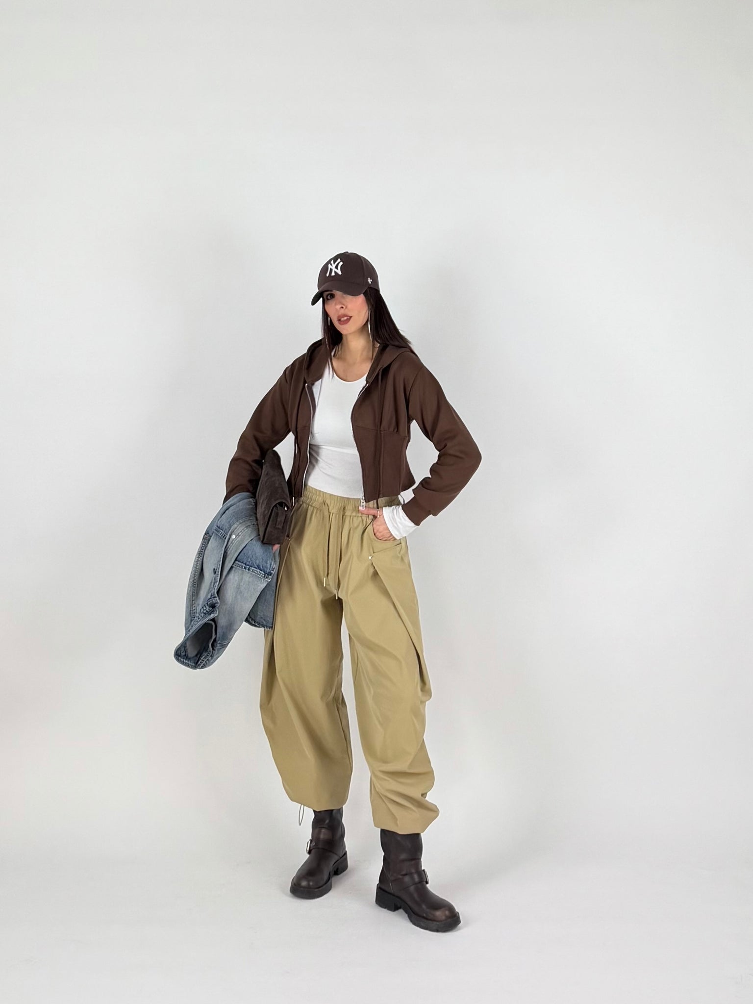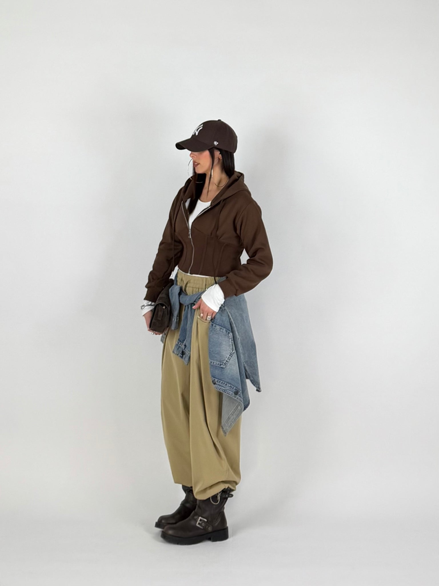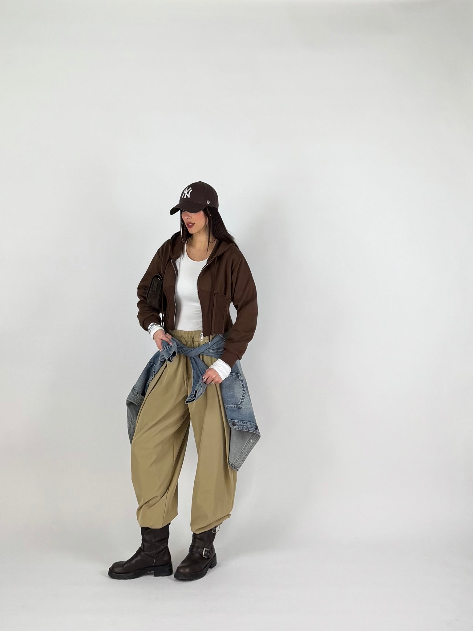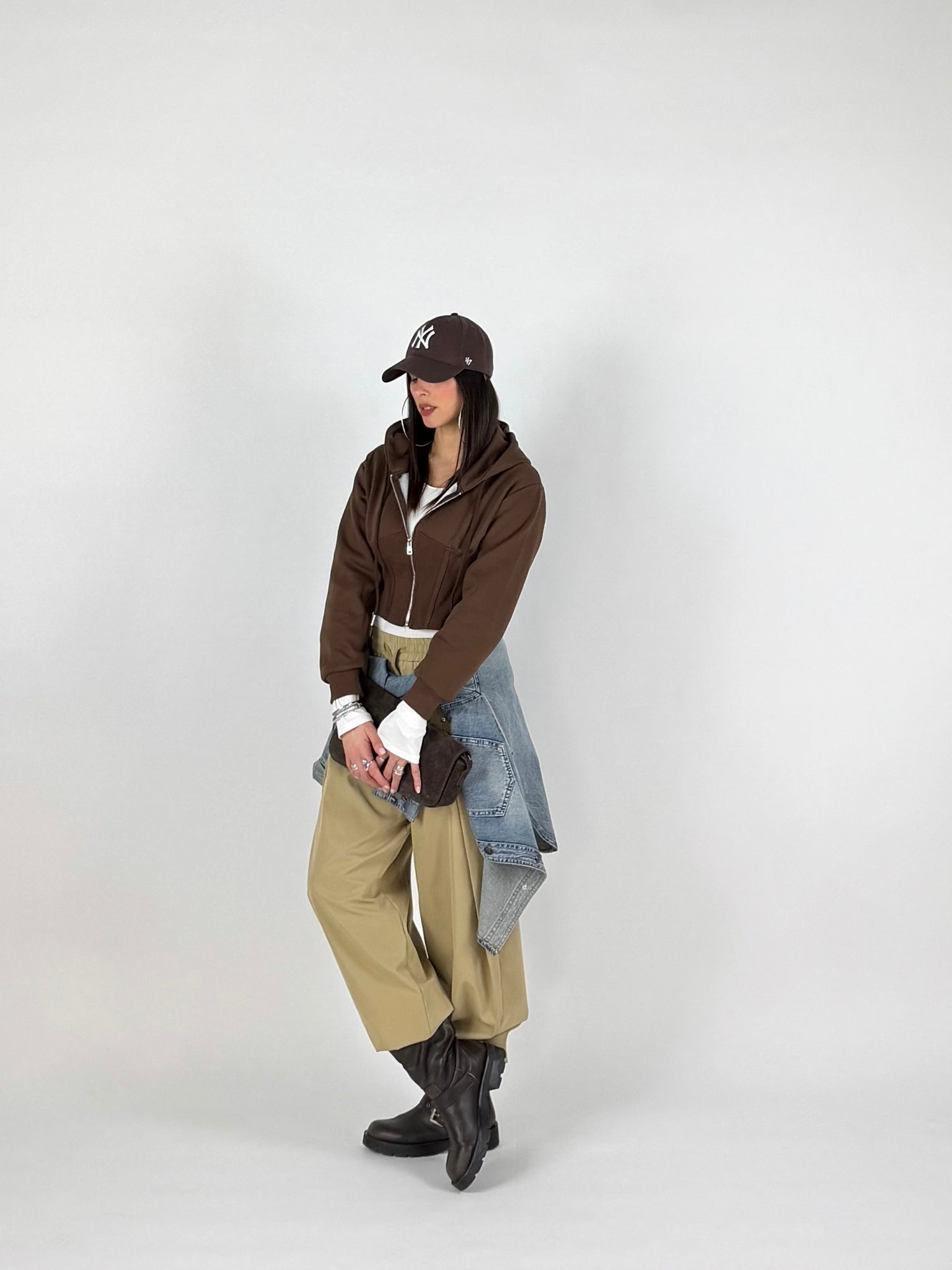 Felpa in cotone garzato a doppia texture: liscia e a coste. Taglio crop con vita sciancrata; chiusura a zip, dettaglio cappuccio con coulisse. Taglia unica veste da 38 a 44