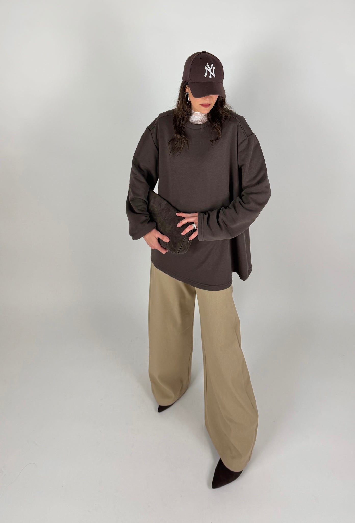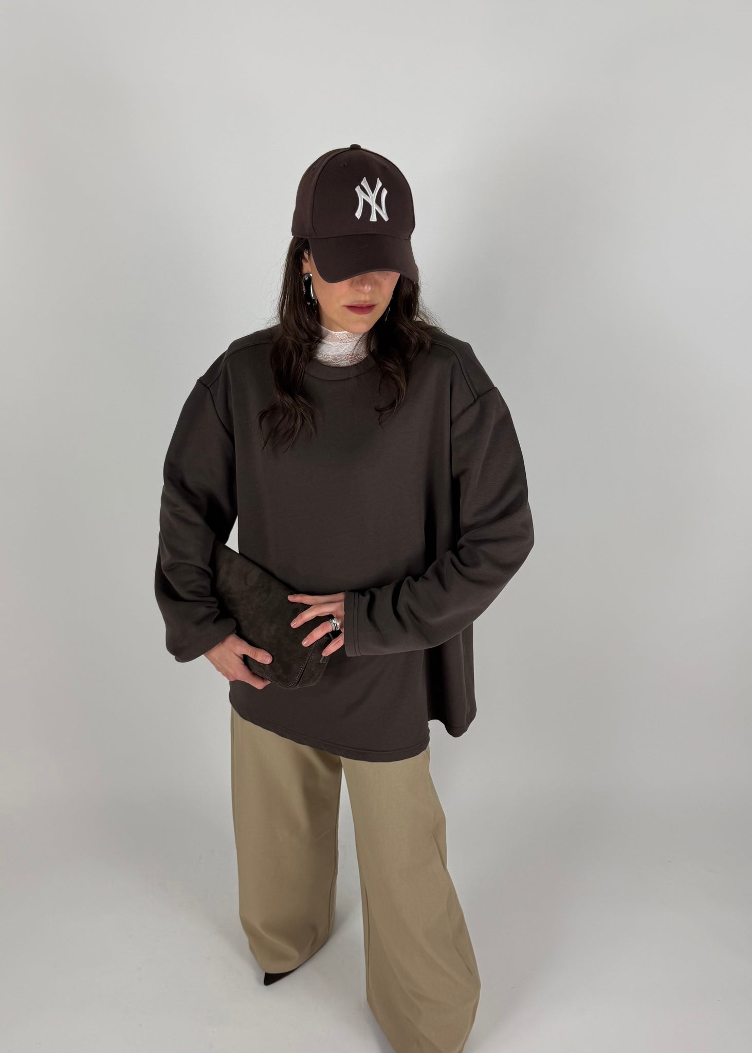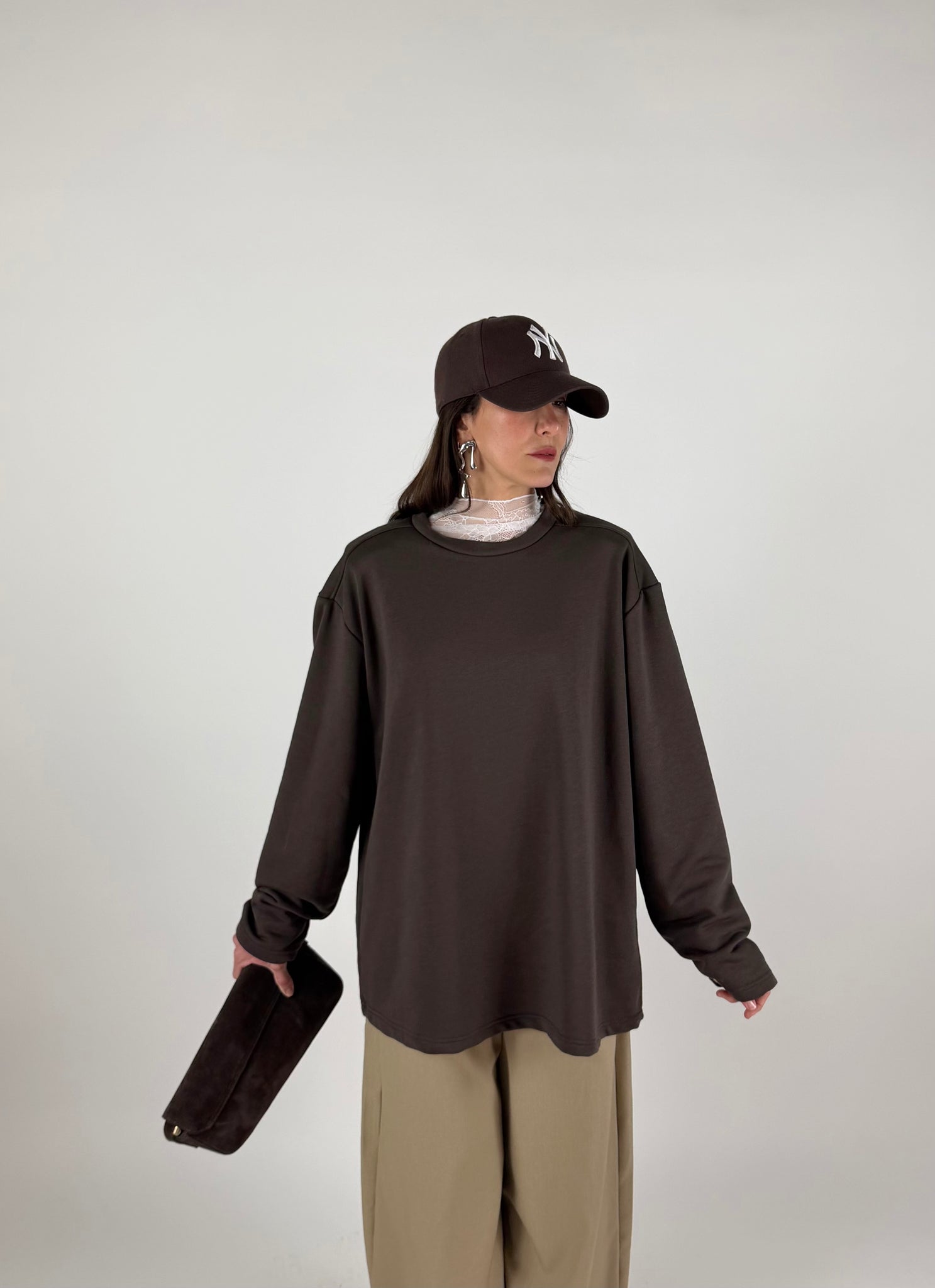 Felpa garzata girocollo, maniche lunghe, vestibilità over, spalline leggermente imbottite. Taglia unica veste dalla 38 a 48