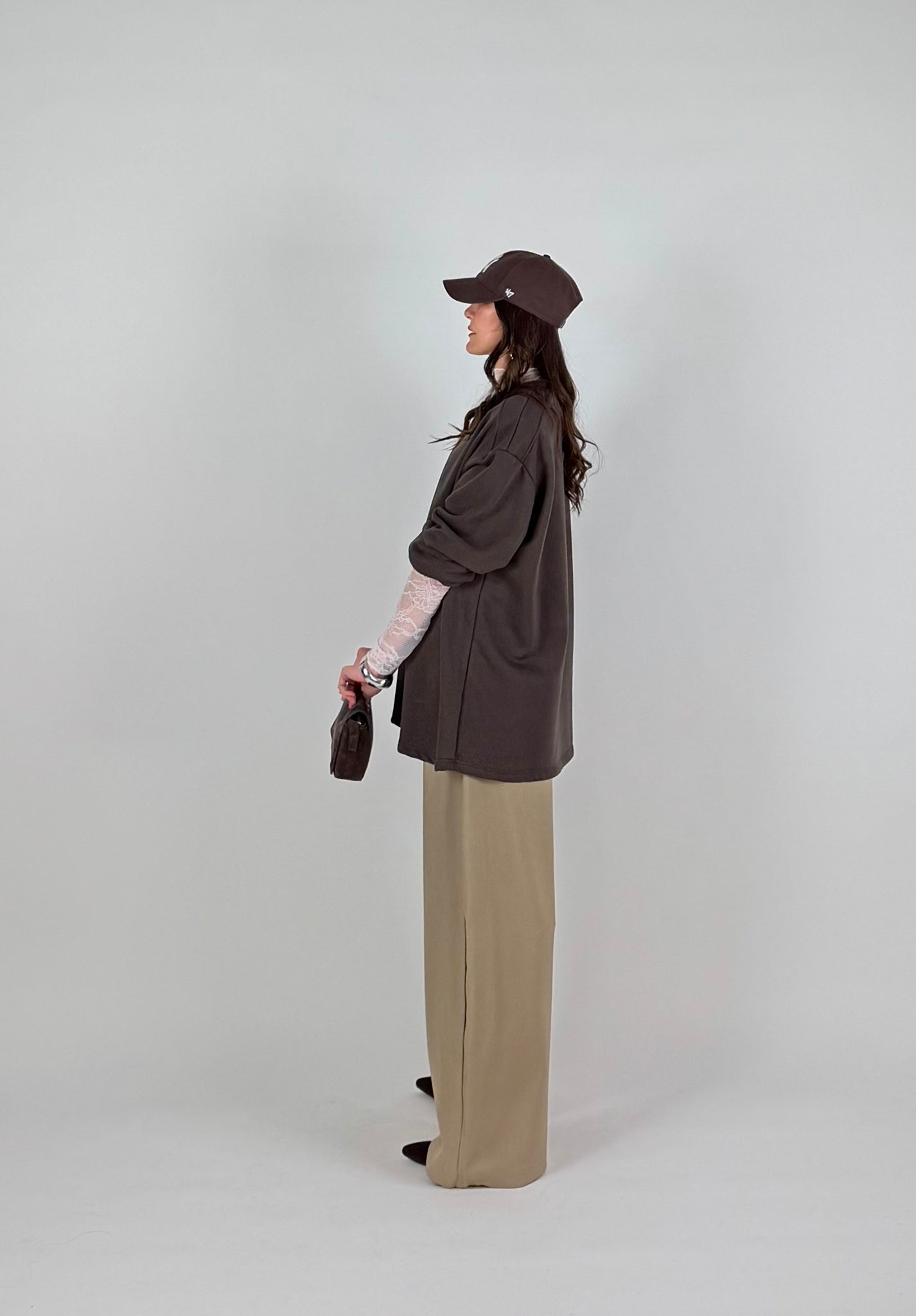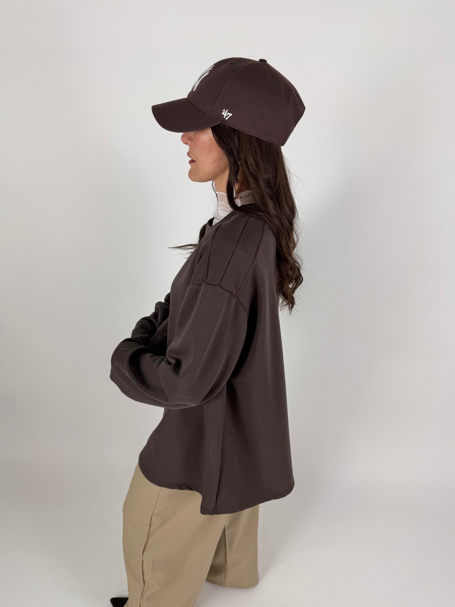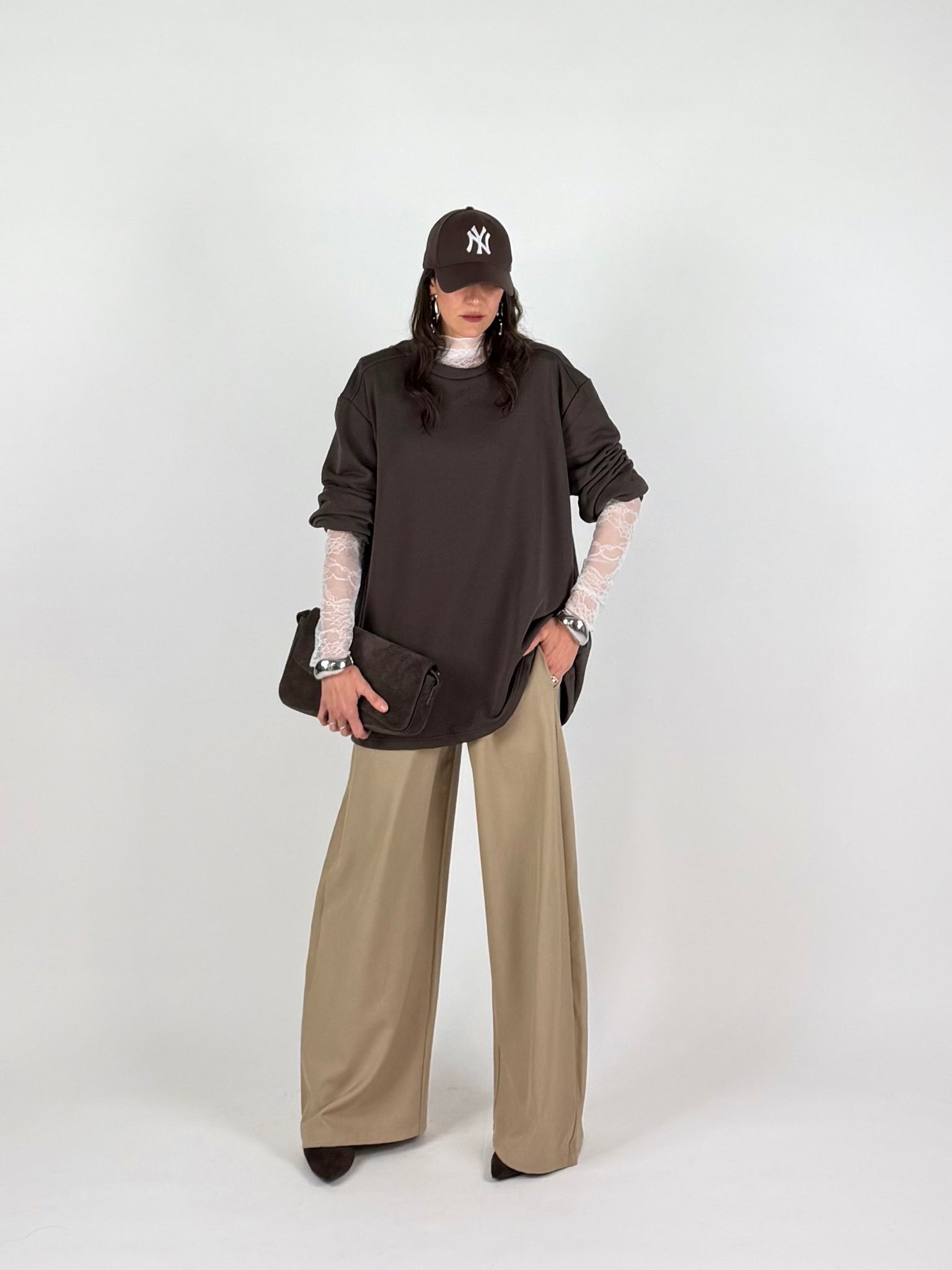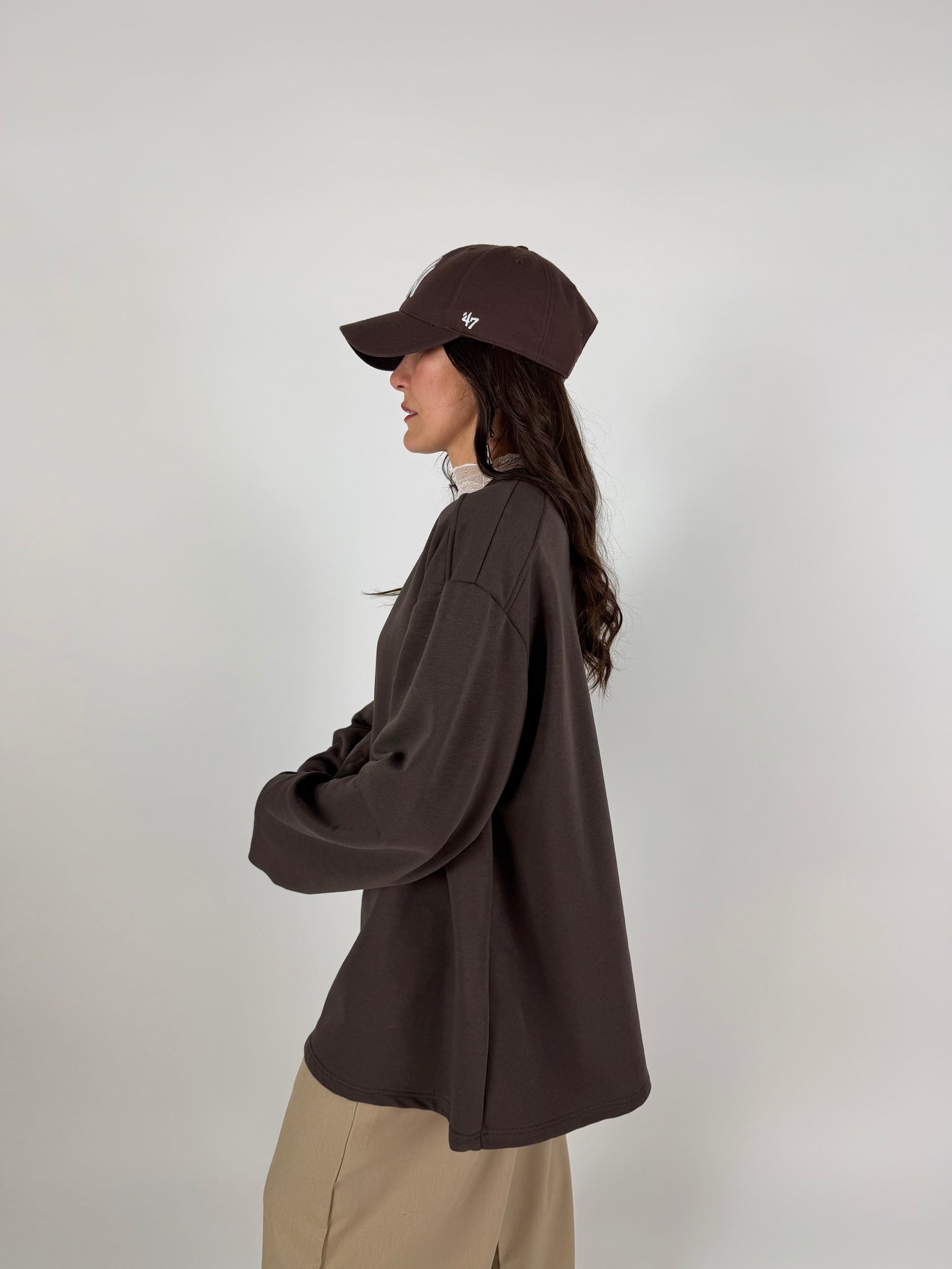 Felpa garzata girocollo, maniche lunghe, vestibilità over, spalline leggermente imbottite. Taglia unica veste dalla 38 a 48