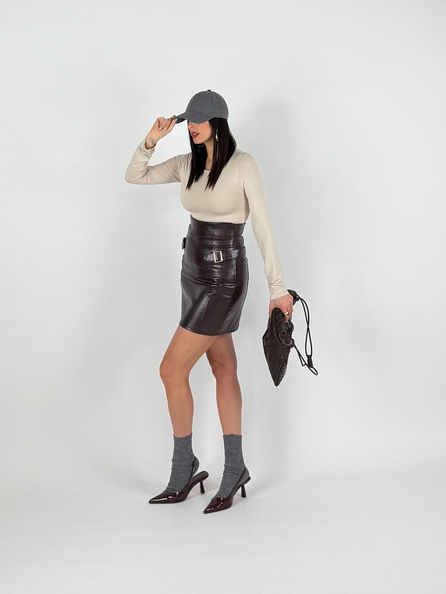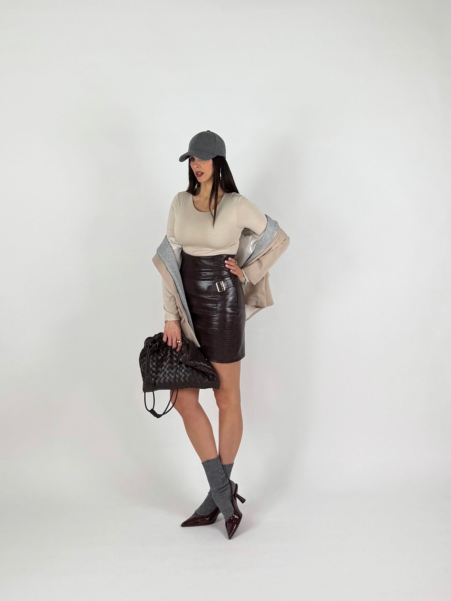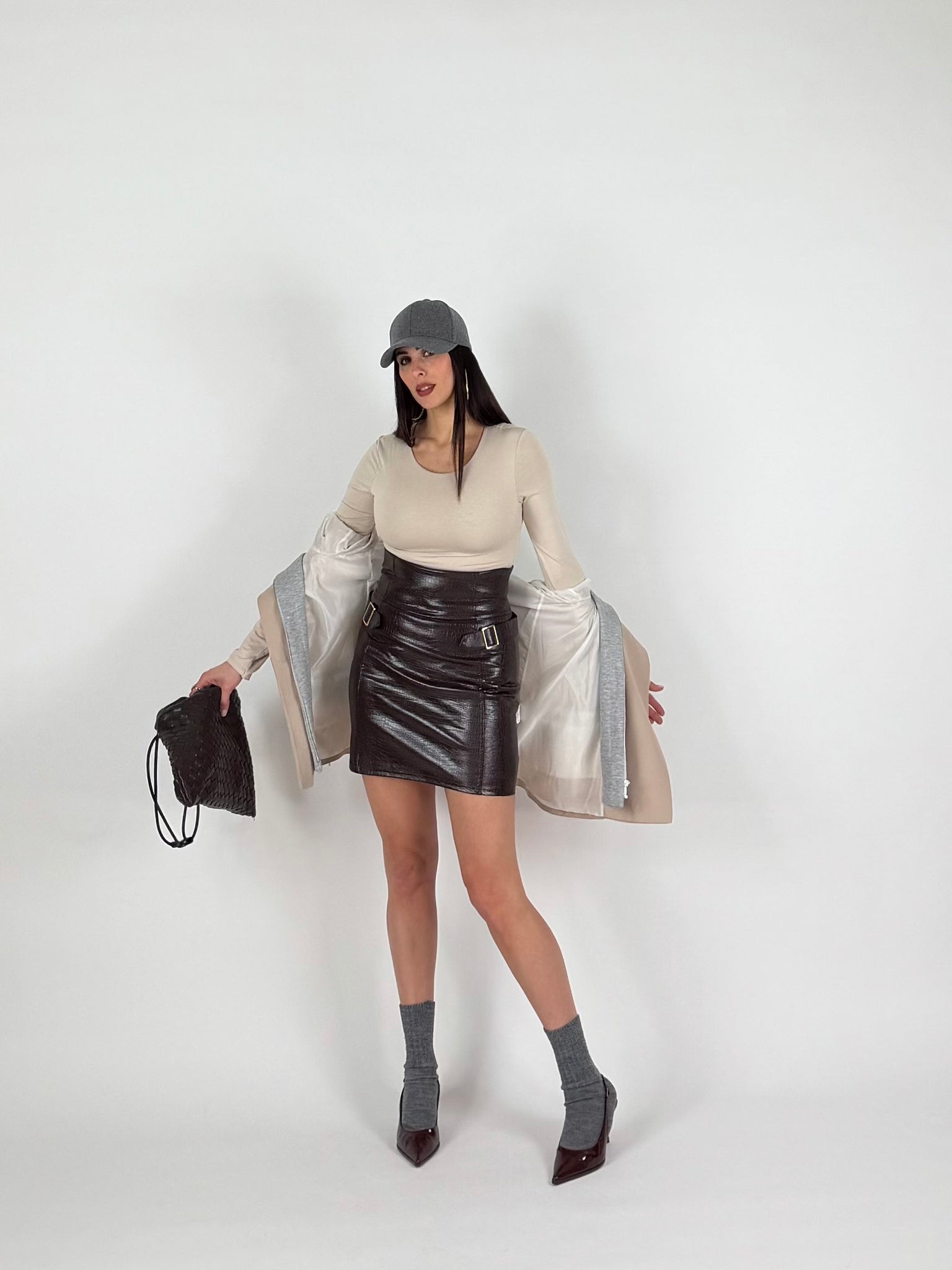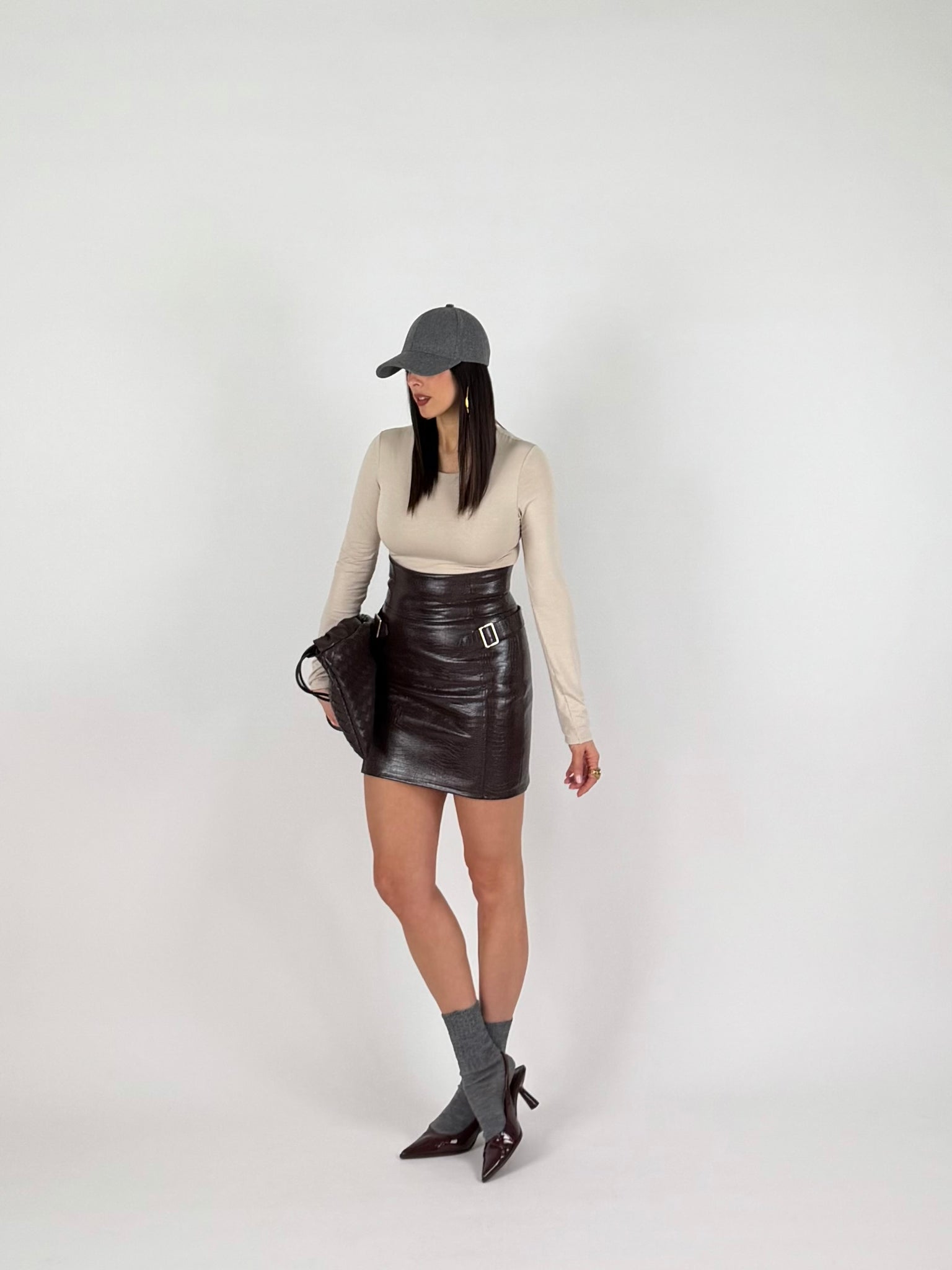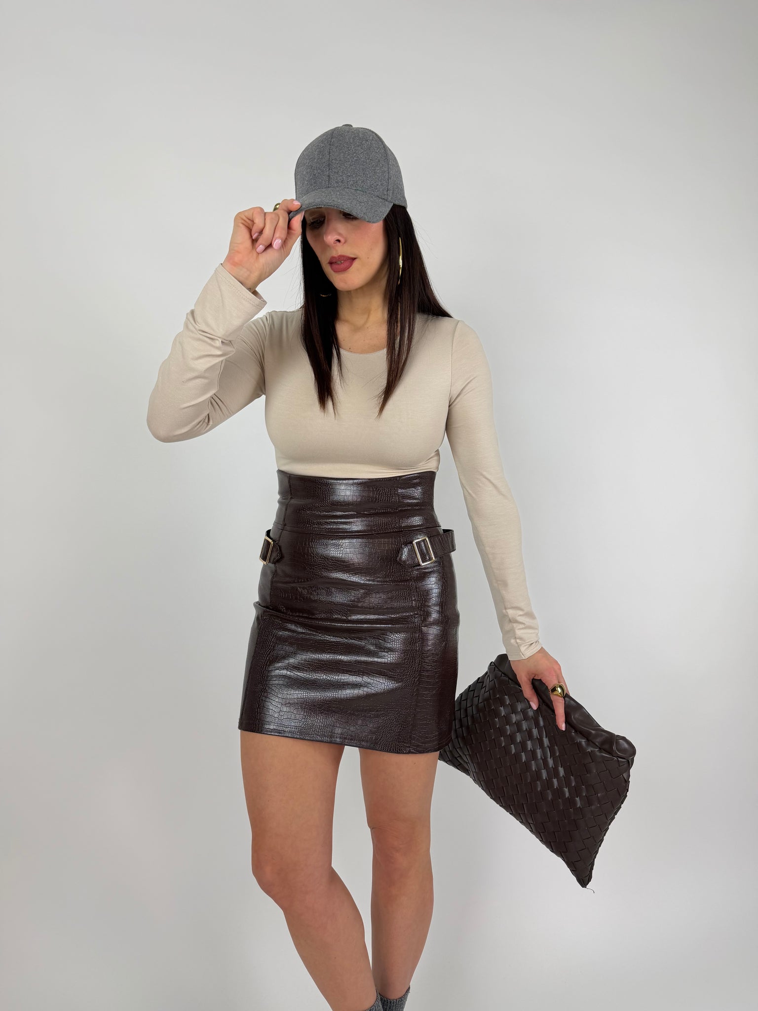 Gonna a vita alta, ecopelle elasticizzata, stampa cocco, tinta moro. Chiusura a zip sul retro. Dettaglio fibbie laterali. Taglia unica veste da 38 a 42 piena