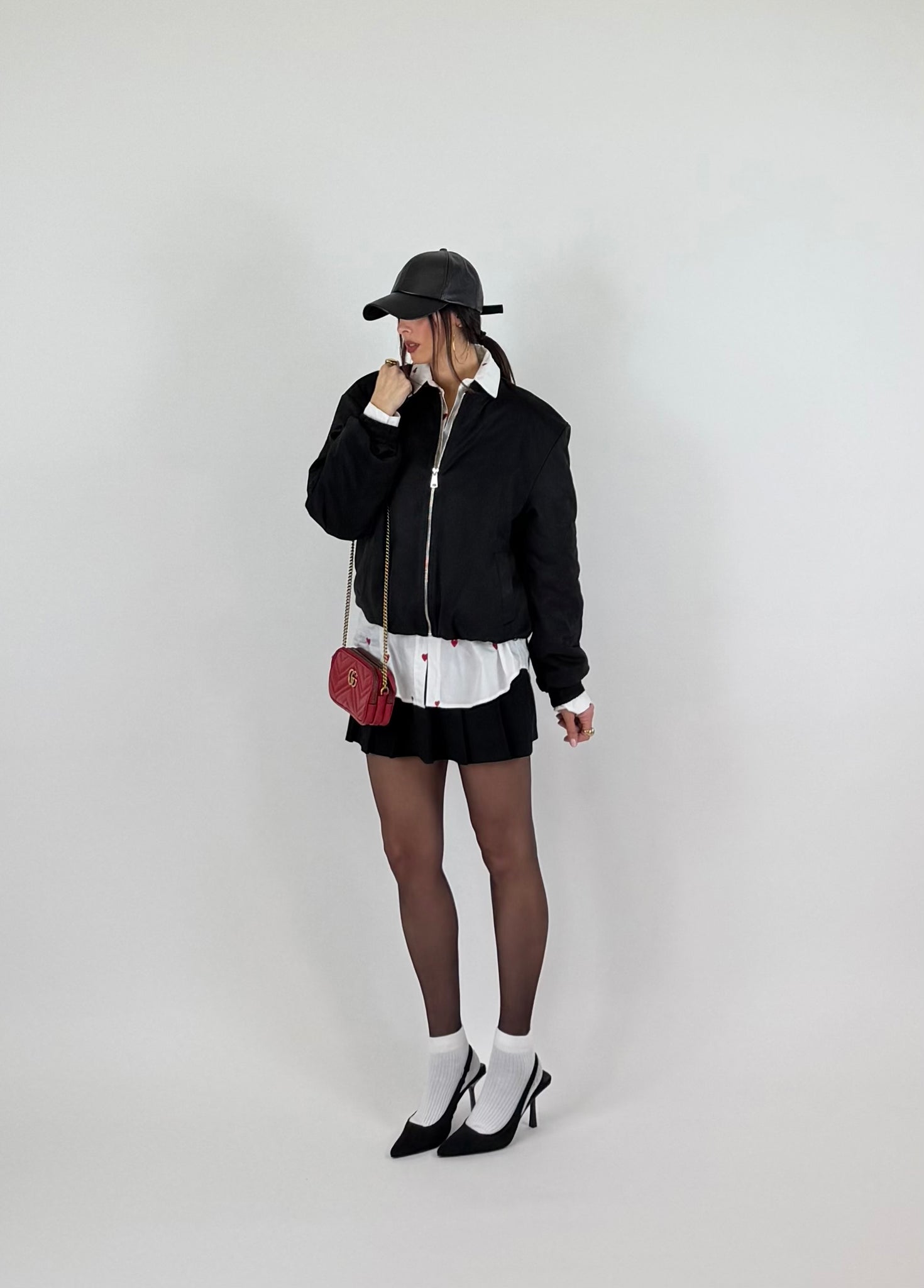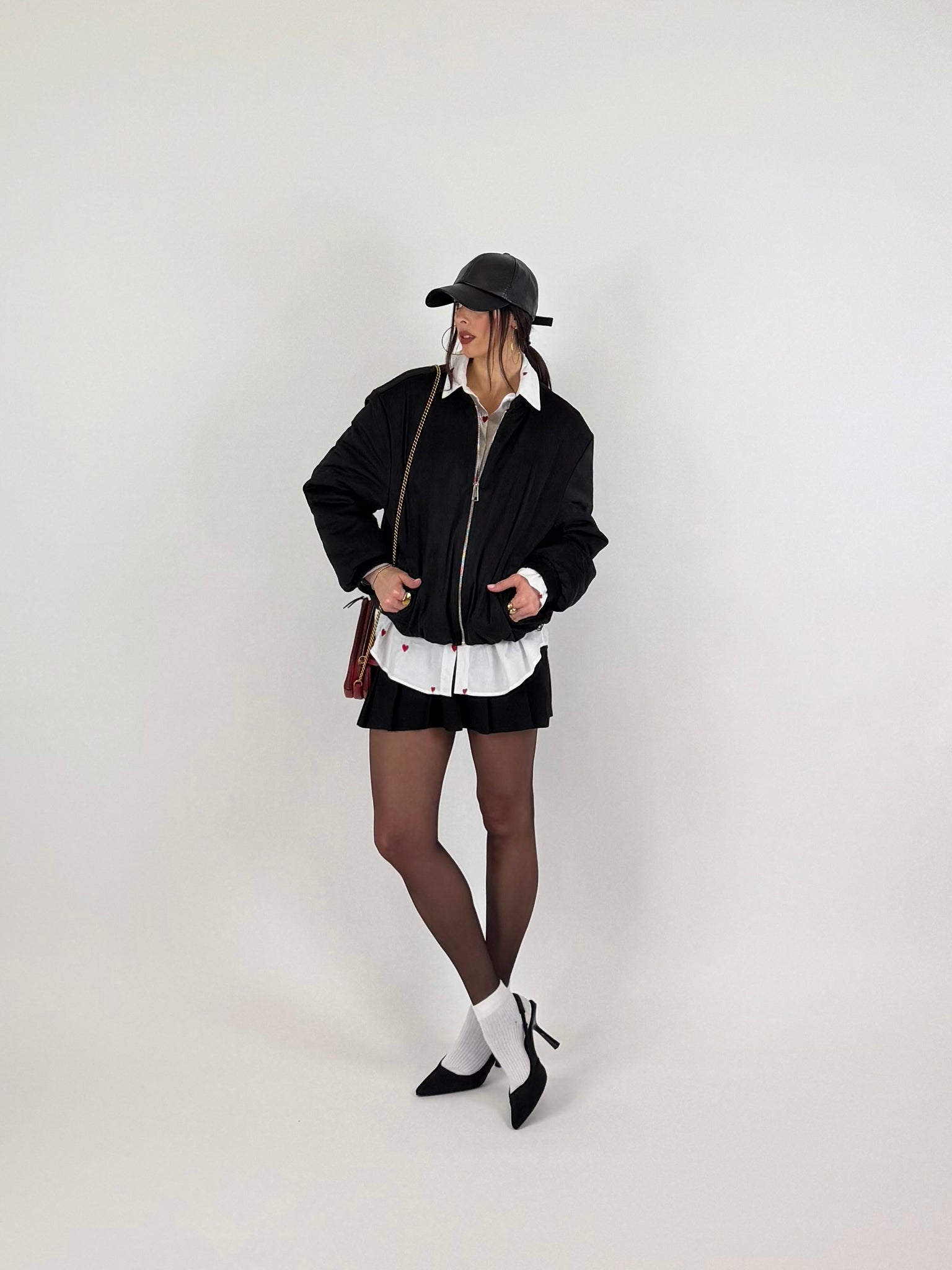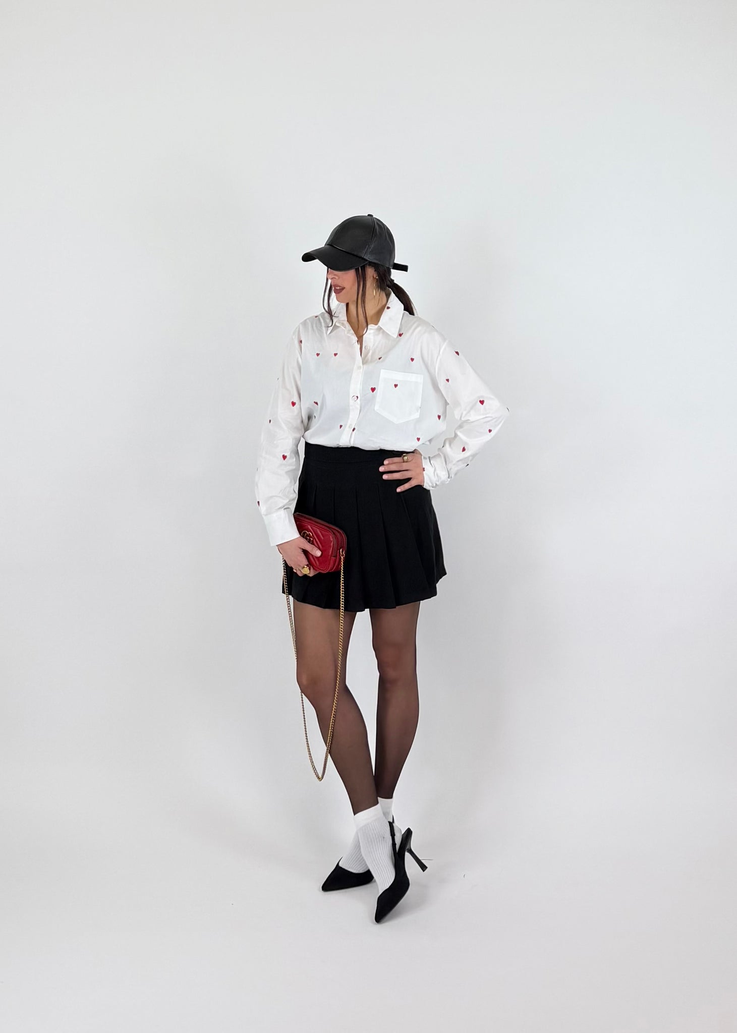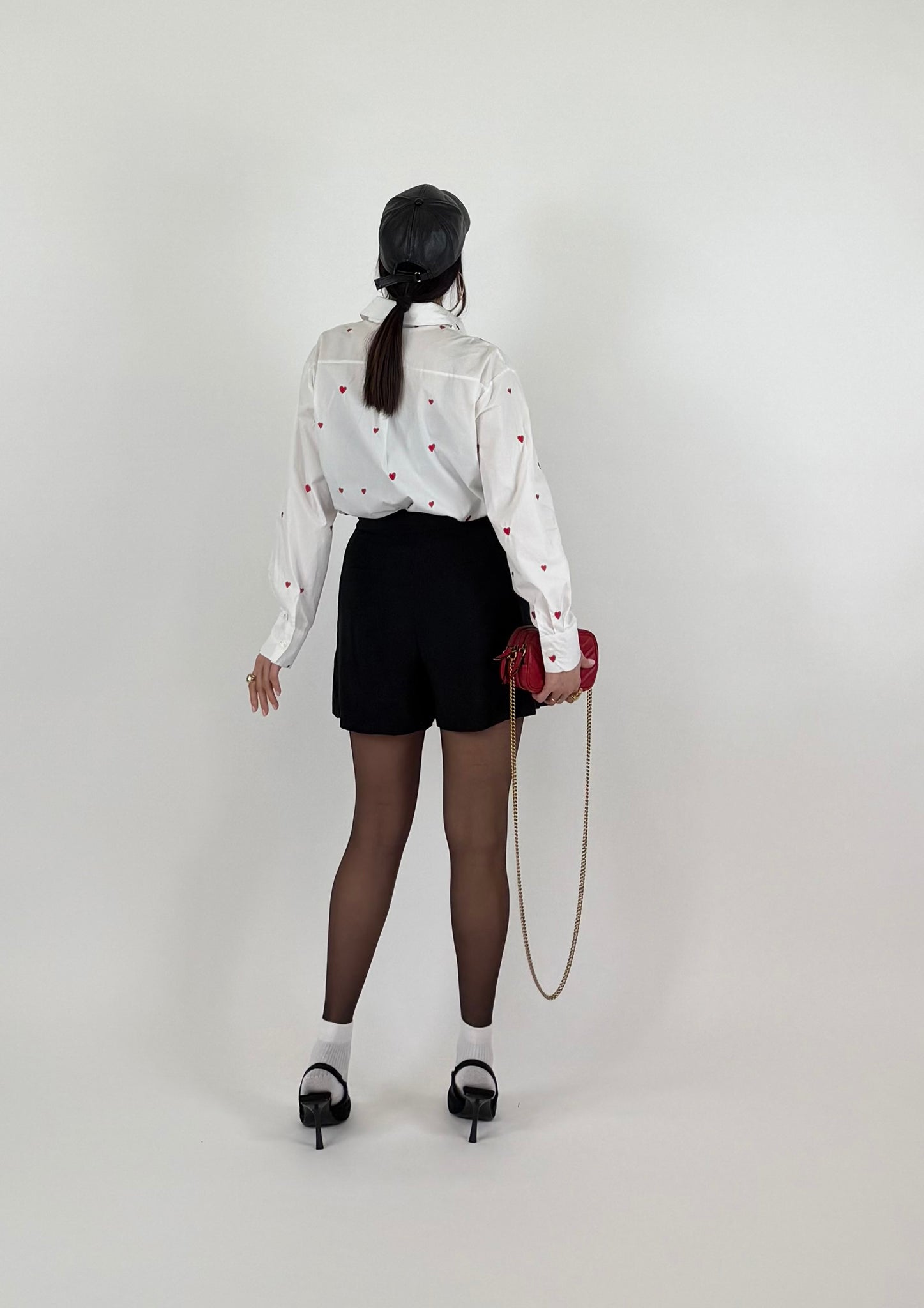 Gonna pantaloncino in tessuto fluido, chiusura laterale con zip, parte davanti plissettata con dettaglio bottone a decoro sul punto vita. SM: 38-40( lunghezza 40cm, vita 80cm) ML : 42-44(lunghezza 41cm, vita 82cm)