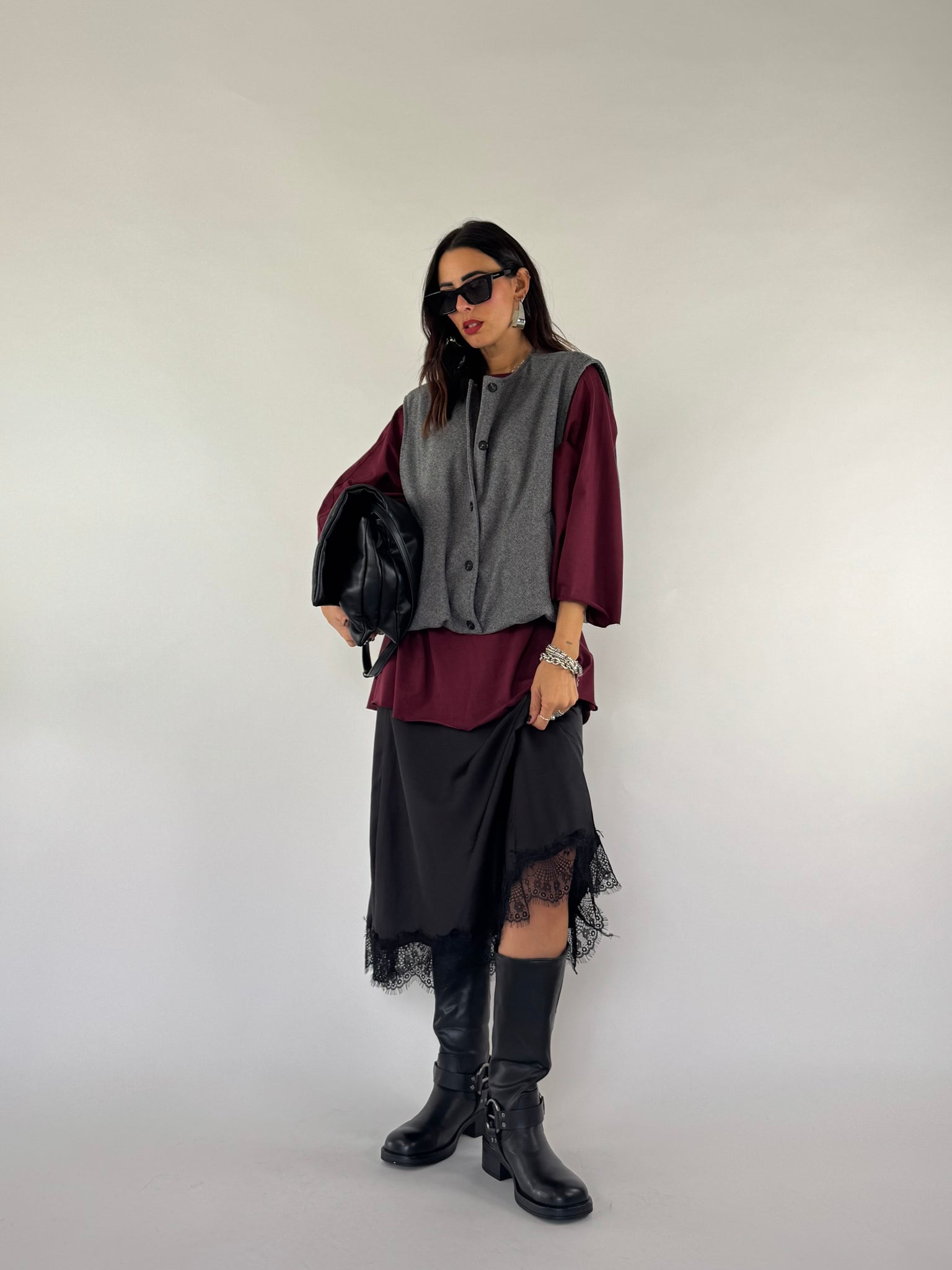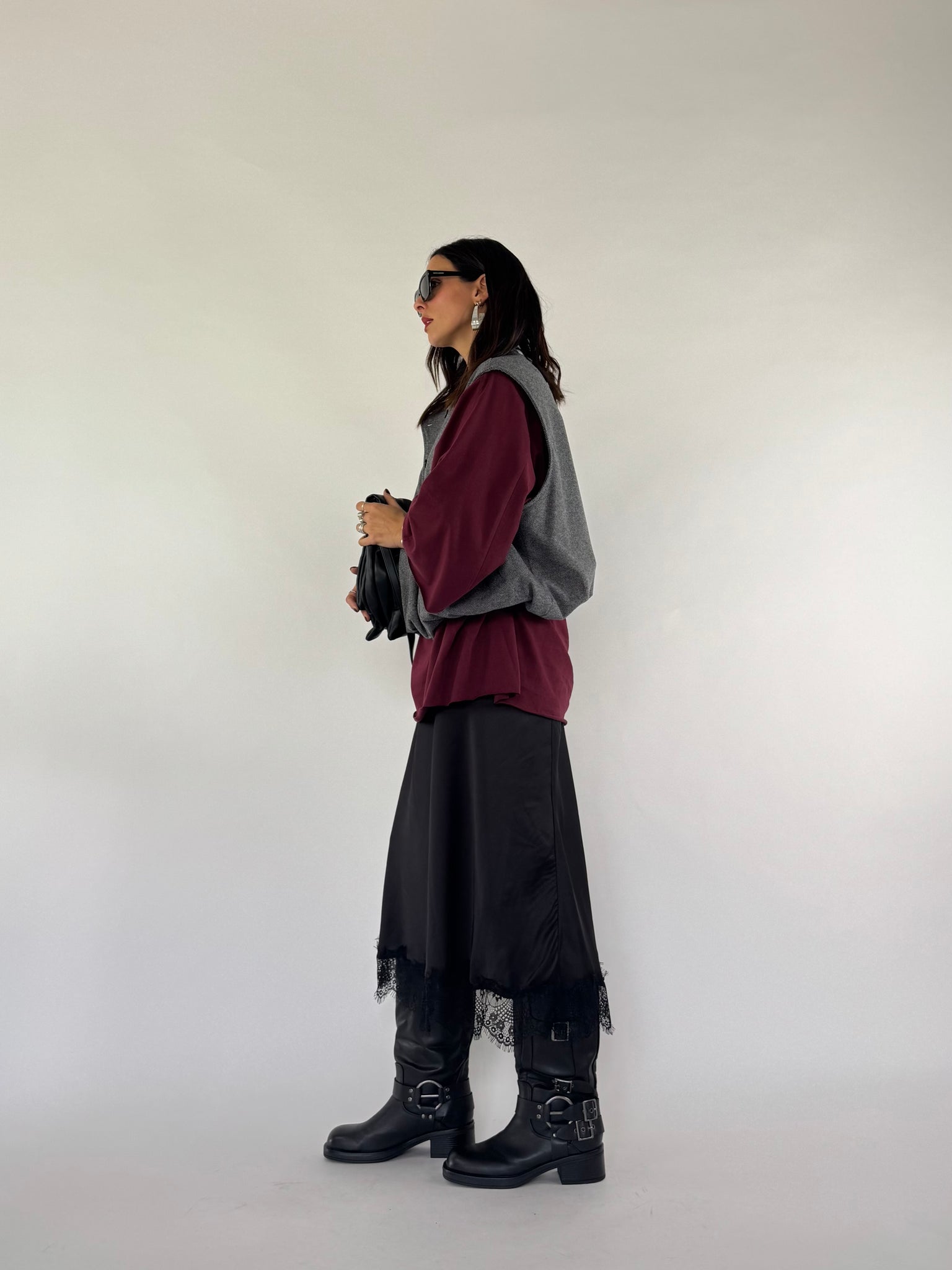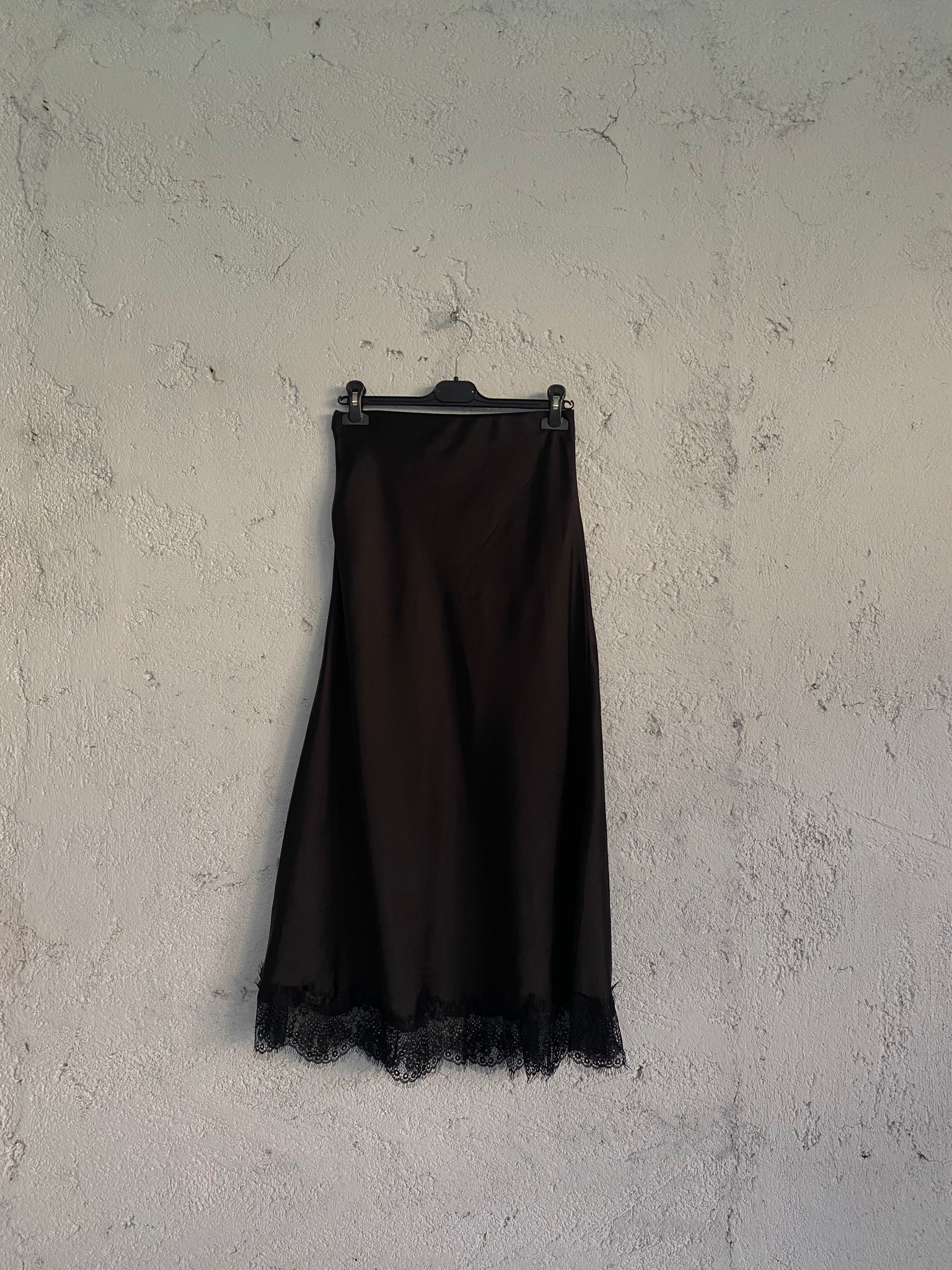 Gonna midi in satin con elastico in vita, dettaglio orlo in pizzo. Taglia unica veste da 38 a 44