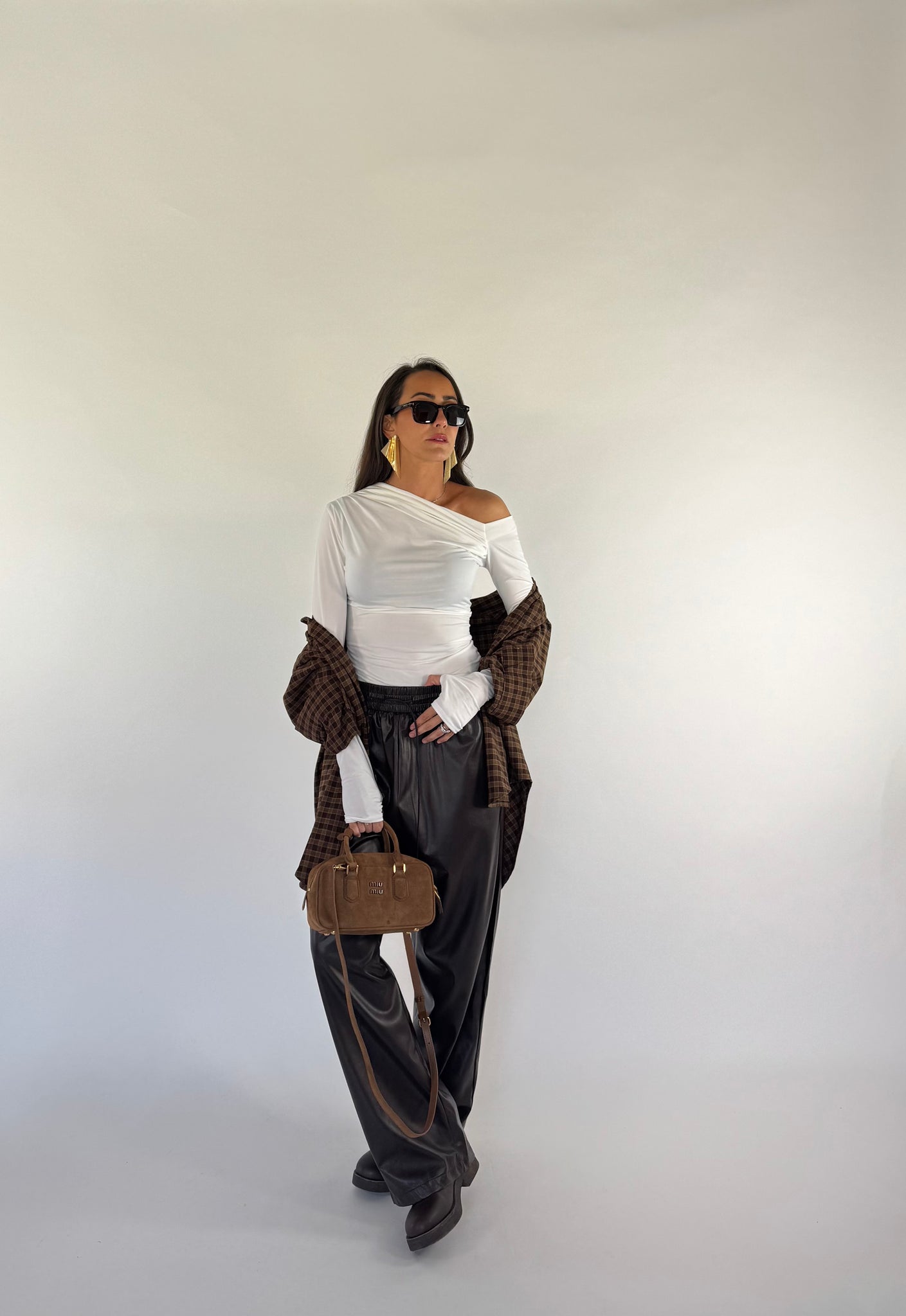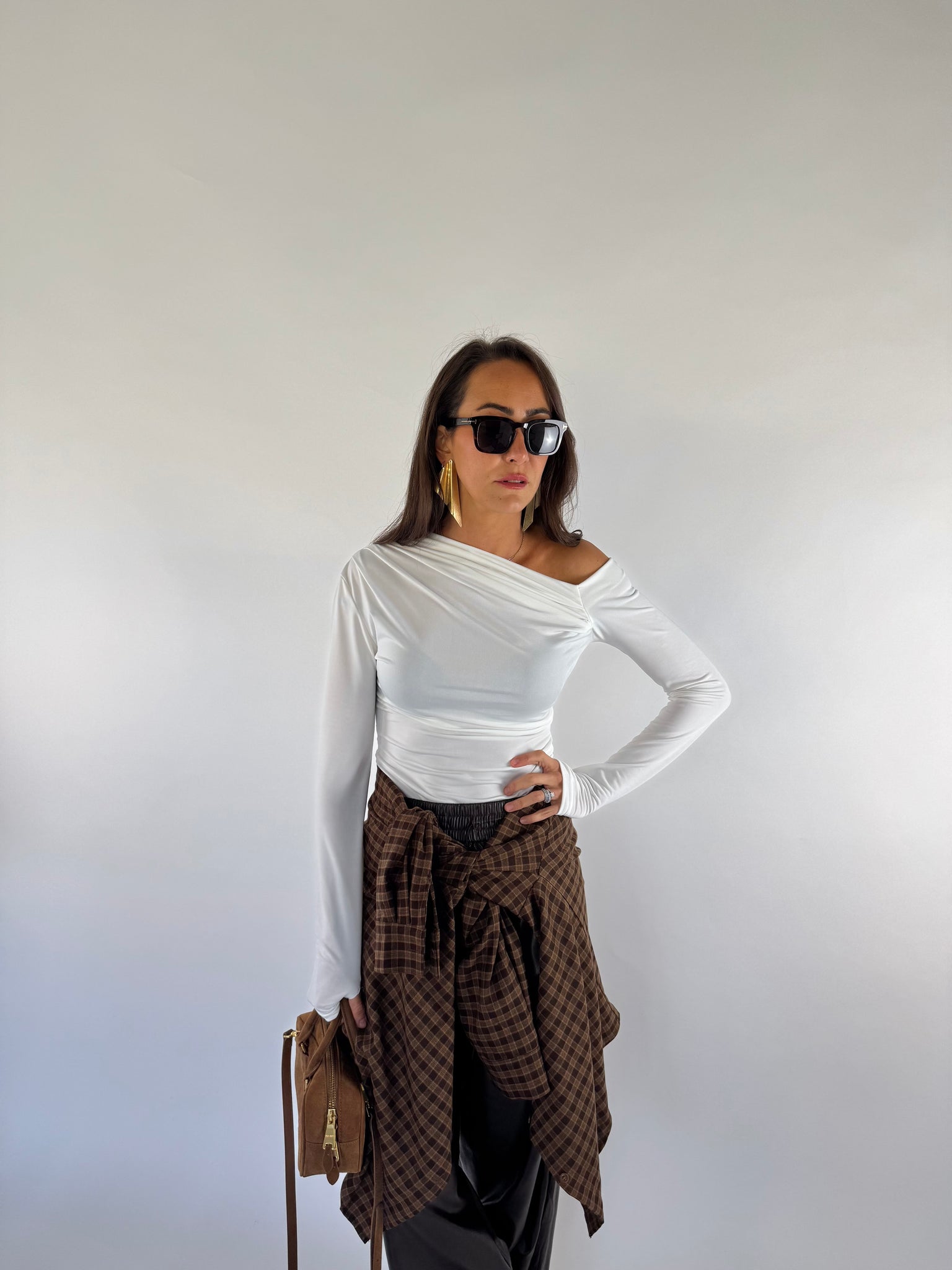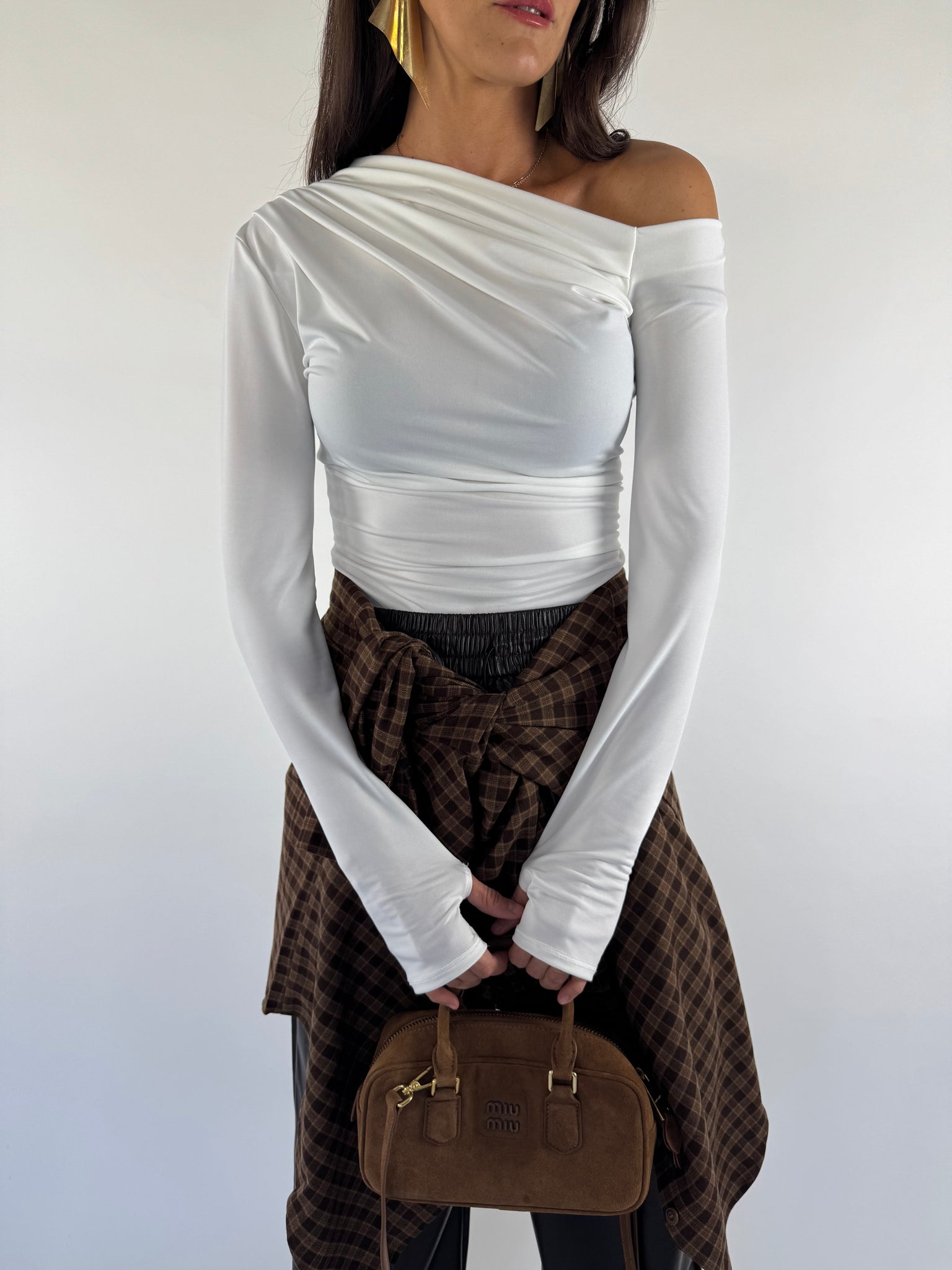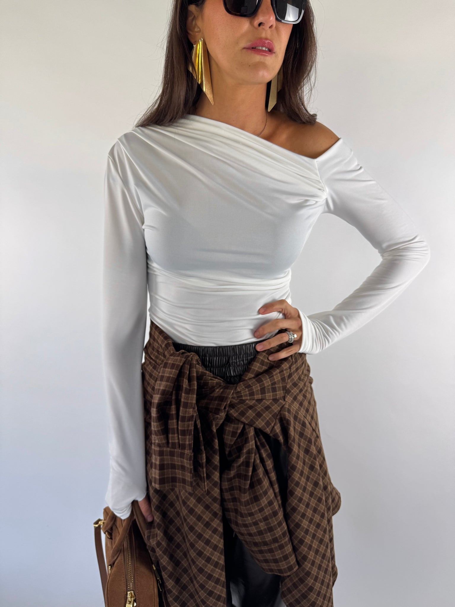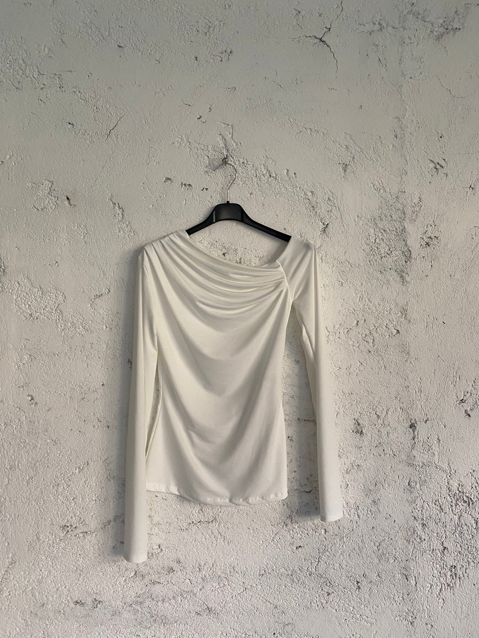 Maglia in viscosa, scollo asimmetrico che lascia scoperta una spalla, tessuto elasticizzato. Possibilità di indossare la manica a guanto. Taglia unica veste da 38 a 44 piena