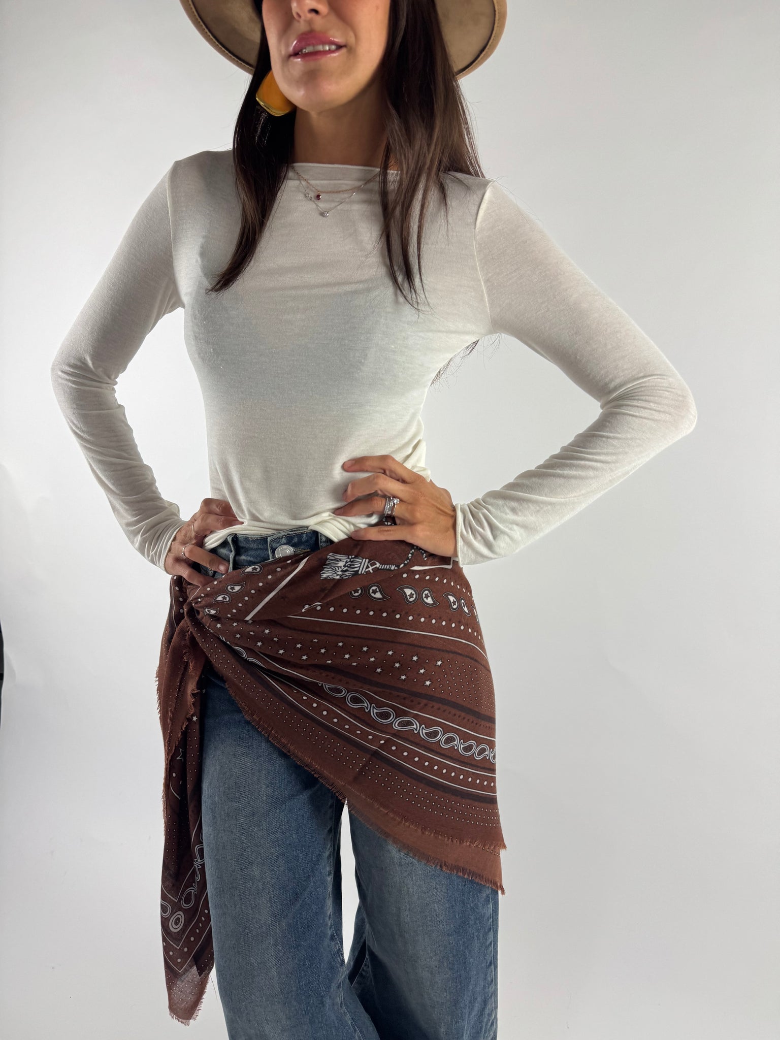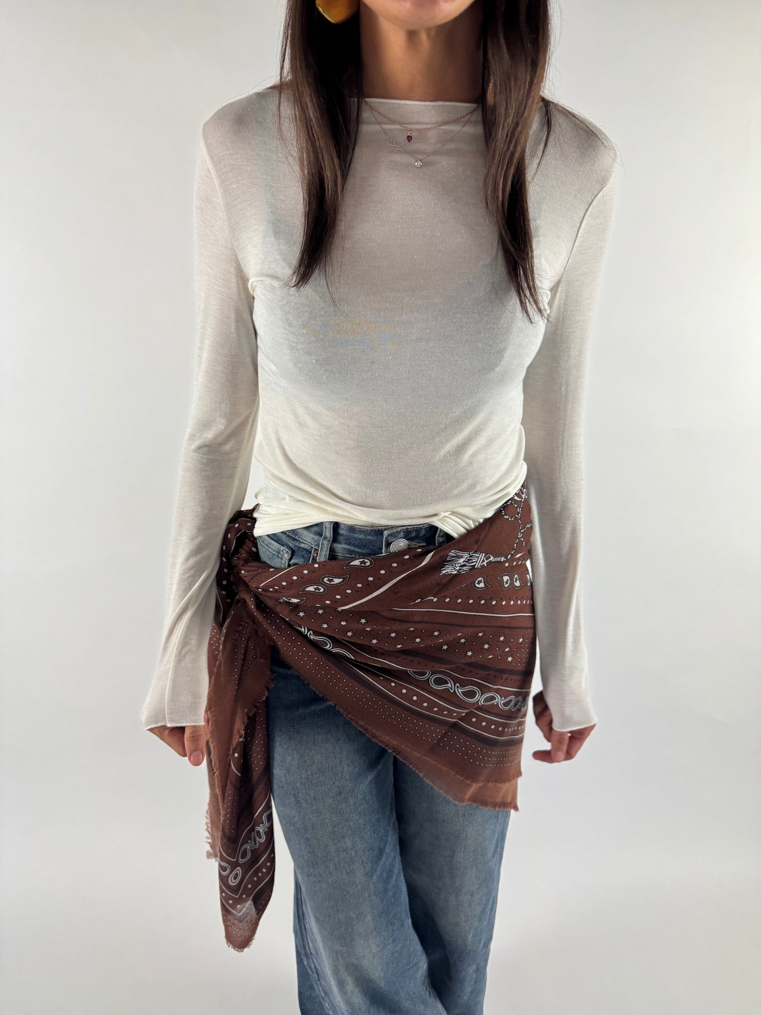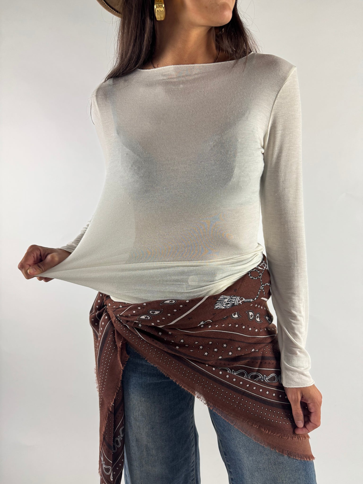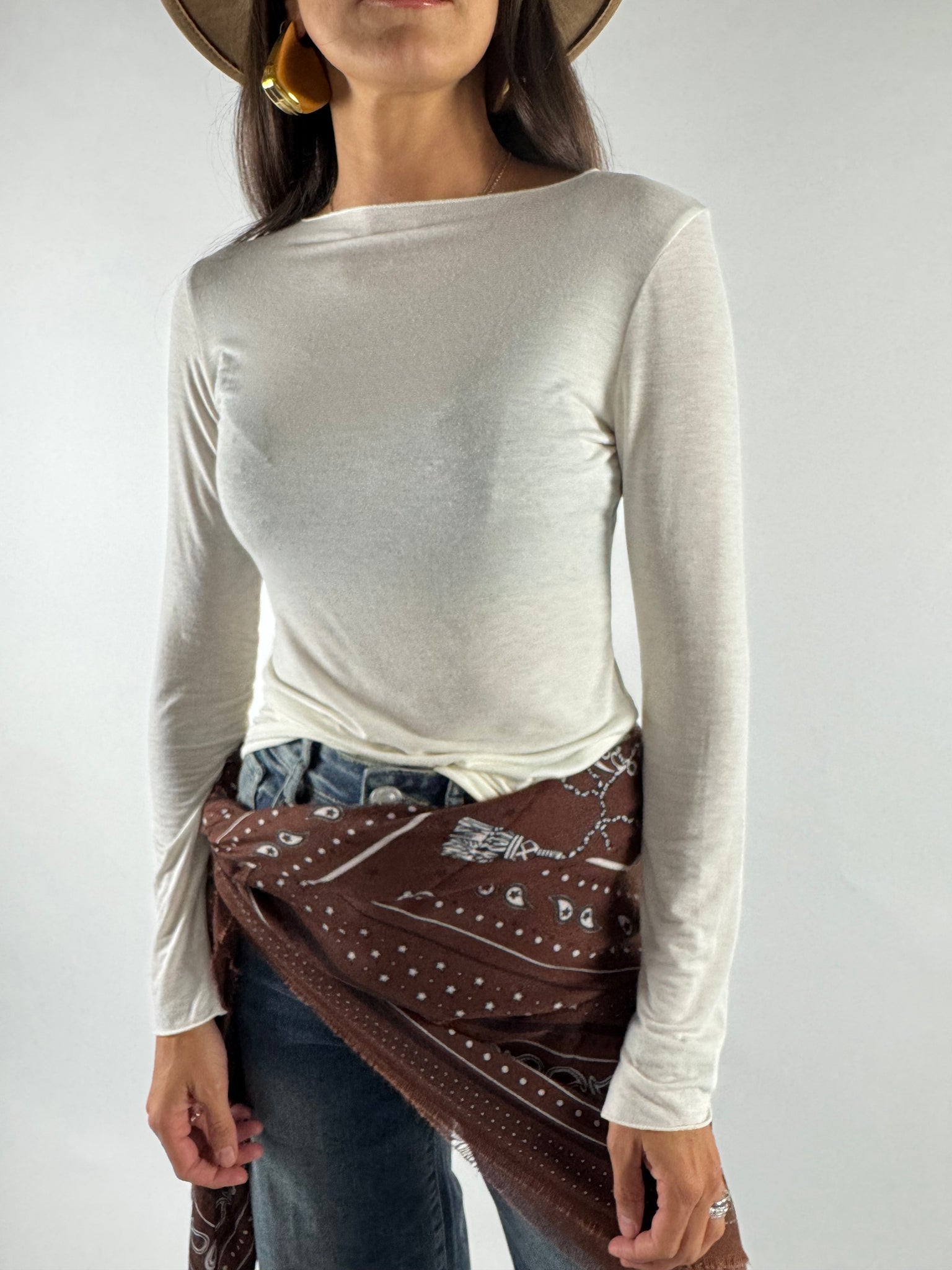 T-shirt manica lunga misto viascosa e cachemire, tessuto leggermente trasparente, molto morbida ed elasticizzata.