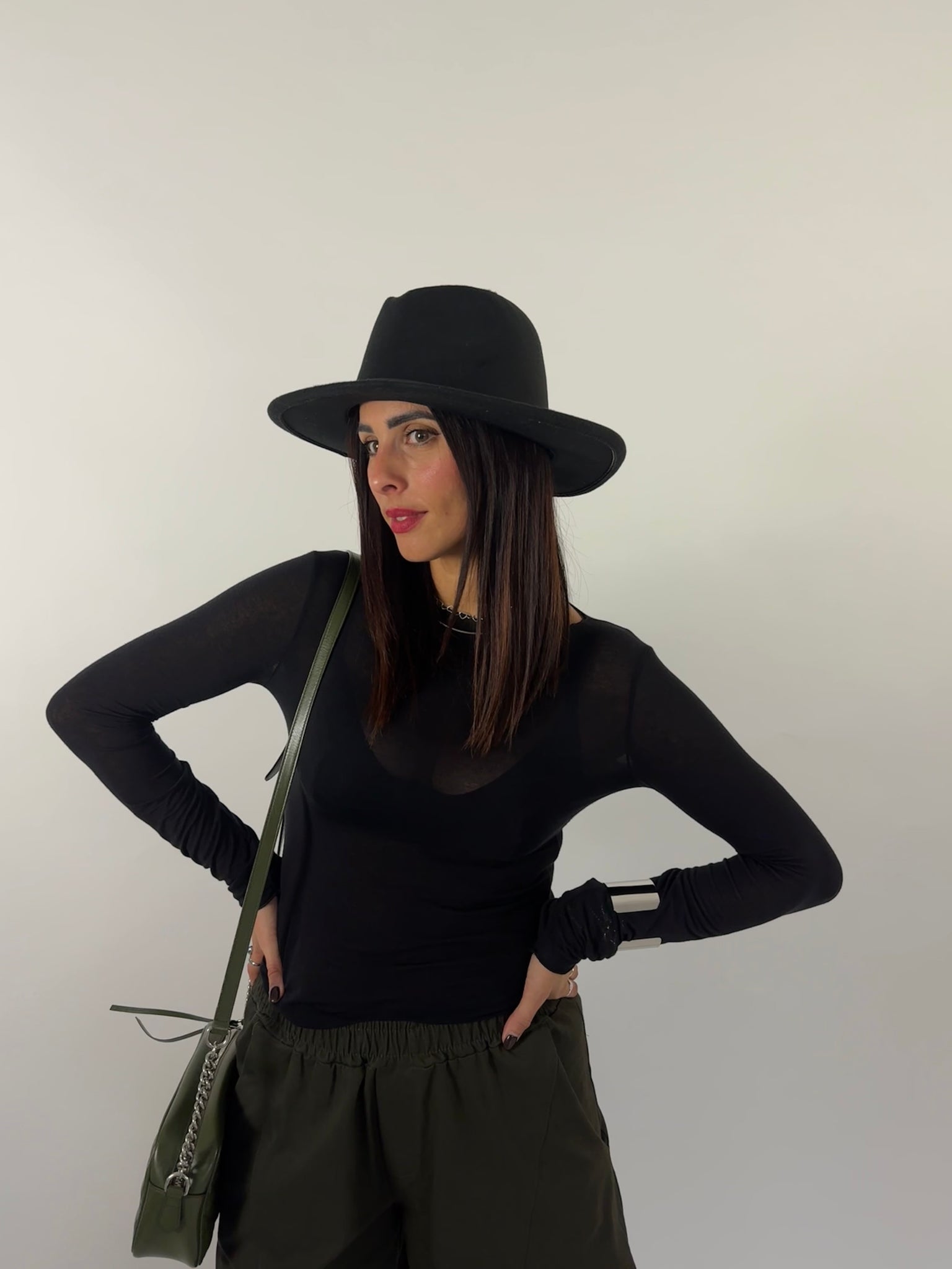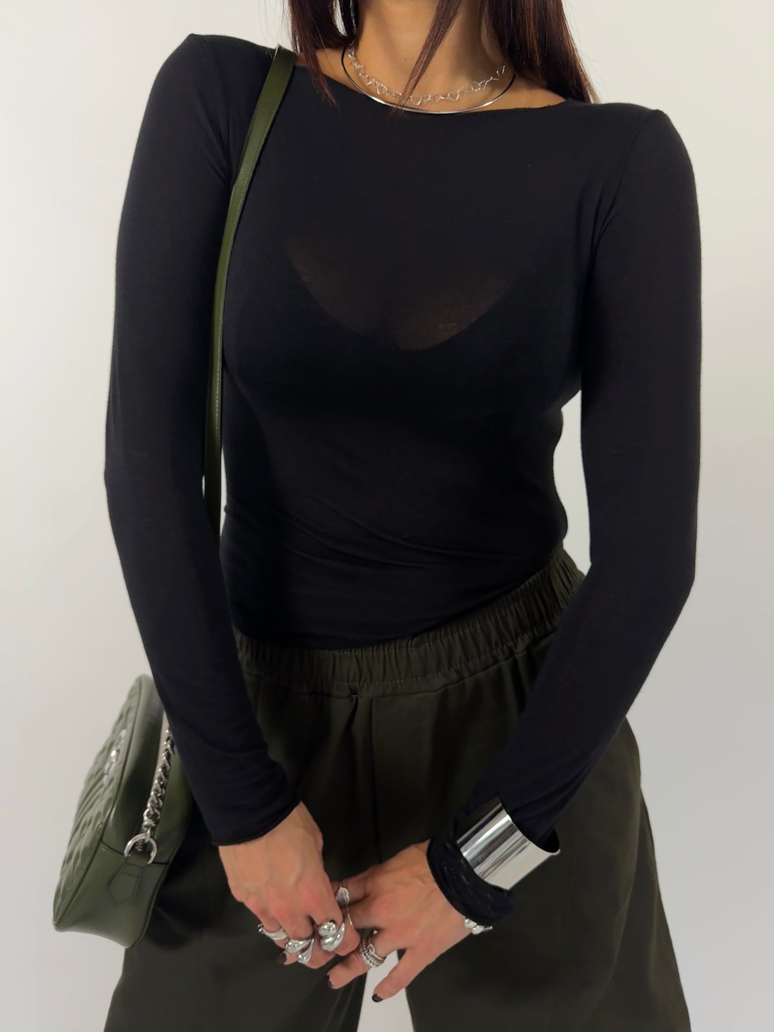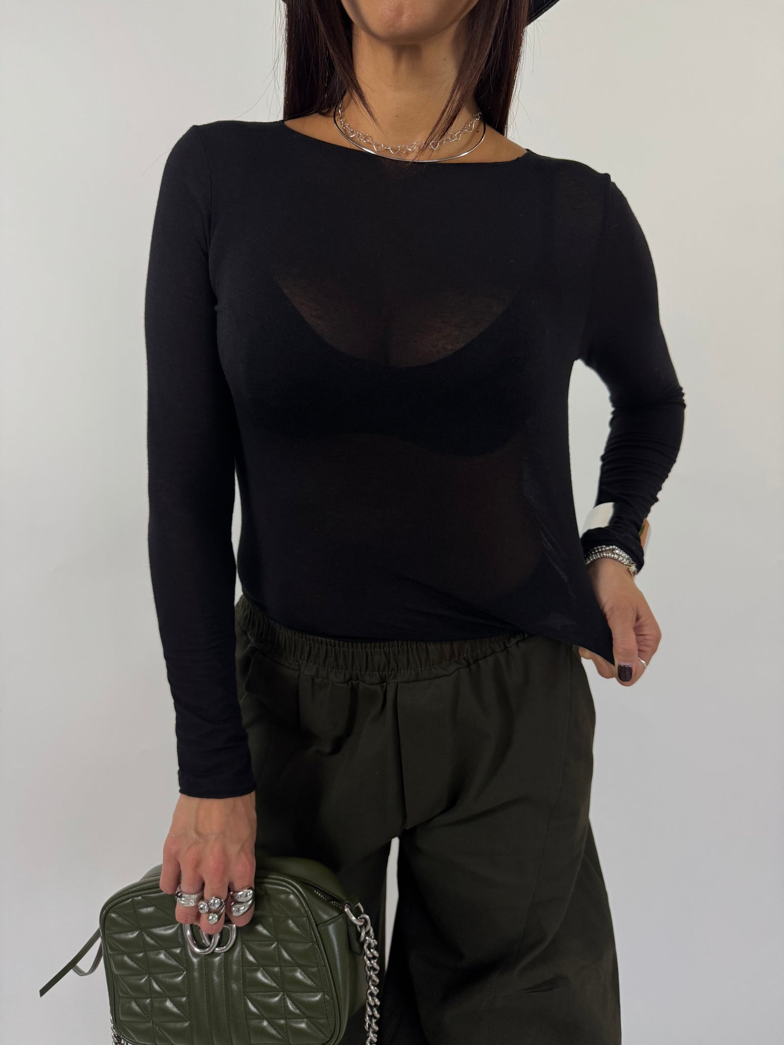 T-shirt manica lunga misto viascosa e cachemire, tessuto leggermente trasparente, molto morbida ed elasticizzata.