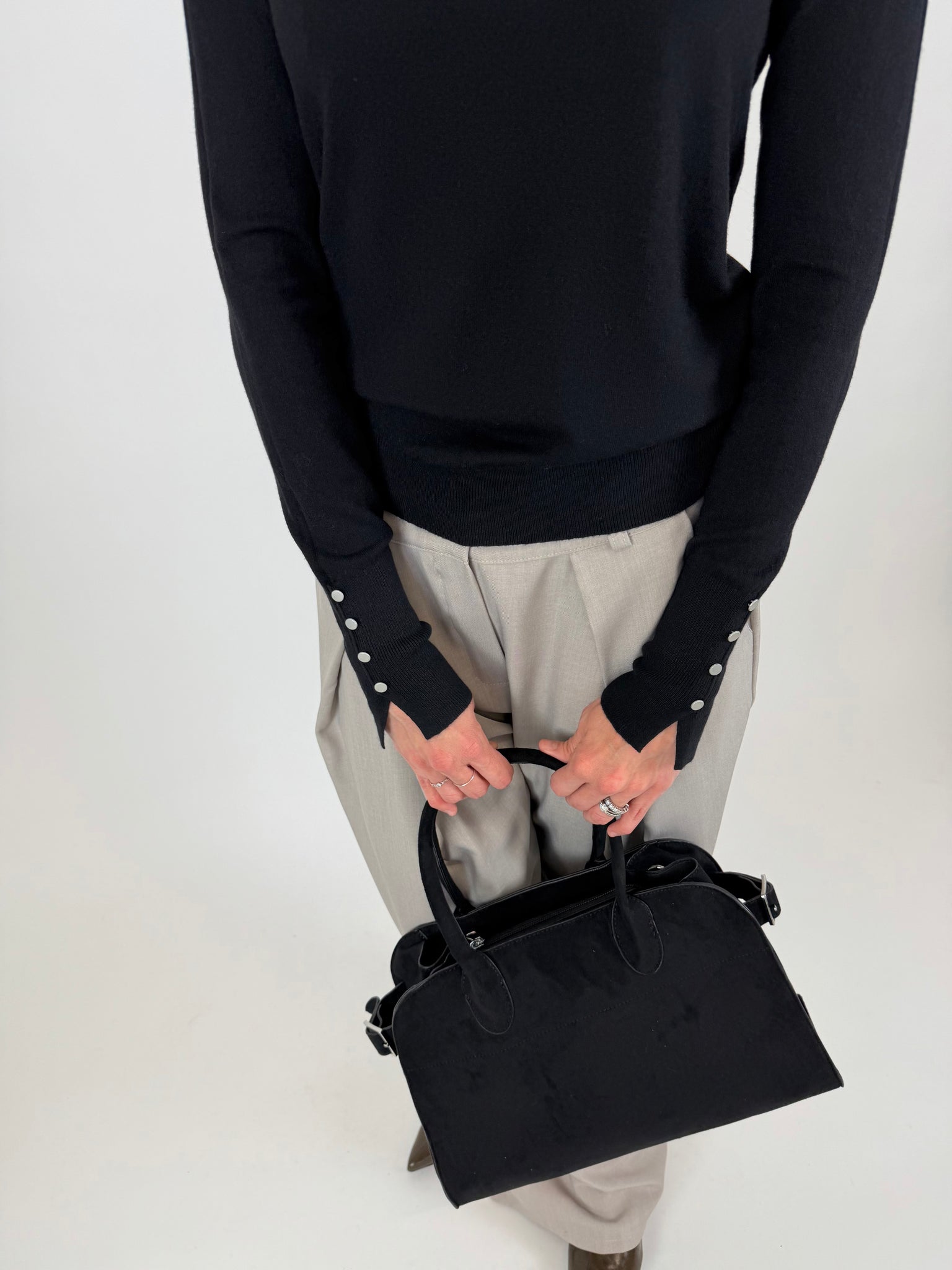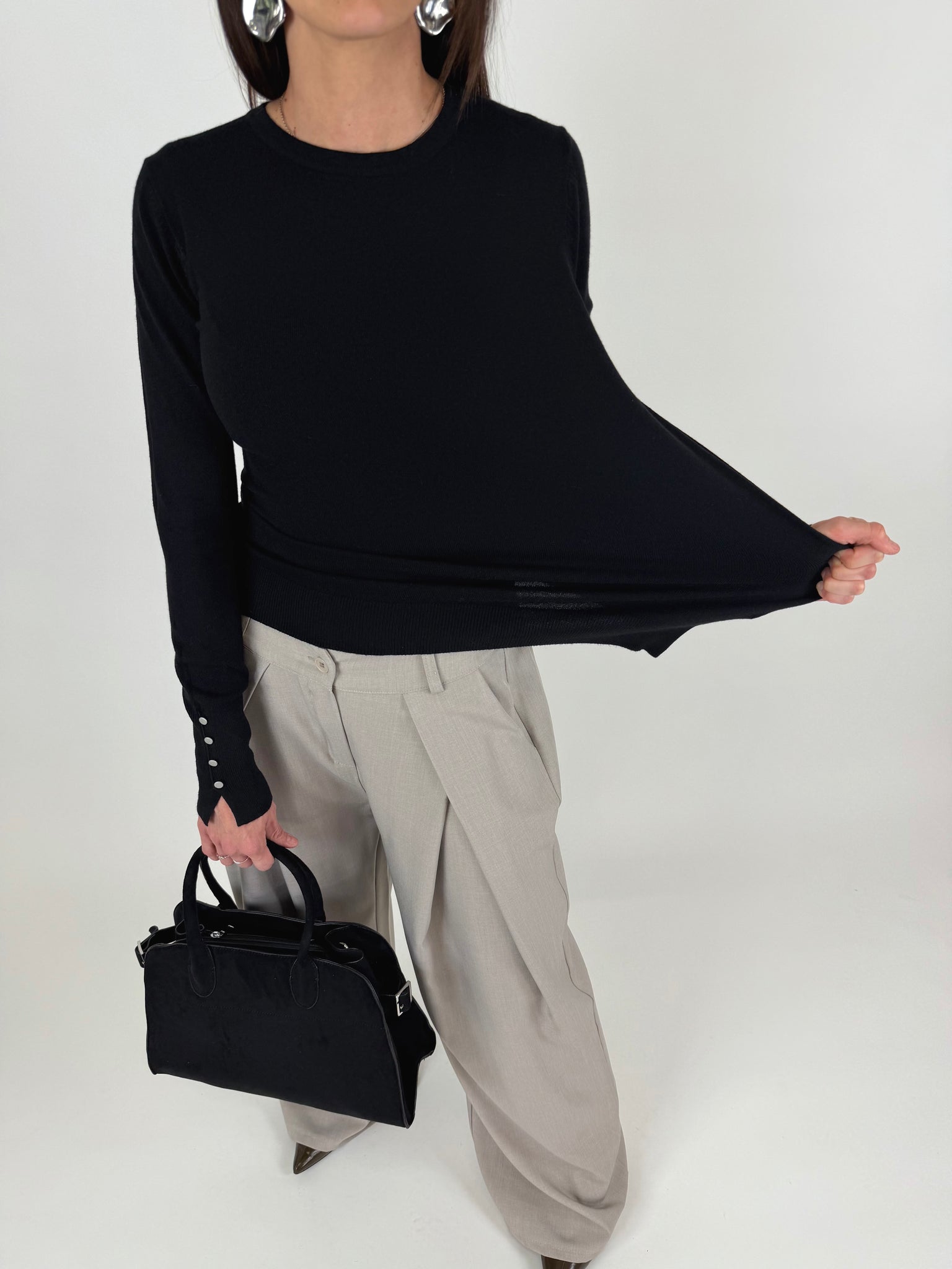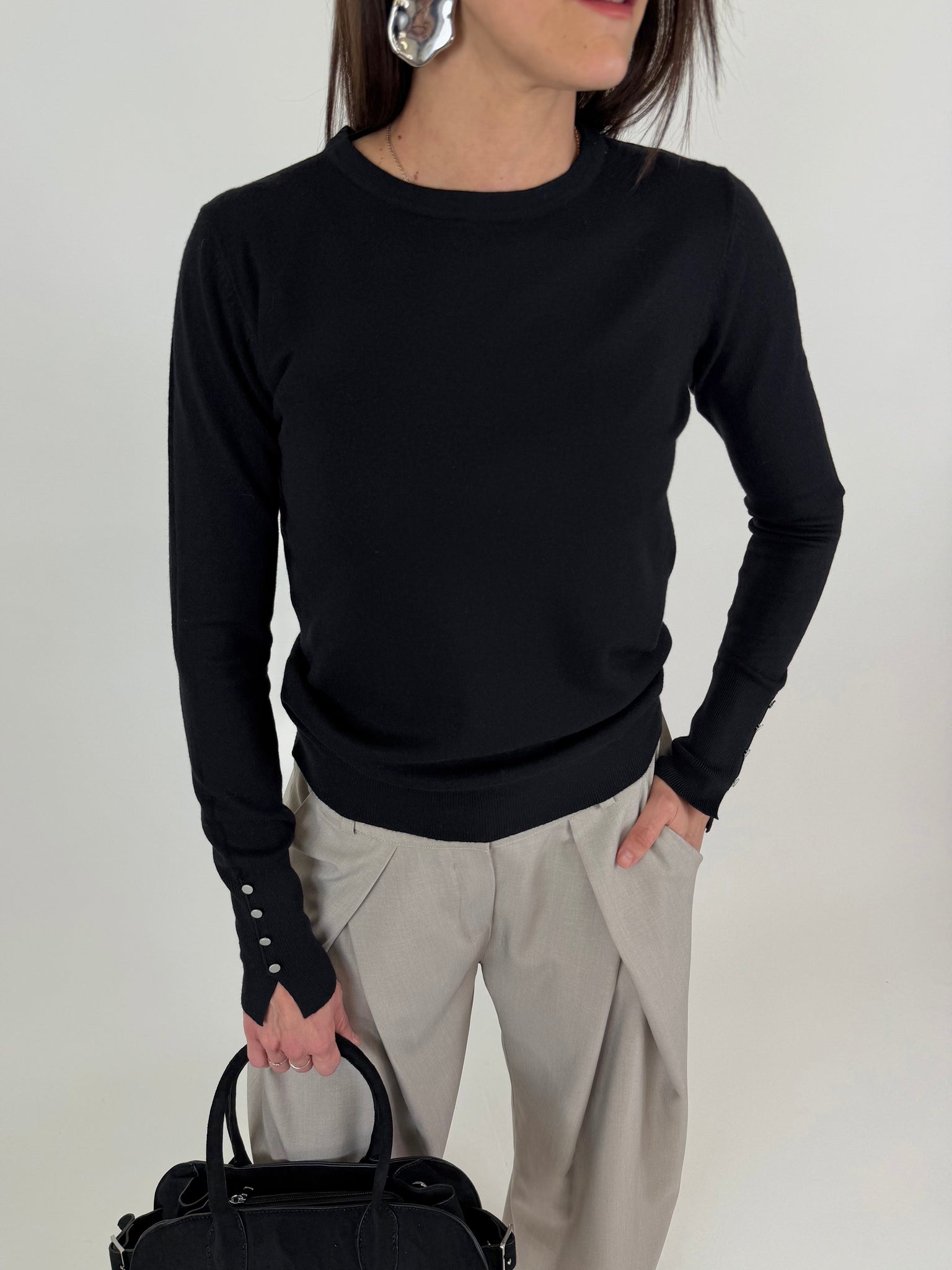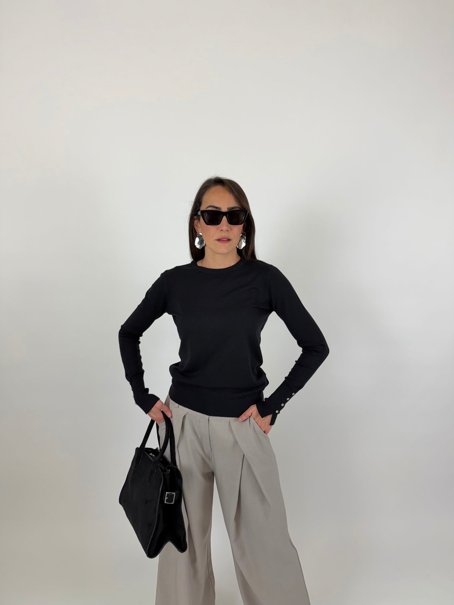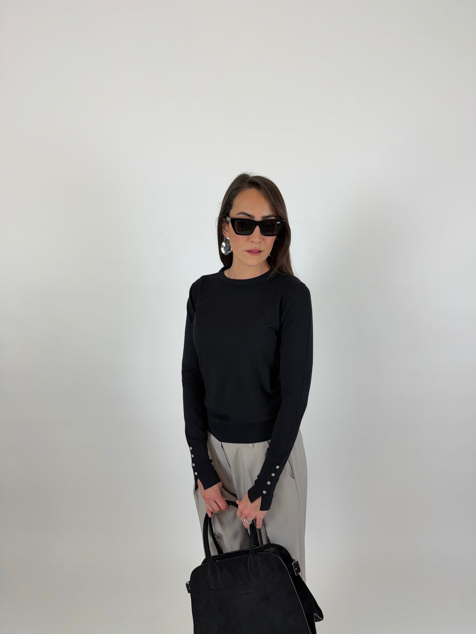 Maglioncino in viscosa dal design essenziale, pensato per unire comfort e stile. Il tessuto è morbido e piacevole, ideale da indossare in ogni stagione. La linea pulita lo rende un capo versatile e facile da abbinare, mentre i polsi con spacchetti e bottoncini in silver satin decorativi aggiungono un dettaglio raffinato che valorizza anche i look più semplici. Taglia unica veste da 38 a 46