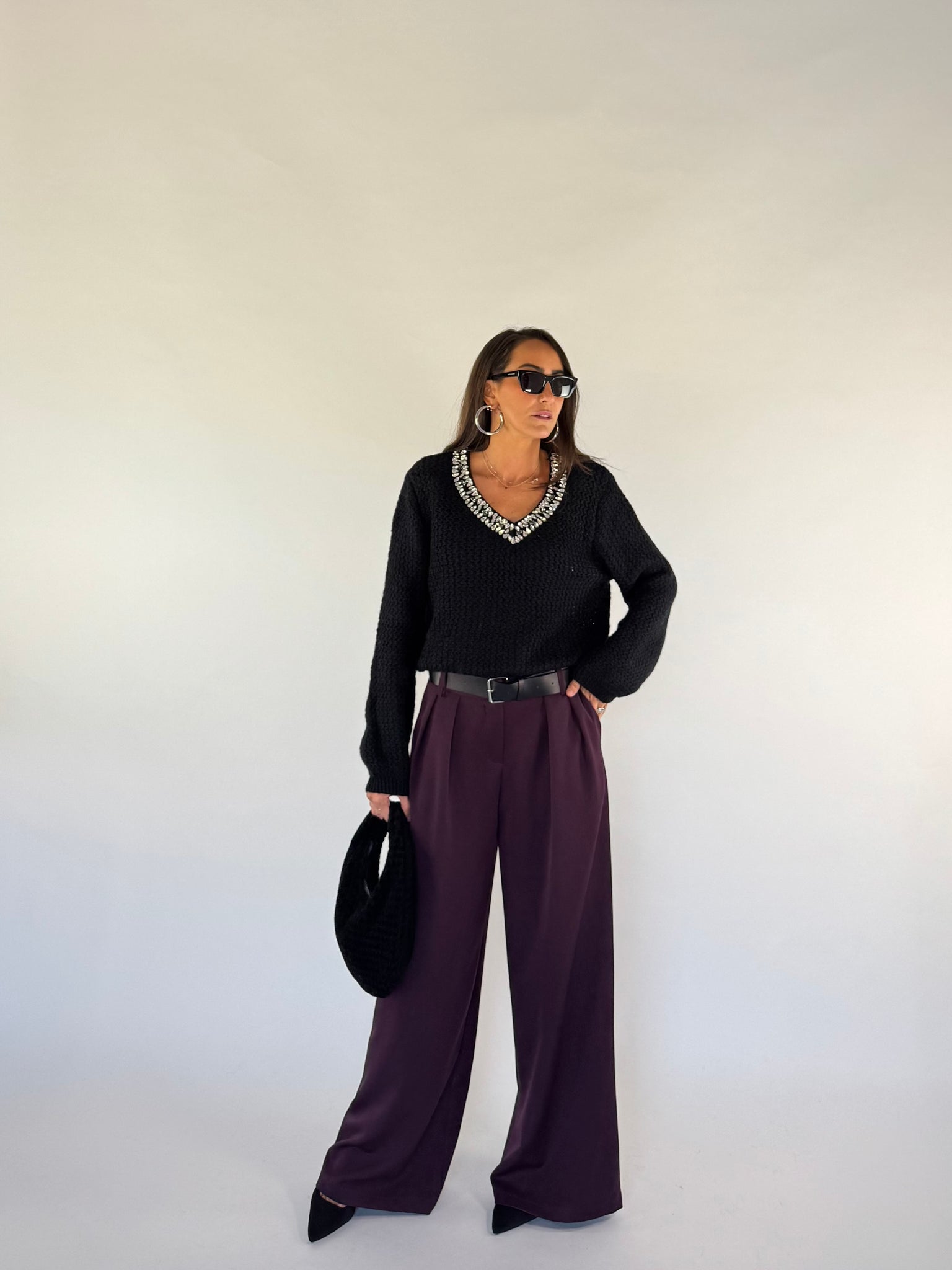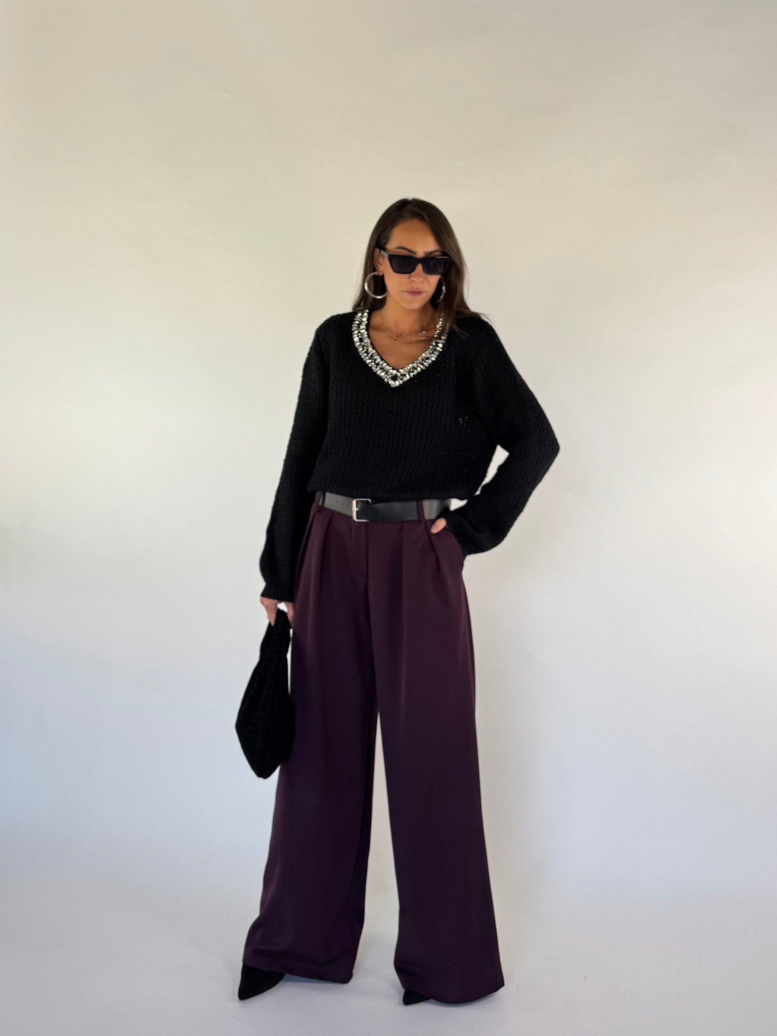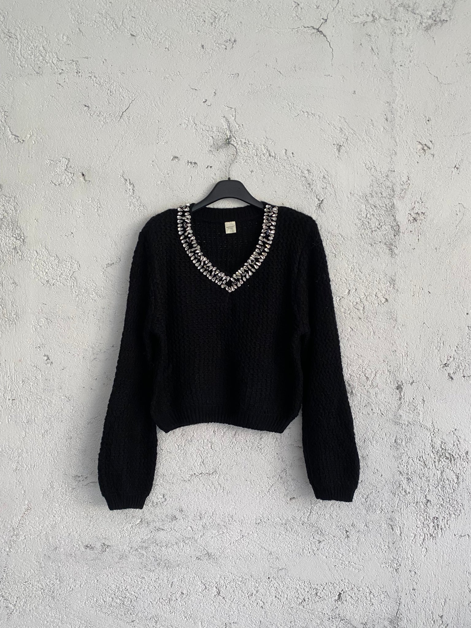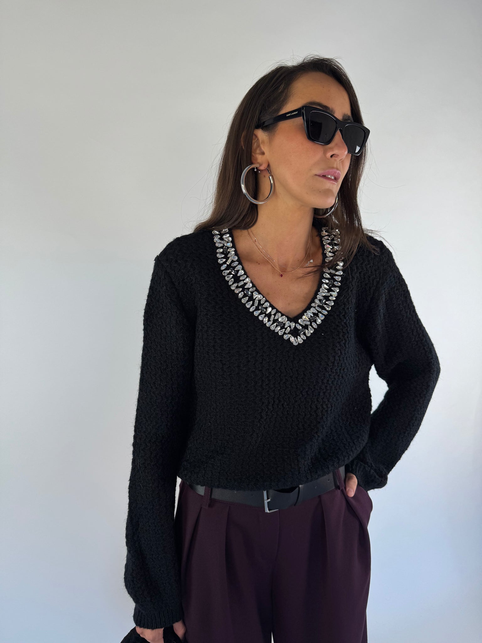 Maglione misto lana scollo a V con dettaglio pietre luminose. Trama larga. Modello Leggermente crop. Taglia unica veste da 38 a 44