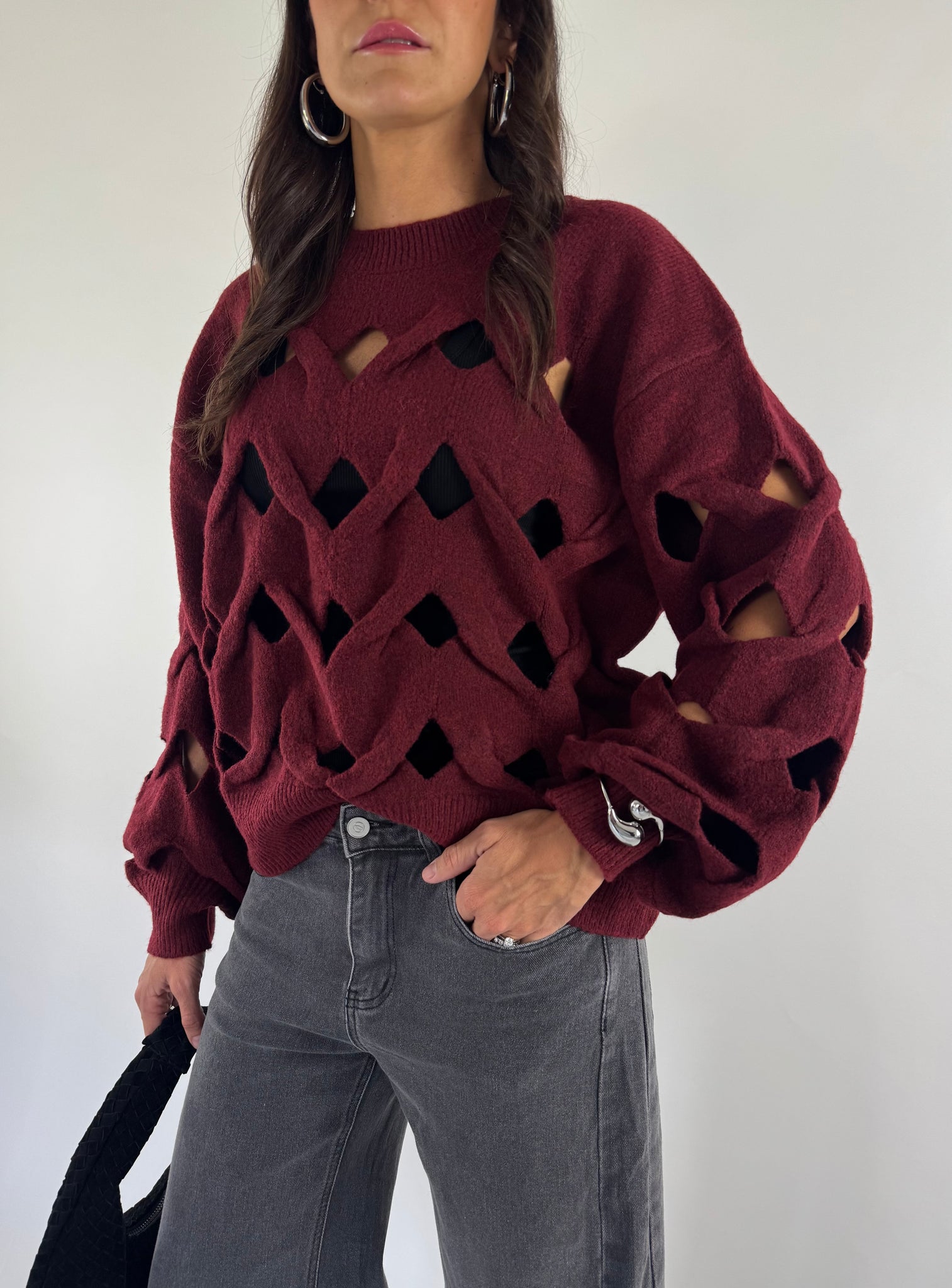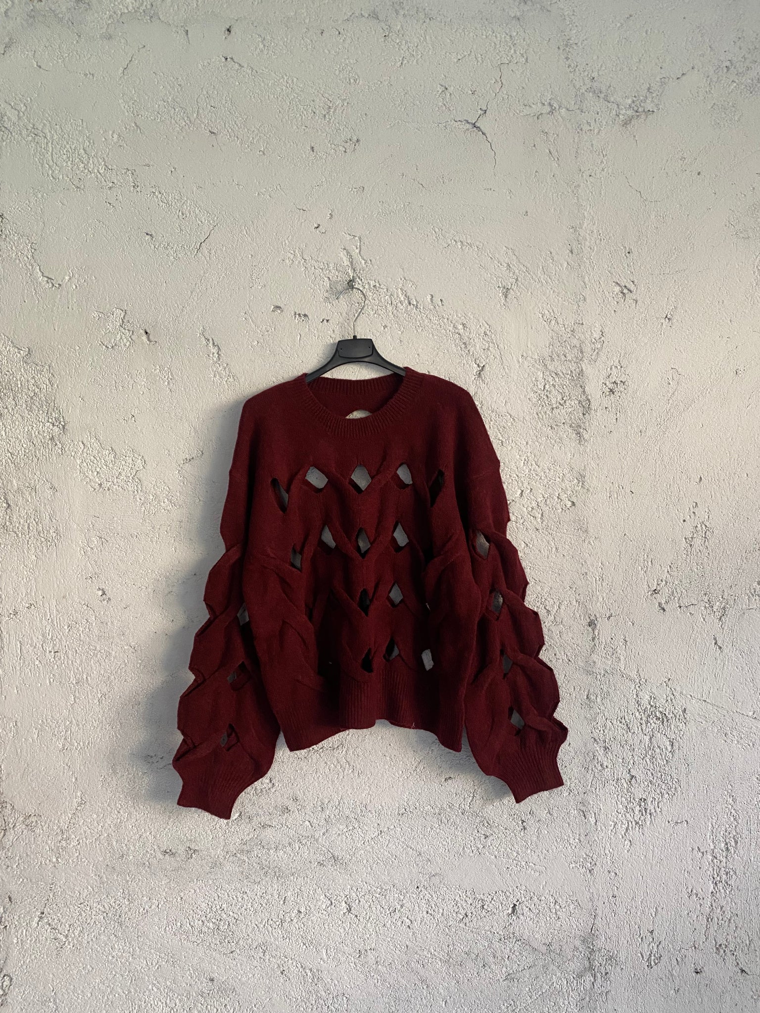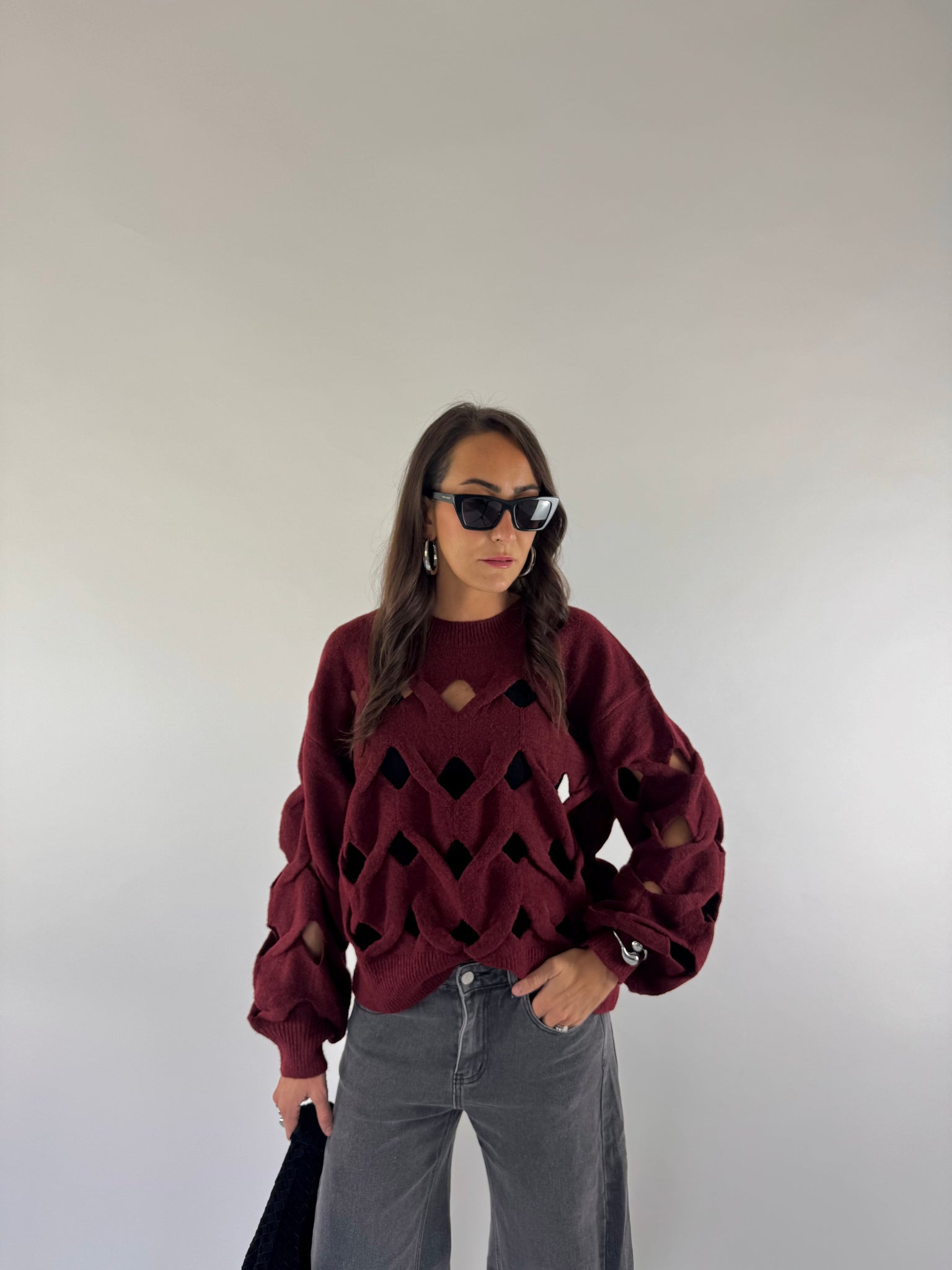 Pull in misto viscosa, girocollo, fit ampio, traforato a rombi sul davanti, sul retro e sulla manica. Taglia unica veste da 38 a 46 abbondante