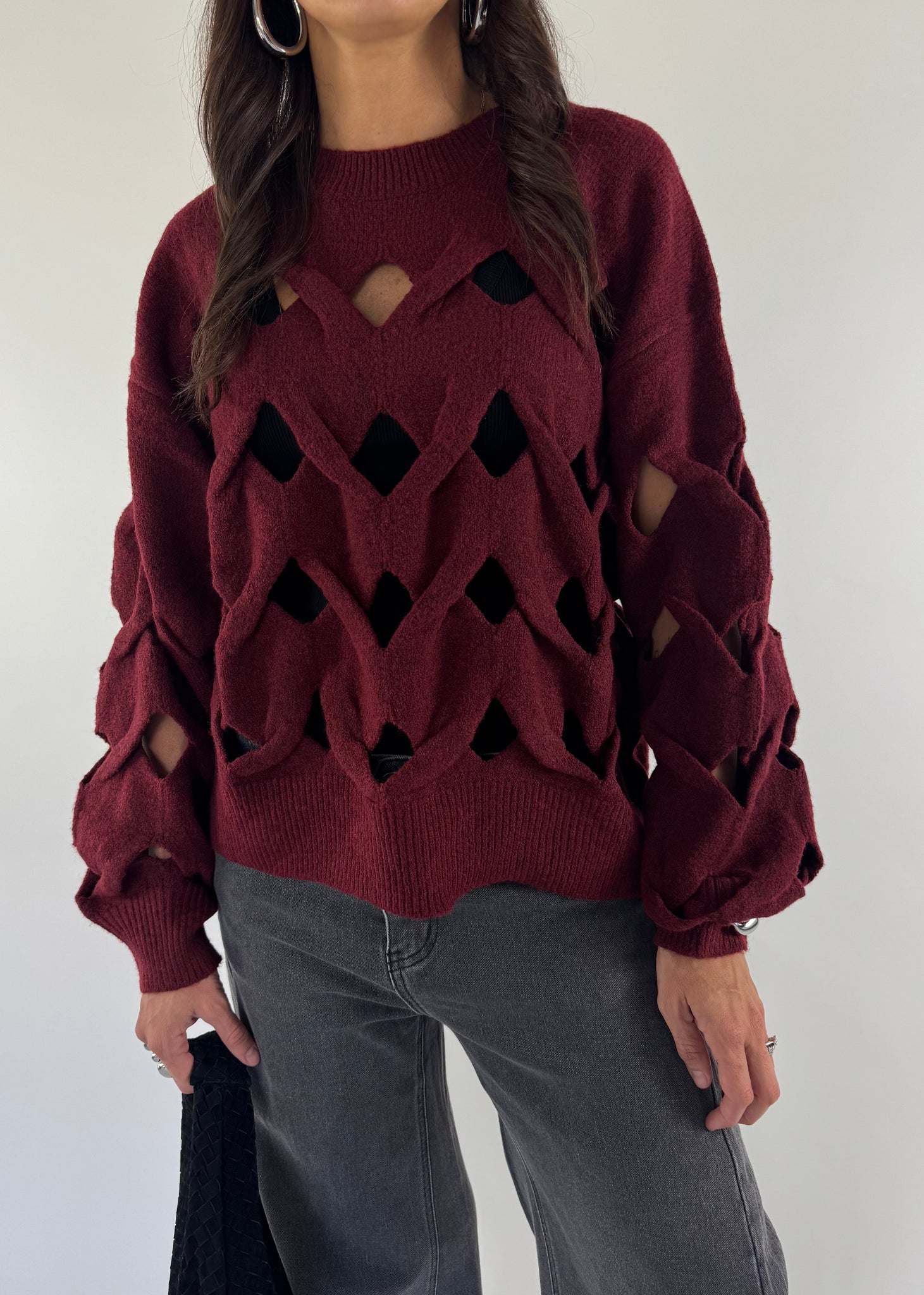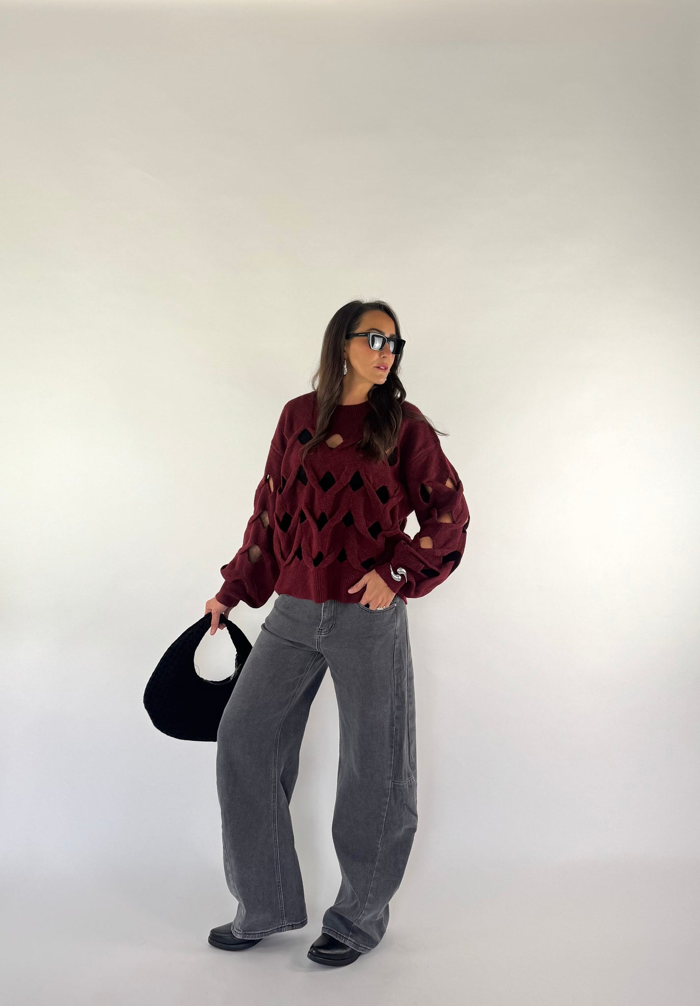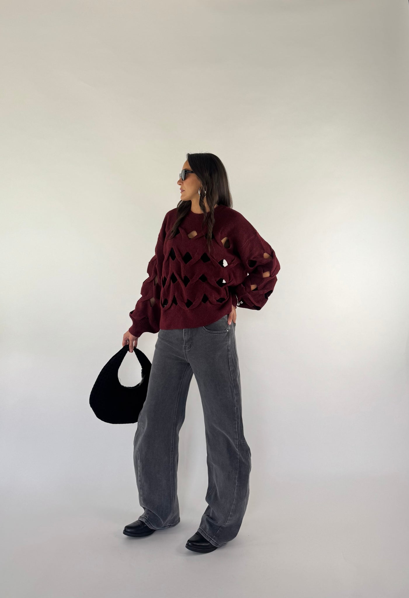 Pull in misto viscosa, girocollo, fit ampio, traforato a rombi sul davanti, sul retro e sulla manica. Taglia unica veste da 38 a 46 abbondante