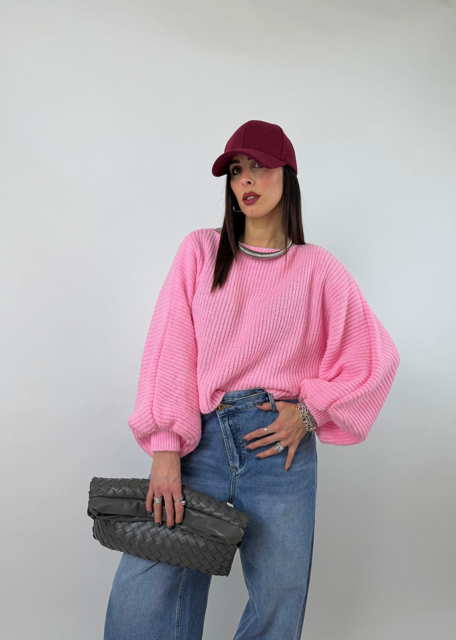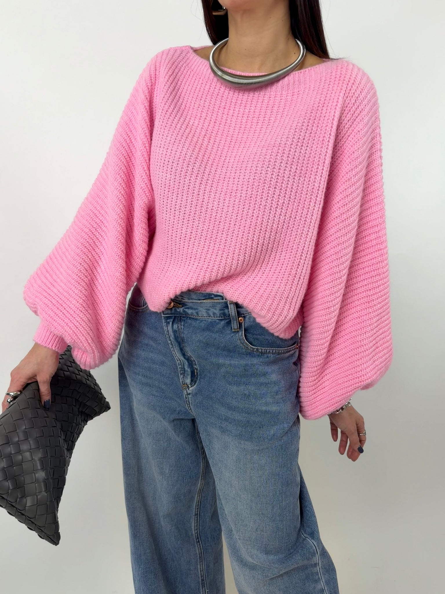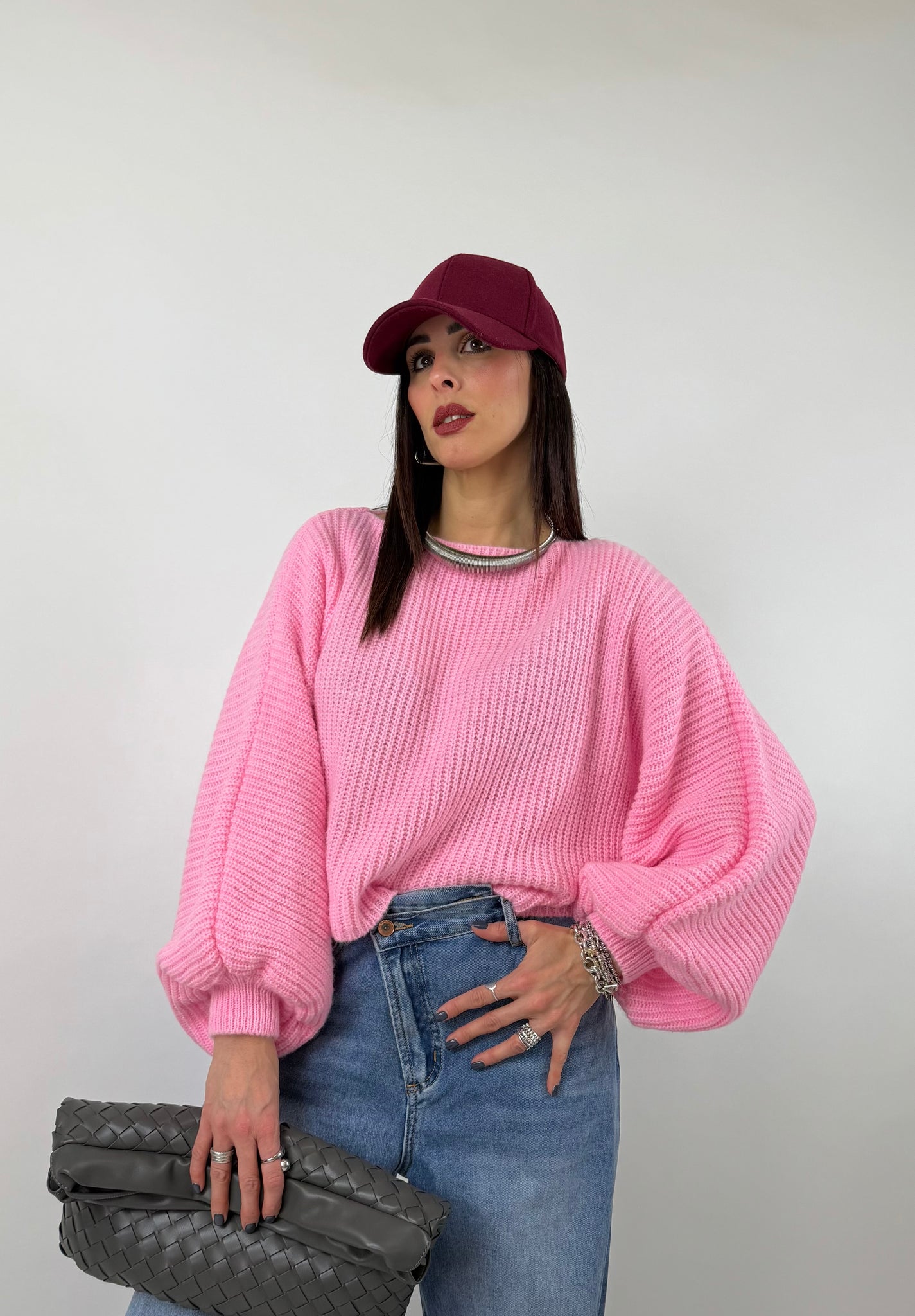 Pull tessuto a trama larga, taglio squadrato, manica ampia a palloncino. Taglia unica veste da 38 a 46
