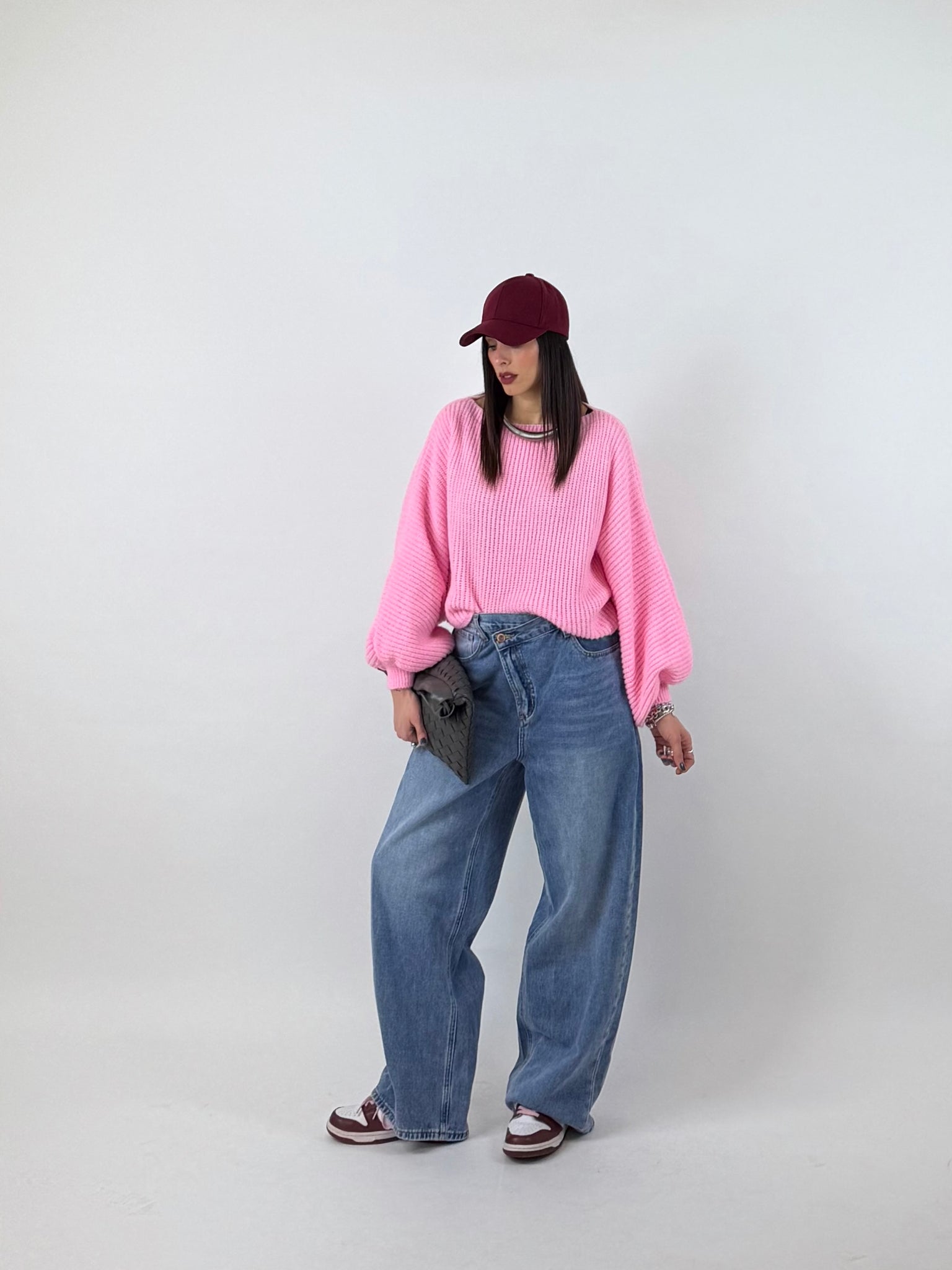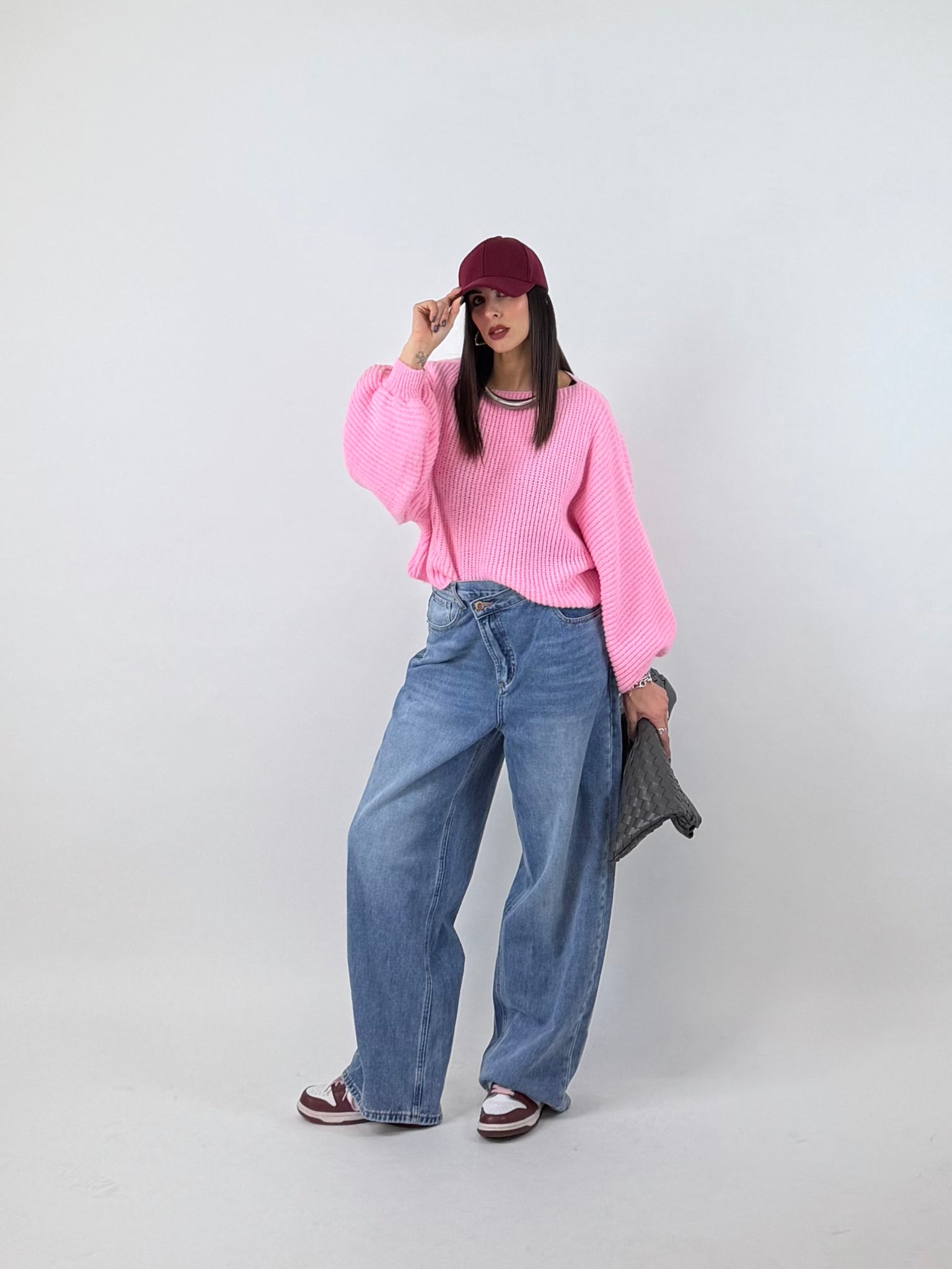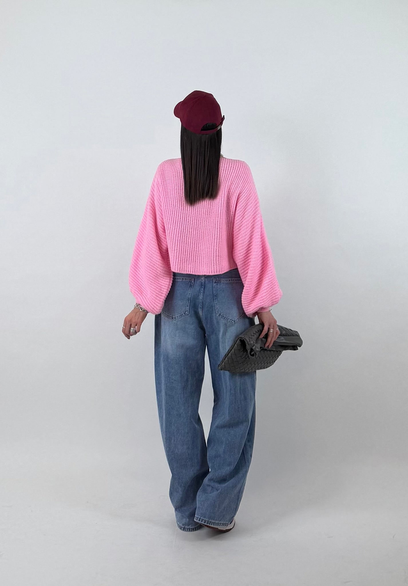 Pull tessuto a trama larga, taglio squadrato, manica ampia a palloncino. Taglia unica veste da 38 a 46