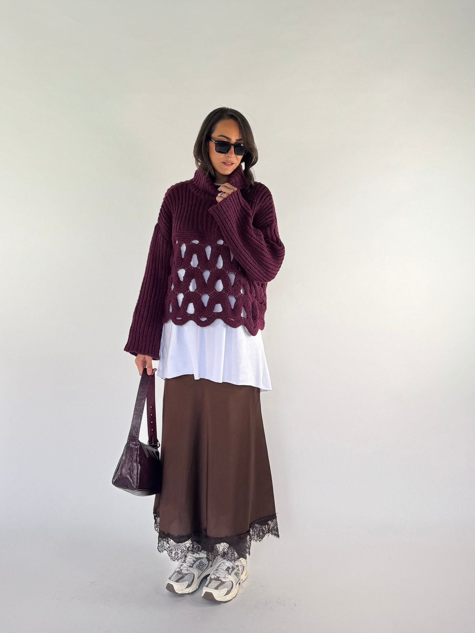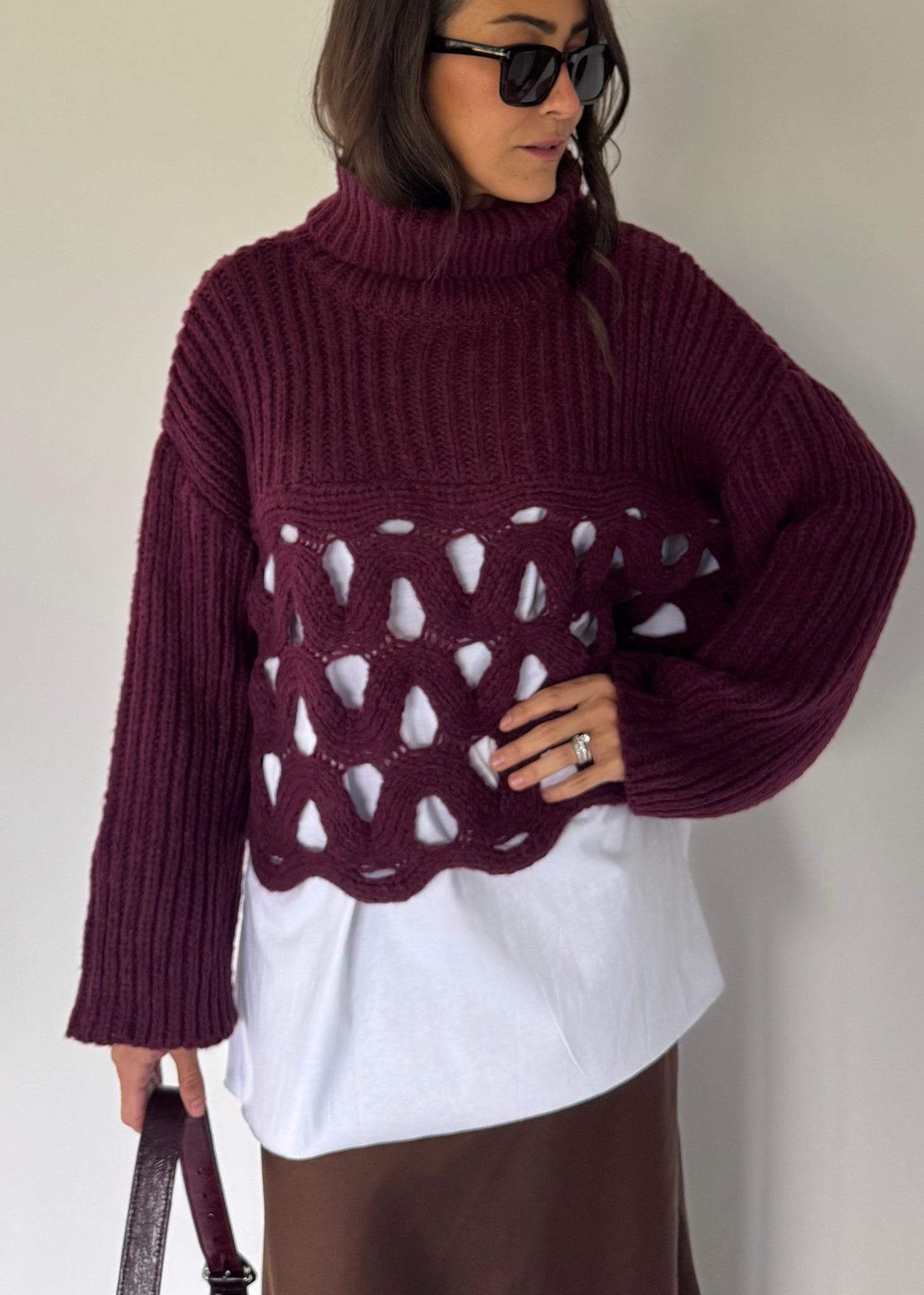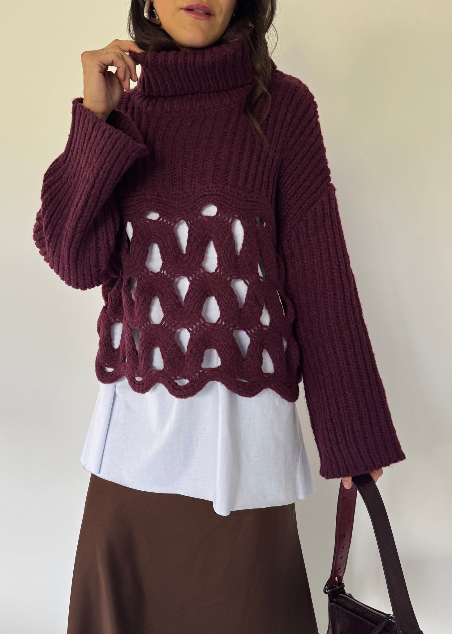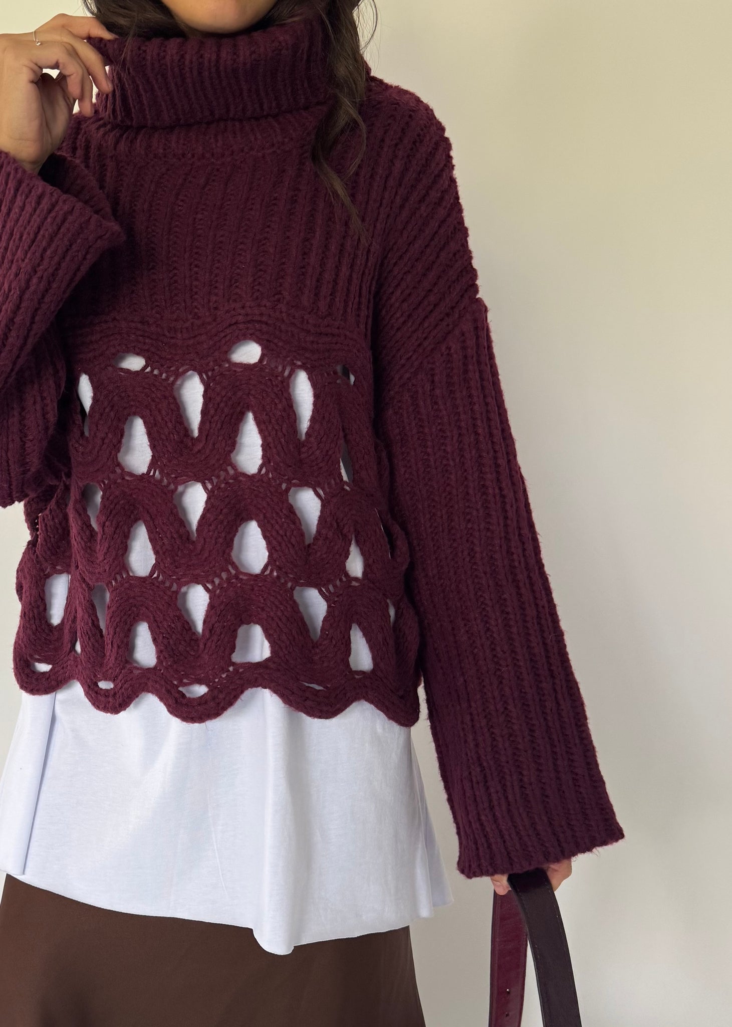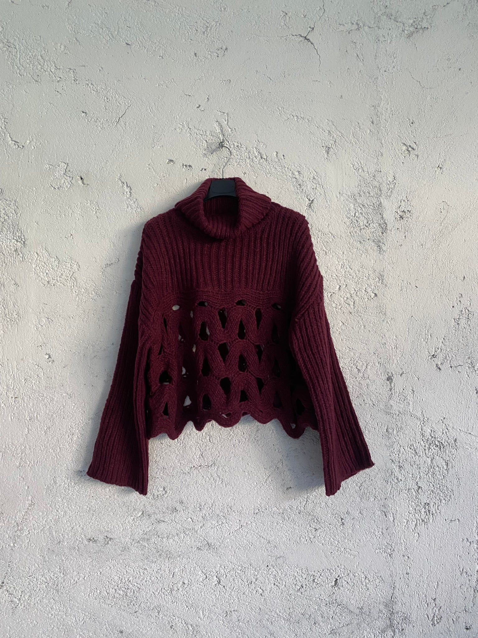 Pull dolcevita doppia trama, parte alta a maxi coste e parta bassa traforata. 30% viscosa. Taglia unica veste da 38 a 46