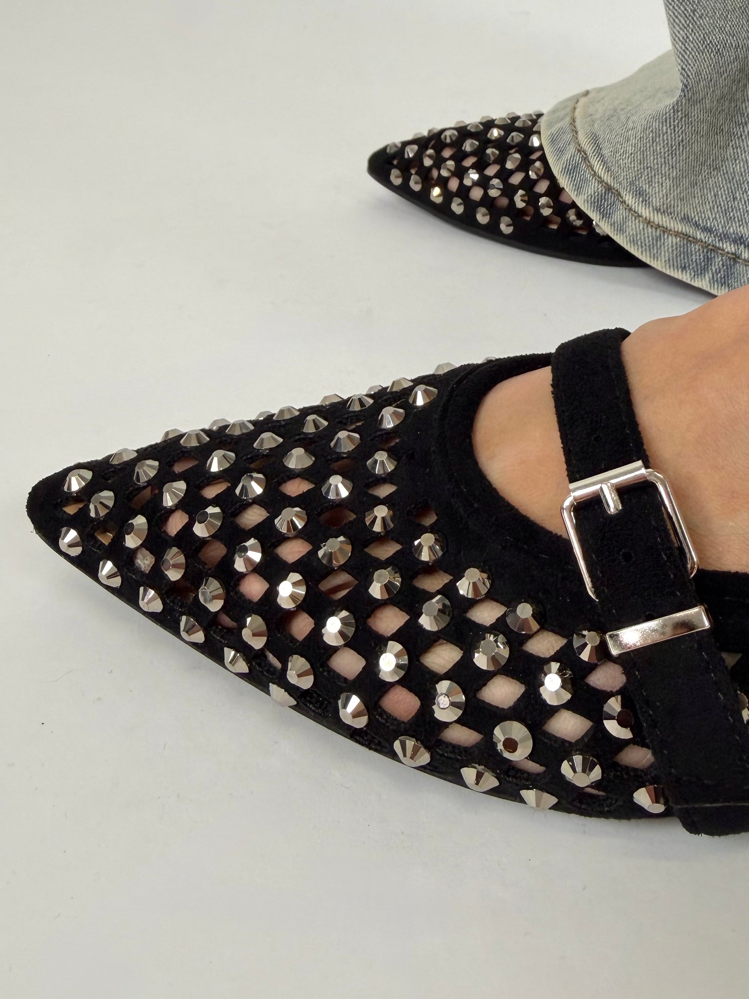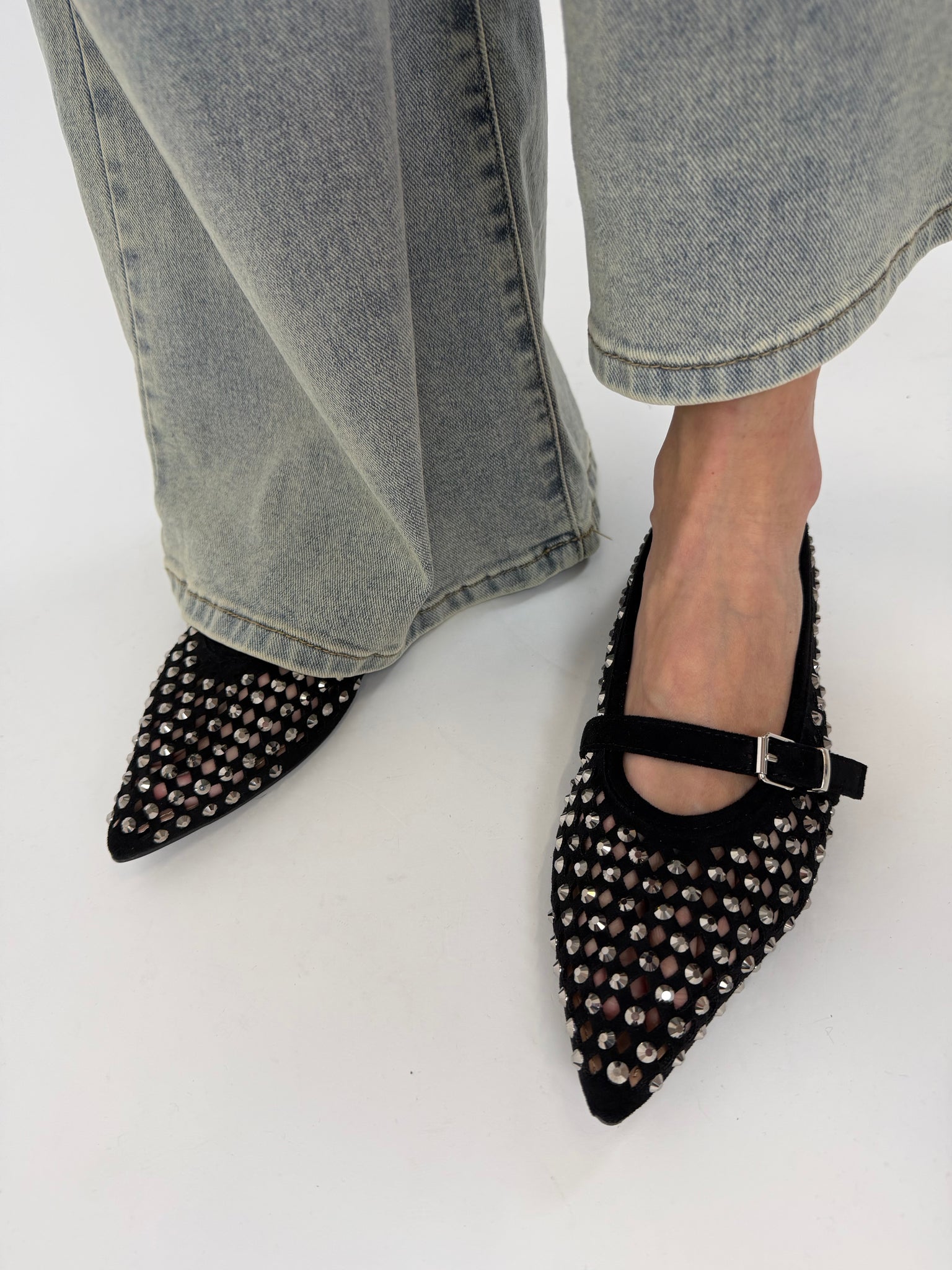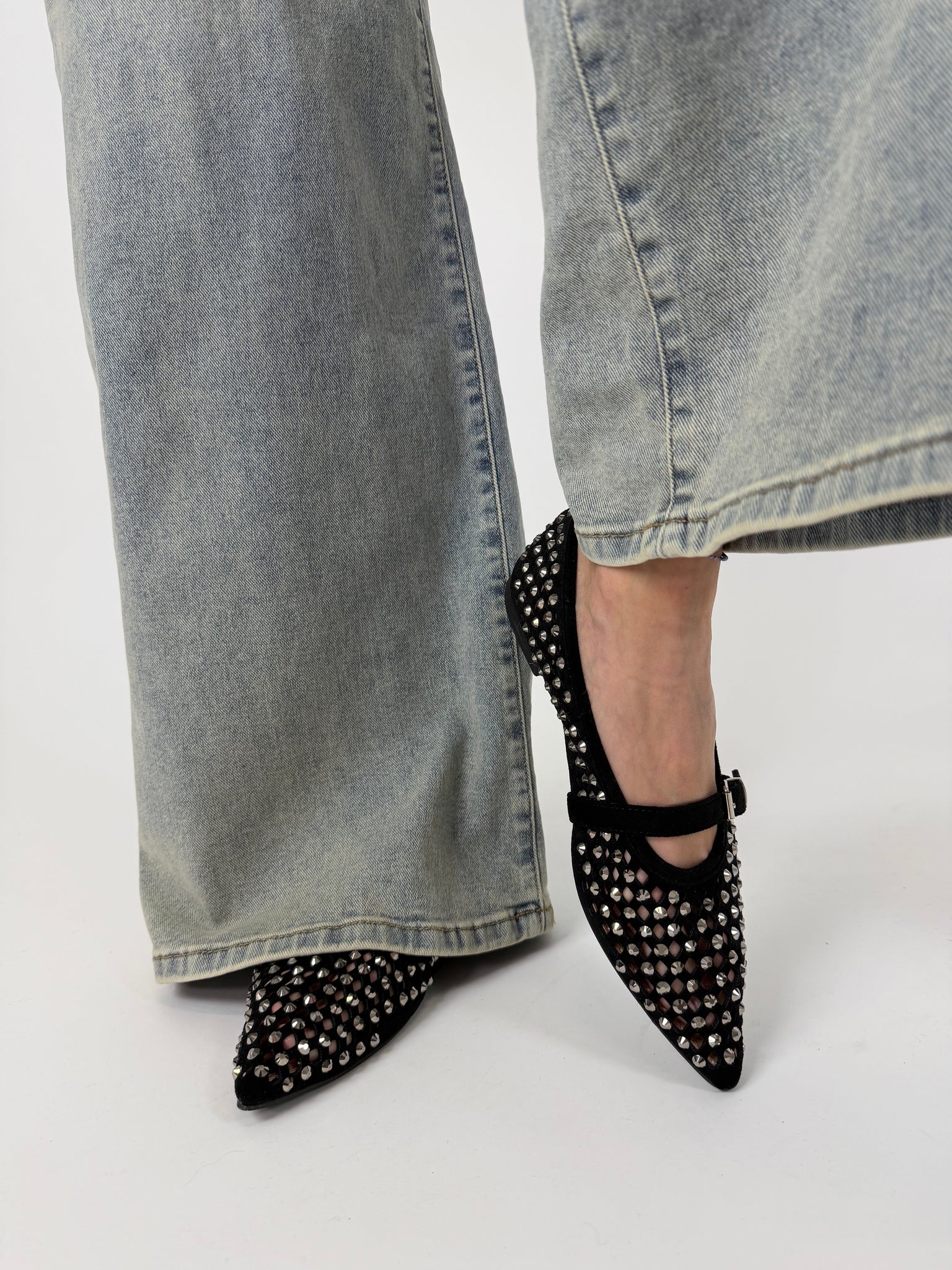 Ballerina a punta con laccetto, trama intrecciata, dettaglio borchie sfaccetate. Calzatura regular