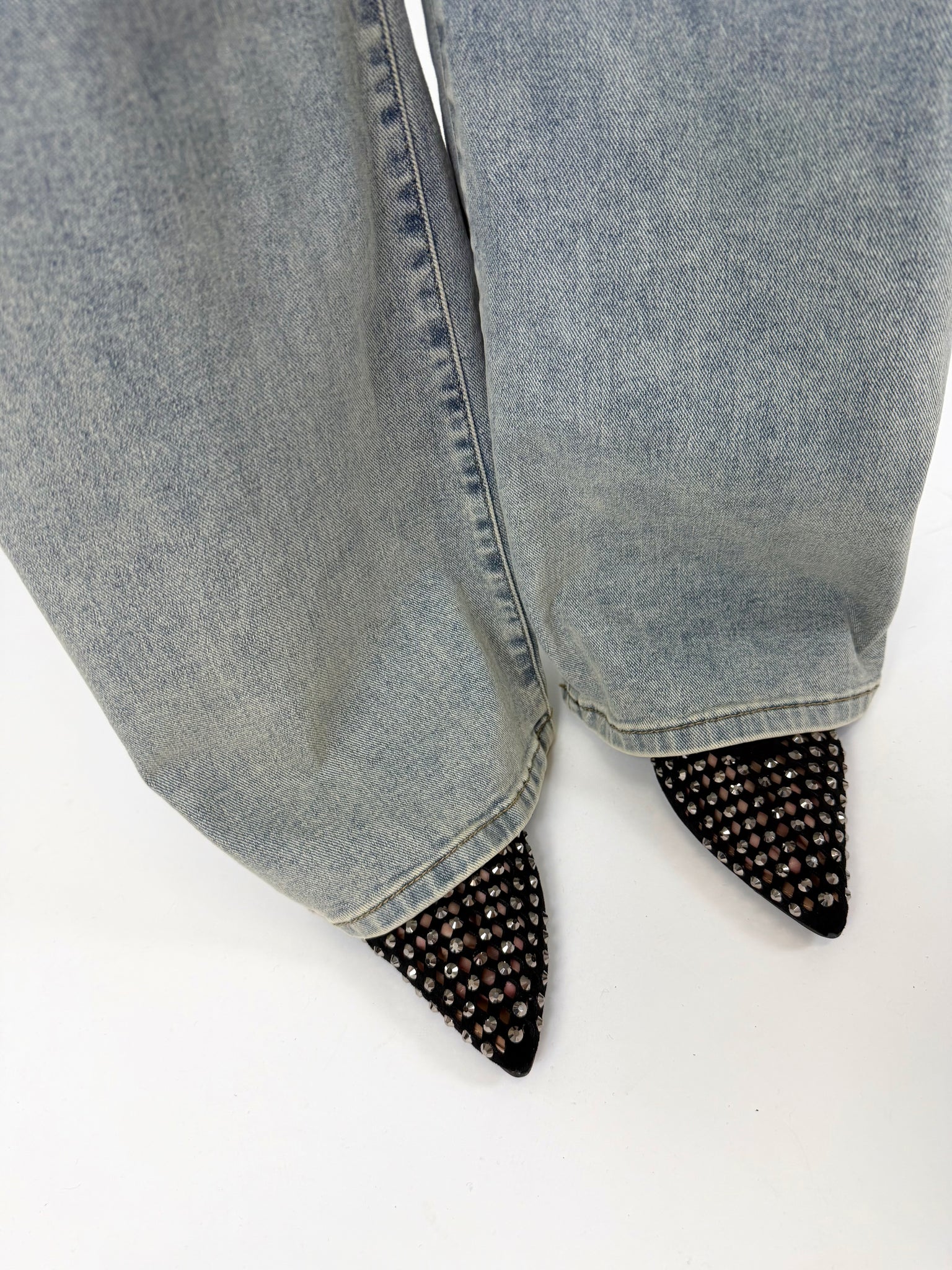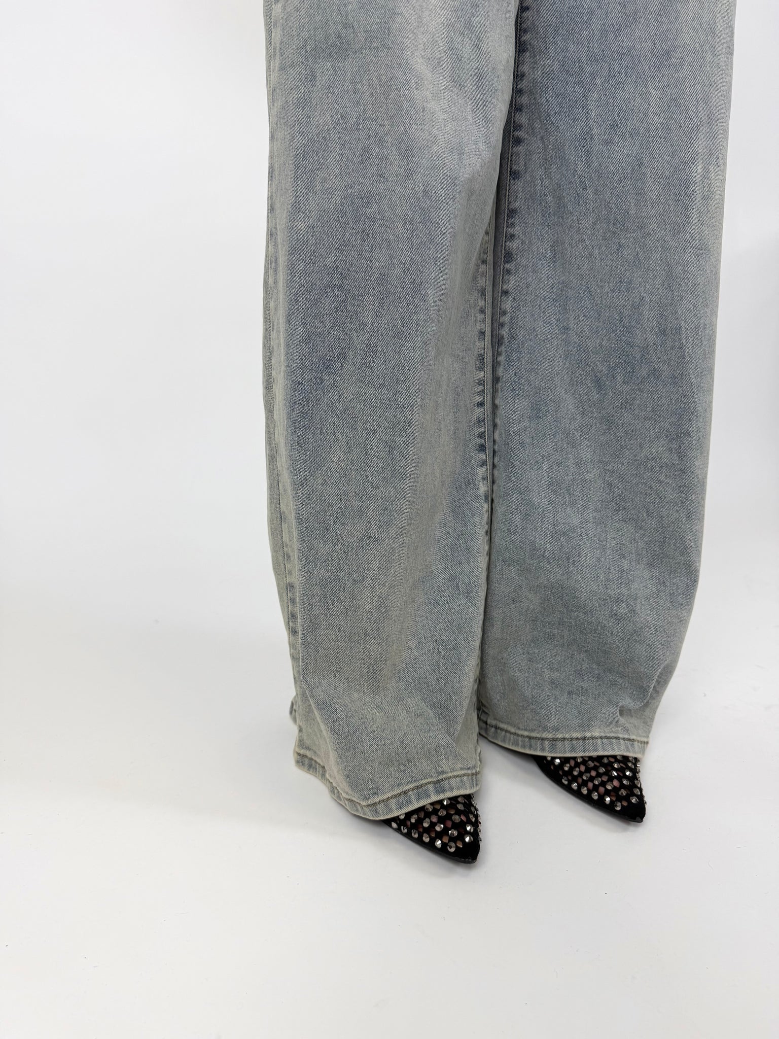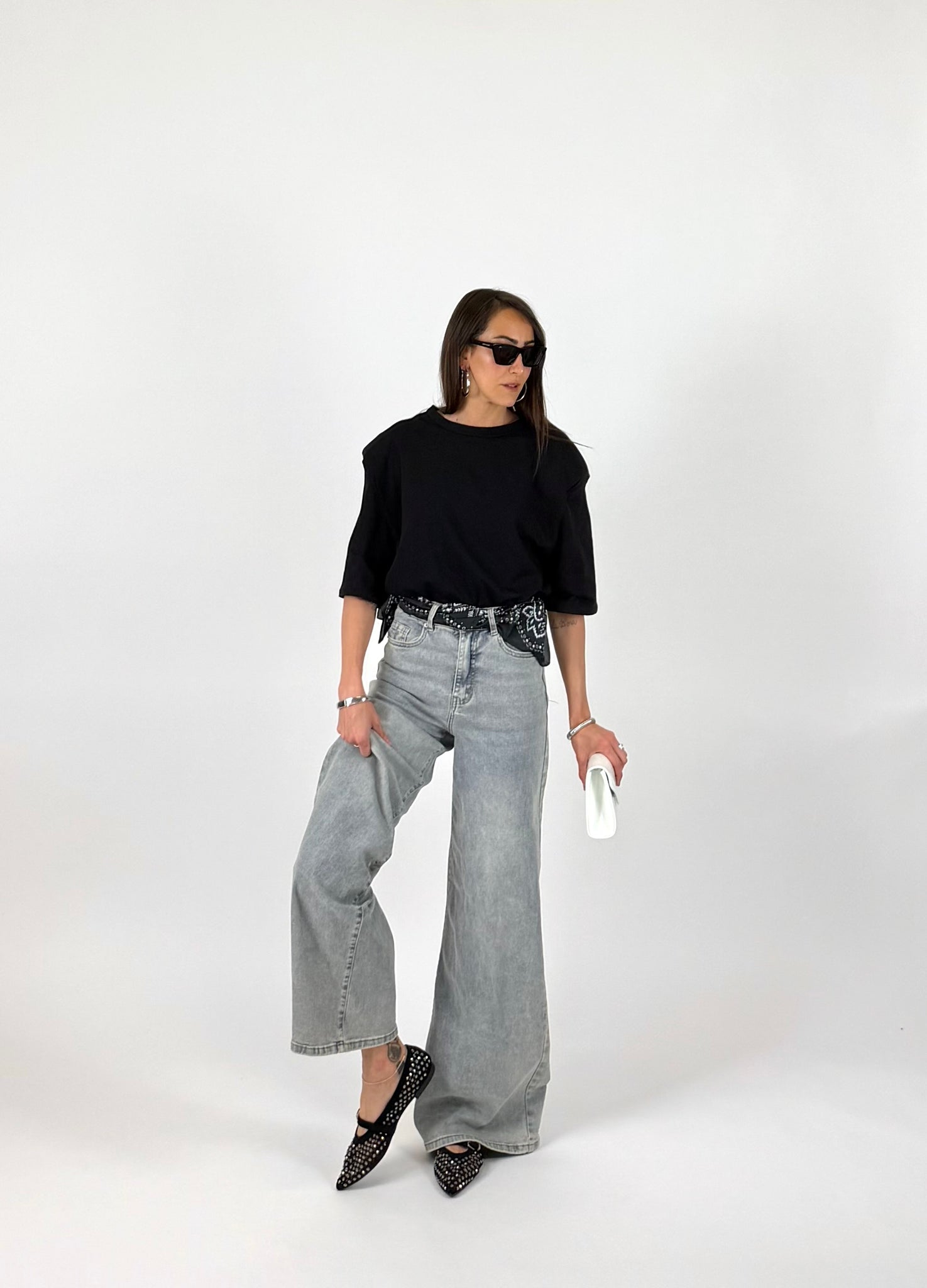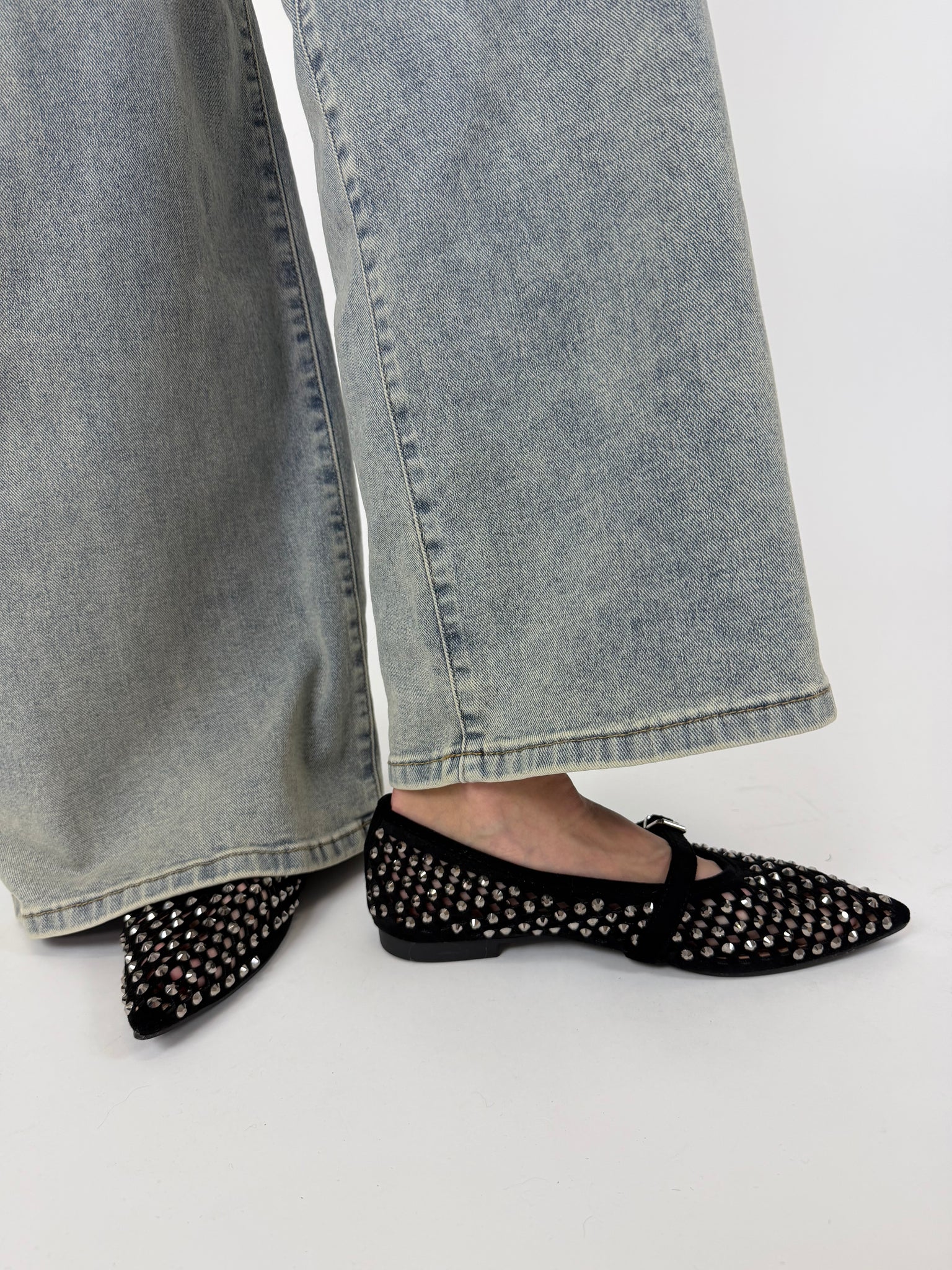 Ballerina a punta con laccetto, trama intrecciata, dettaglio borchie sfaccetate. Calzatura regular