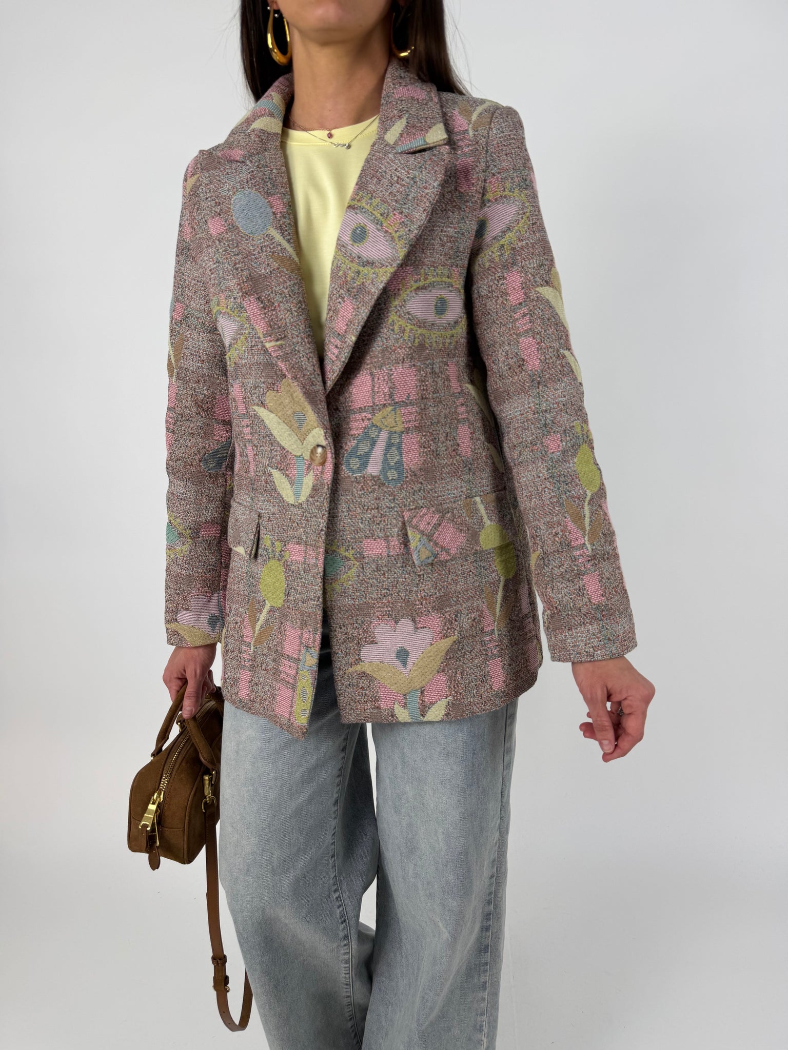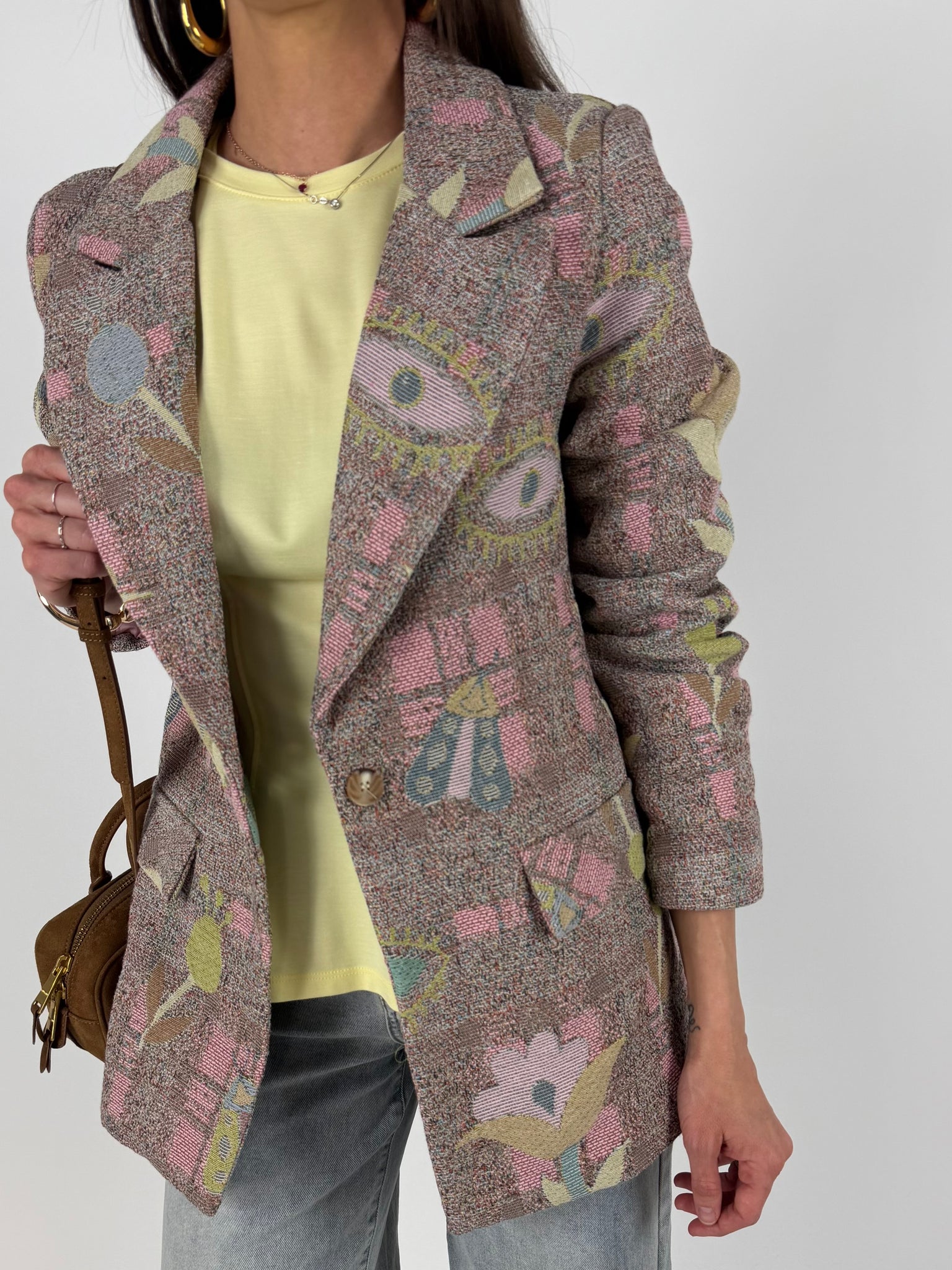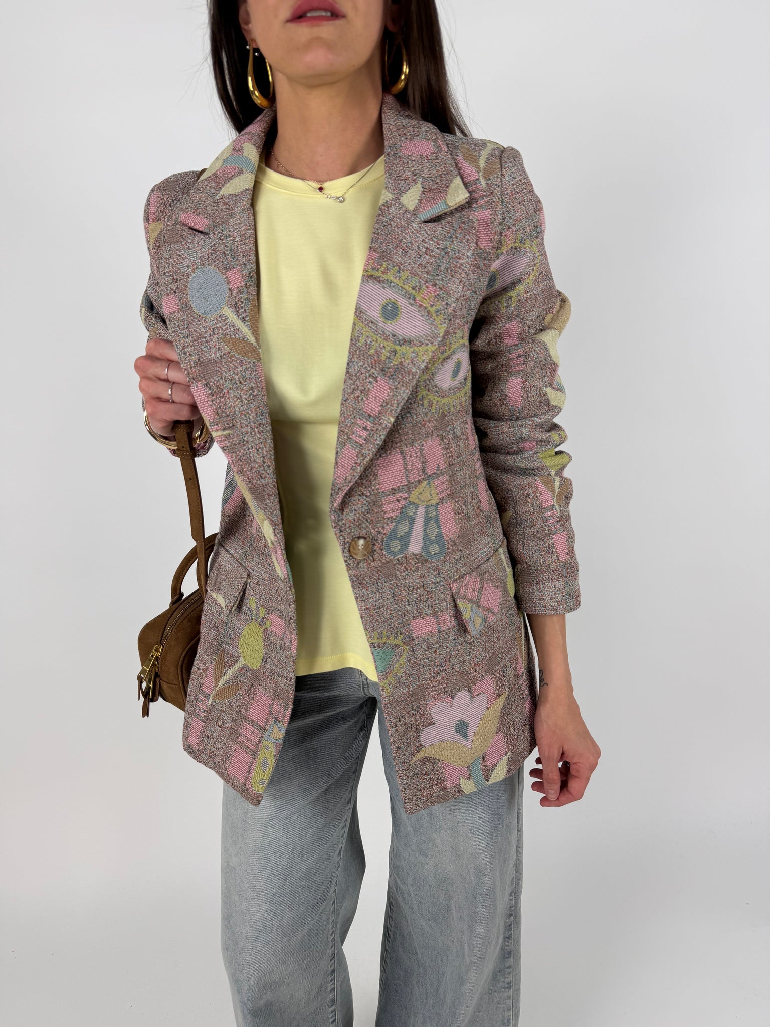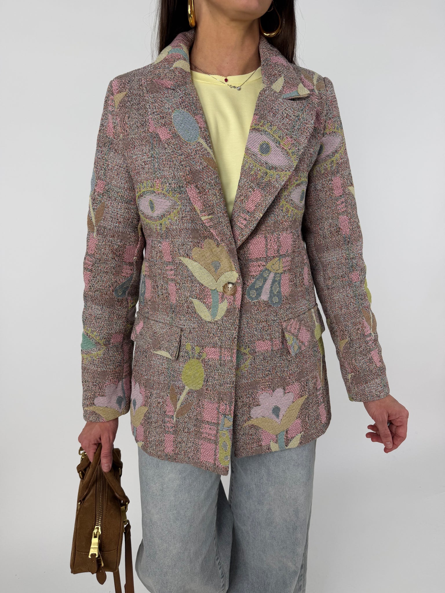Blazer in tweed, effetto tridimemsionale, tela rinforzata multicolore, foderato internamente. SM : 38-42 ML: 44-46