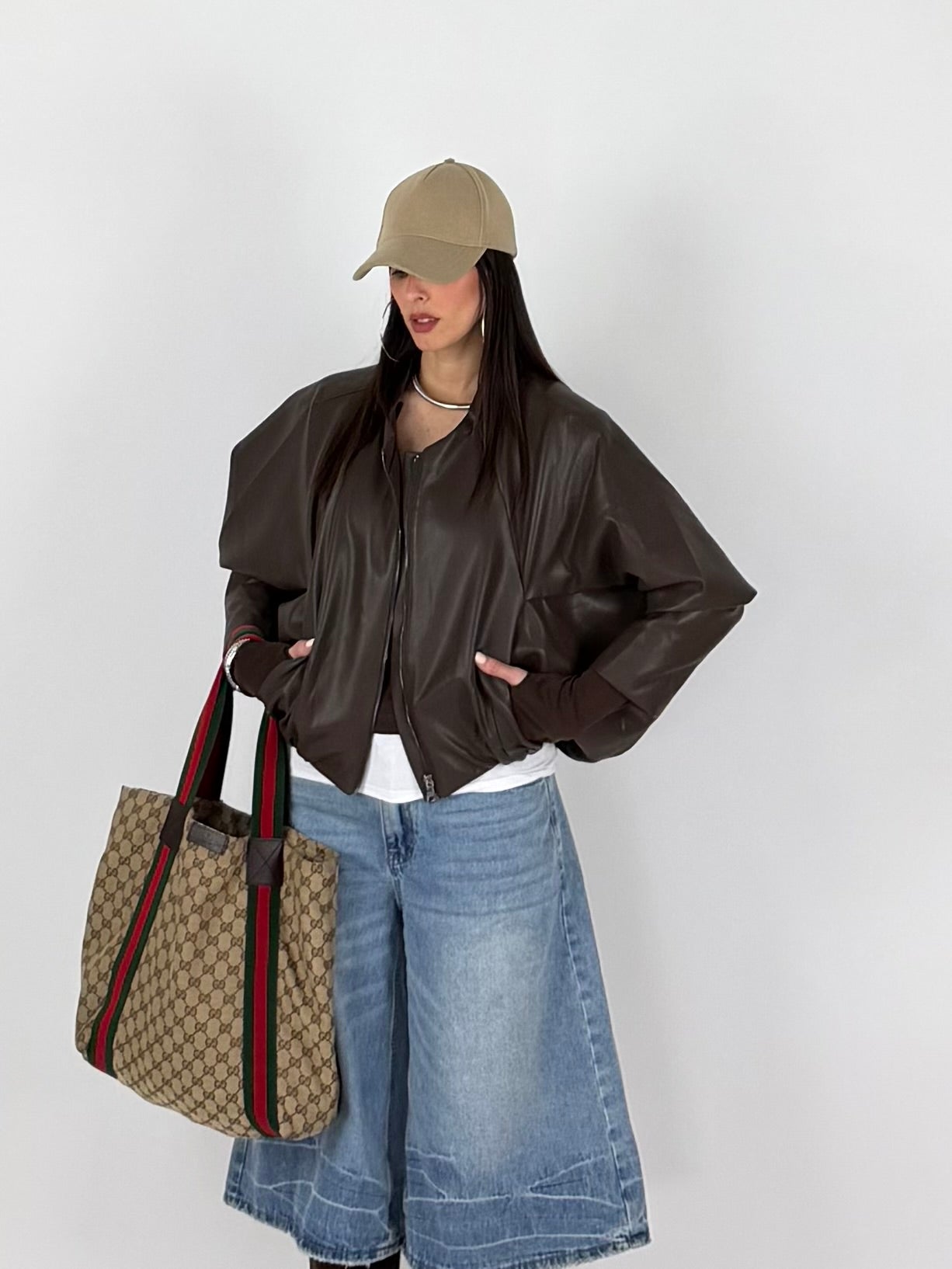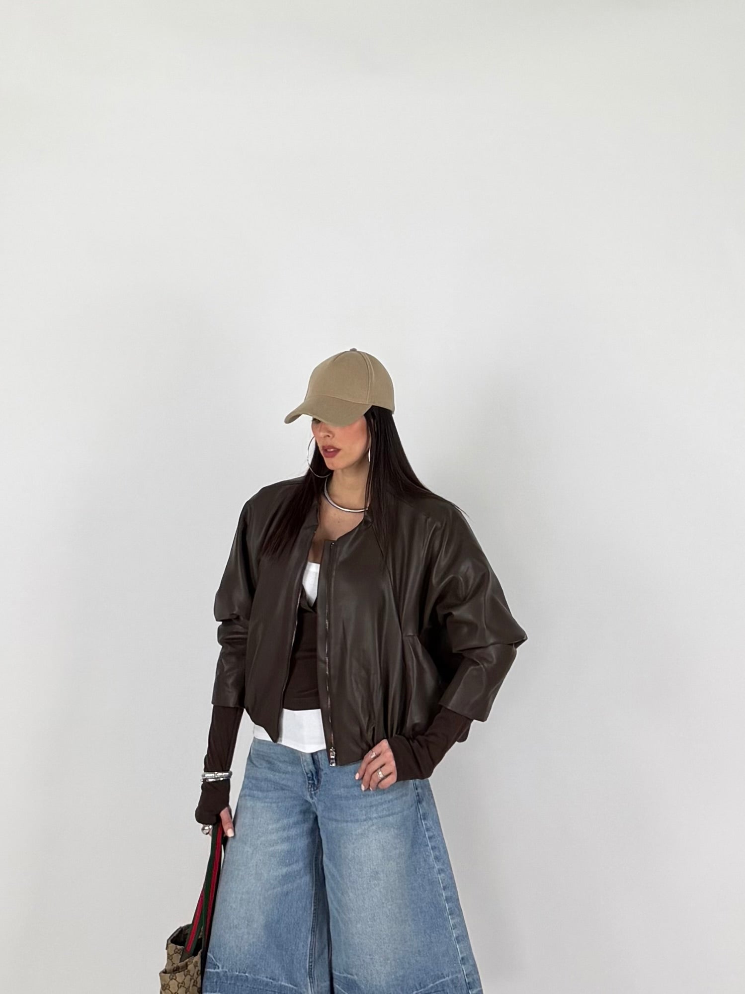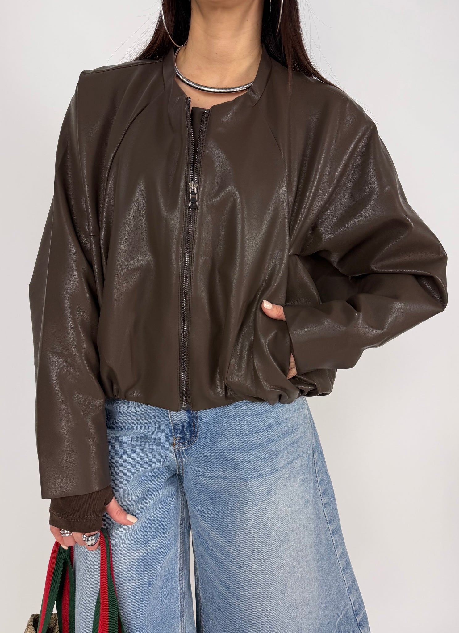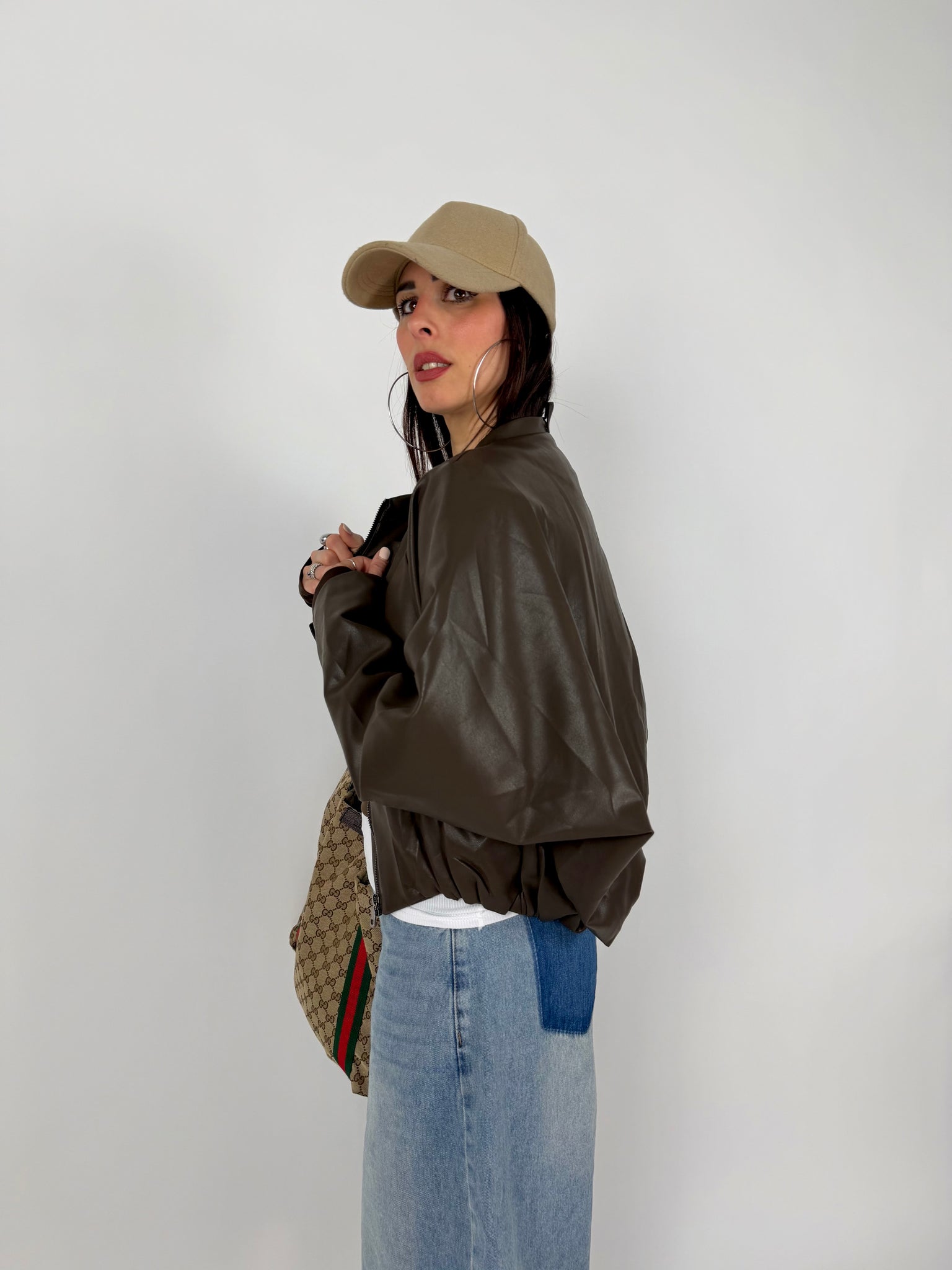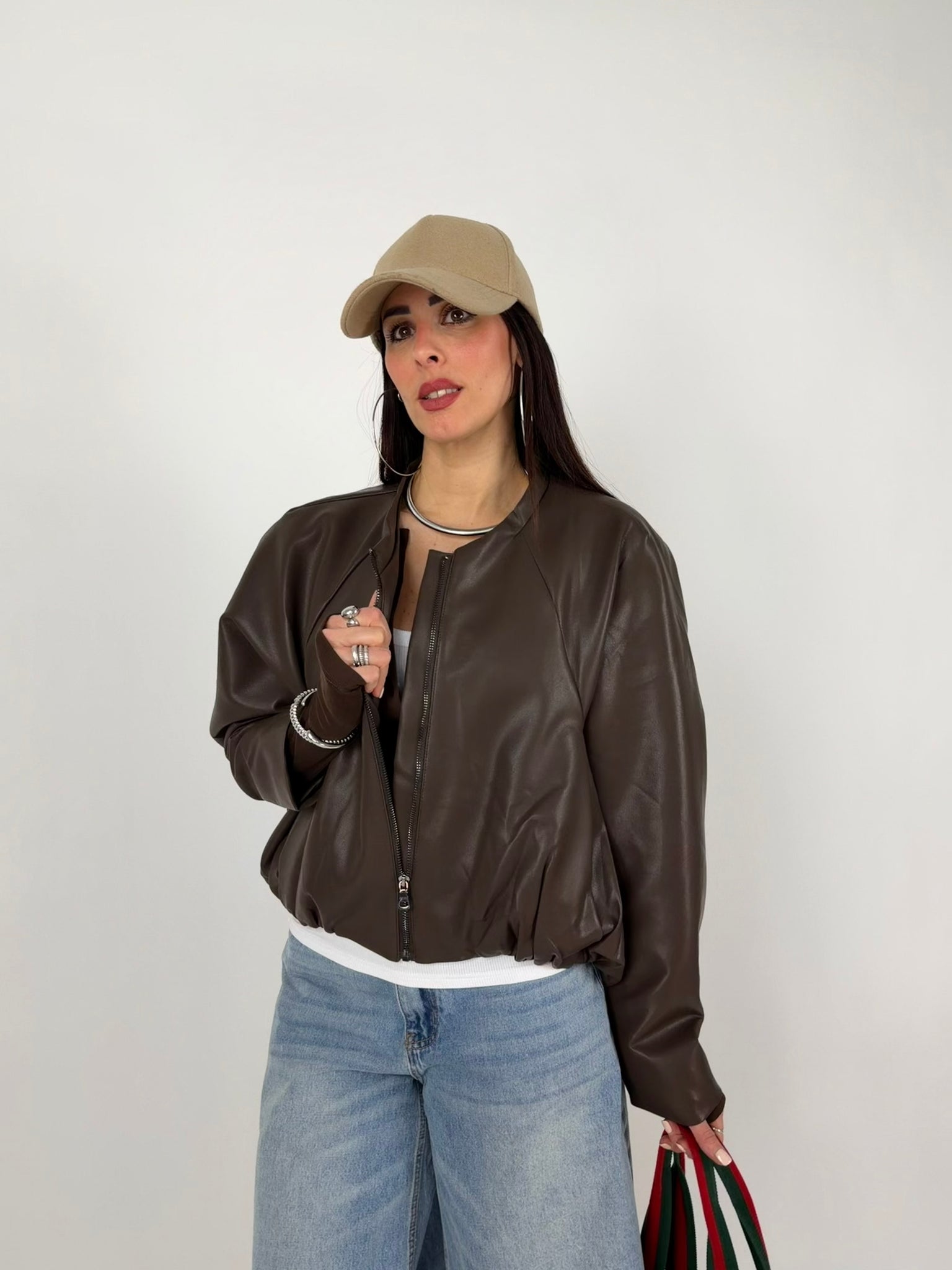 Giubbino con taglio bomber a palloncino in morbida ecopelle, linea pulita con collo alla coreana, chiusura frontale con zip tono su tono, fondo elasticizzato, maniche ampie con polsino morbido, tasche laterali. Fit ampio veste da 38 a 46