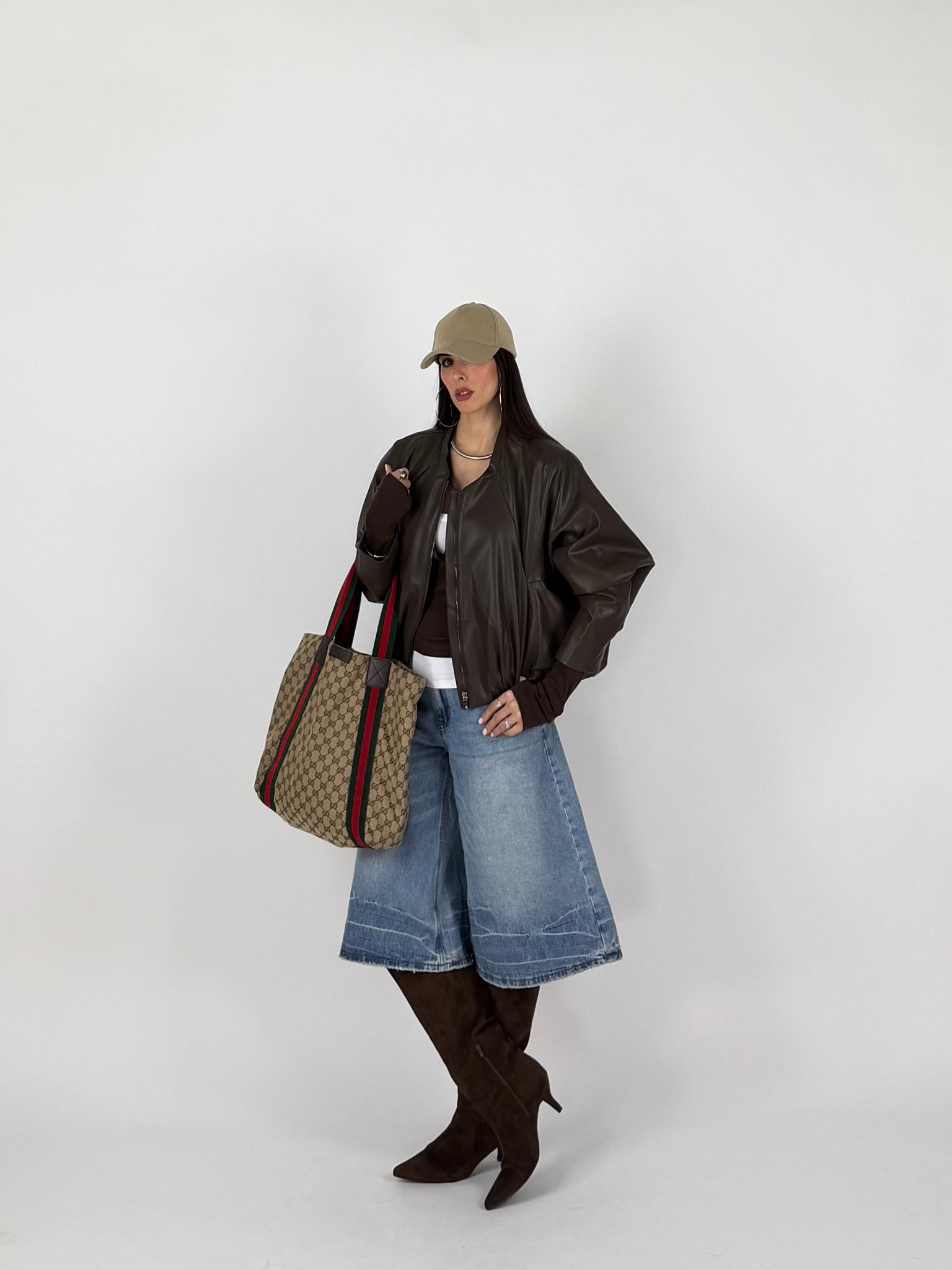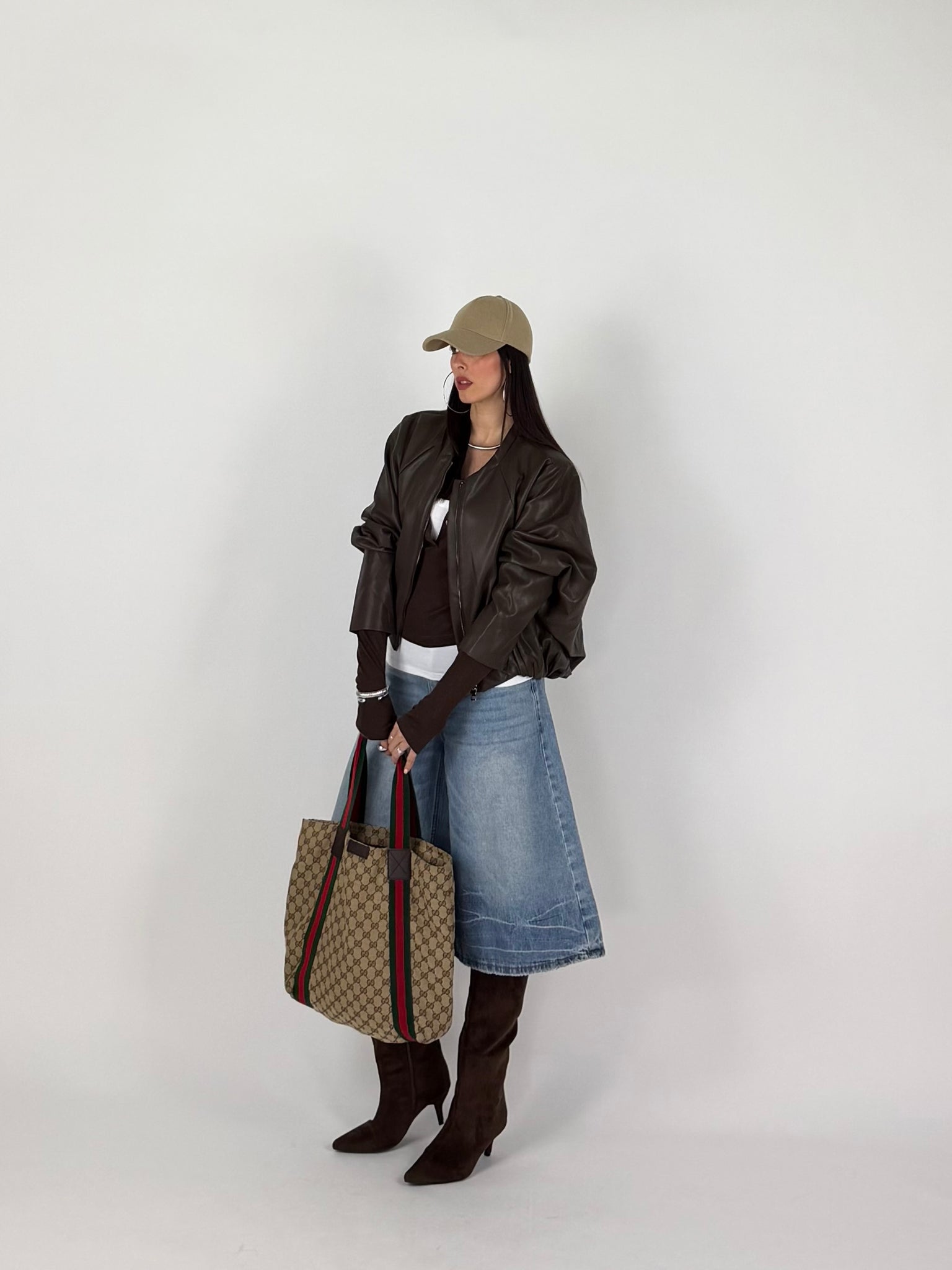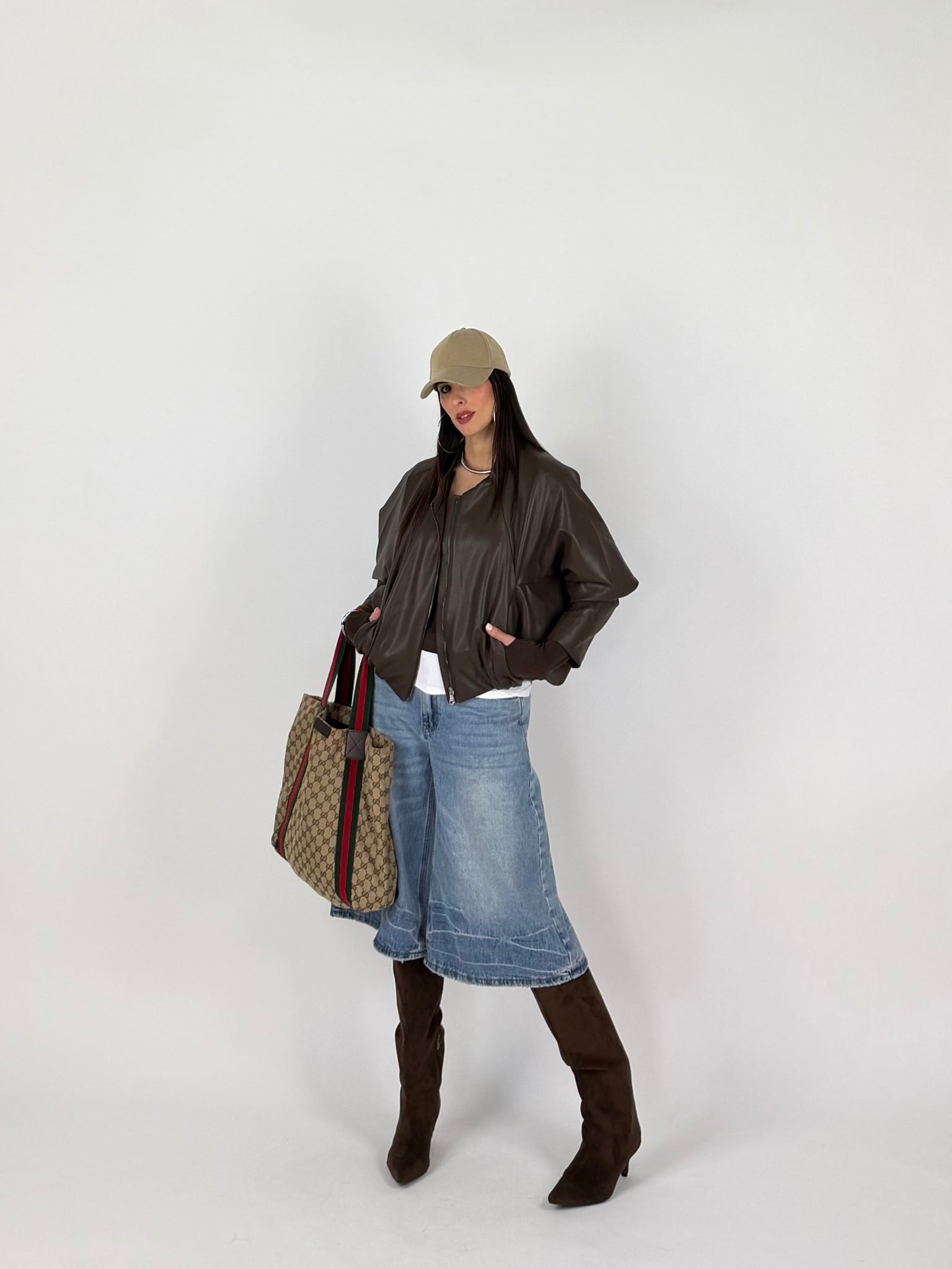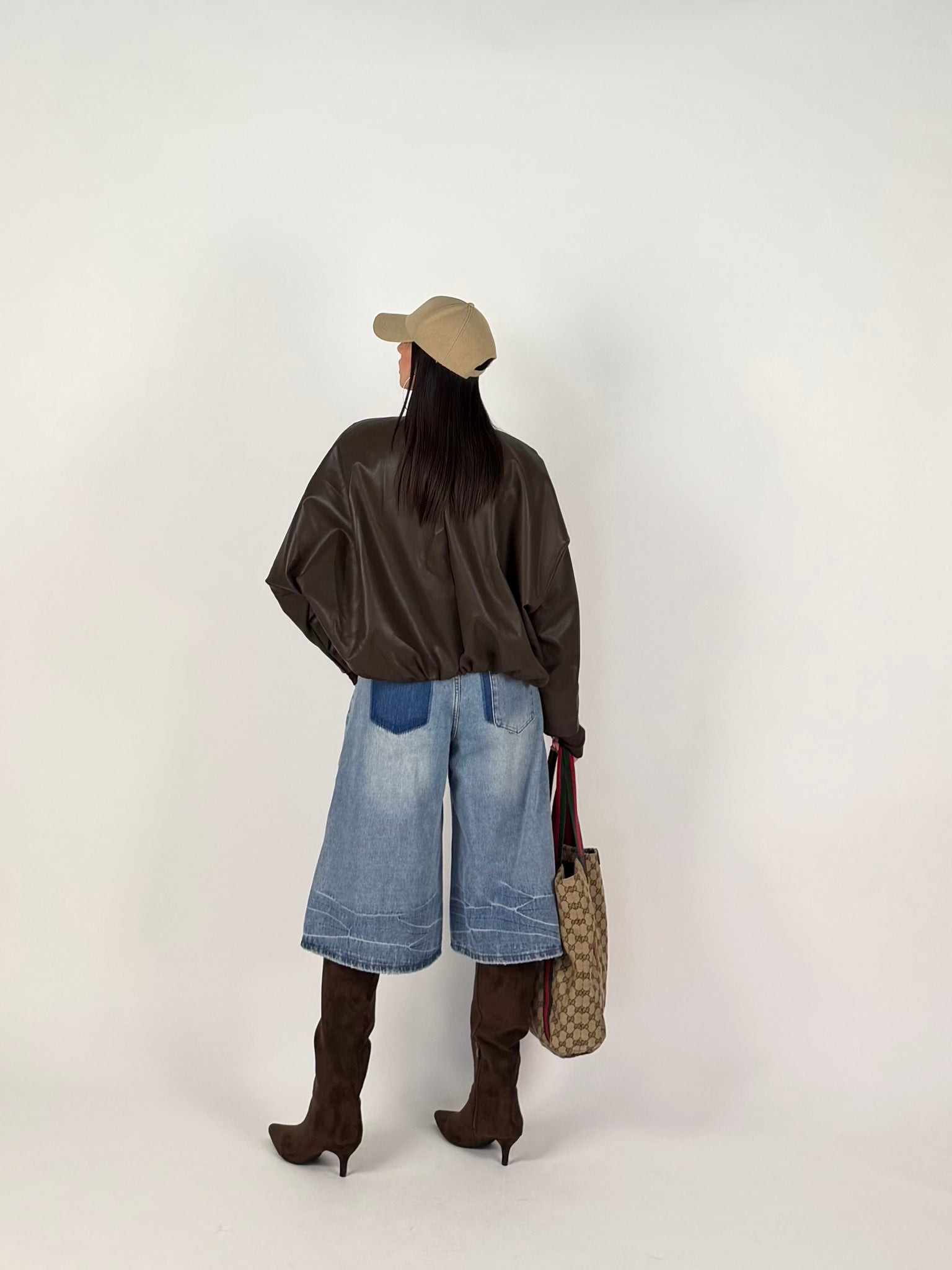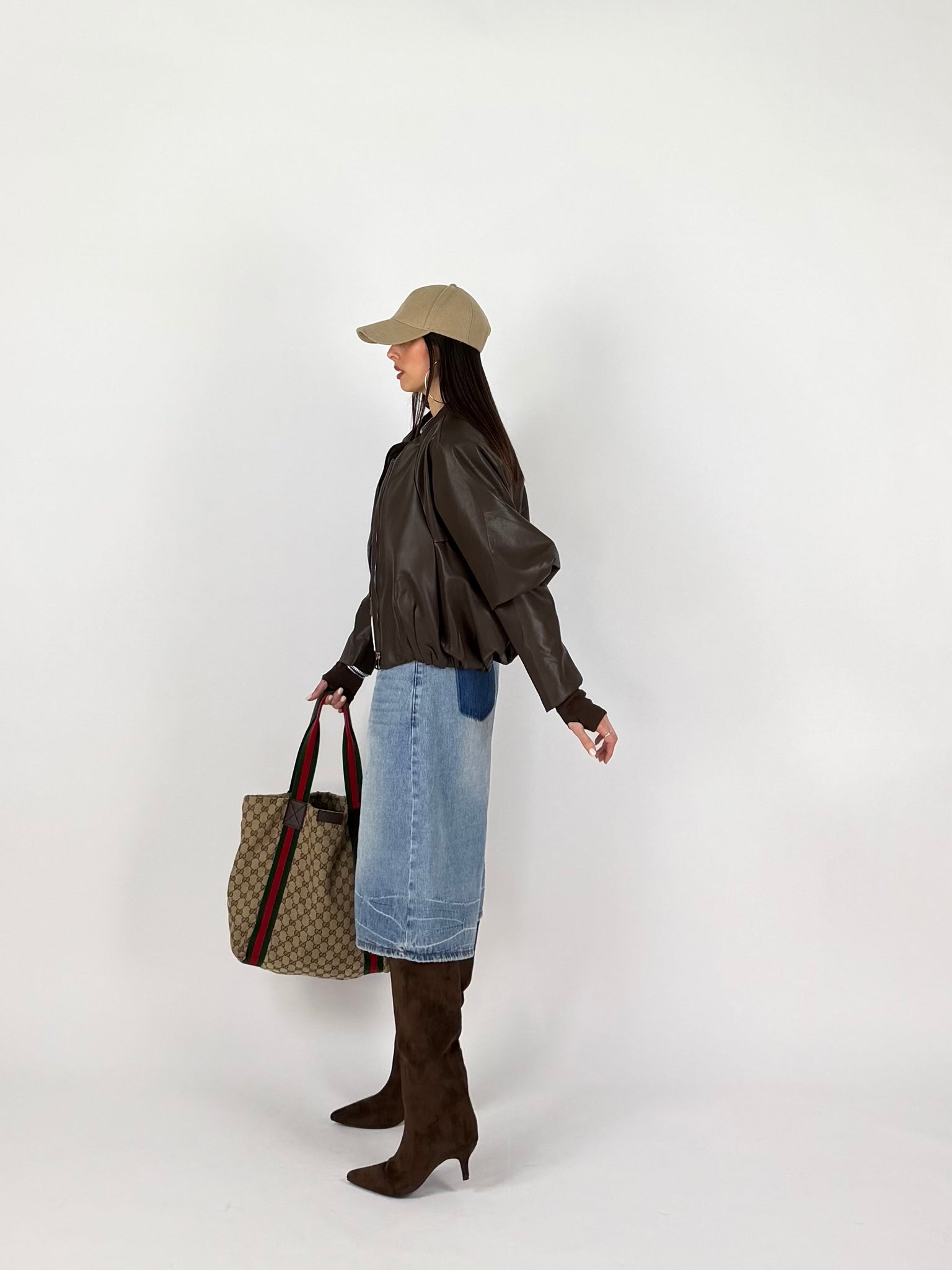 Giubbino con taglio bomber a palloncino in morbida ecopelle, linea pulita con collo alla coreana, chiusura frontale con zip tono su tono, fondo elasticizzato, maniche ampie con polsino morbido, tasche laterali. Fit ampio veste da 38 a 46