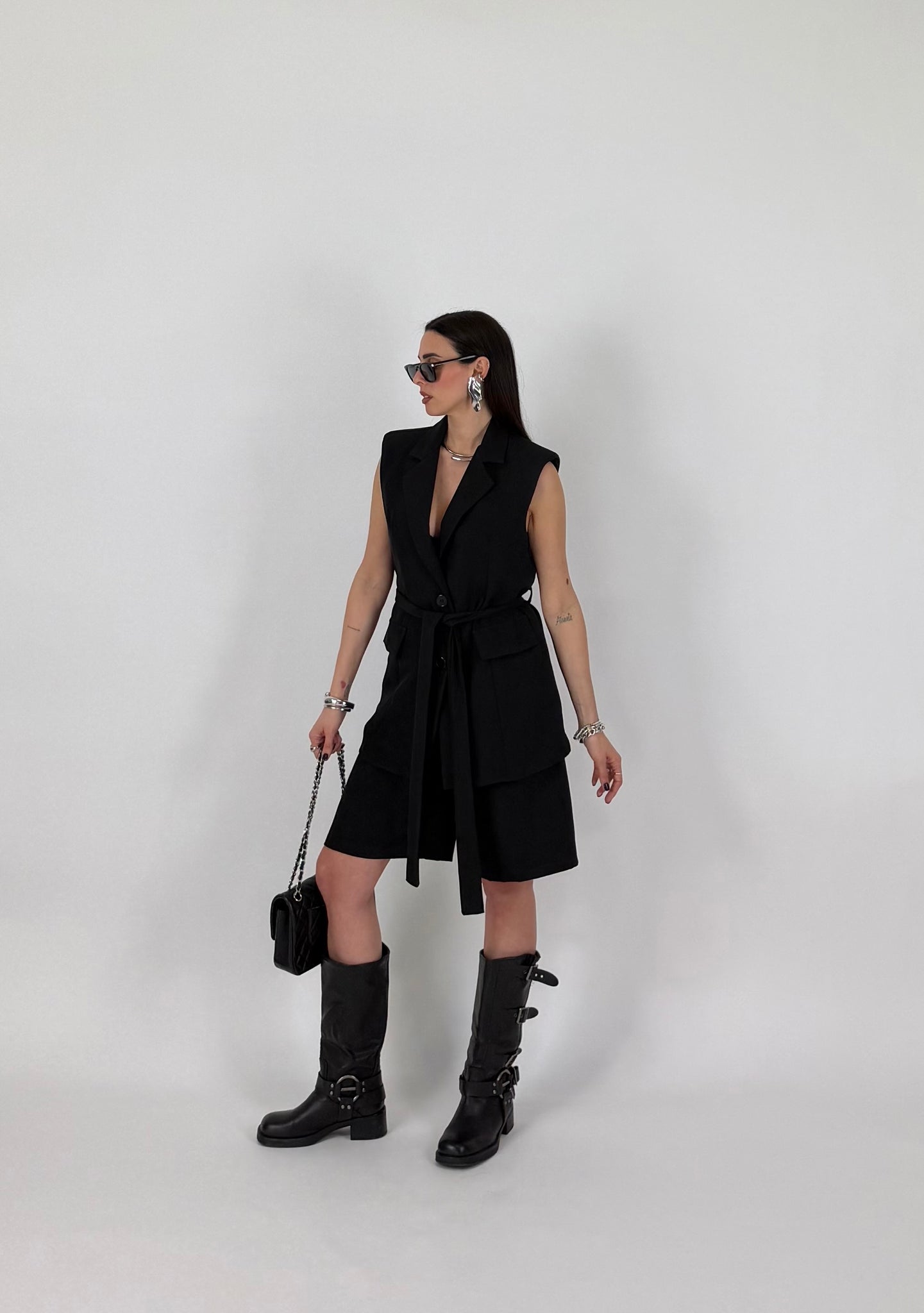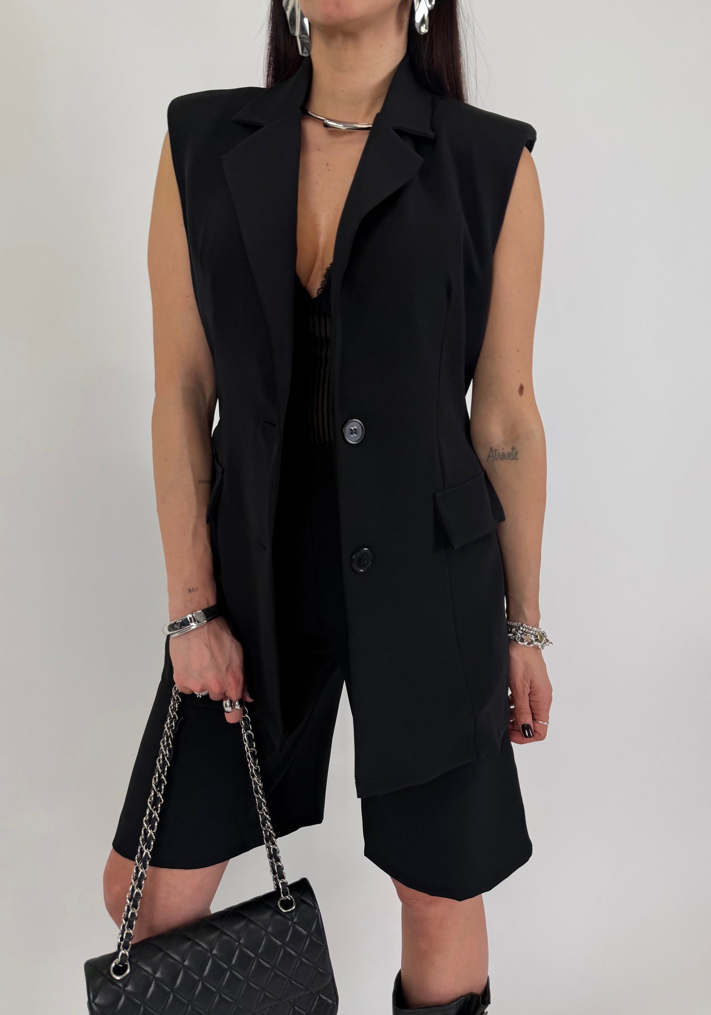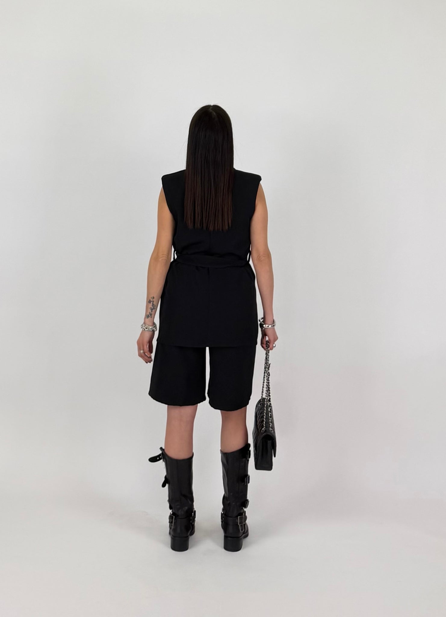Completo: gilet lungo con spallina imbottita e cintura tono su tono , bermuda al ginocchio con tasche laterali e elastico dietro alla schiena. Comfort fit. Taglia unica veste da 38 a 46 Estensione elastico 96 cm