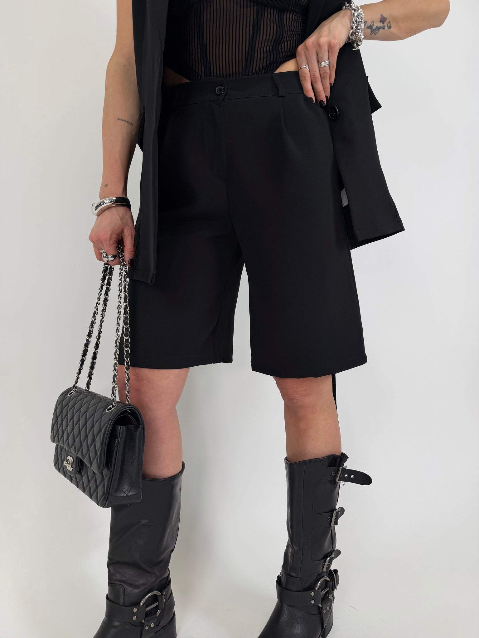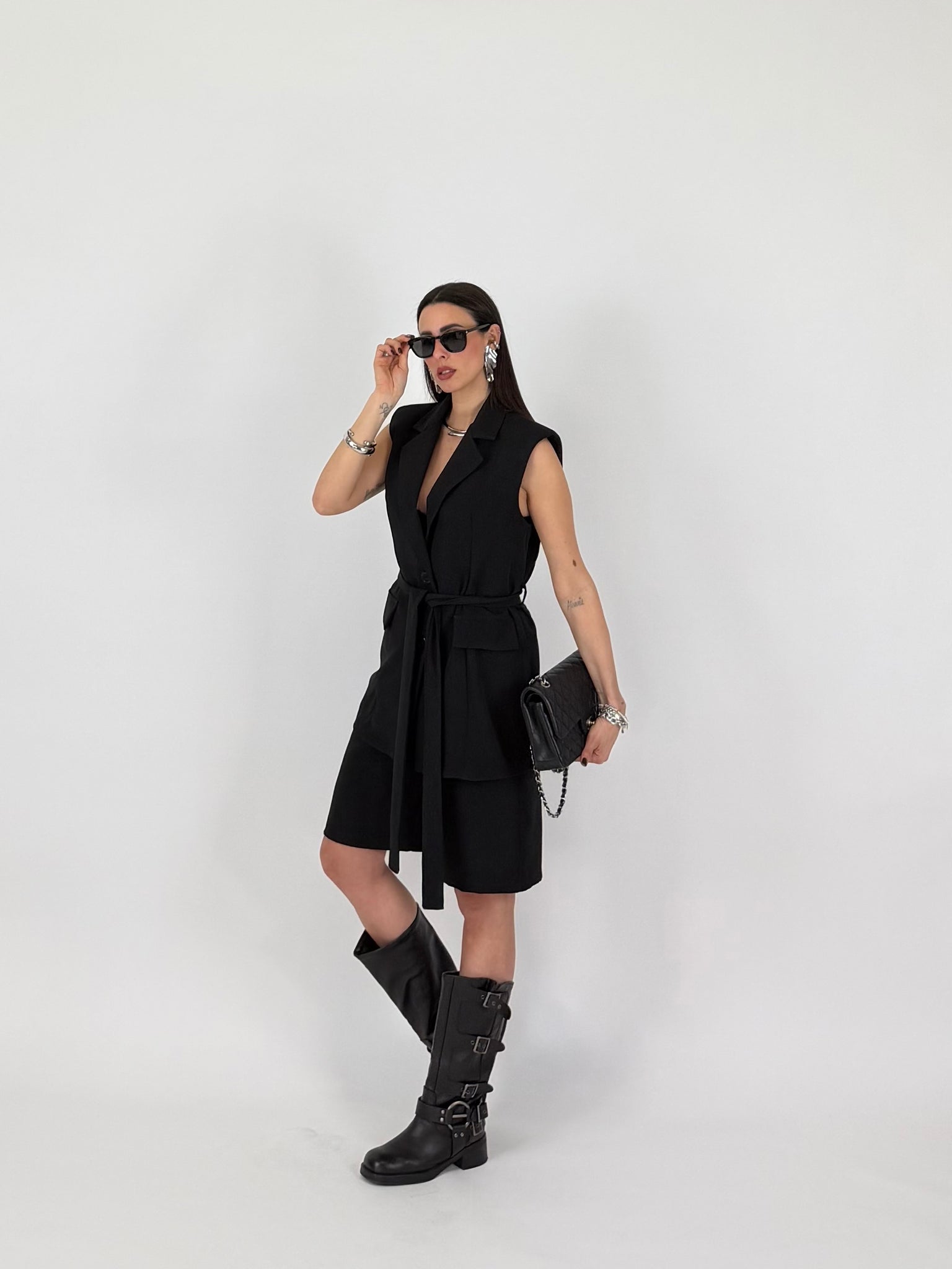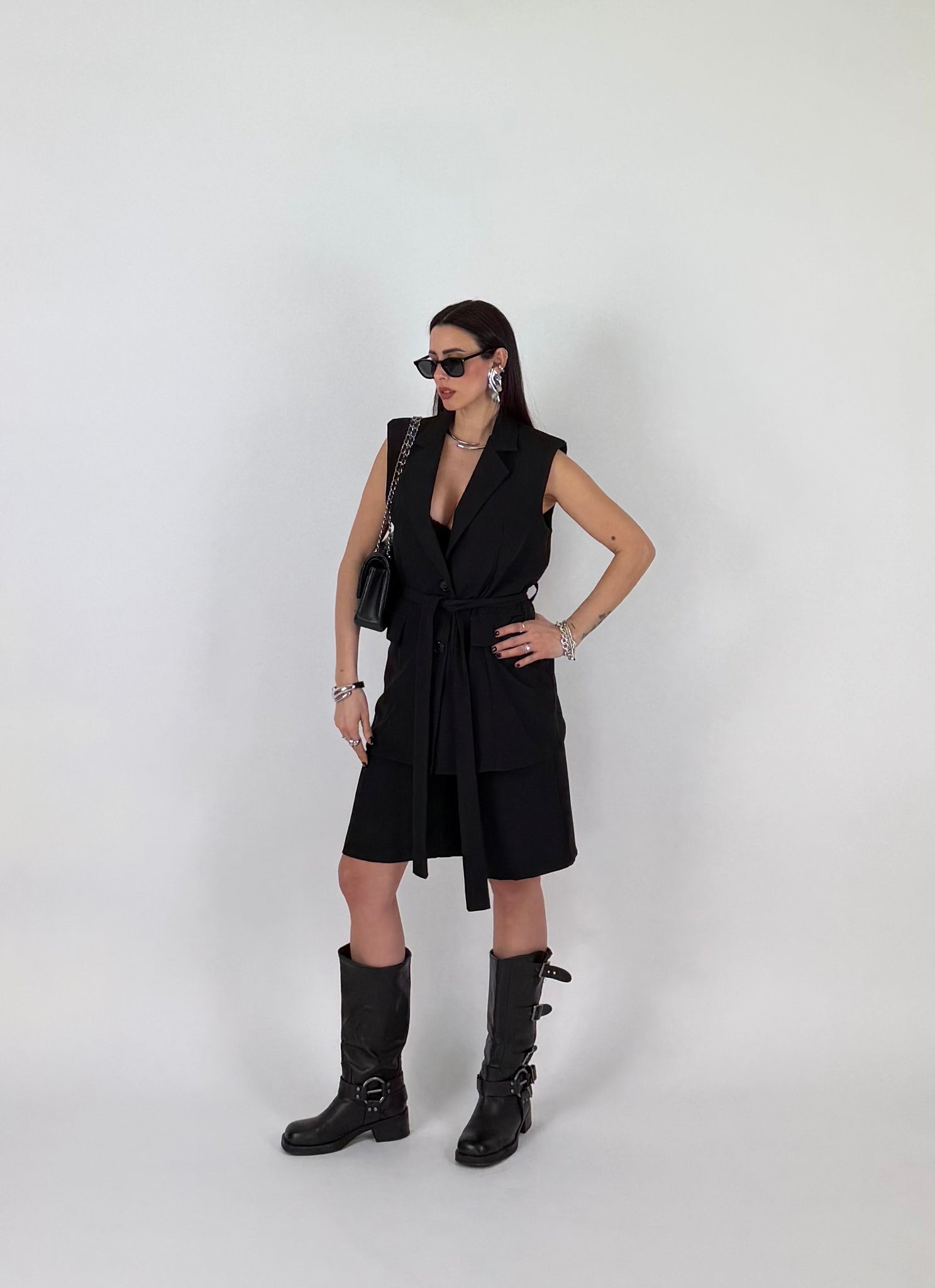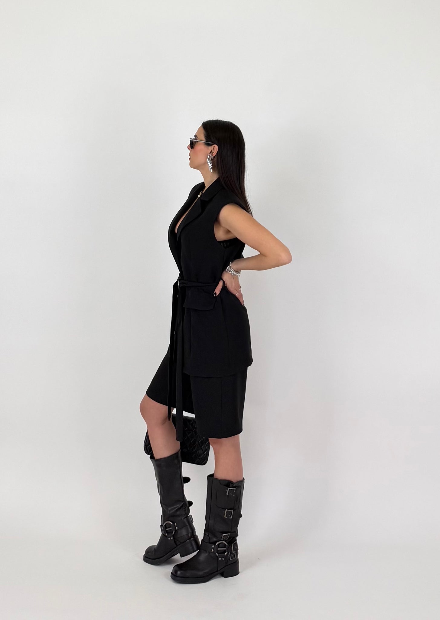 Completo: gilet lungo con spallina imbottita e cintura tono su tono , bermuda al ginocchio con tasche laterali e elastico dietro alla schiena. Comfort fit. Taglia unica veste da 38 a 46 Estensione elastico 96 cm