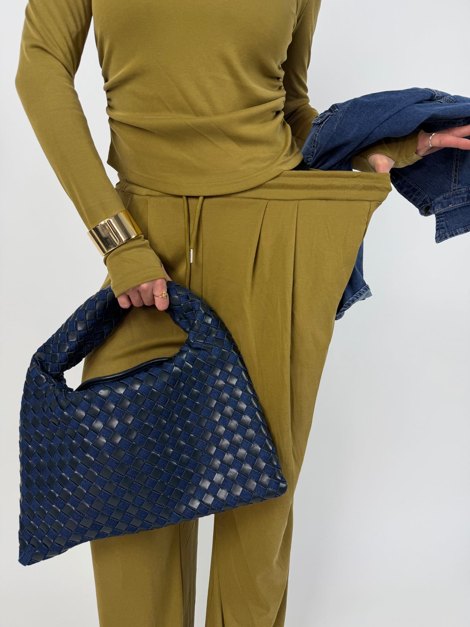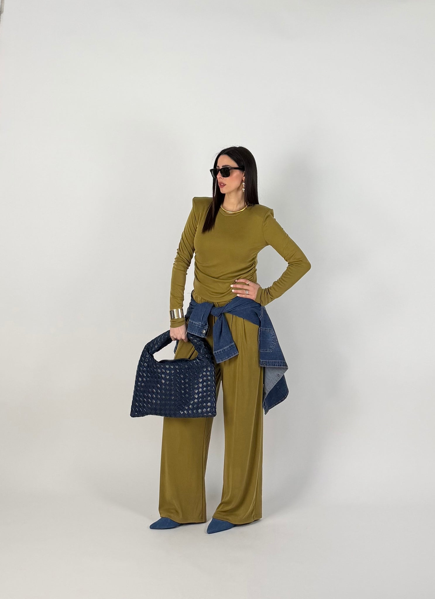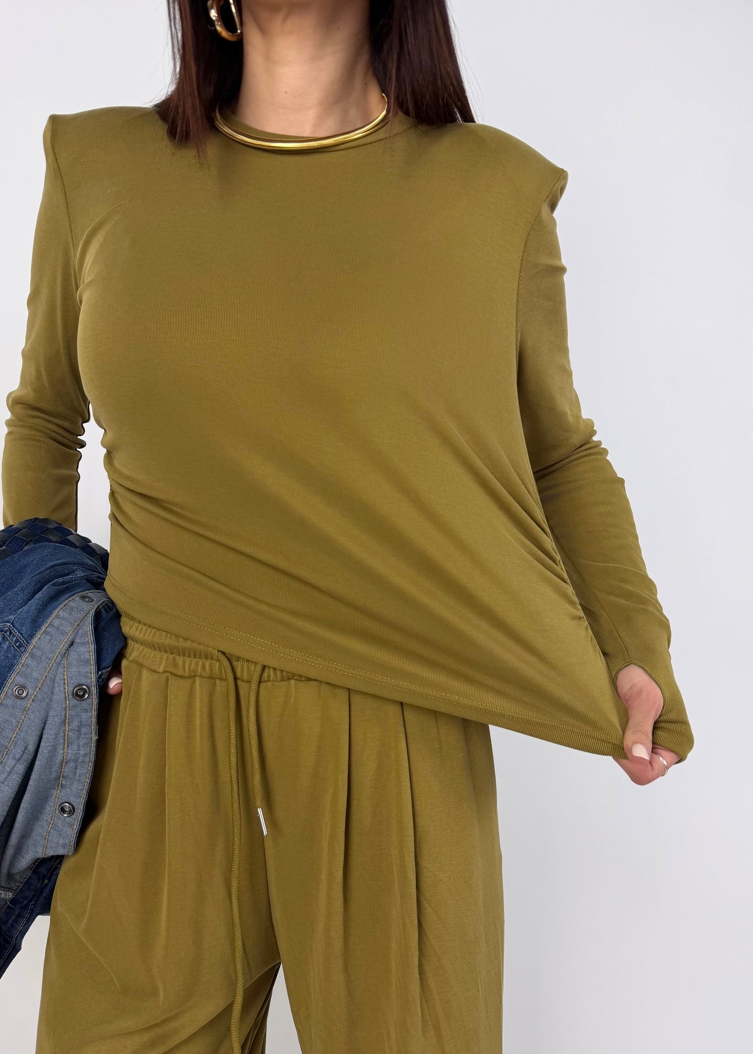 -maglia con spalline strutturate, manica lunga, dettaglio arricciatura laterale. Fit asciutto.