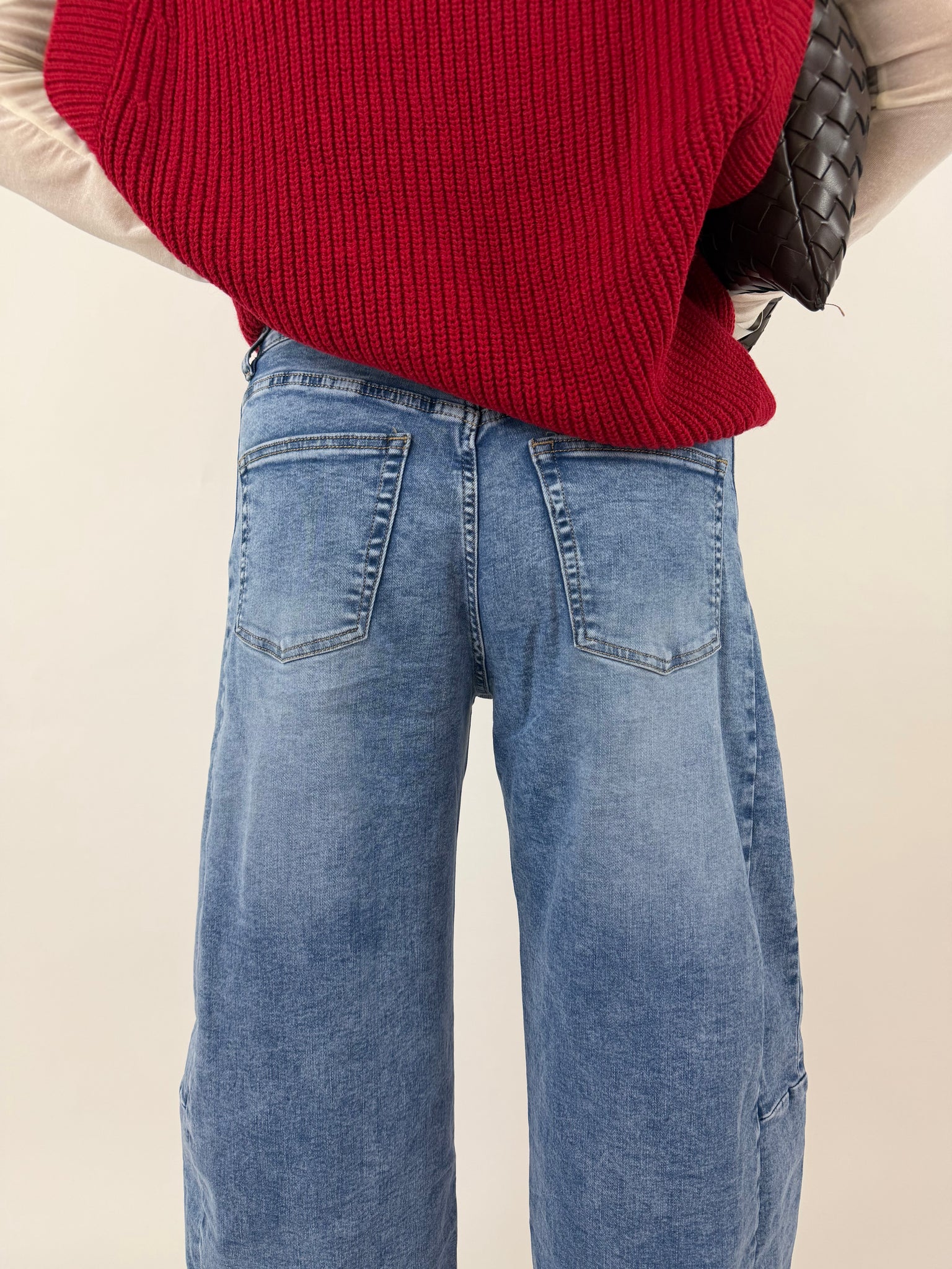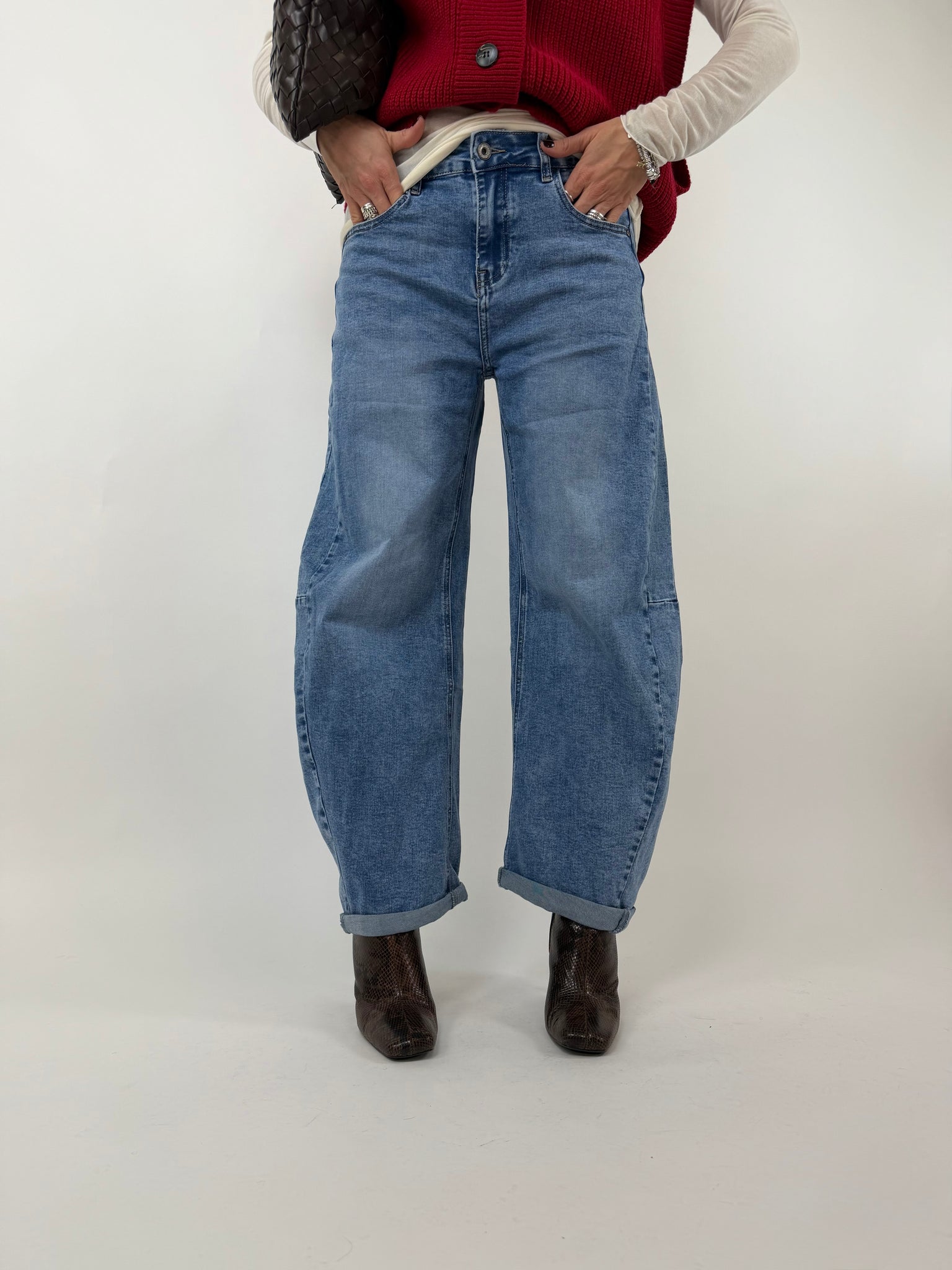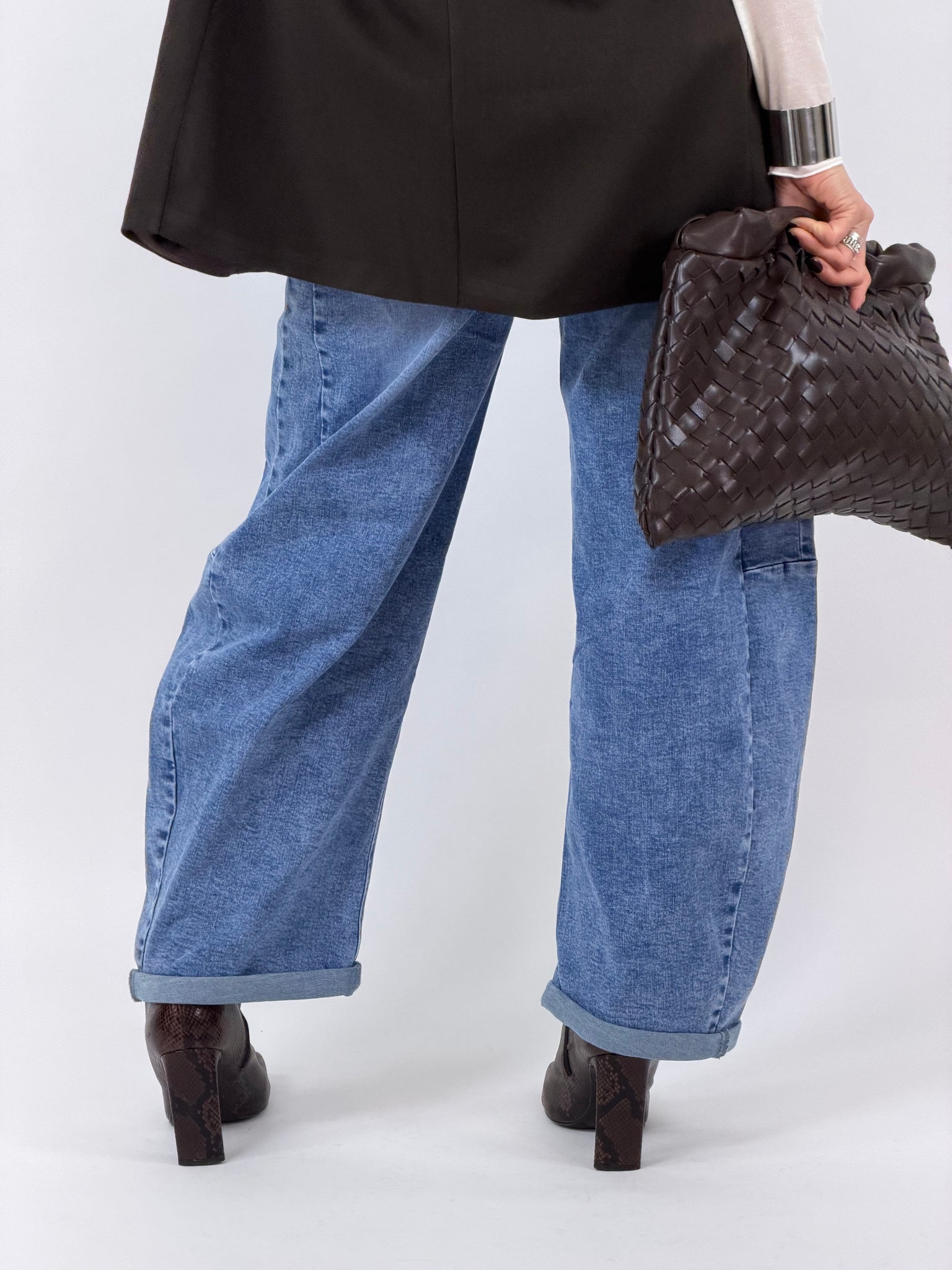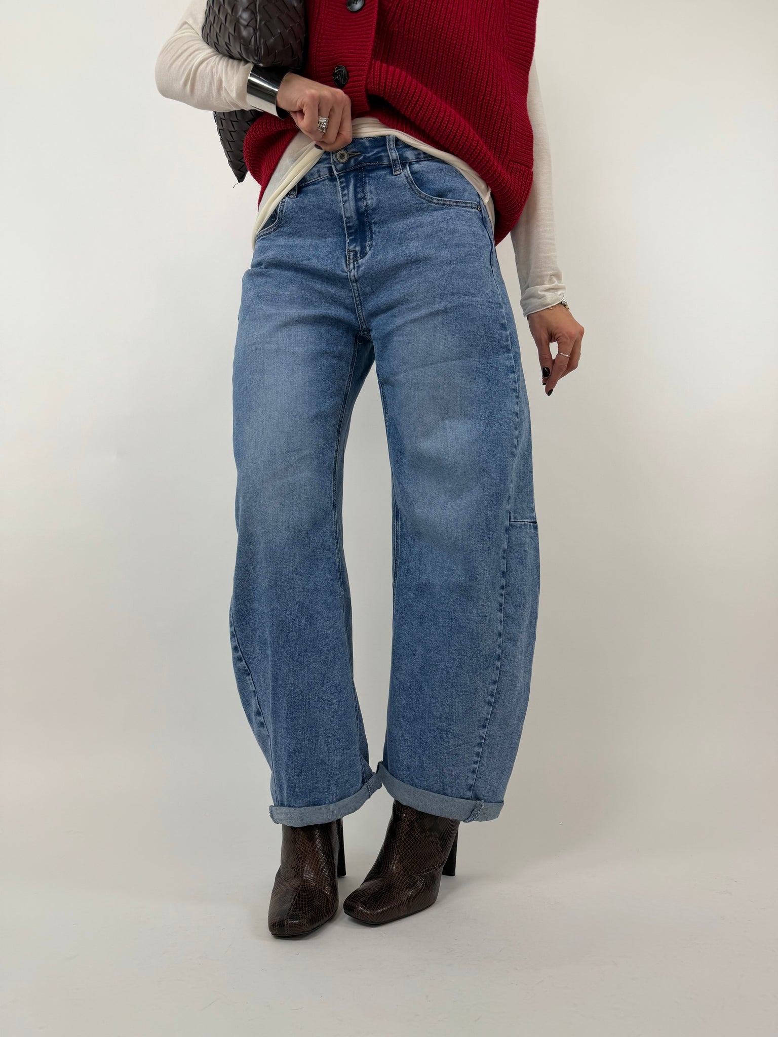 Jeans baggy taglio balloon leggermente stondato, tela morbida e super elasticizzata, dettaglio doppia cucitura laterale obliqua. Xs:38/40 S:40/42 m:42/44 L:44/46 XL: 46/48
