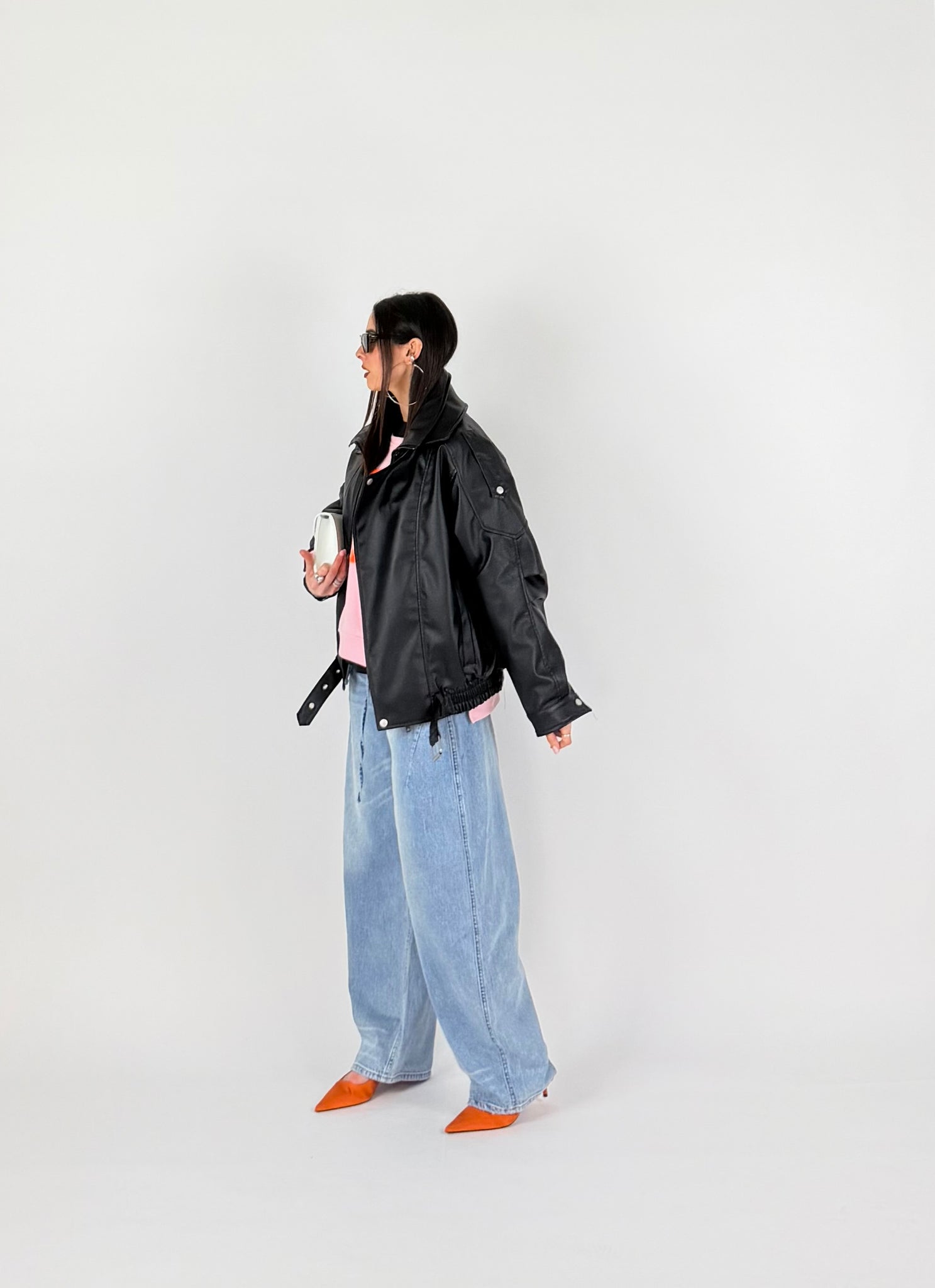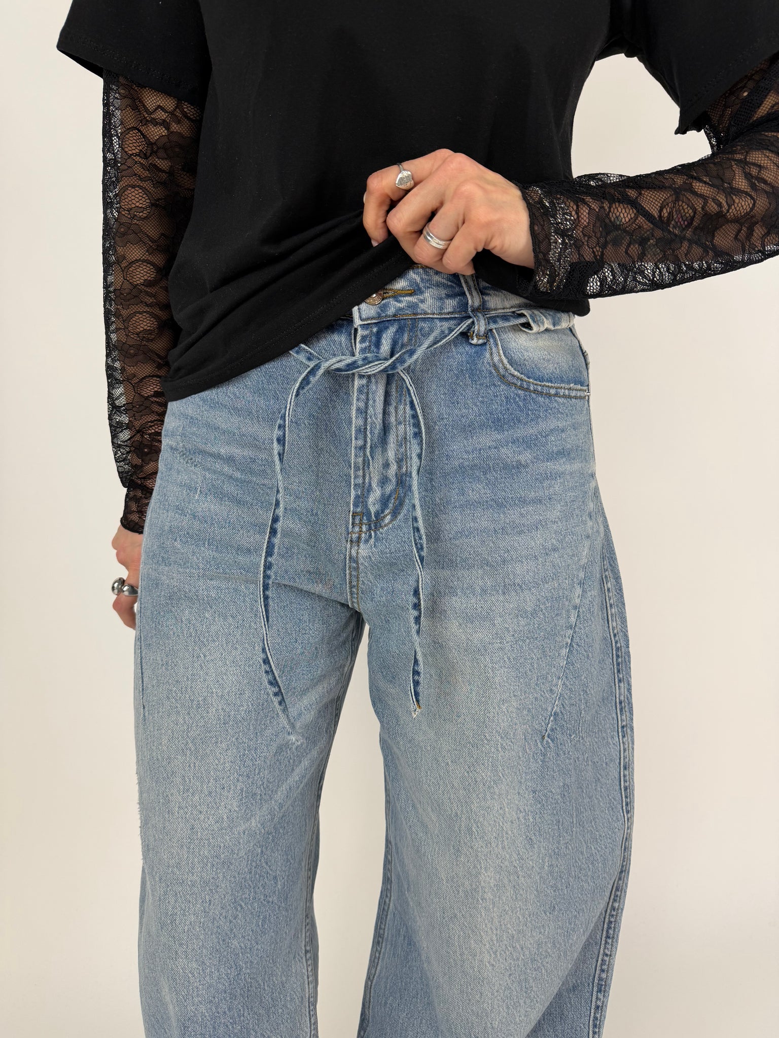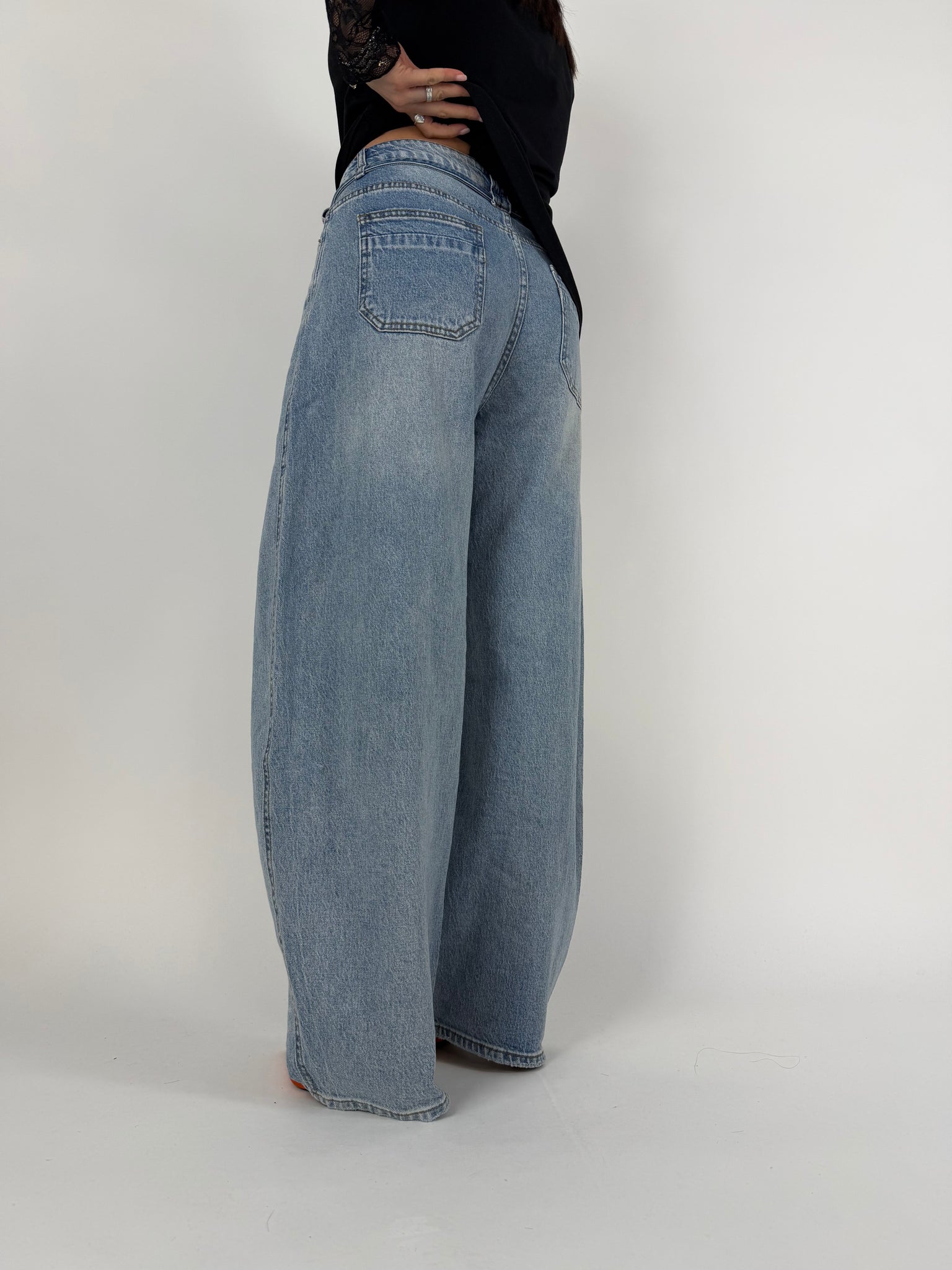 Jeans taglio balloon, tela morbida, lavaggio medio, vita medio alta, dettaglio coulisse tono su tono. S:40-42 M:42-44 L:44-46