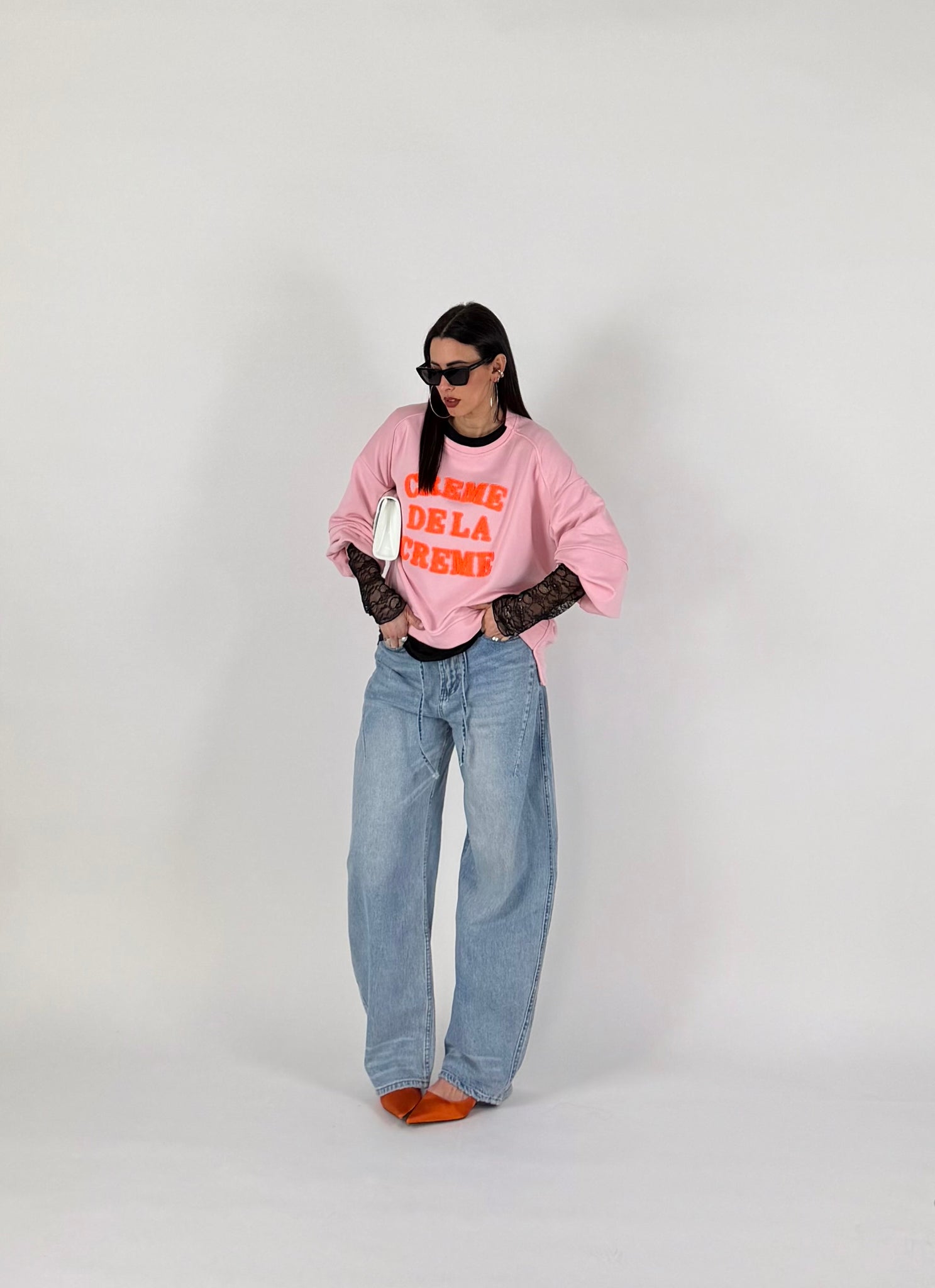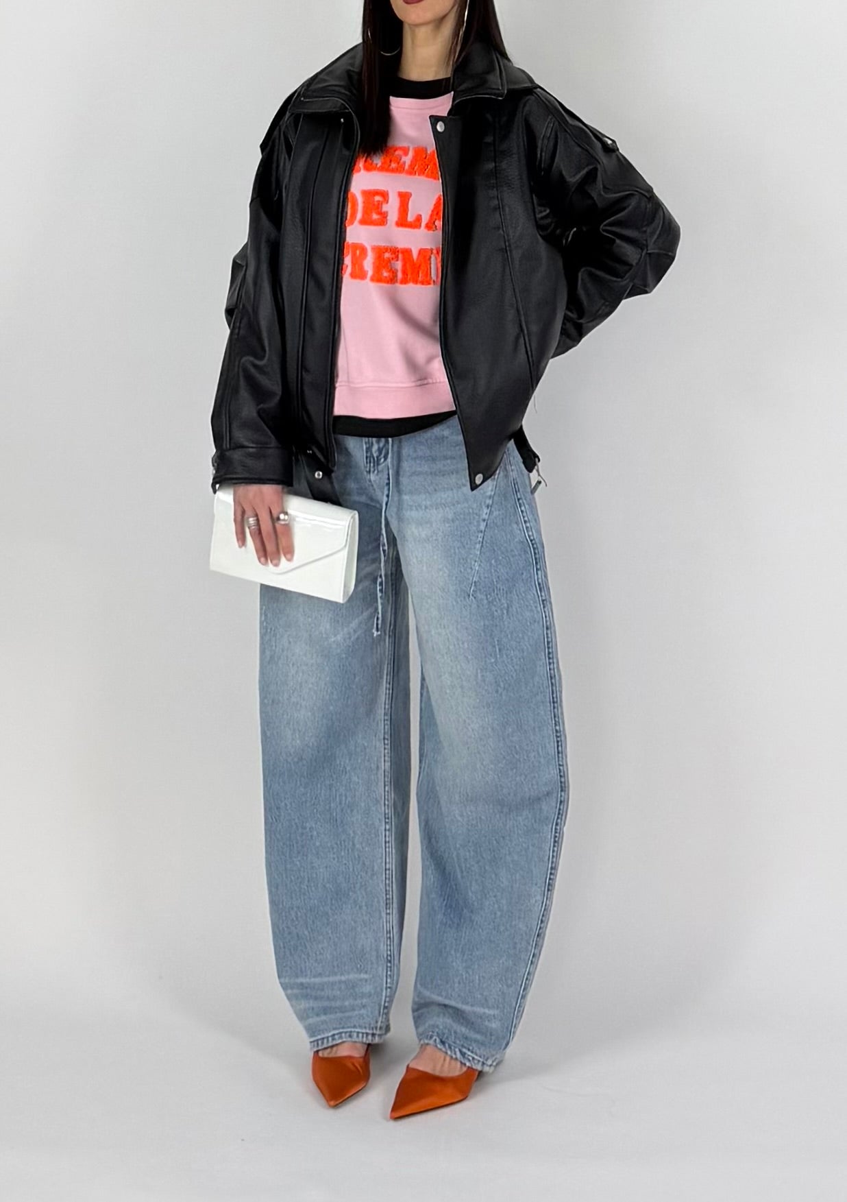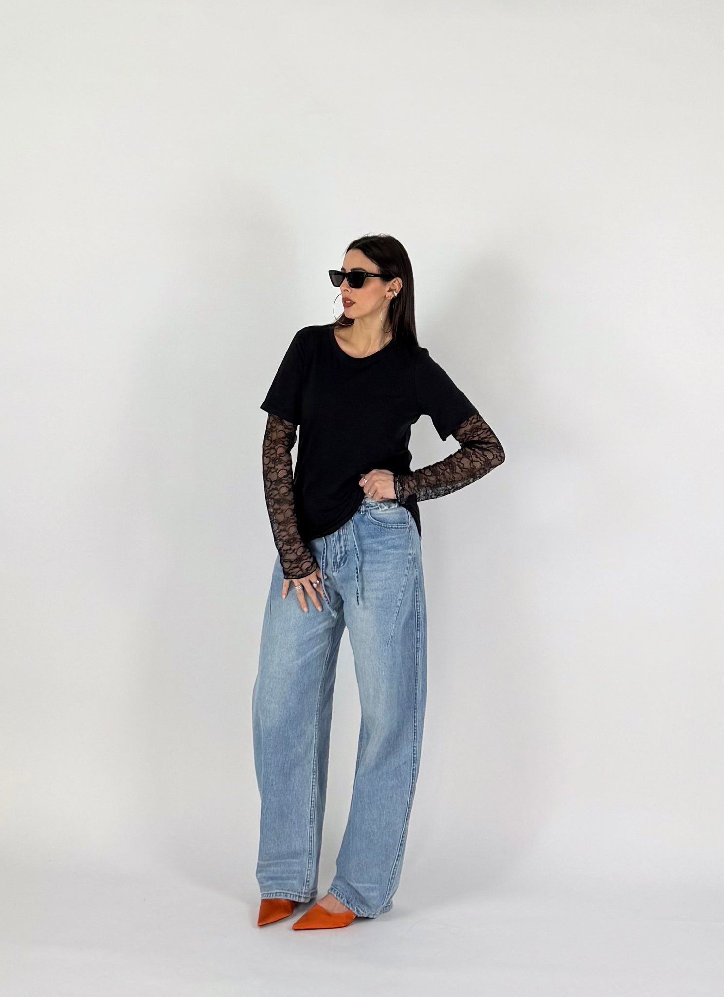 Jeans taglio balloon, tela morbida, lavaggio medio, vita medio alta, dettaglio coulisse tono su tono. S:40-42 M:42-44 L:44-46