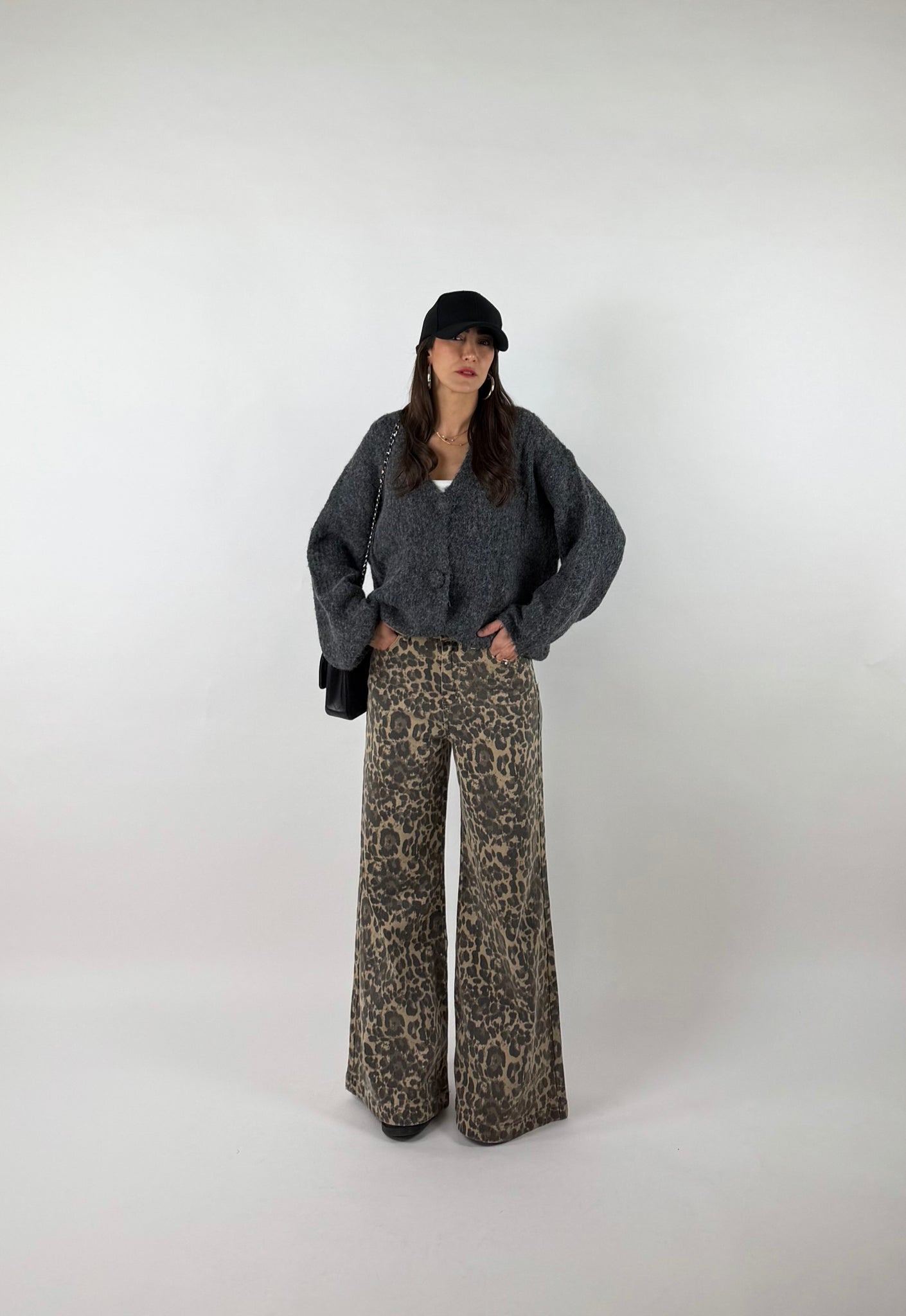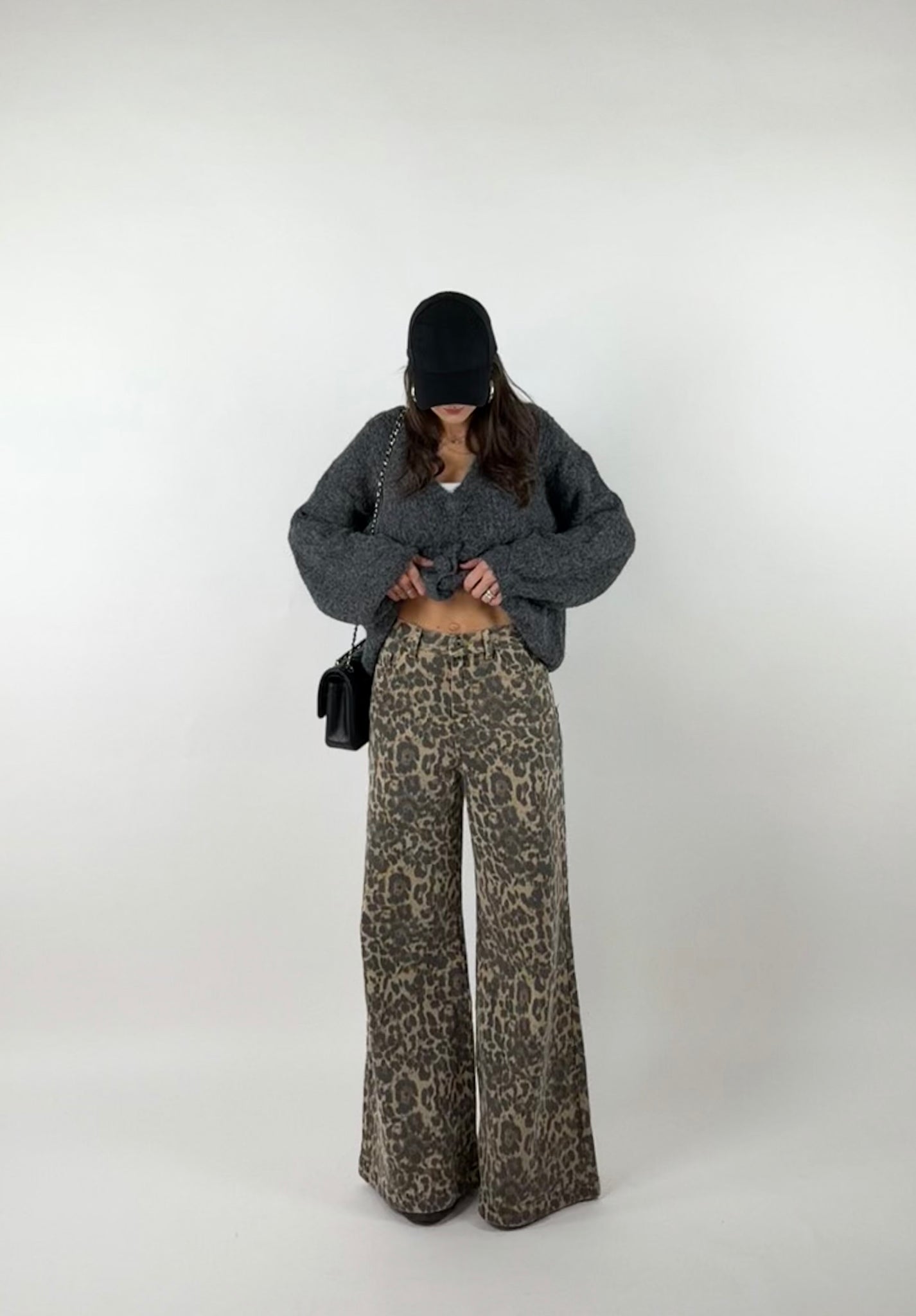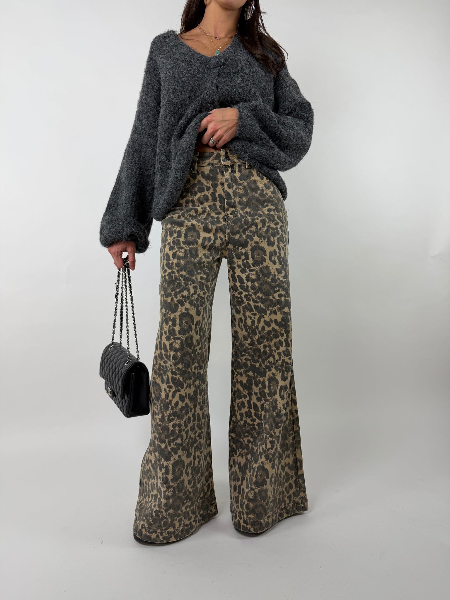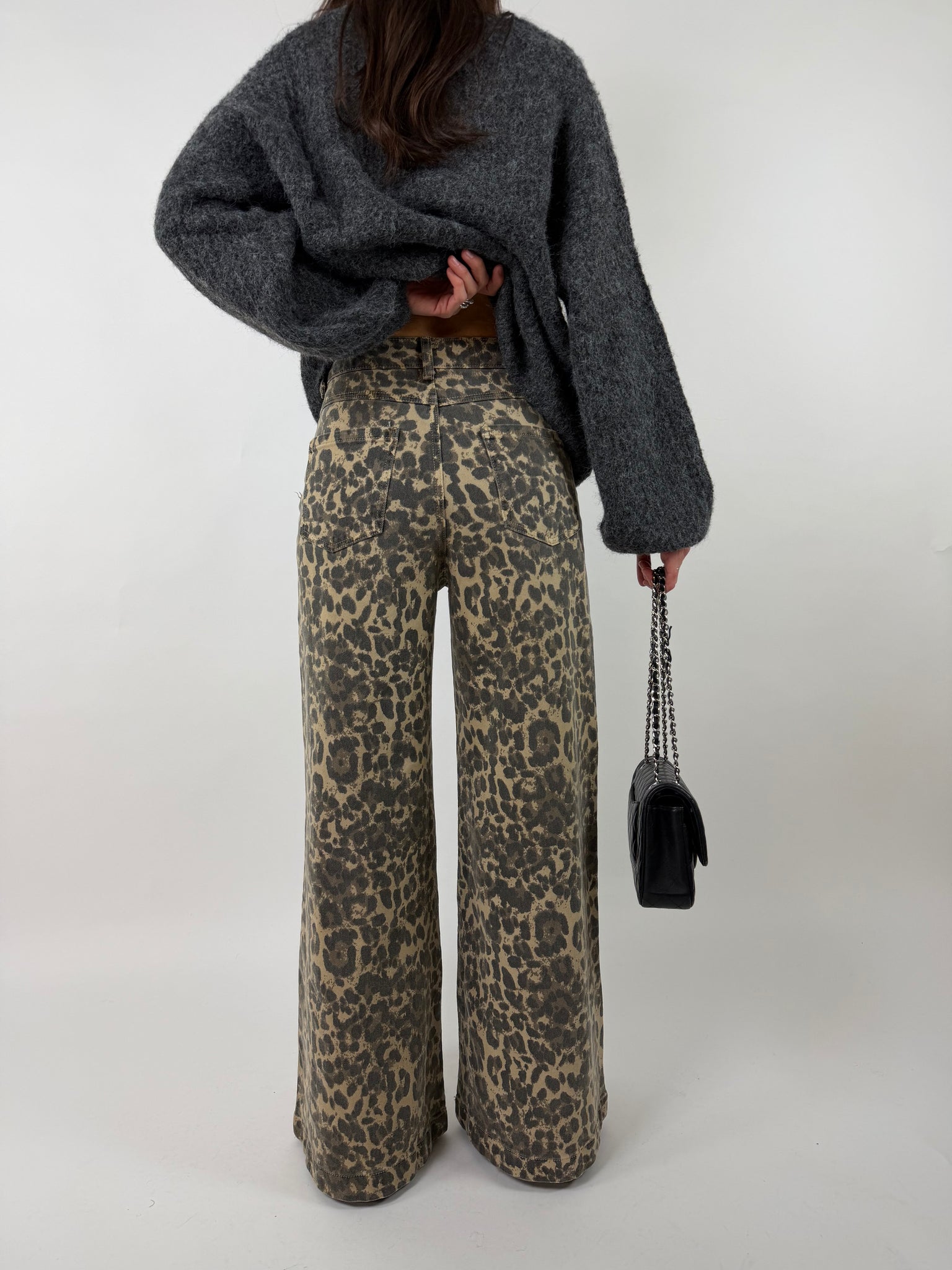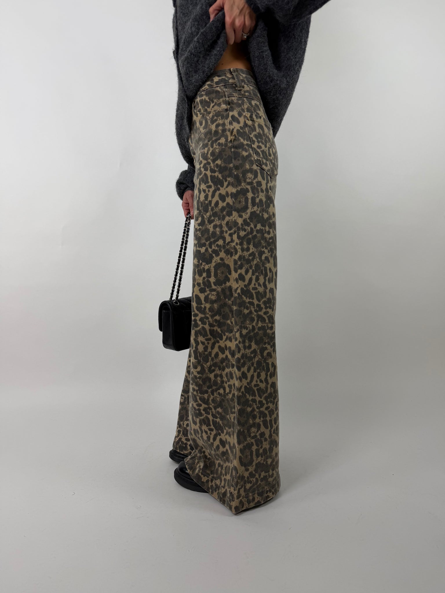 Jeans a palazzo leo print, vita alta, tessuto elasticizzato. S: 38/40 M: 42/44 L : 44/46