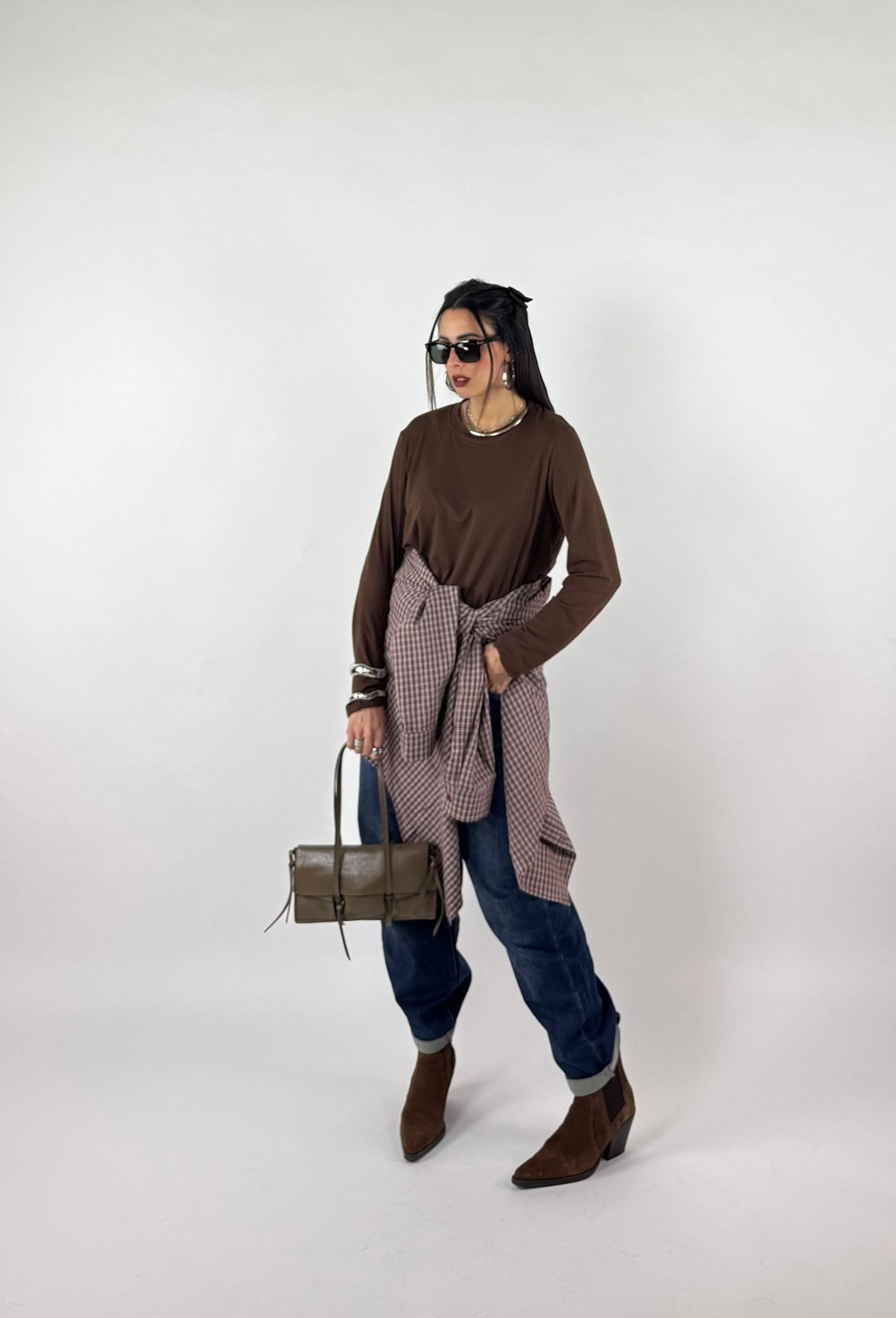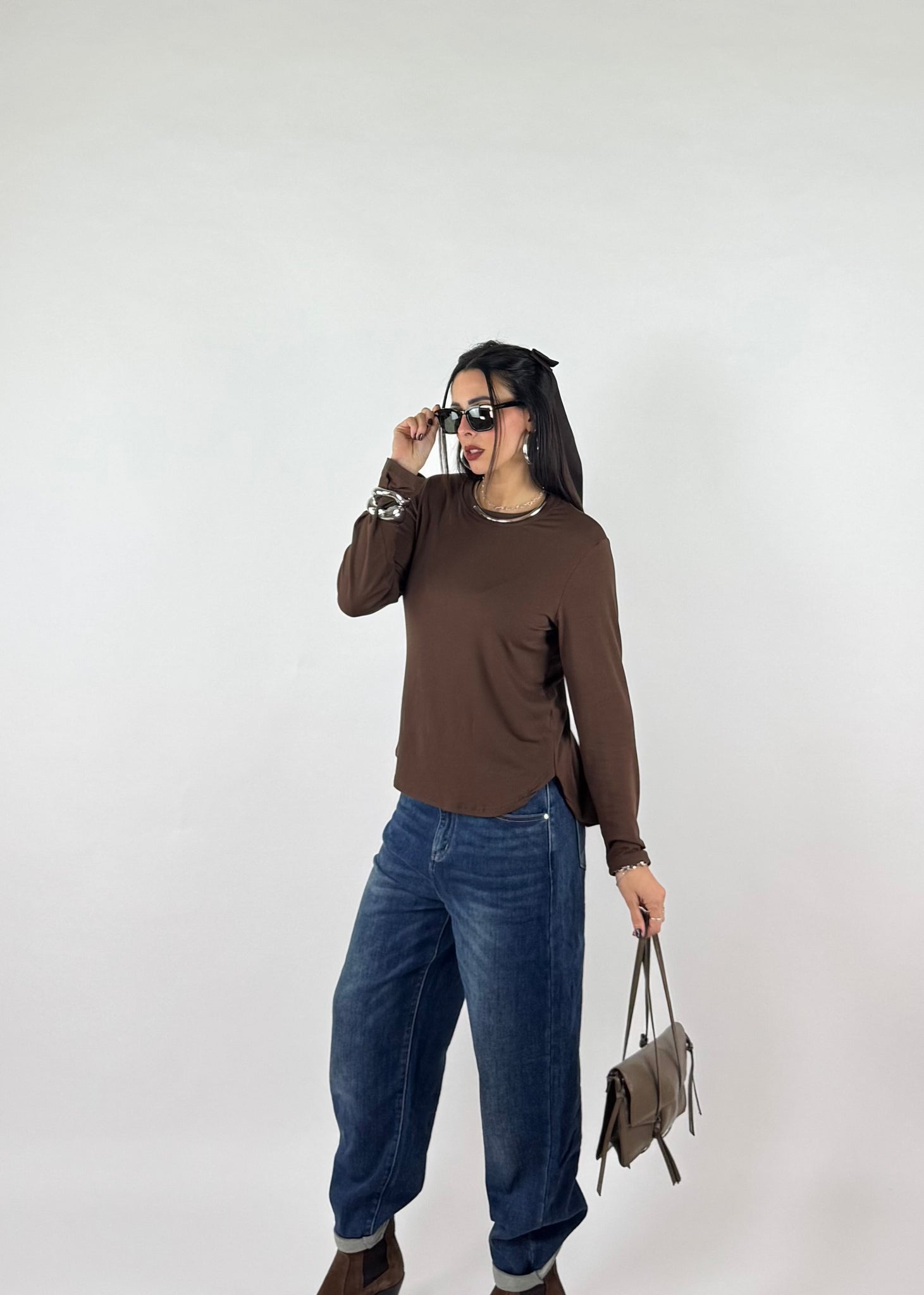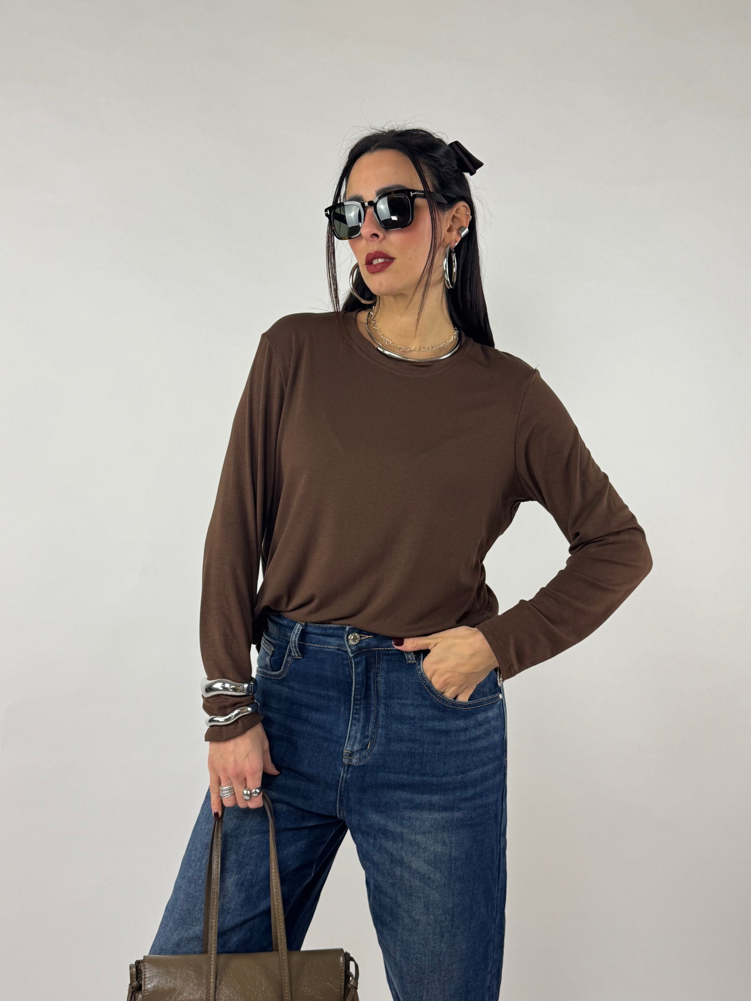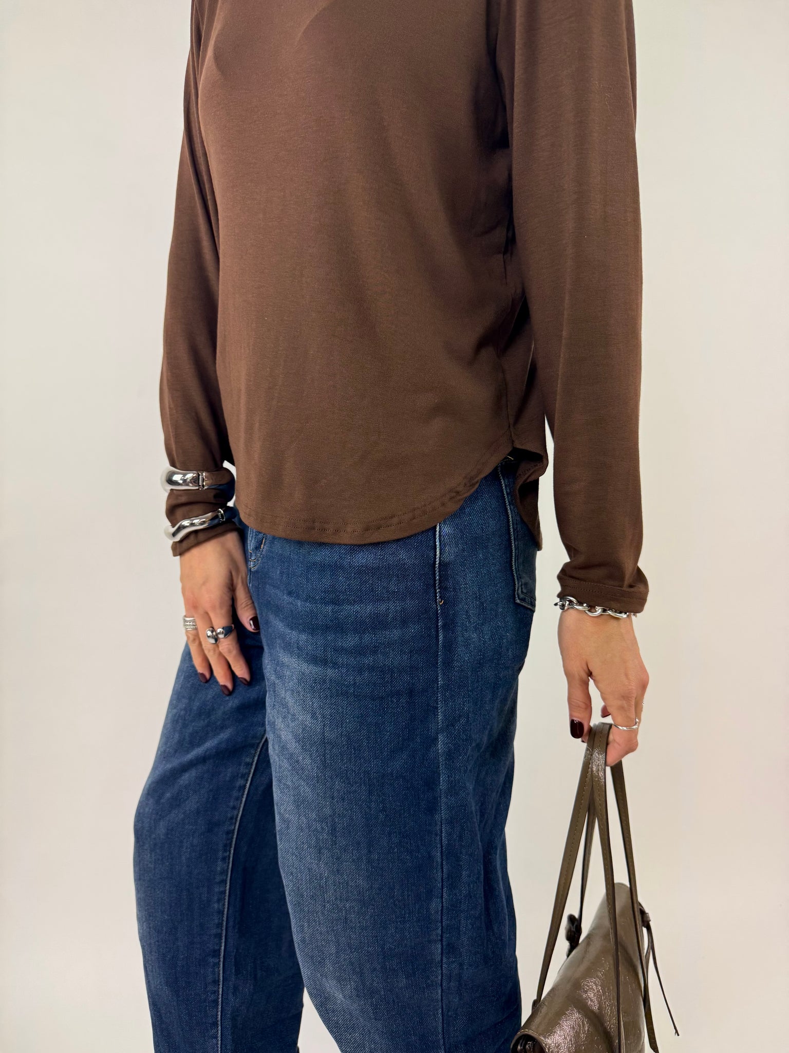 Maglia manica lunga in morbido jersey, girocollo, fit morbido, dettaglio spacchetto laterale, più lunga dietro. Taglia unica veste da 38 a 46