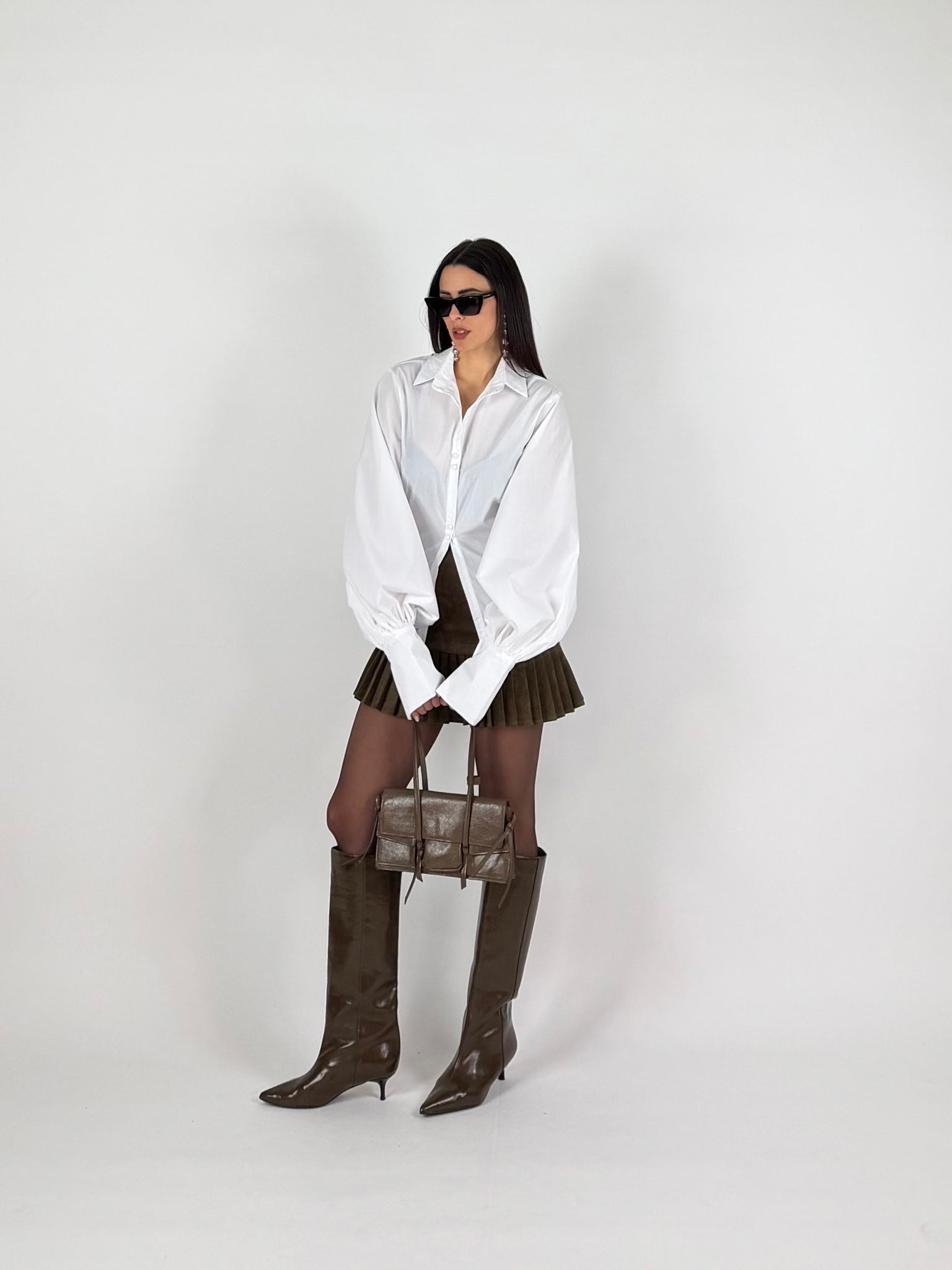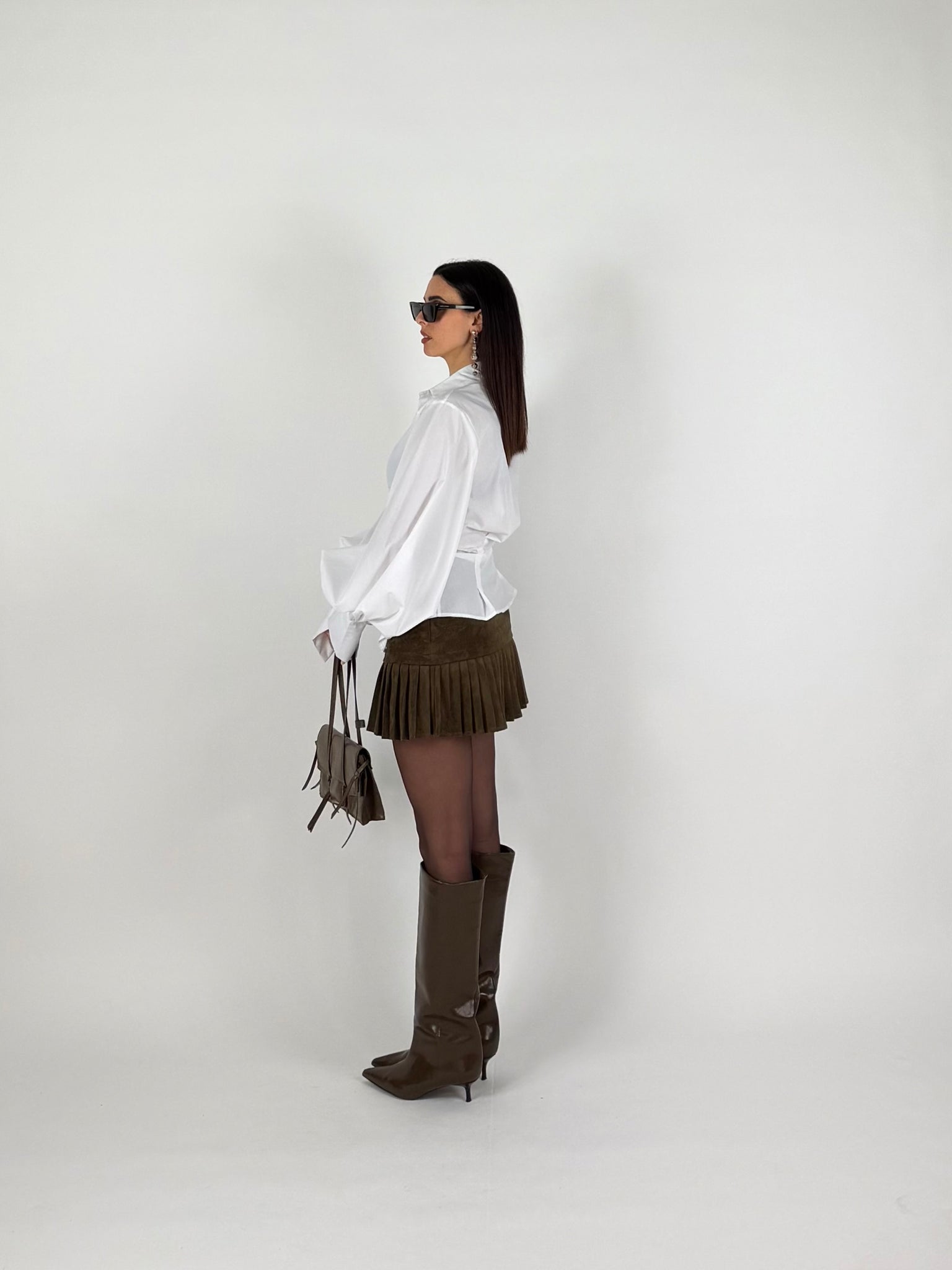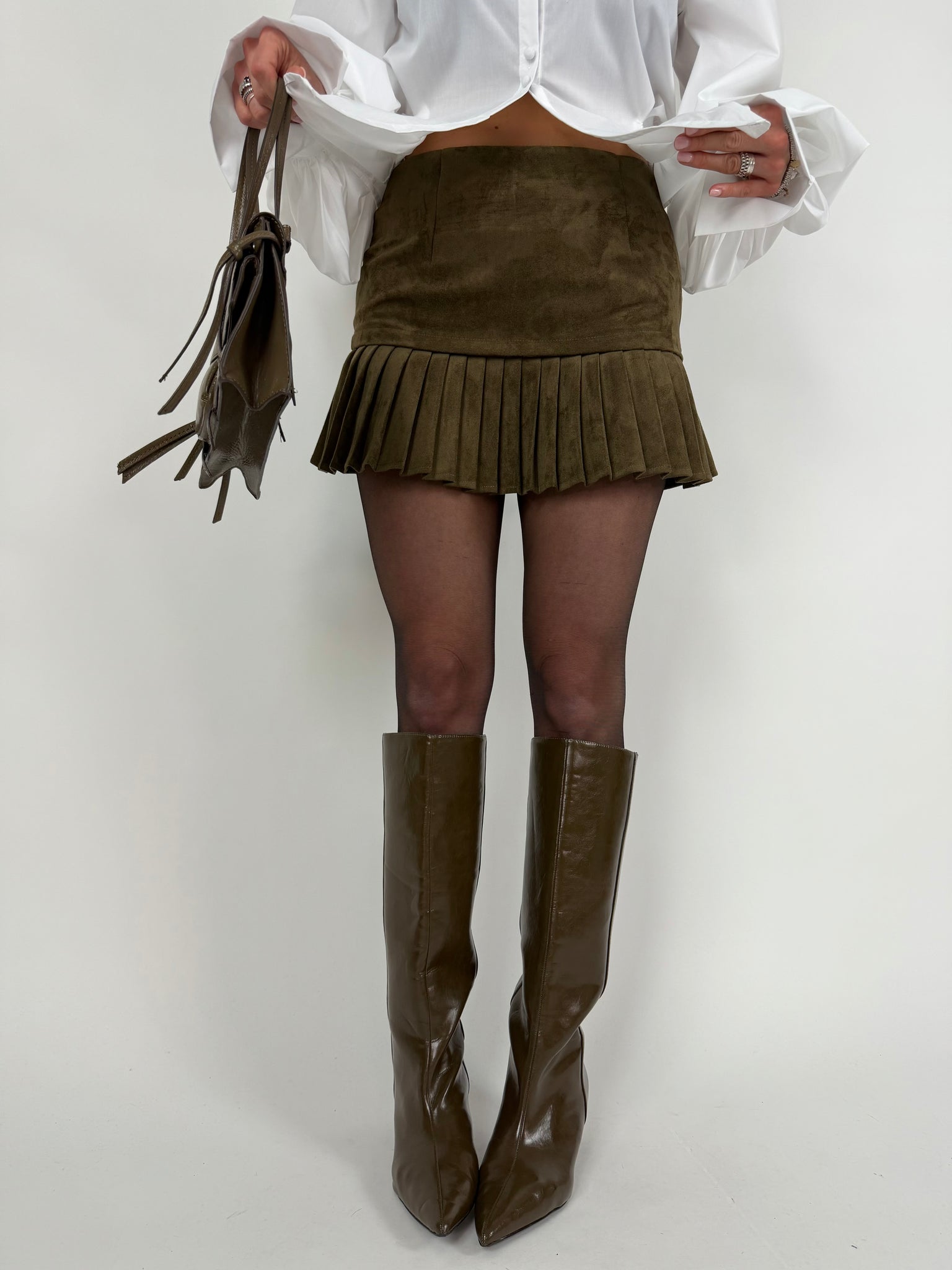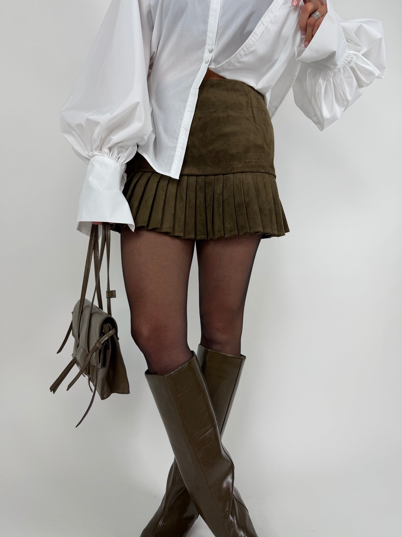 Gonna in tessuto effetto suede, morbido e vellutato al tatto. Il plissé regolare dona movimento ed eleganza, mentre la vita strutturata valorizza la silhouette. Interno foderato per un maggiore comfort e pantaloncino interno. Taglia unica veste da 38 a 44. Cm vita 80