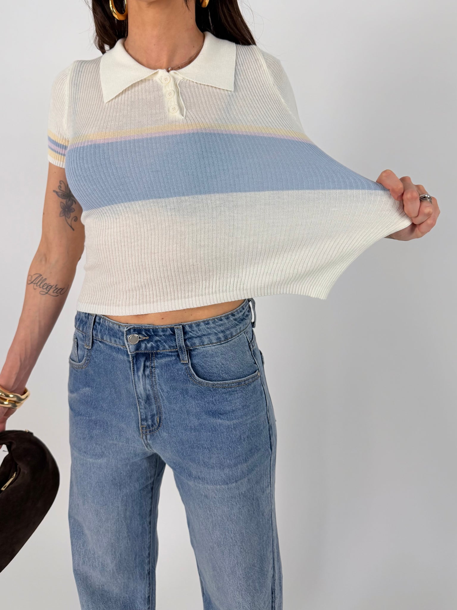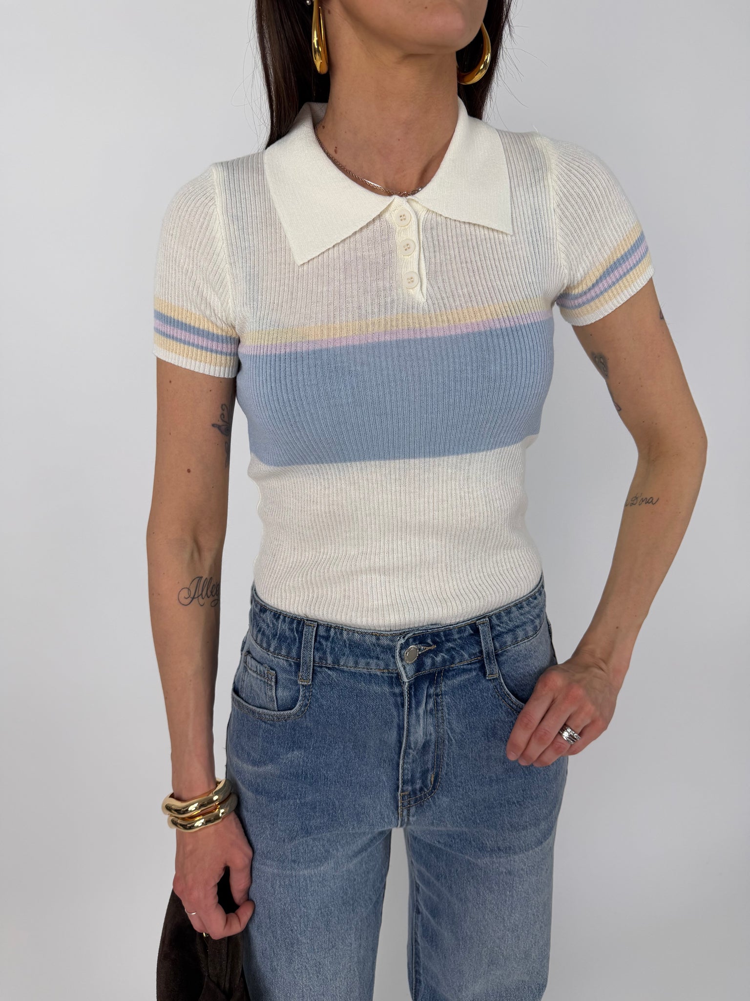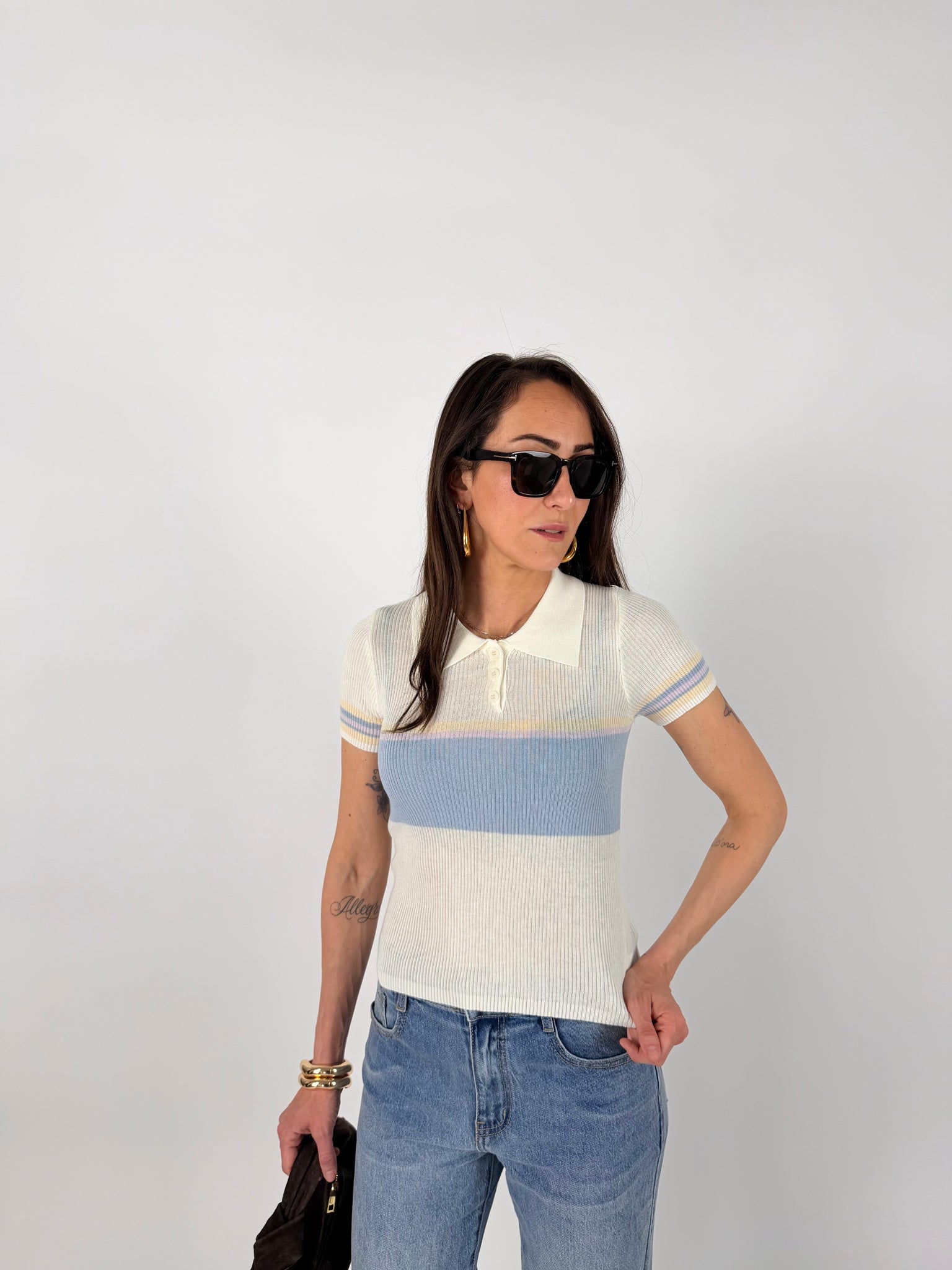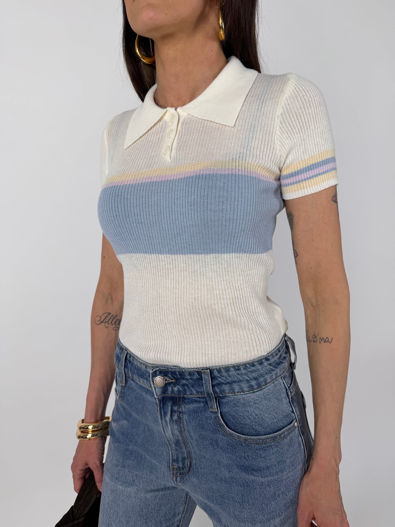 Polo in maglia a righe pastello su base crema, elasticizzata. Taglia unica veste da 38 a 46