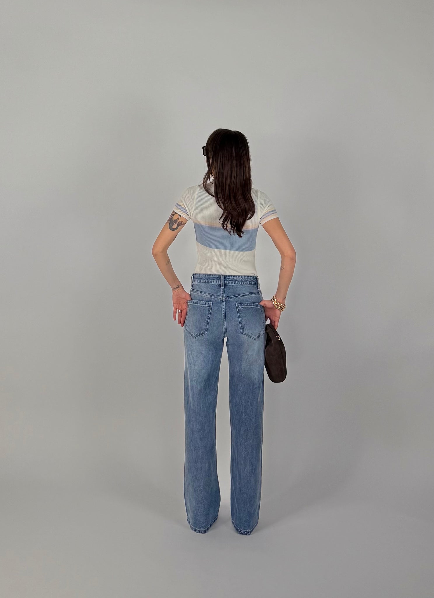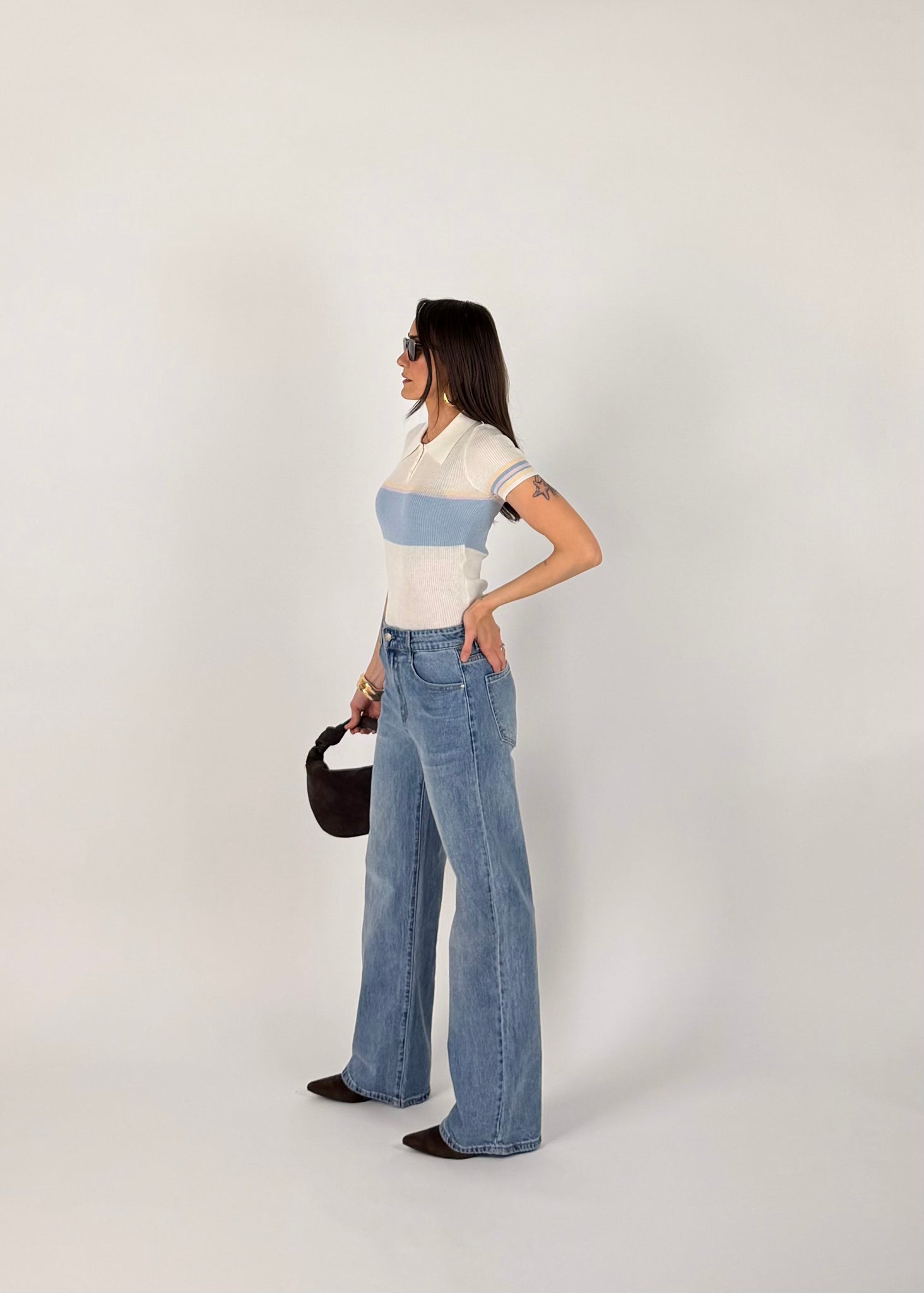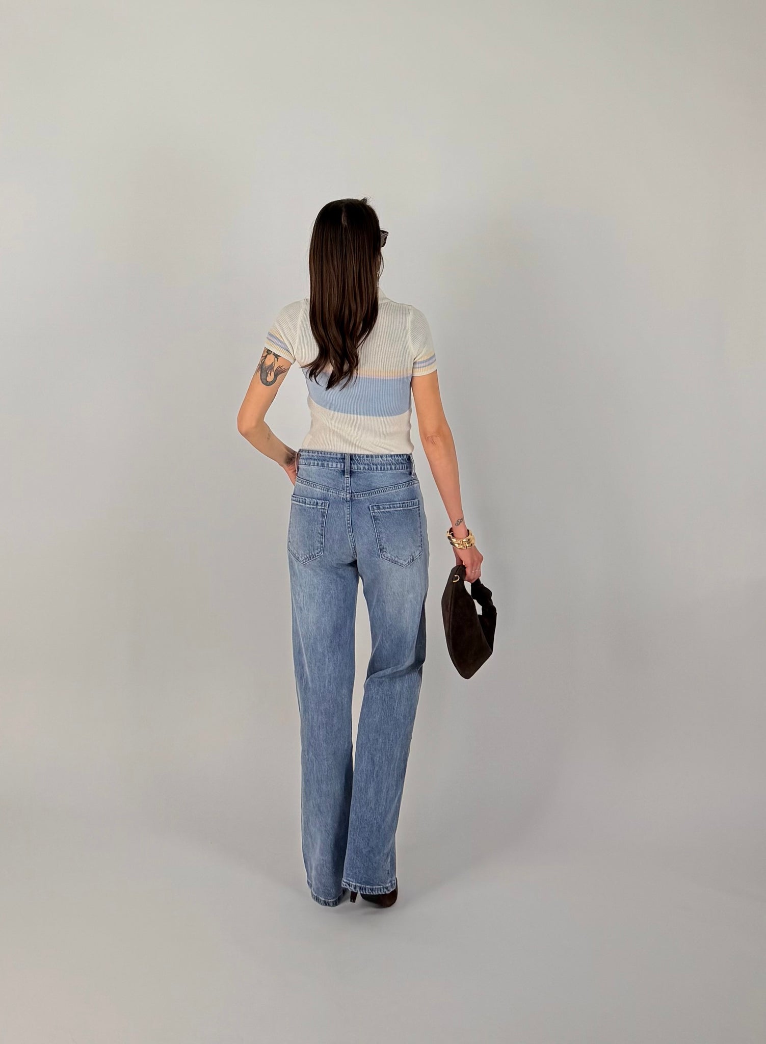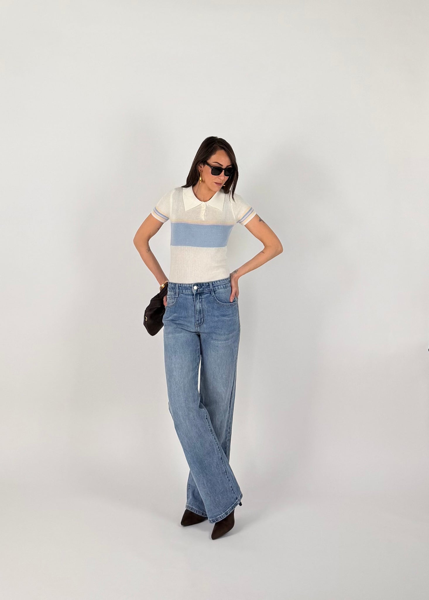 Polo in maglia a righe pastello su base crema, elasticizzata. Taglia unica veste da 38 a 46