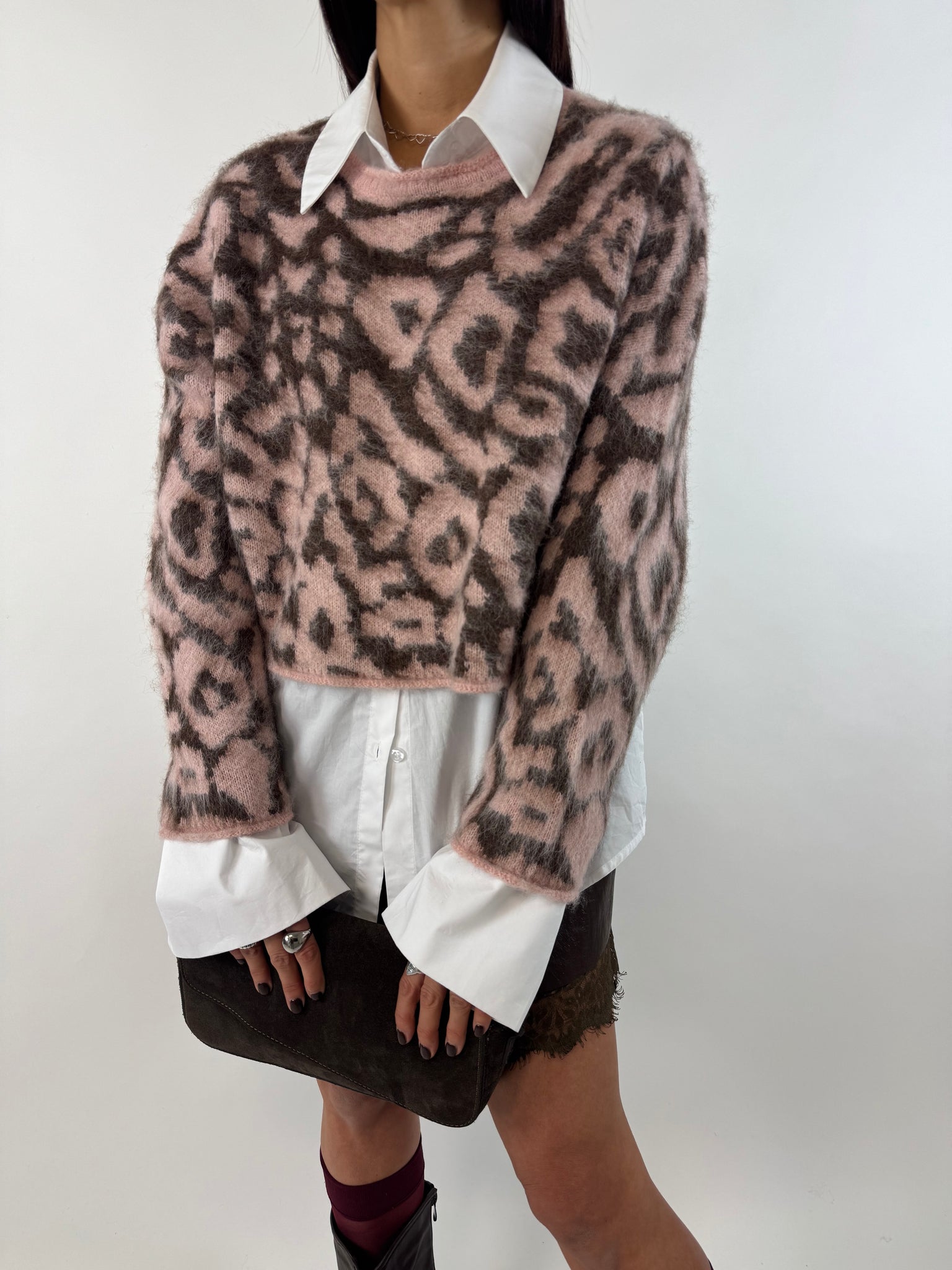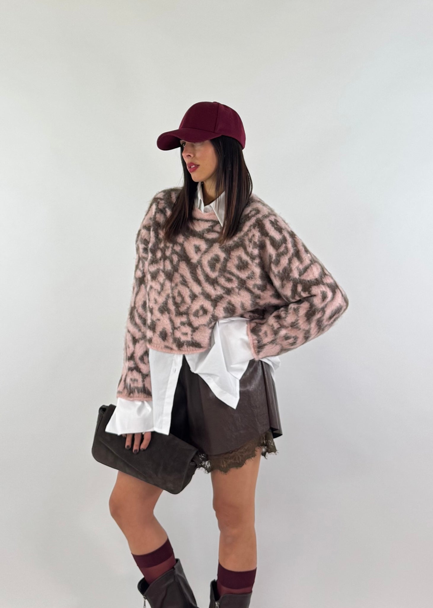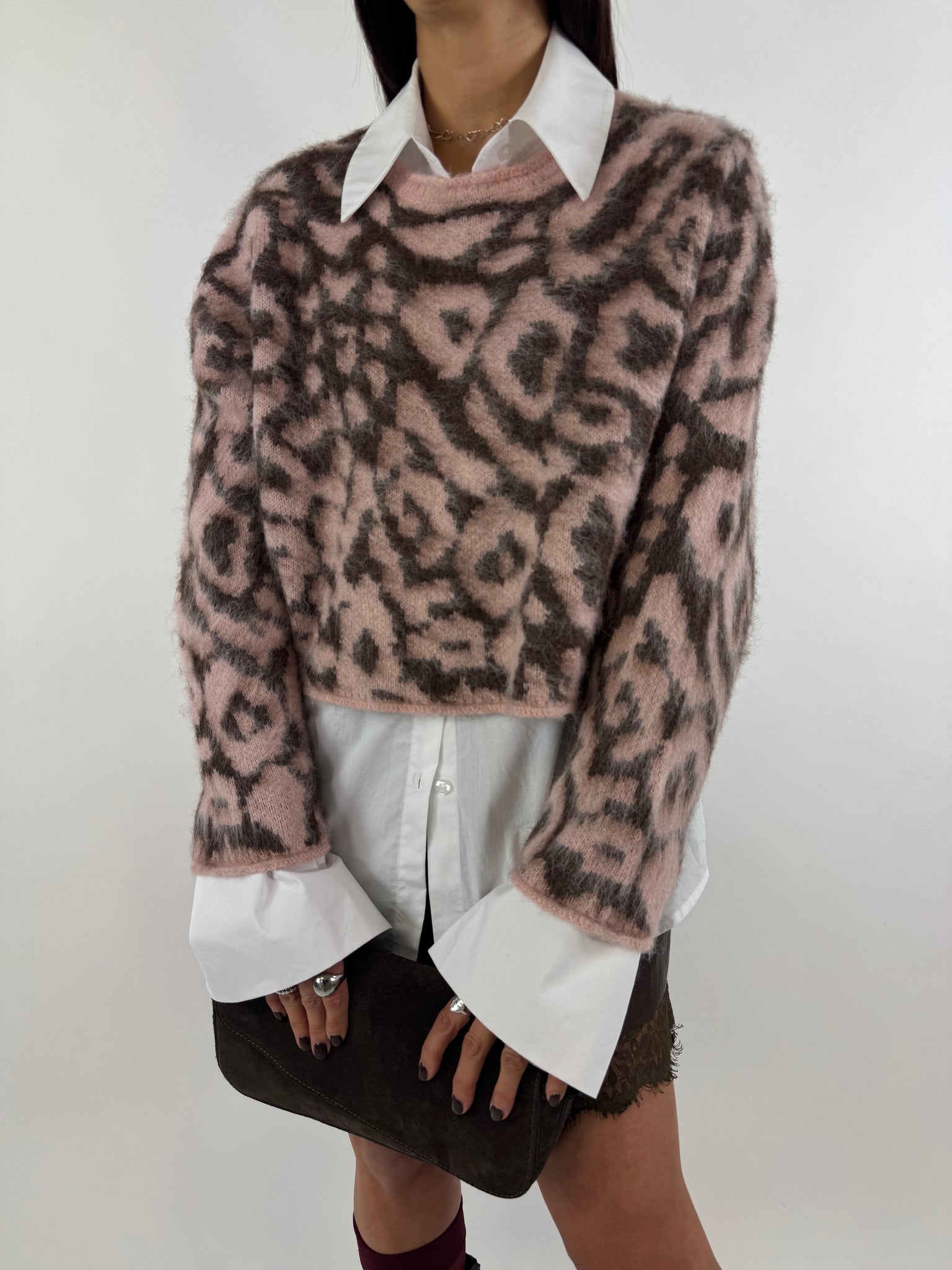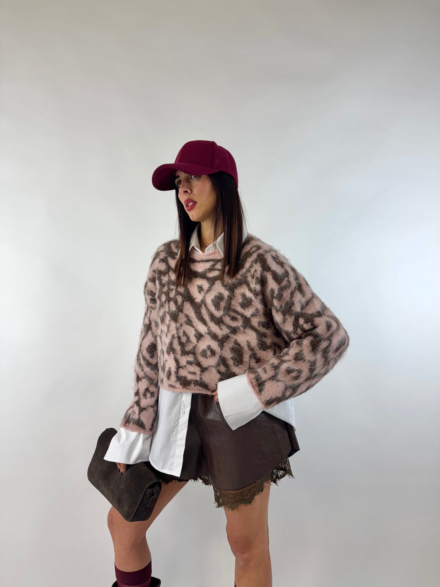 Pull girocollo, taglio squadrato, fantasia Leo cioccolato su base rosa pastello. Taglia unica veste da 38 a 46. 30% viscosa, 10% lana. NON PUNGE!