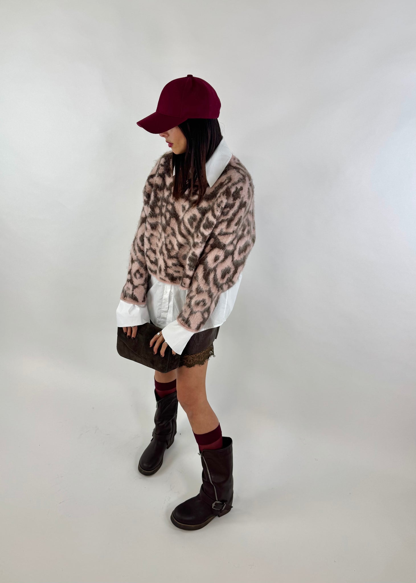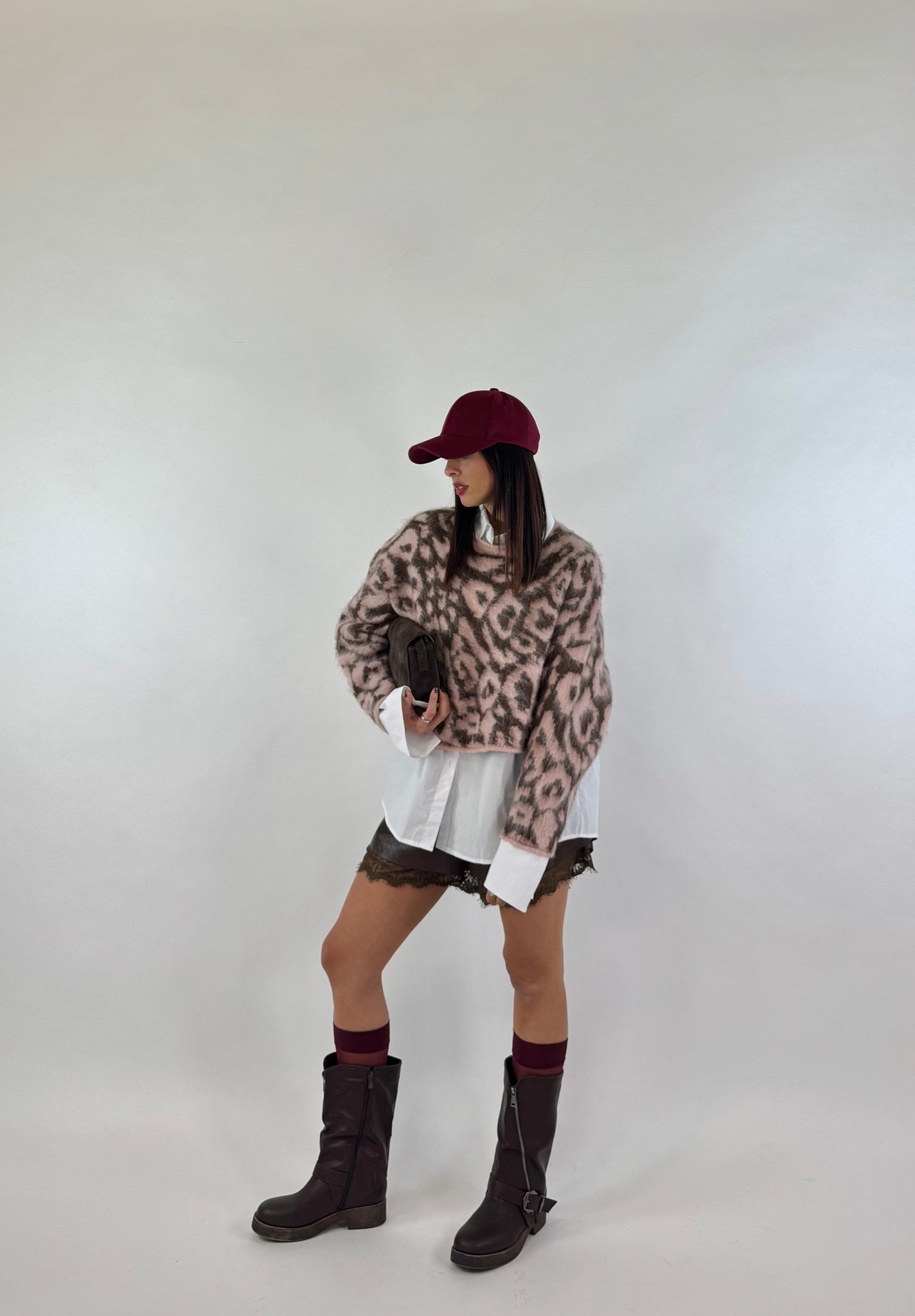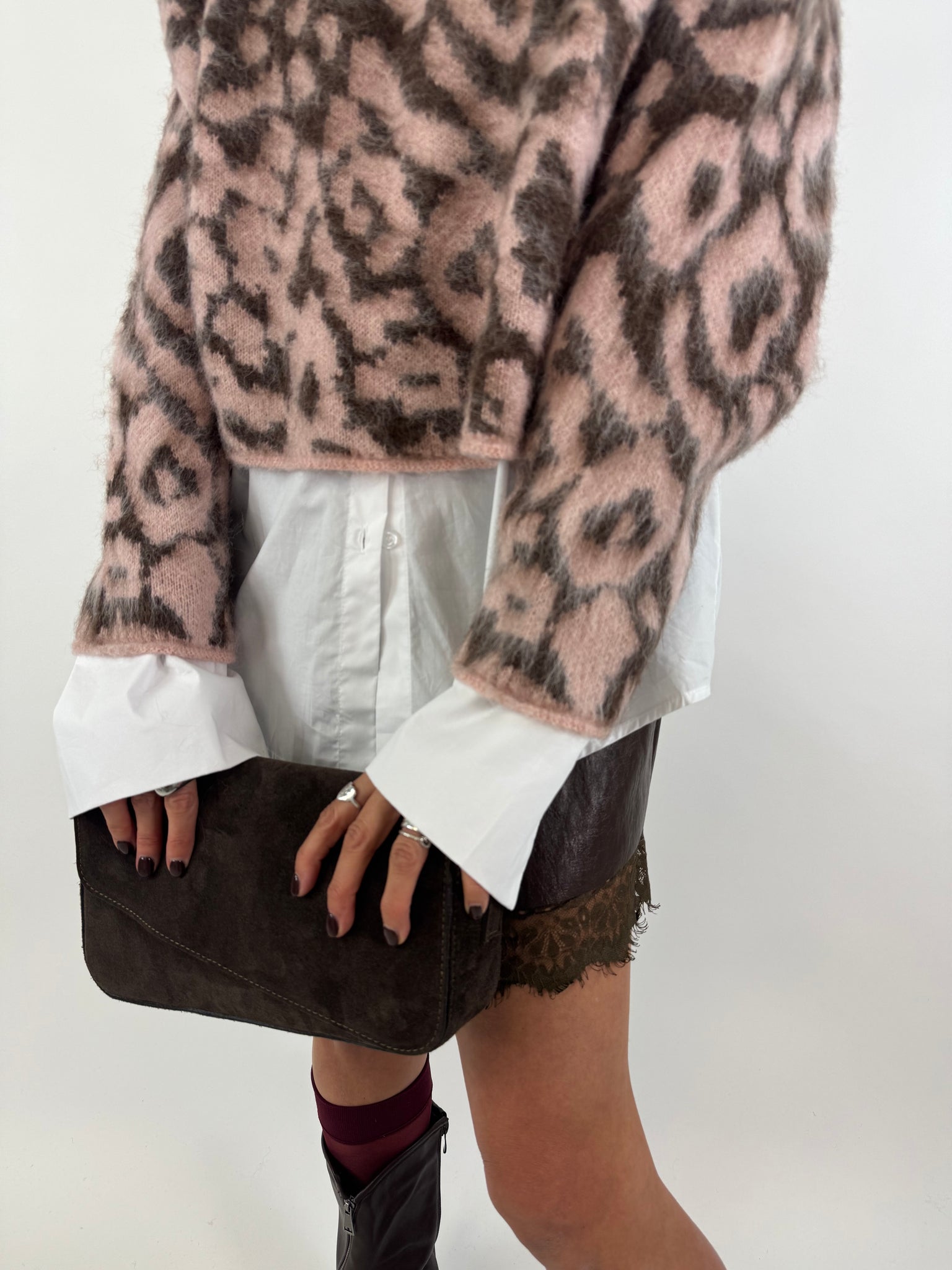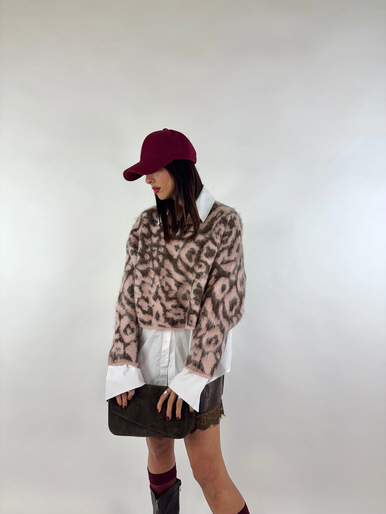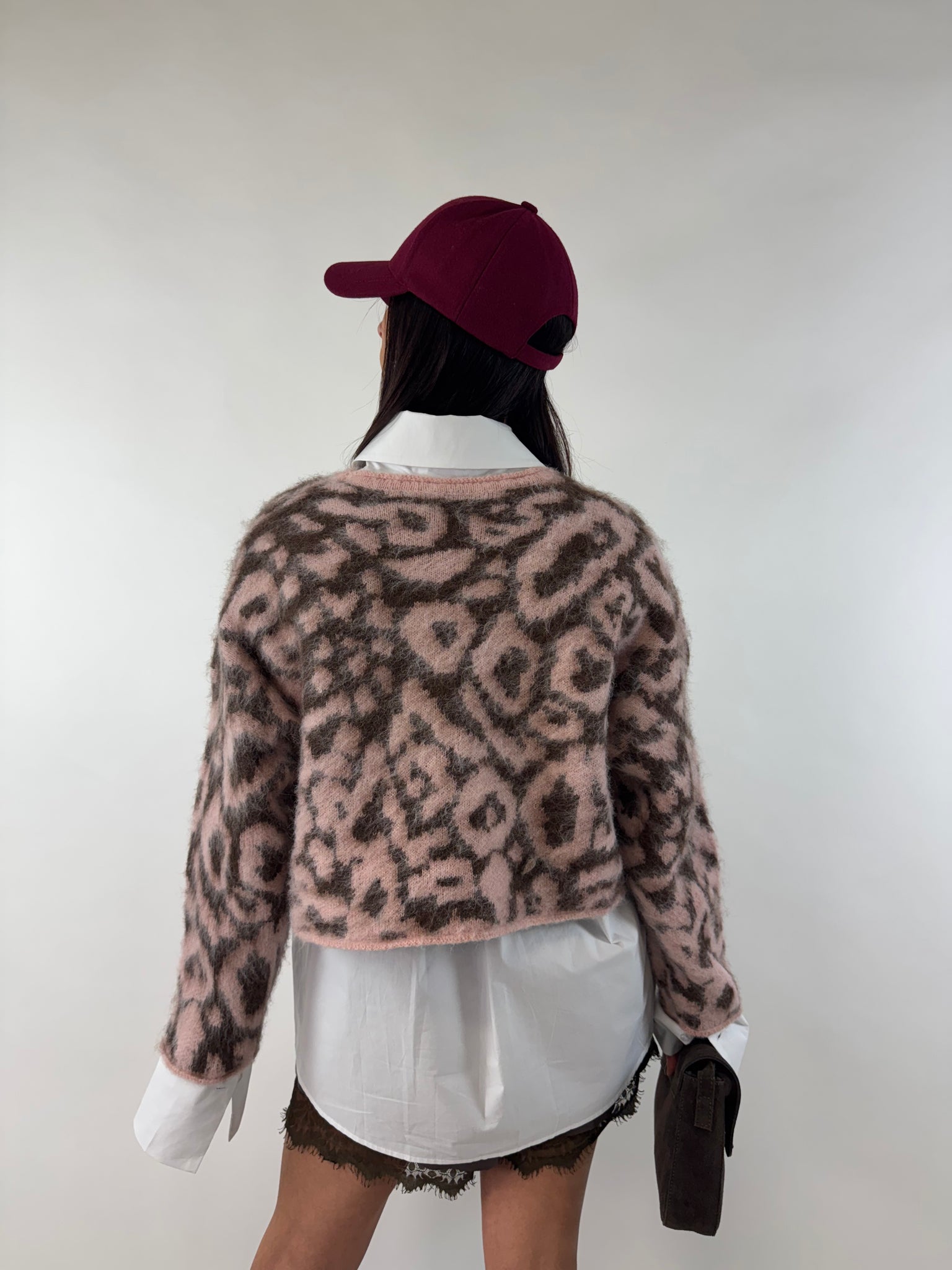 Pull girocollo, taglio squadrato, fantasia Leo cioccolato su base rosa pastello. Taglia unica veste da 38 a 46. 30% viscosa, 10% lana. NON PUNGE!