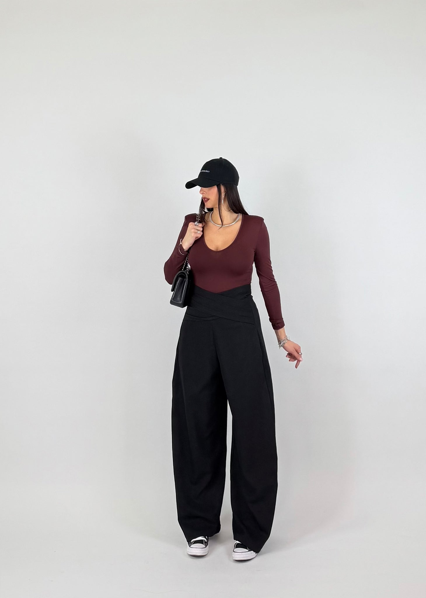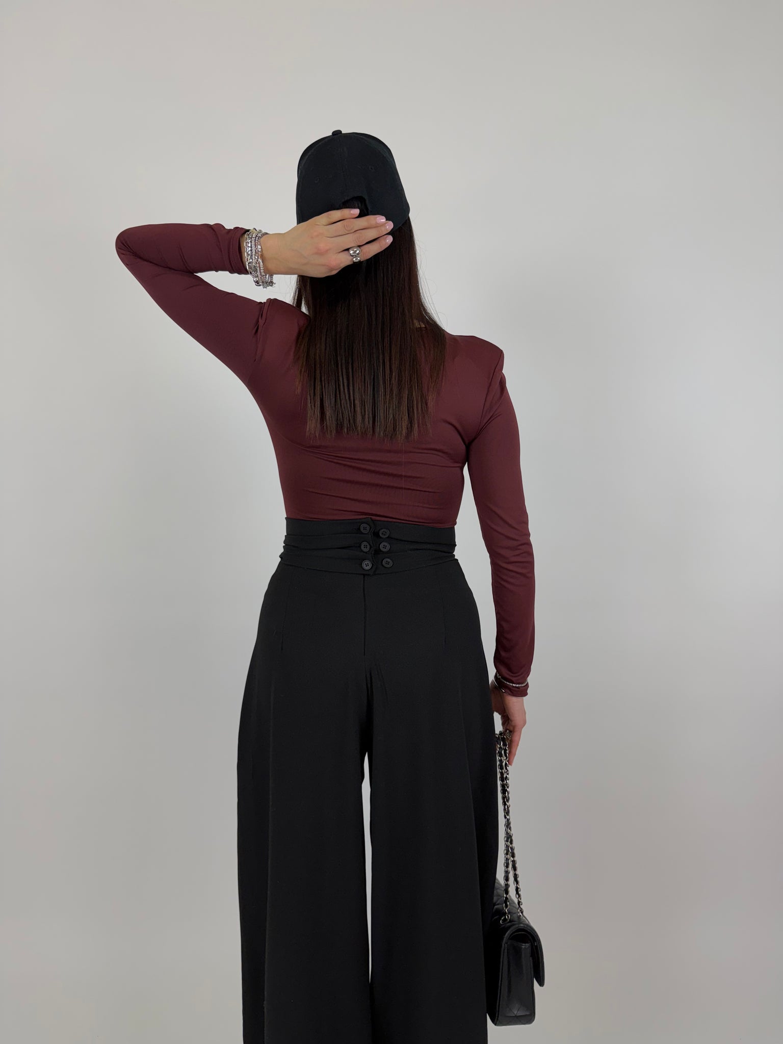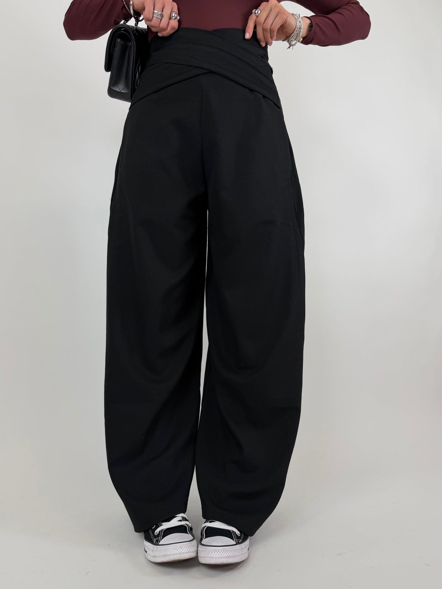 Pantalone taglio a palazzo, chiusura zip sul retro, dettaglio punto vita con bande a incrocio che si chiudono sul retro tramite bottoncini o che possono essere annodate sul davanti a decoro. Sm: 38-40 (lunghezza 106, vita 82cm ); ML: 42-44 abbondante (lunghezza 106, vita 84cm)