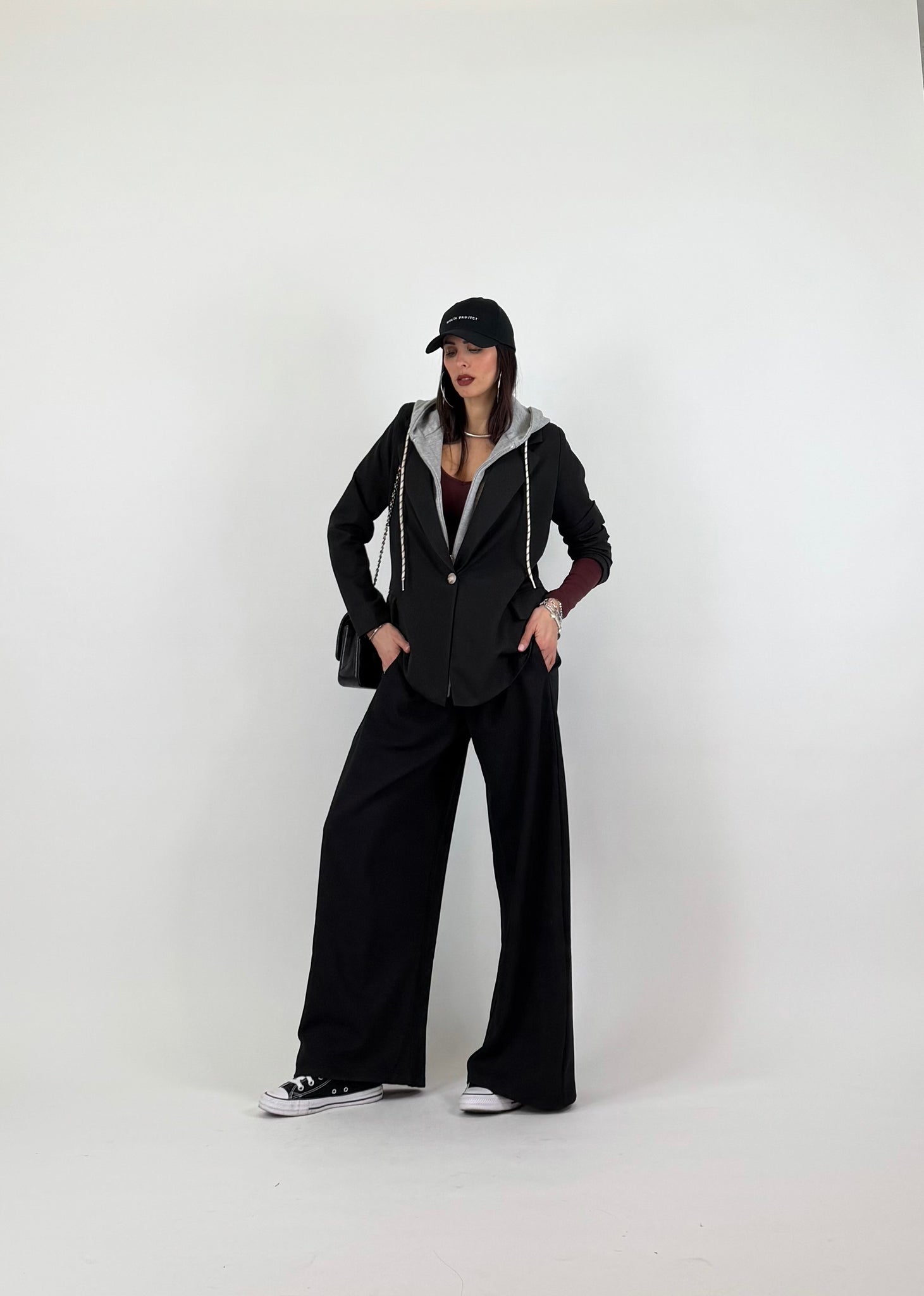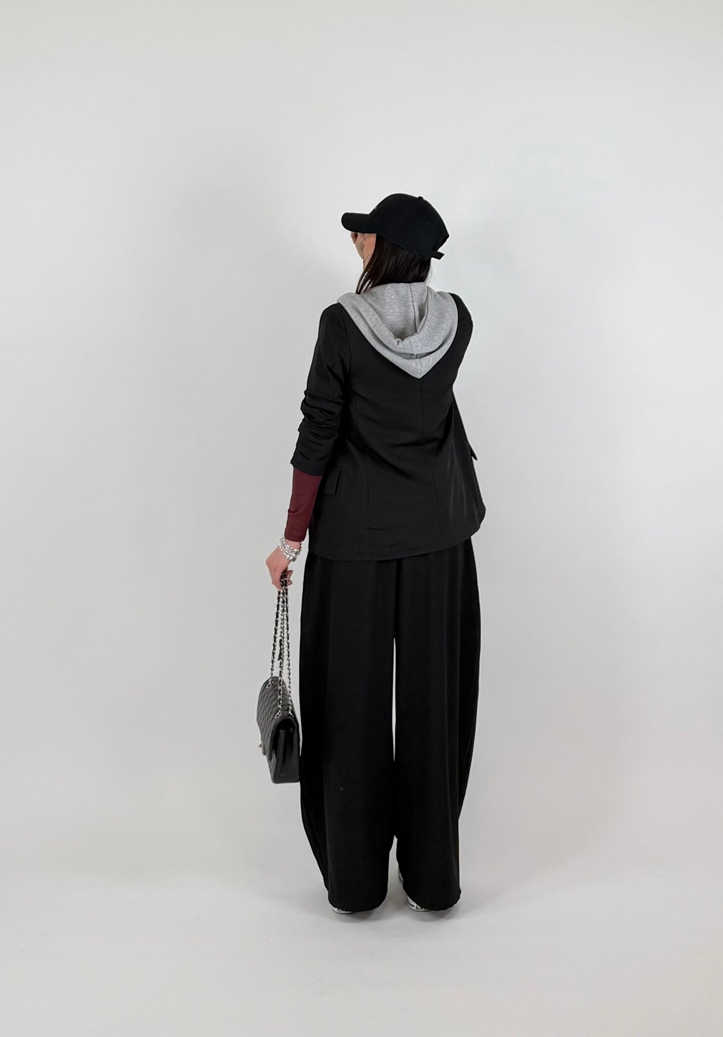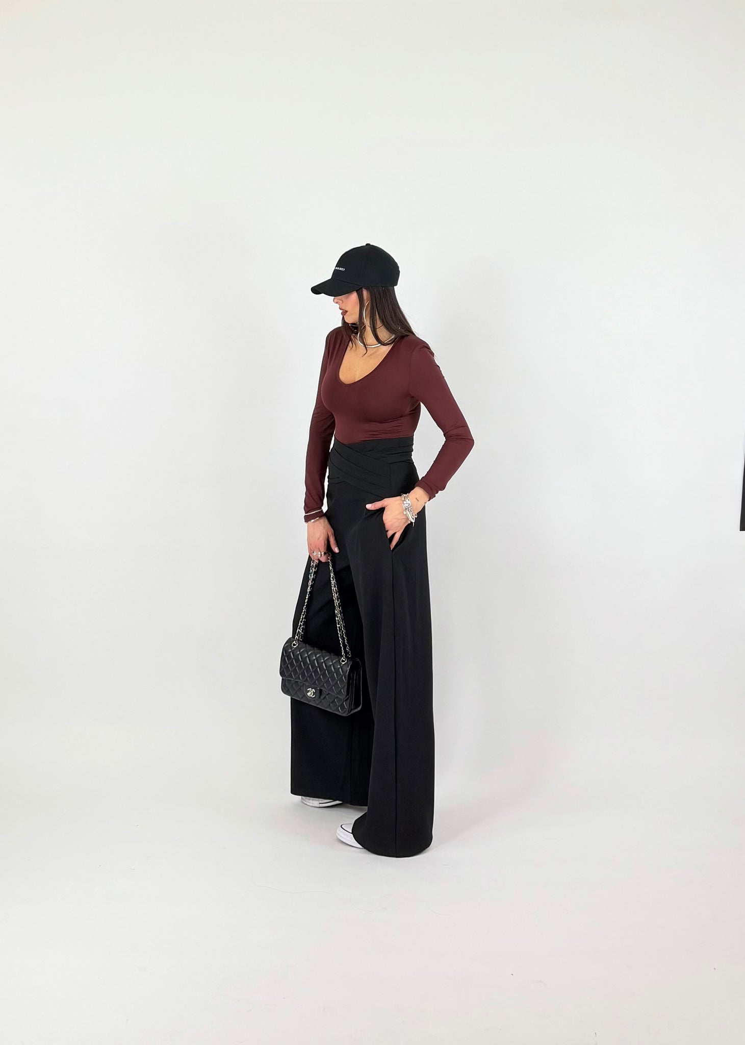 Pantalone taglio a palazzo, chiusura zip sul retro, dettaglio punto vita con bande a incrocio che si chiudono sul retro tramite bottoncini o che possono essere annodate sul davanti a decoro. Sm: 38-40 (lunghezza 106, vita 82cm ); ML: 42-44 abbondante (lunghezza 106, vita 84cm)