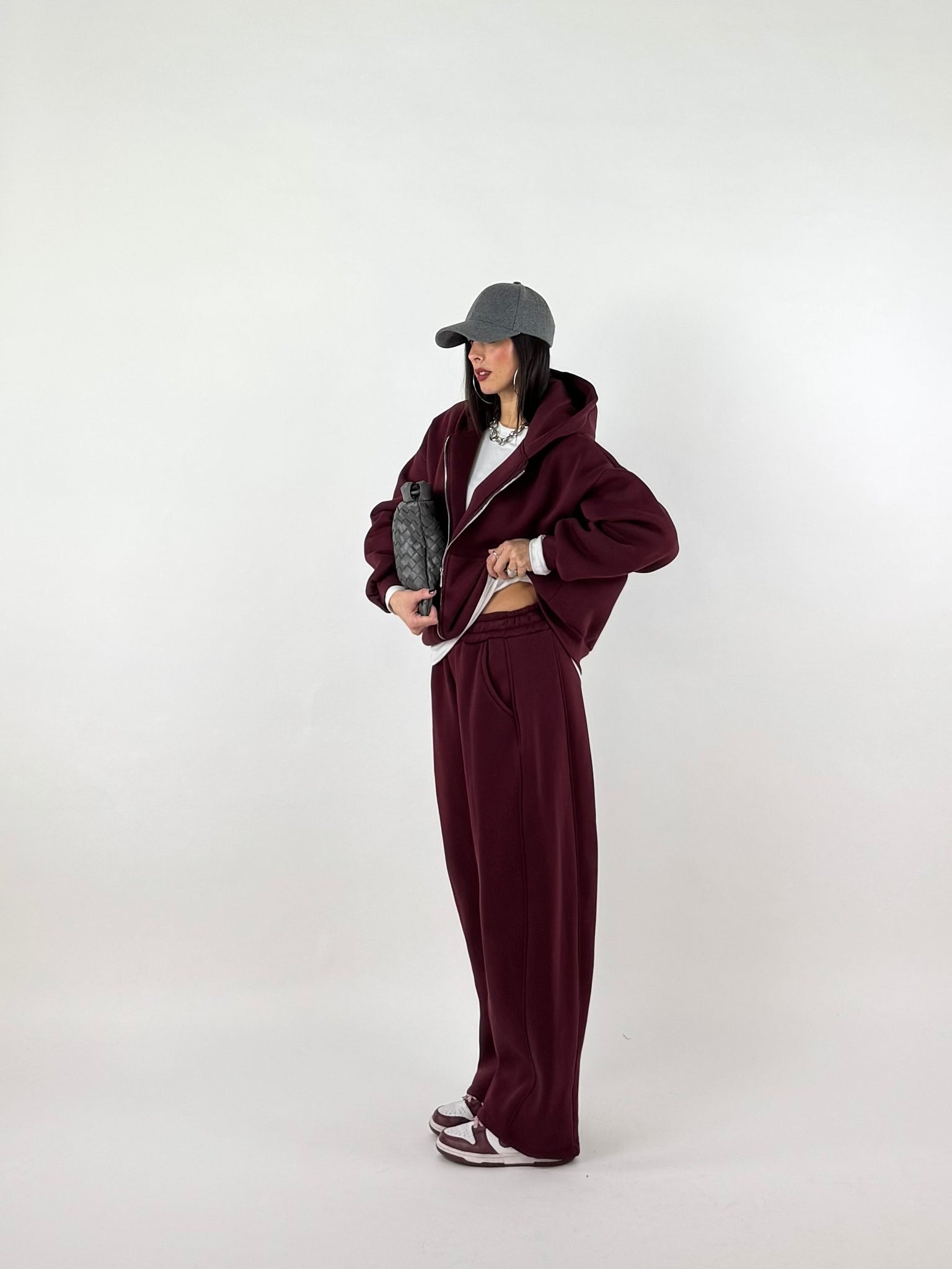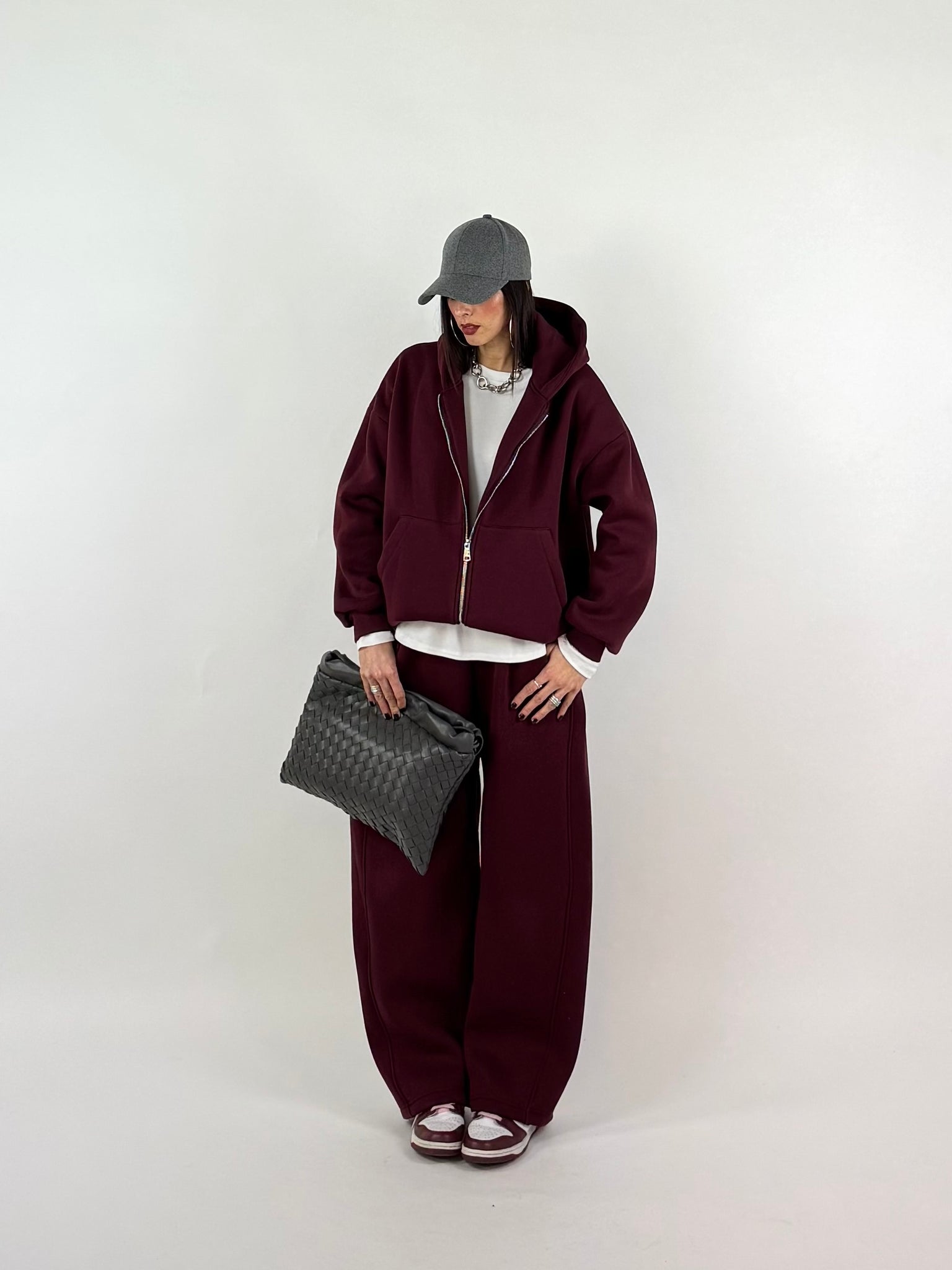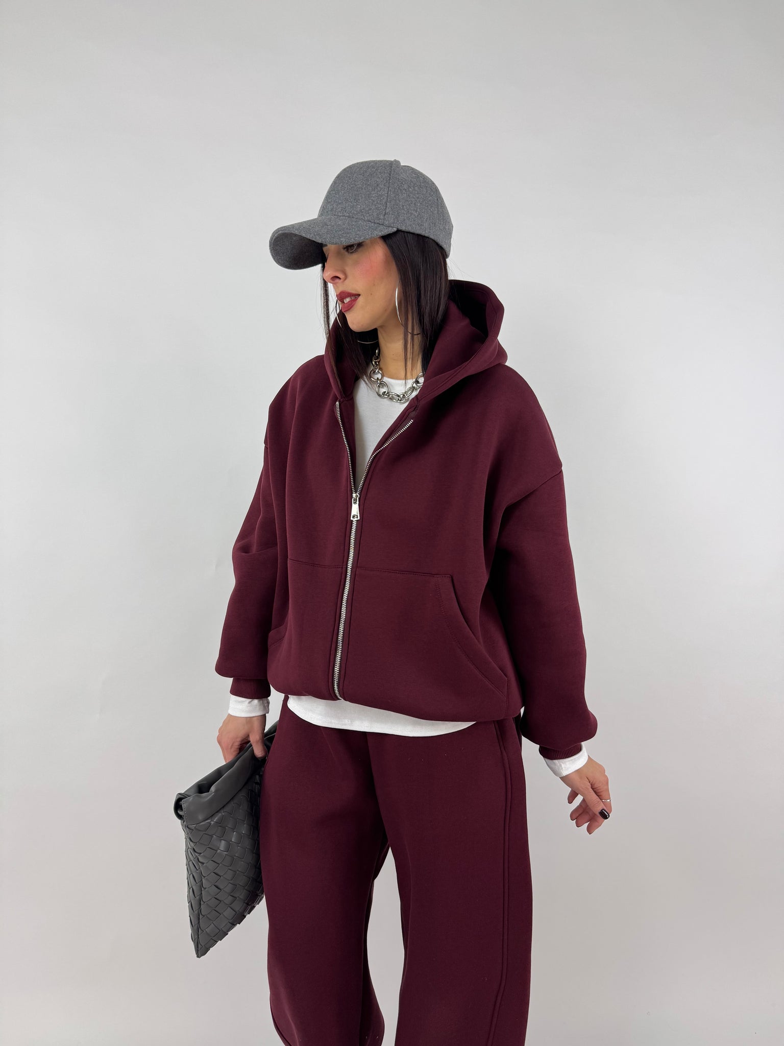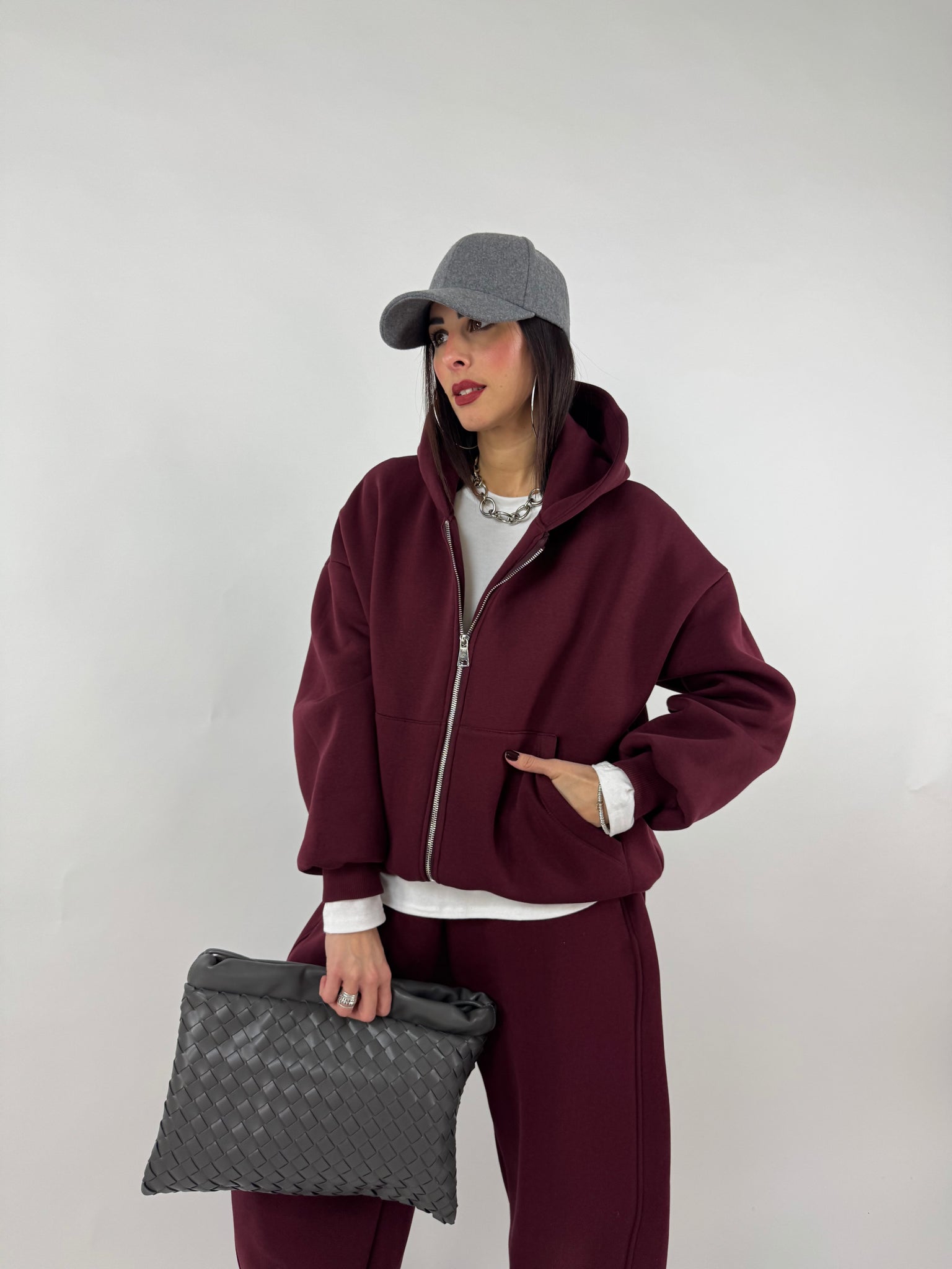 Completo tuta composto da pantalone con elastico in vita taglio balloon e felpa fit ampio con cappuccino e zip sul davanti, tessuto molto caldo e confortevole . Taglia unica veste da 38 a 48