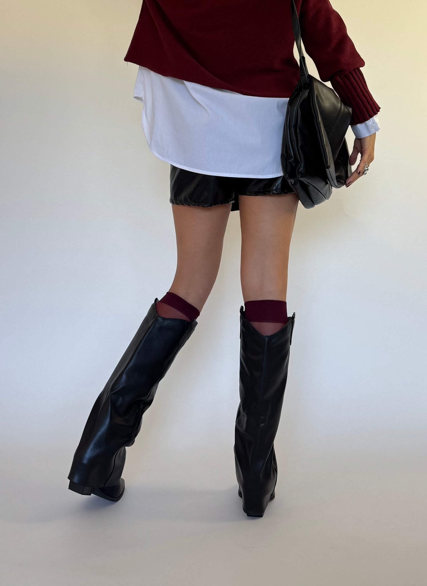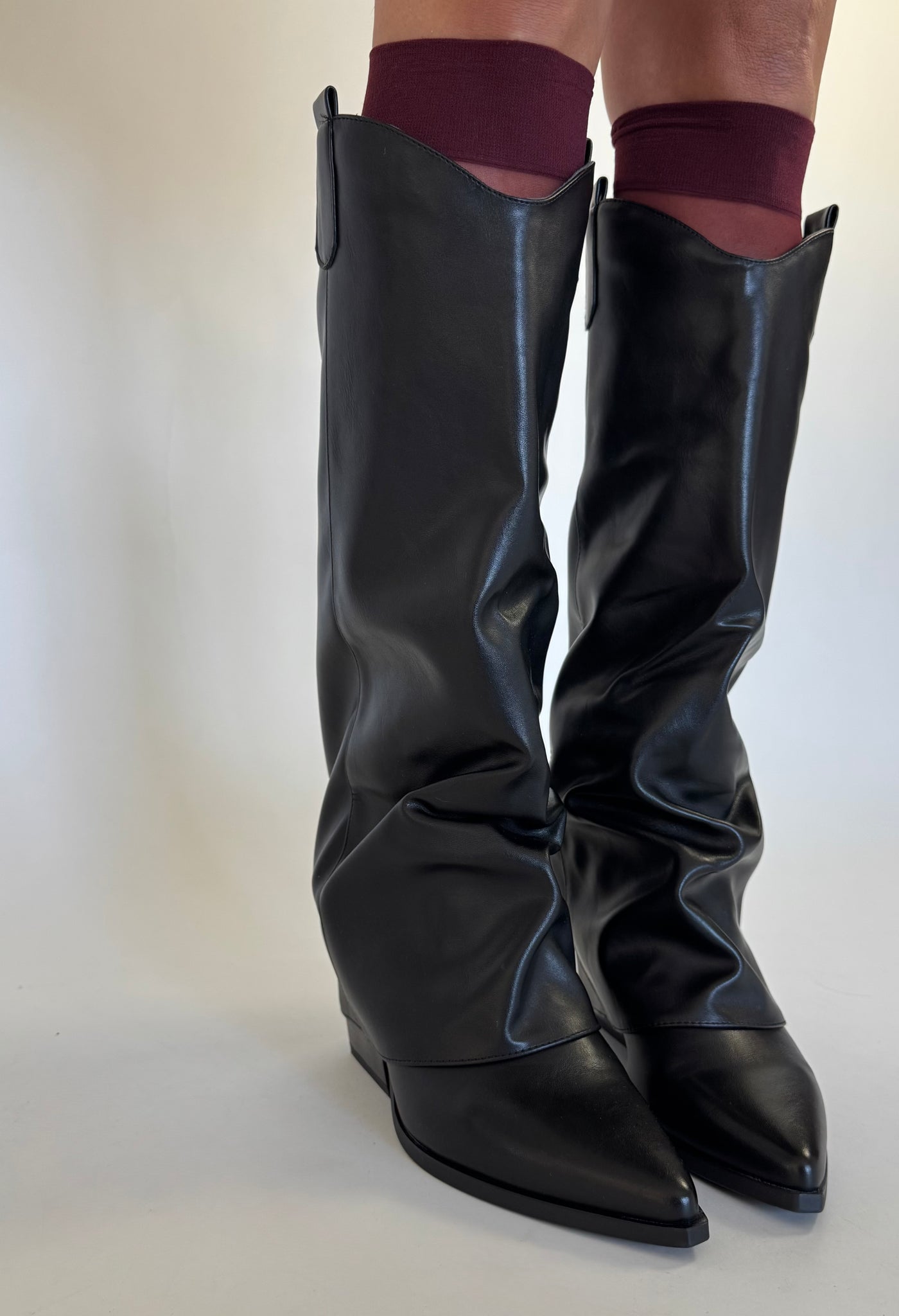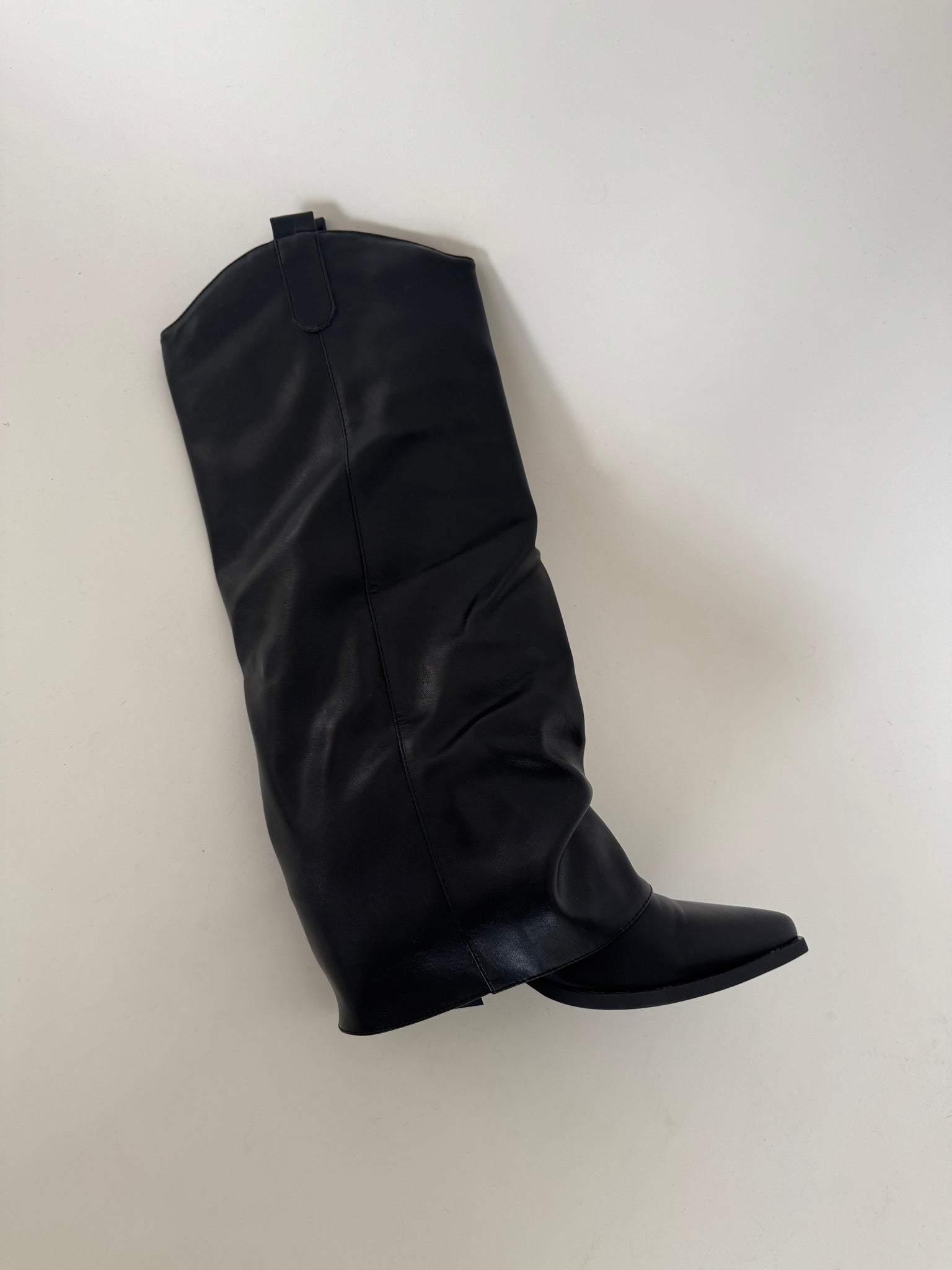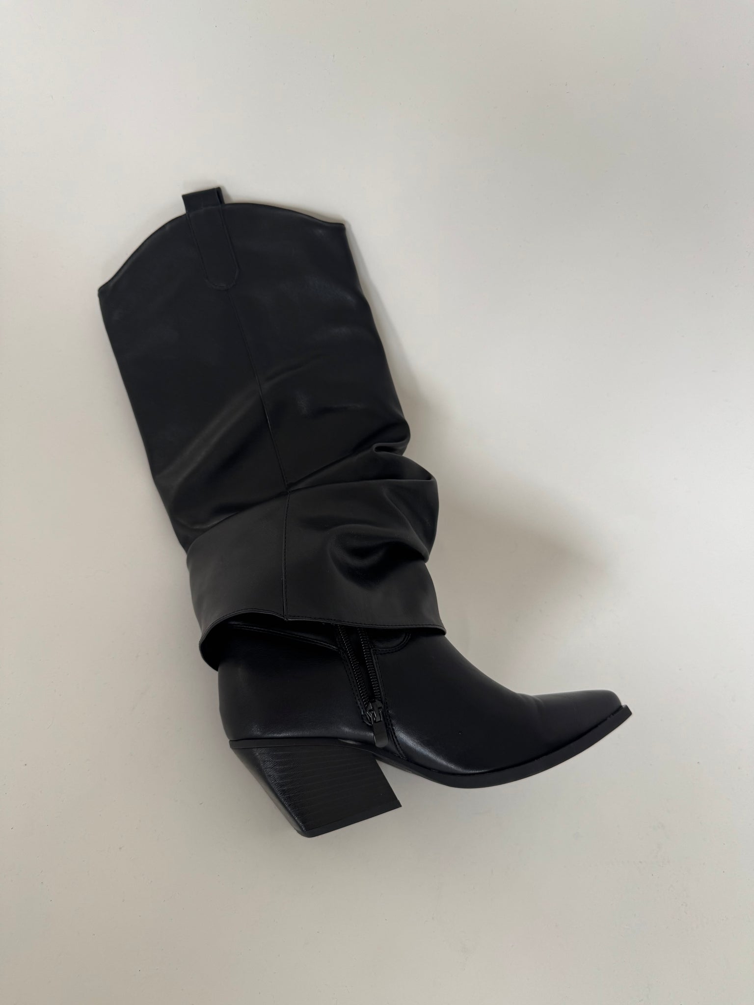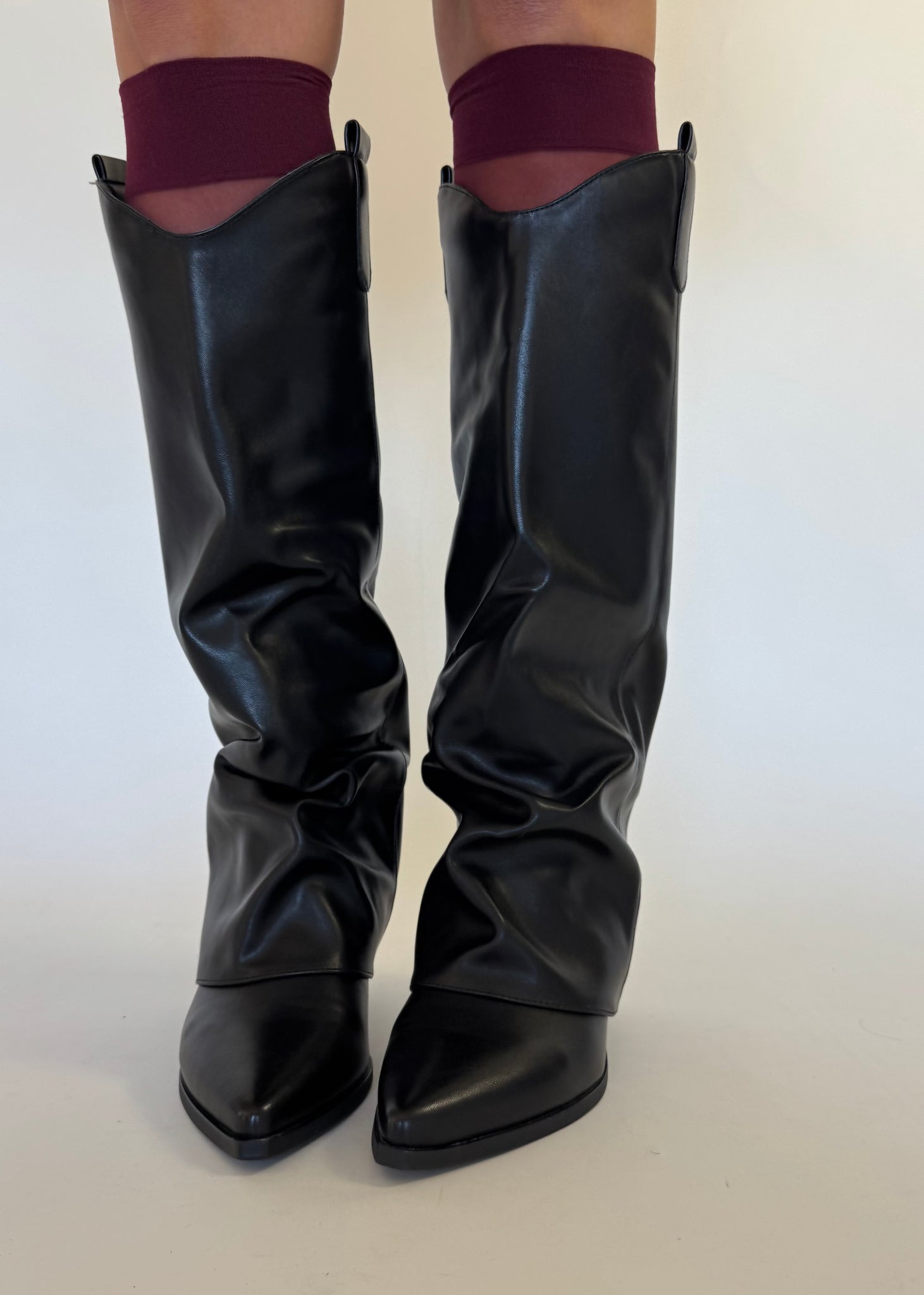 Stivale a punta modello Camperos, ecopelle a doppio tessuto con lo strato superiore lungo a coprire anche il tacco. Possibilità di allacciarlo tramite zip interna nascosta (vedi foto). Calzata regolare. Con campione n•38: altezza gambale 44cm (tacco incluso), tacco 7cm, circonferenza massima polpaccio 40cm.