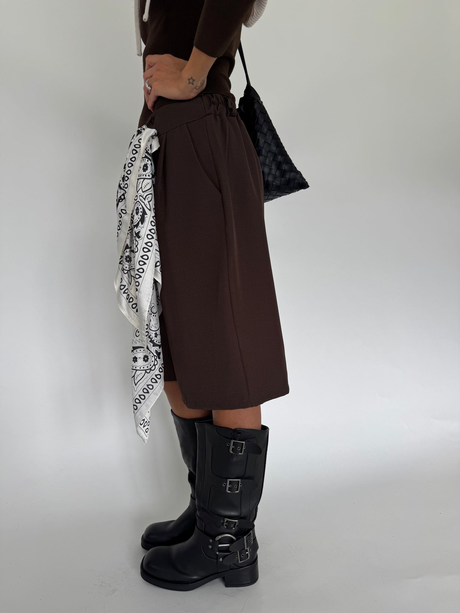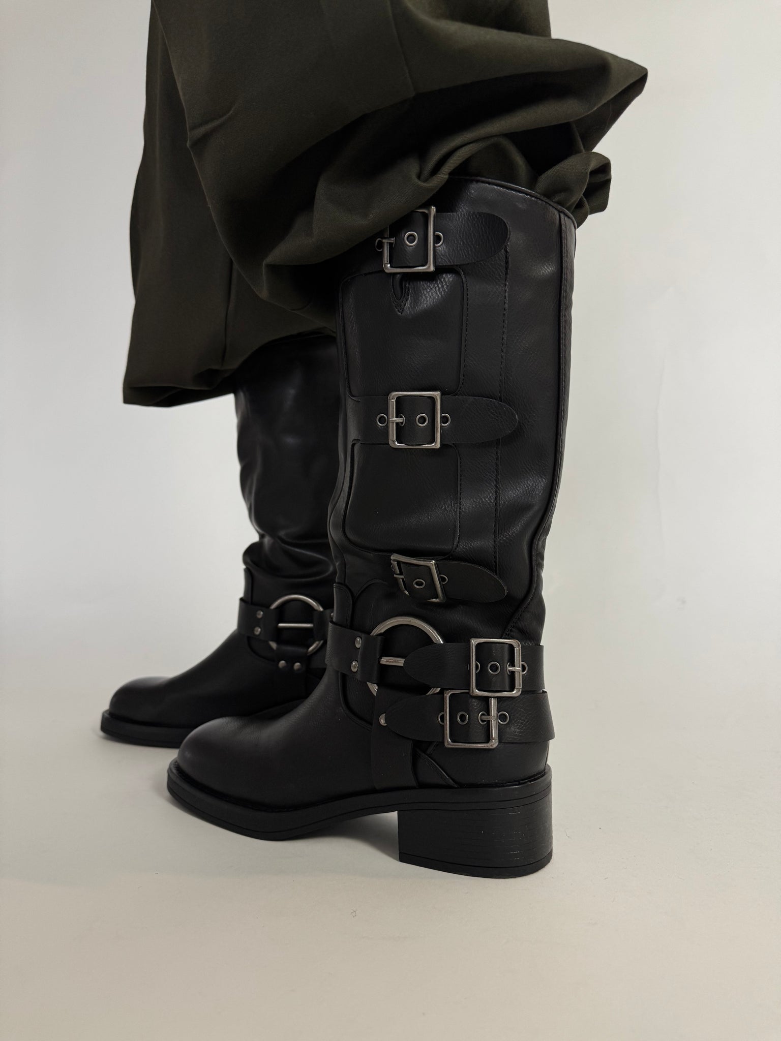 Stivale nero in ecopelle con dettaglio multi fibbia, suole in gomma. Circonferenza massima polpaccio N•39 a campione cm 39, altezza gambale 30 cm (tacco escluso), tacco 4,5 cm. Calzata regolare.