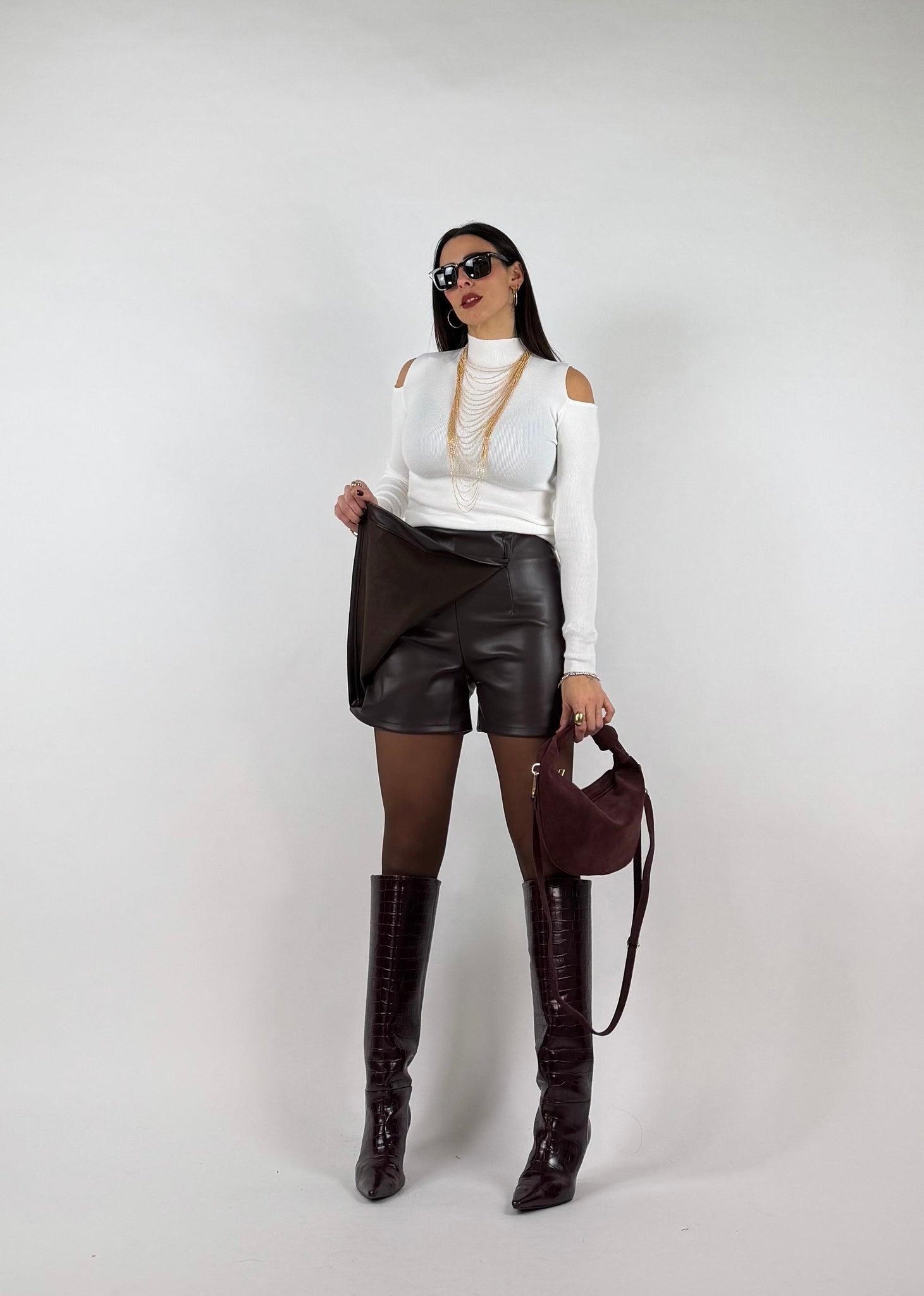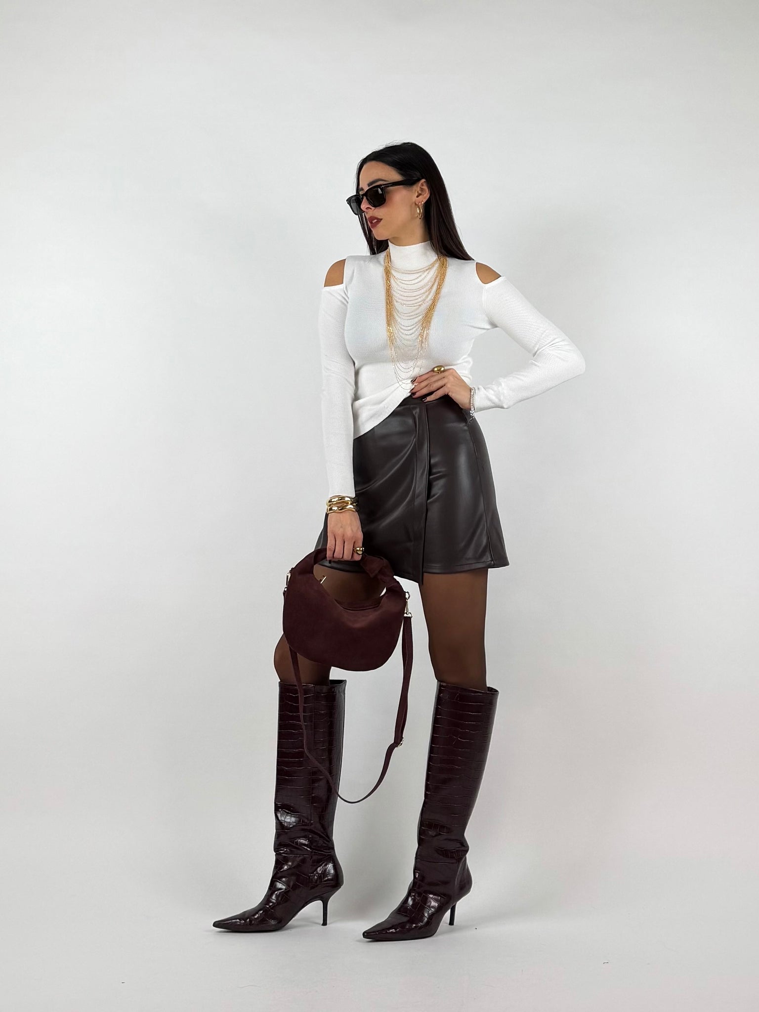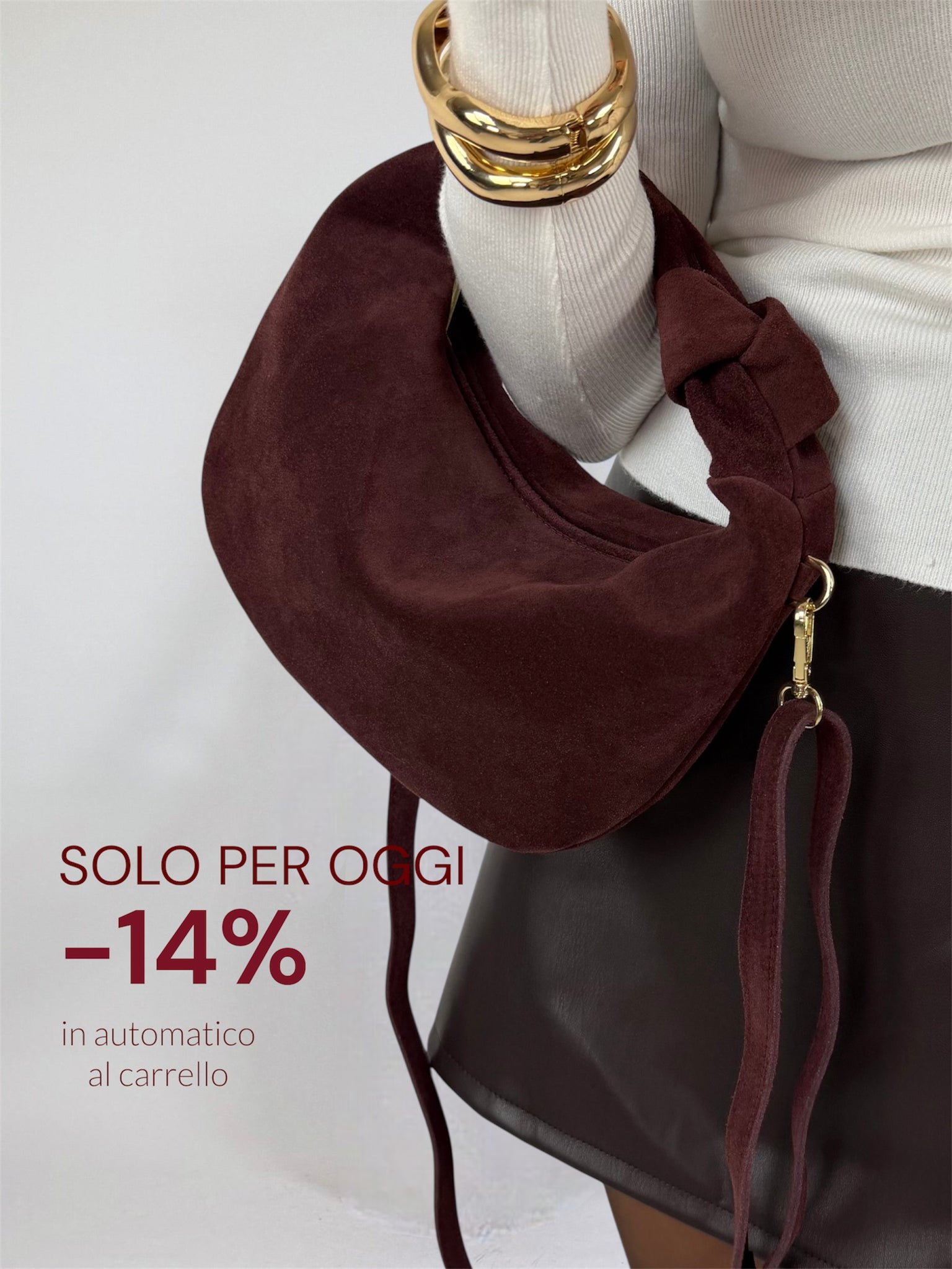 Borsa artigianale in vera pelle, Made in Italy, forma a mezza luna, dettaglio nodo sul manico, chiusura con zip + ganci laterali per tracolla regolabile. Lunghezza 30cm, altezza con manico 25 cm, profondità 10/12 cm